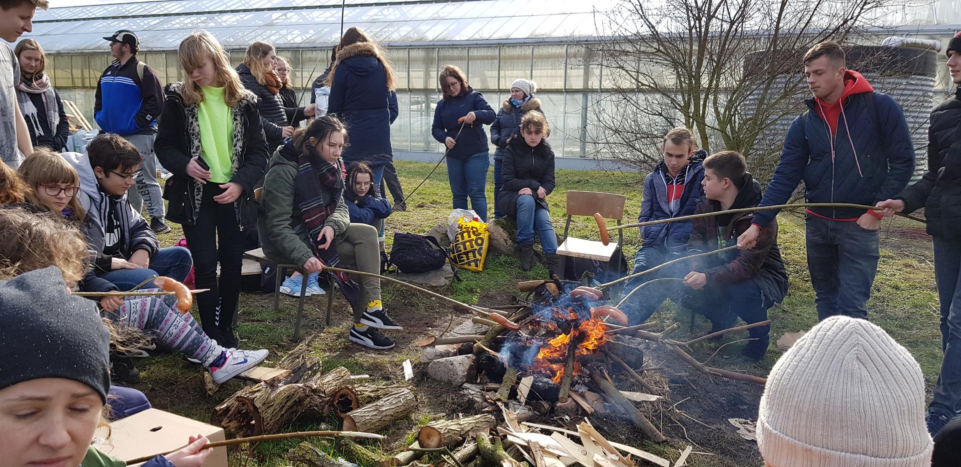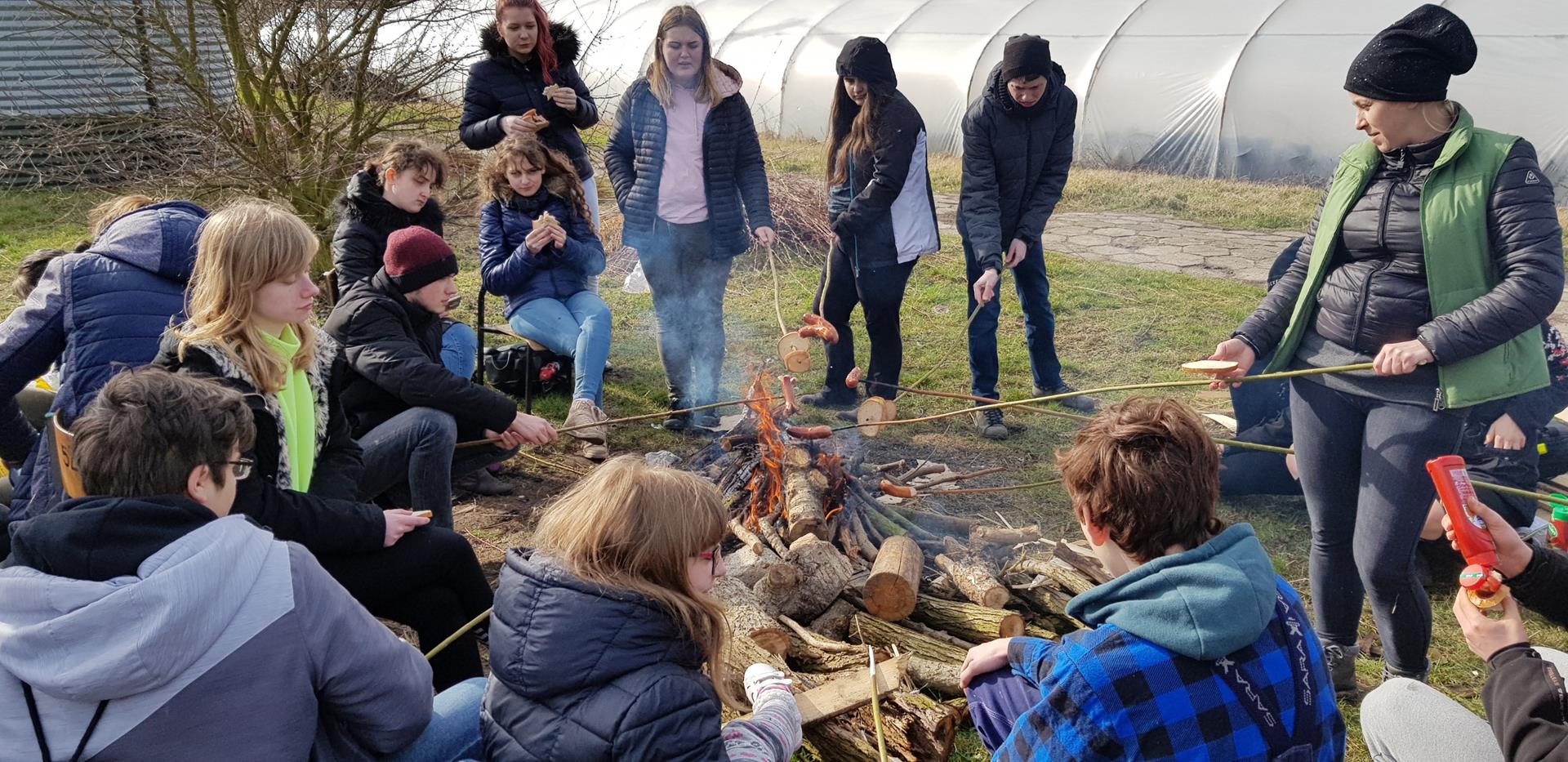 Pomimo zmęczenia po ciężkiej pracy, młodzież pod nadzorem nauczycieli – rozpaliła ognisko i zaprosiła na pieczenie kiełbasek wszystkich zaangażowanych w porządkowanie „Przystani”.