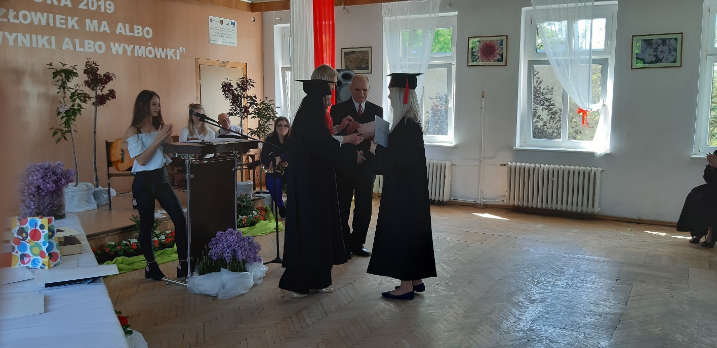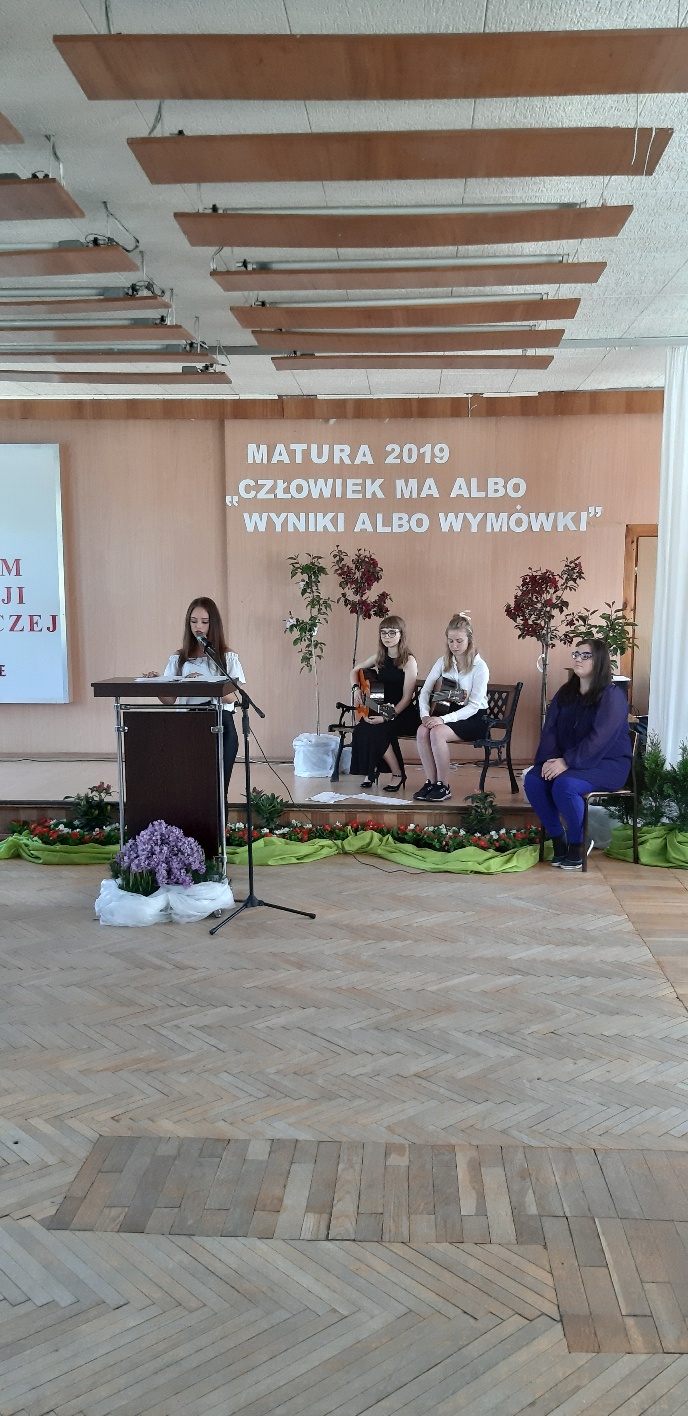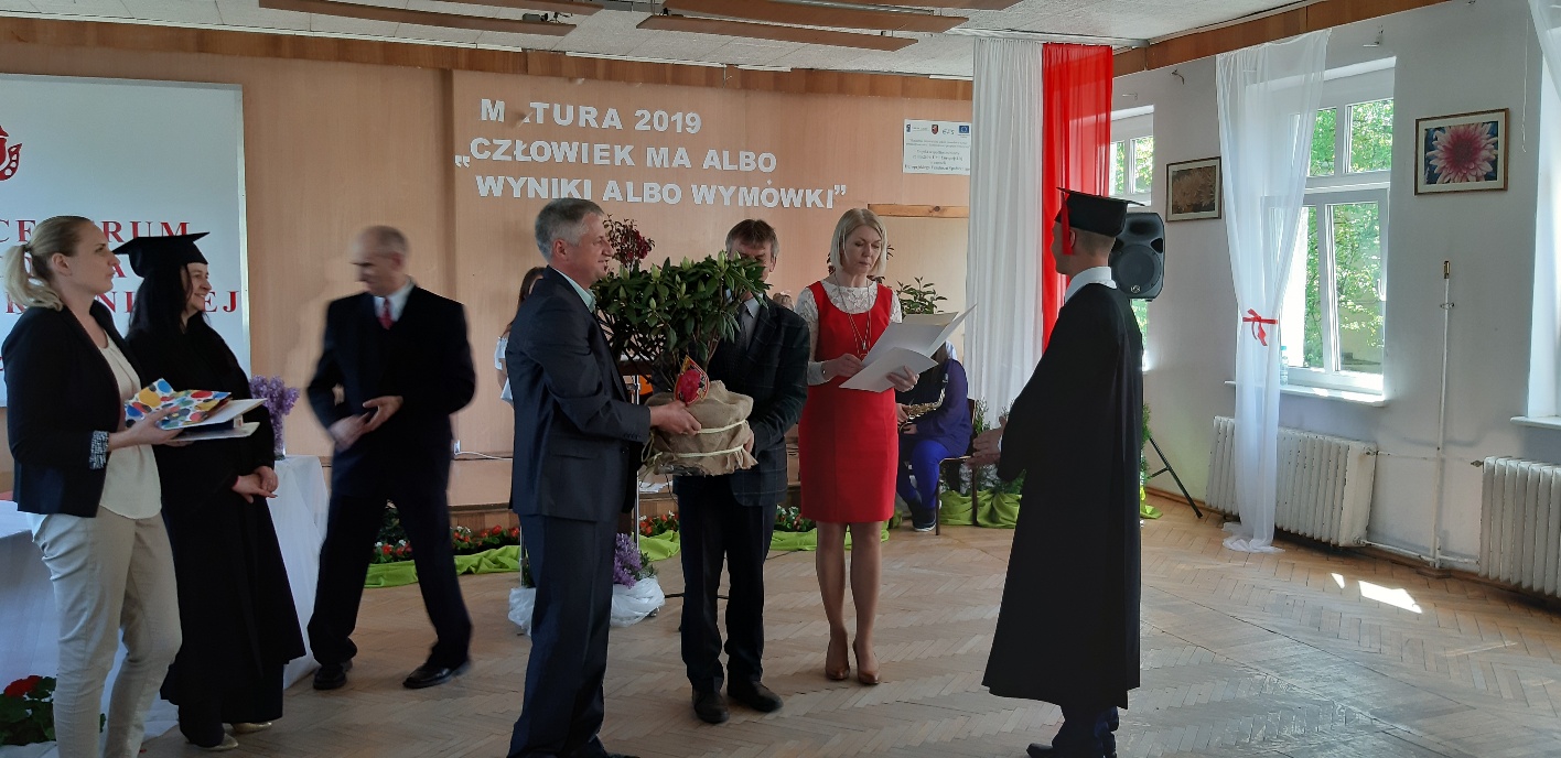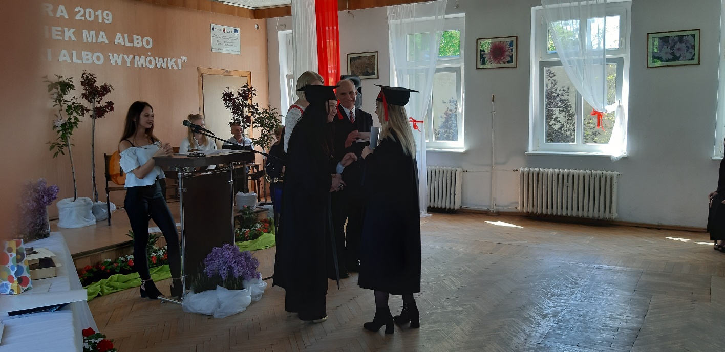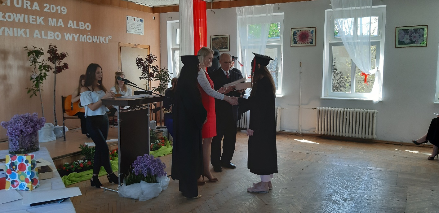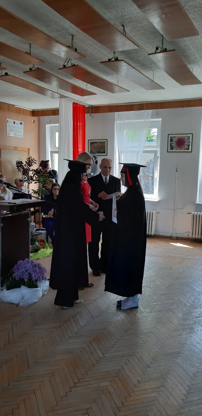 Rodzicom Gracjana wręczono List Gratulacyjny, a Przewodniczącej Rady Rodziców, pani Katarzynie Falkowskiej, podziękowania za wspieranie działalności opiekuńczo-wychowawczej szkoły. Wychowawczyni klasy, pani Andżelika Szczęch-Kaczorkiewicz, w szczególny sposób życzyła swoim podopiecznym powodzenia w dorosłym życiu – po prostu zaśpiewała a cappella ulubiony utwór ze swoich szkolnych lat. Uczniowie natomiast podziękowali nauczycielom za ich poświęcenie, za czas, za wspólne działania, za możliwość rozwijania swoich zainteresowań, za niespotykaną atmosferę zrozumienia i życzliwości. Pani Dyrektor natomiast powiedziała, by absolwenci pozwolili sobie na marzenia, by dążyli do ich spełnienia, bo bez tego człowiek się nie rozwija. Podkreśliła, że w murach szkoły spędzili 4 lata szkolne, czyli 40 miesięcy, czyli 152 tygodnie, 760 dni… Wyraziła nadzieję, że wartości, wiedza i umiejętności, które im przekazano, pomogą osiągać kolejne cele i pokonywać napotkane trudności, że warto czasem zrobić jeden krok w tył, by potem wykonać trzy w przód. Dla dodania „otuchy” przytoczyła ulubiony fragment z Pieśni IX Jana Kochanowskiego – nieco parafrazując – „Nie porzucaj nadzieje, jakoć się kolwiek dzieje: bo nie już słońce ostatnie zachodzi, a po złym dniu piękny dzień przychodzi”…