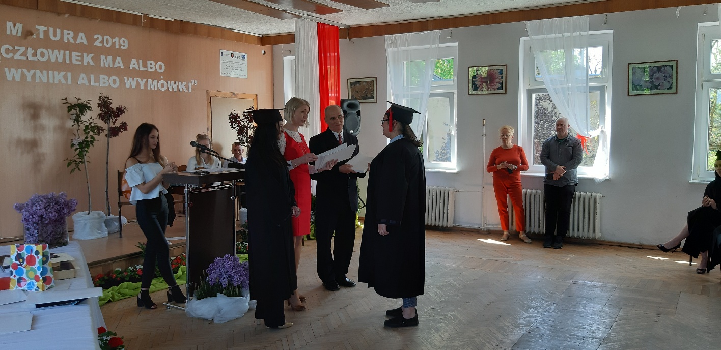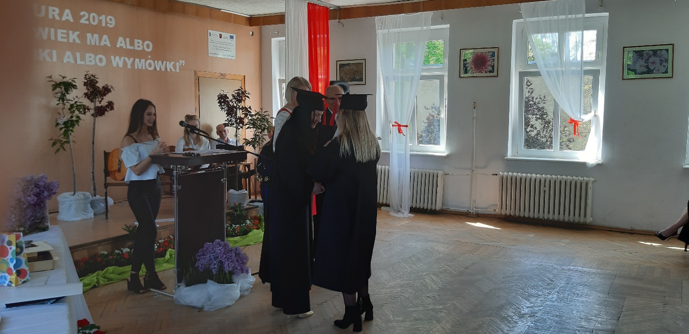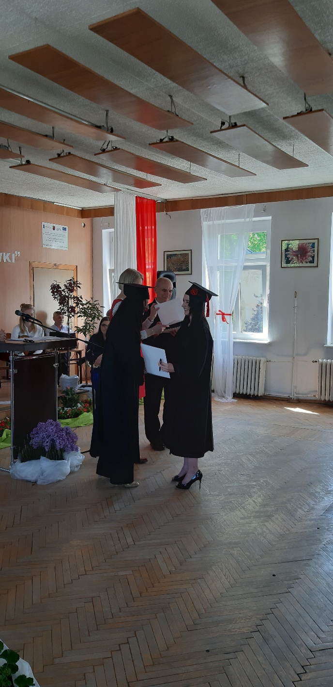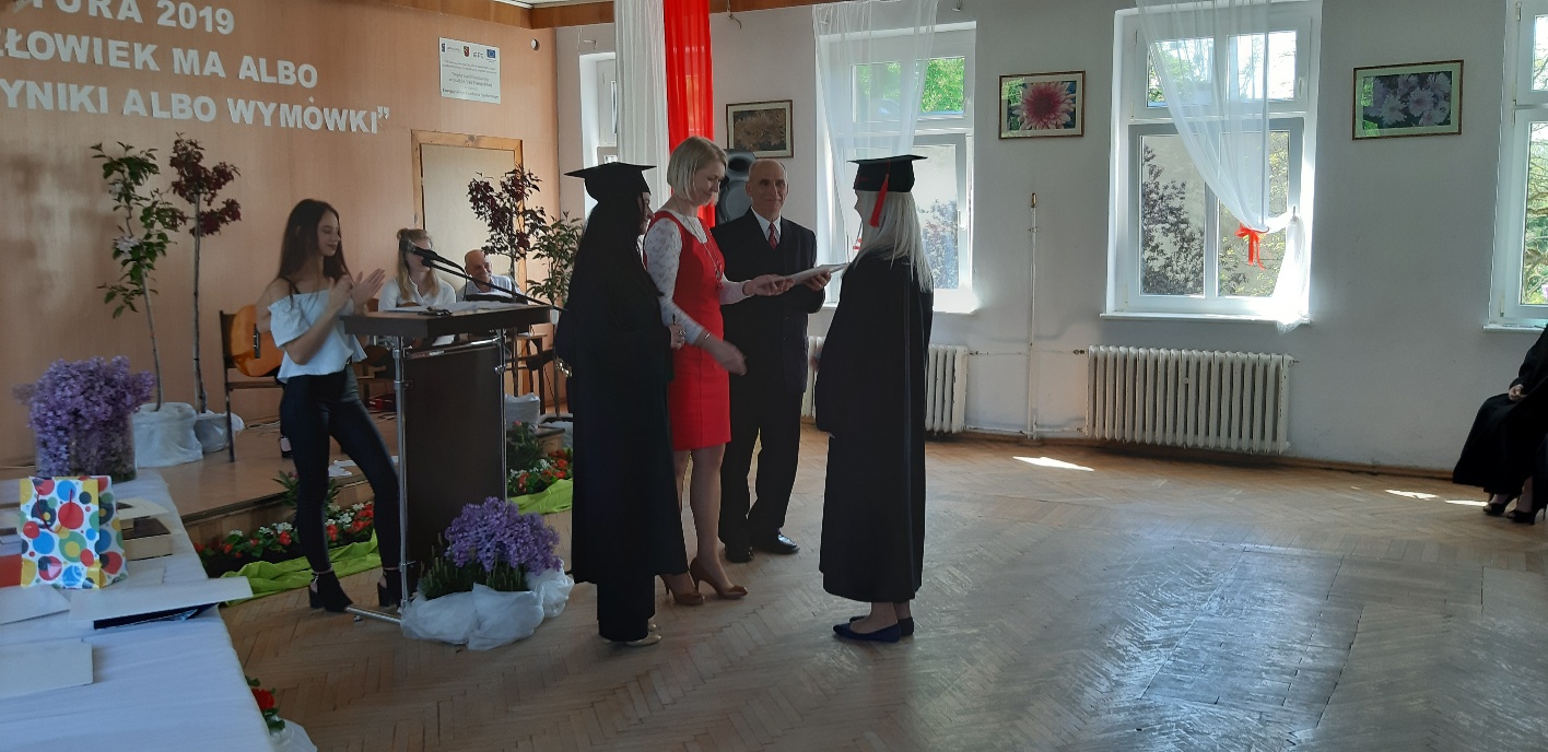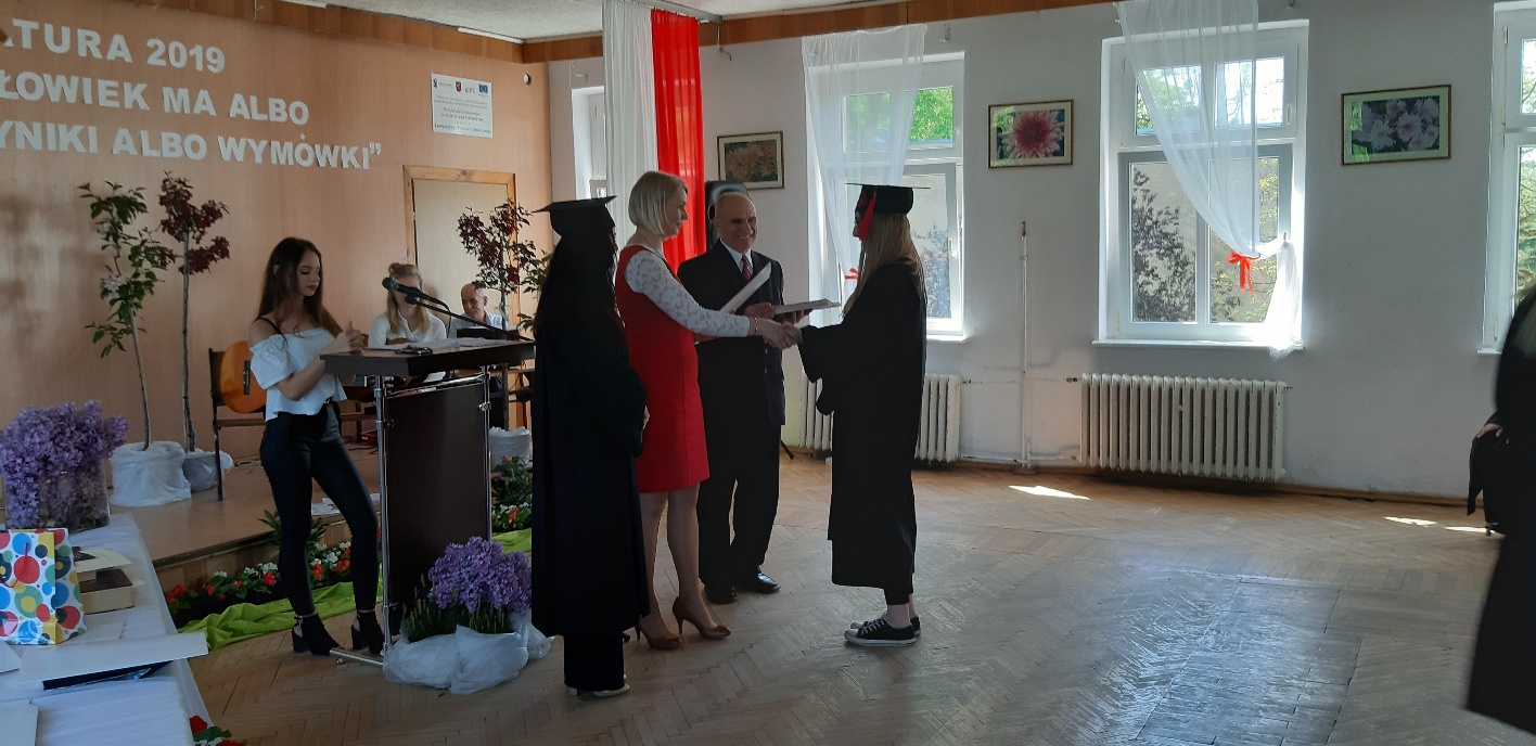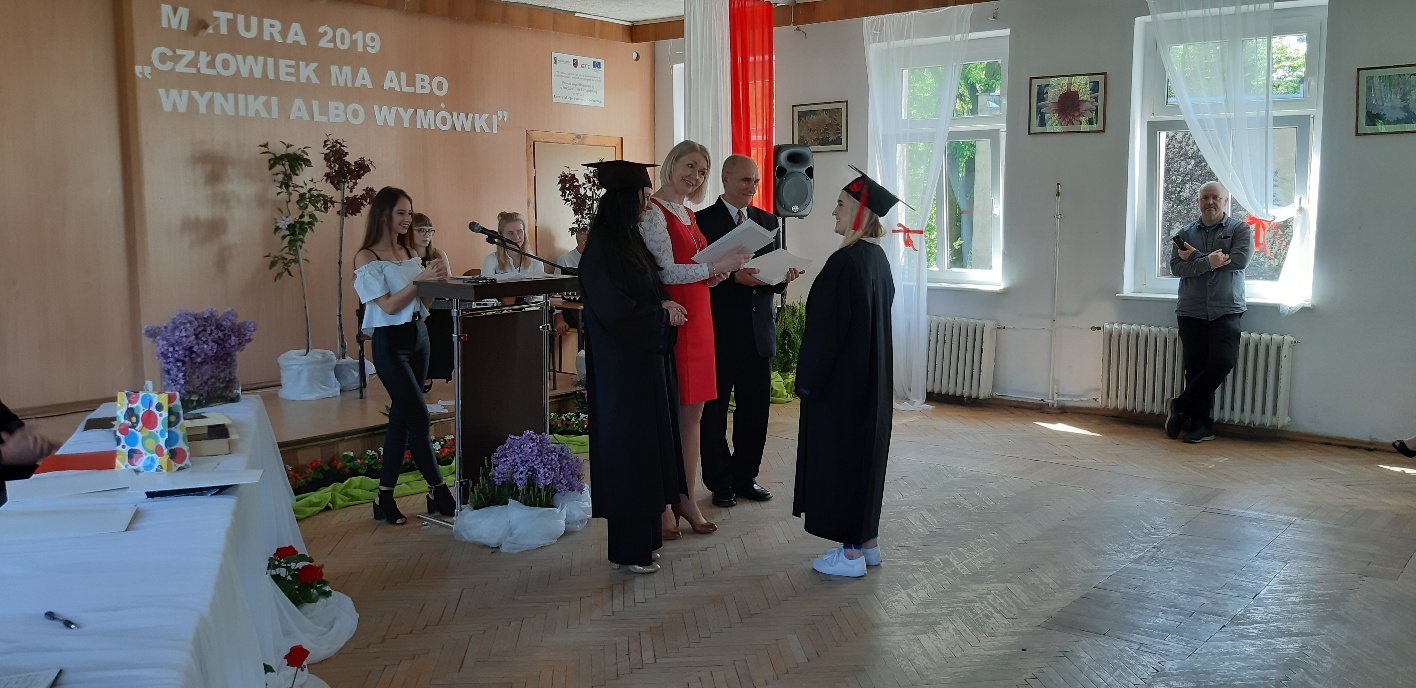 Rodzicom Gracjana wręczono List Gratulacyjny, a Przewodniczącej Rady Rodziców, pani Katarzynie Falkowskiej, podziękowania za wspieranie działalności opiekuńczo-wychowawczej szkoły. Wychowawczyni klasy, pani Andżelika Szczęch-Kaczorkiewicz, w szczególny sposób życzyła swoim podopiecznym powodzenia w dorosłym życiu – po prostu zaśpiewała a cappella ulubiony utwór ze swoich szkolnych lat. Uczniowie natomiast podziękowali nauczycielom za ich poświęcenie, za czas, za wspólne działania, za możliwość rozwijania swoich zainteresowań, za niespotykaną atmosferę zrozumienia i życzliwości. Pani Dyrektor natomiast powiedziała, by absolwenci pozwolili sobie na marzenia, by dążyli do ich spełnienia, bo bez tego człowiek się nie rozwija. Podkreśliła, że w murach szkoły spędzili 4 lata szkolne, czyli 40 miesięcy, czyli 152 tygodnie, 760 dni… Wyraziła nadzieję, że wartości, wiedza i umiejętności, które im przekazano, pomogą osiągać kolejne cele i pokonywać napotkane trudności, że warto czasem zrobić jeden krok w tył, by potem wykonać trzy w przód. Dla dodania „otuchy” przytoczyła ulubiony fragment z Pieśni IX Jana Kochanowskiego – nieco parafrazując – „Nie porzucaj nadzieje, jakoć się kolwiek dzieje: bo nie już słońce ostatnie zachodzi, a po złym dniu piękny dzień przychodzi”…