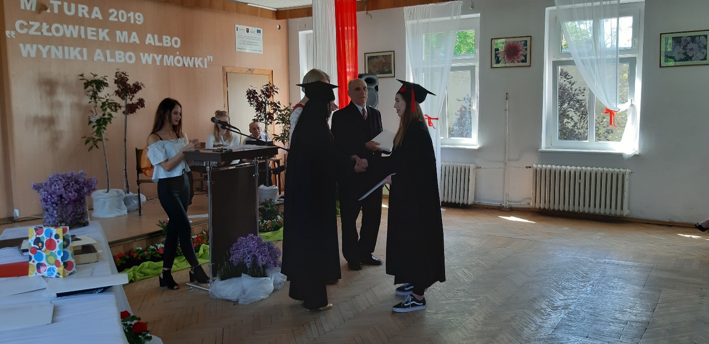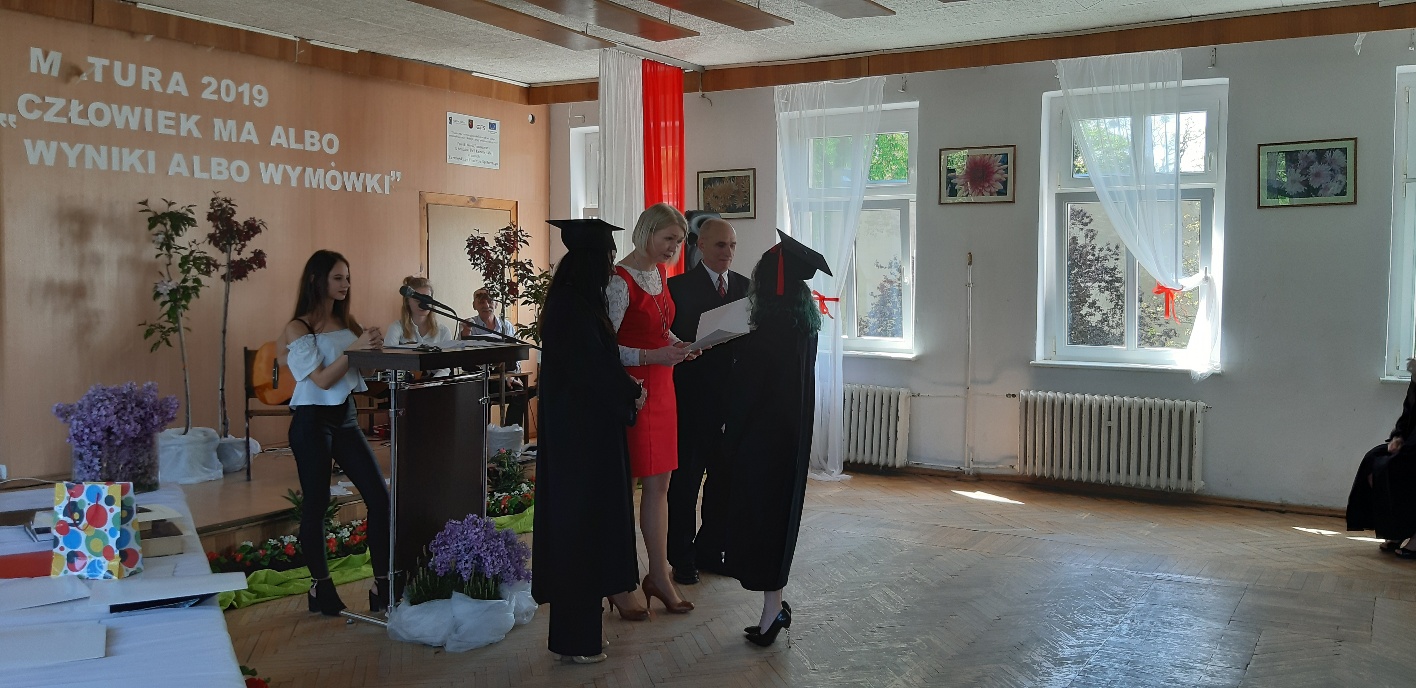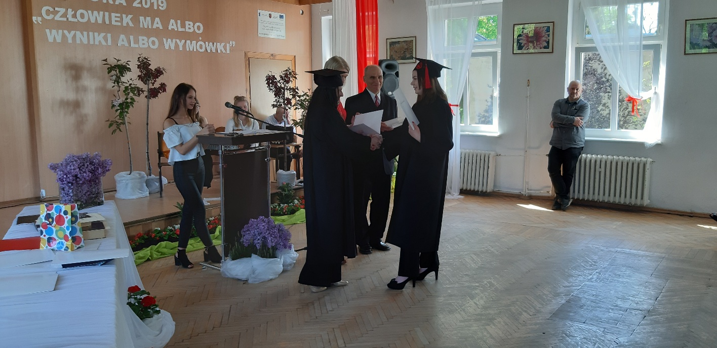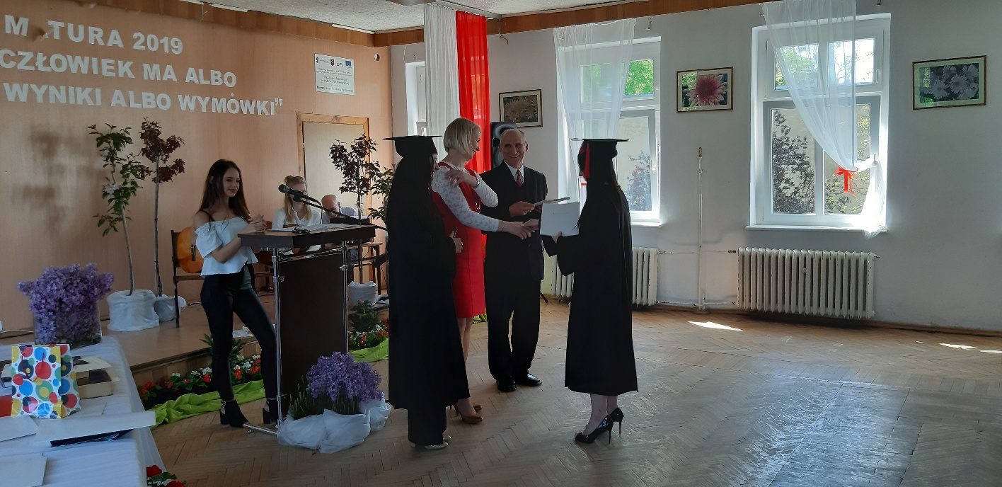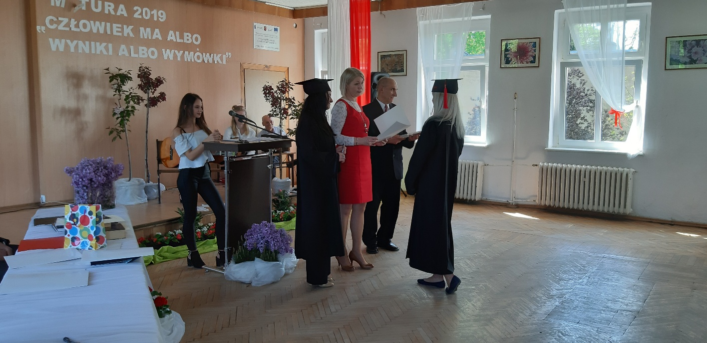 Rodzicom Gracjana wręczono List Gratulacyjny, a Przewodniczącej Rady Rodziców, pani Katarzynie Falkowskiej, podziękowania za wspieranie działalności opiekuńczo-wychowawczej szkoły. Wychowawczyni klasy, pani Andżelika Szczęch-Kaczorkiewicz, w szczególny sposób życzyła swoim podopiecznym powodzenia w dorosłym życiu – po prostu zaśpiewała a cappella ulubiony utwór ze swoich szkolnych lat. Uczniowie natomiast podziękowali nauczycielom za ich poświęcenie, za czas, za wspólne działania, za możliwość rozwijania swoich zainteresowań, za niespotykaną atmosferę zrozumienia i życzliwości. Pani Dyrektor natomiast powiedziała, by absolwenci pozwolili sobie na marzenia, by dążyli do ich spełnienia, bo bez tego człowiek się nie rozwija. Podkreśliła, że w murach szkoły spędzili 4 lata szkolne, czyli 40 miesięcy, czyli 152 tygodnie, 760 dni… Wyraziła nadzieję, że wartości, wiedza i umiejętności, które im przekazano, pomogą osiągać kolejne cele i pokonywać napotkane trudności, że warto czasem zrobić jeden krok w tył, by potem wykonać trzy w przód. Dla dodania „otuchy” przytoczyła ulubiony fragment z Pieśni IX Jana Kochanowskiego – nieco parafrazując – „Nie porzucaj nadzieje, jakoć się kolwiek dzieje: bo nie już słońce ostatnie zachodzi, a po złym dniu piękny dzień przychodzi”…