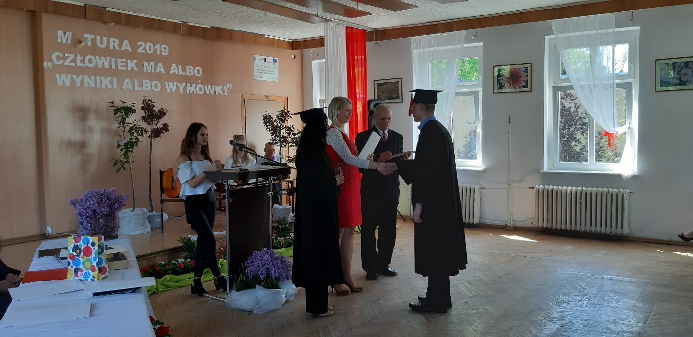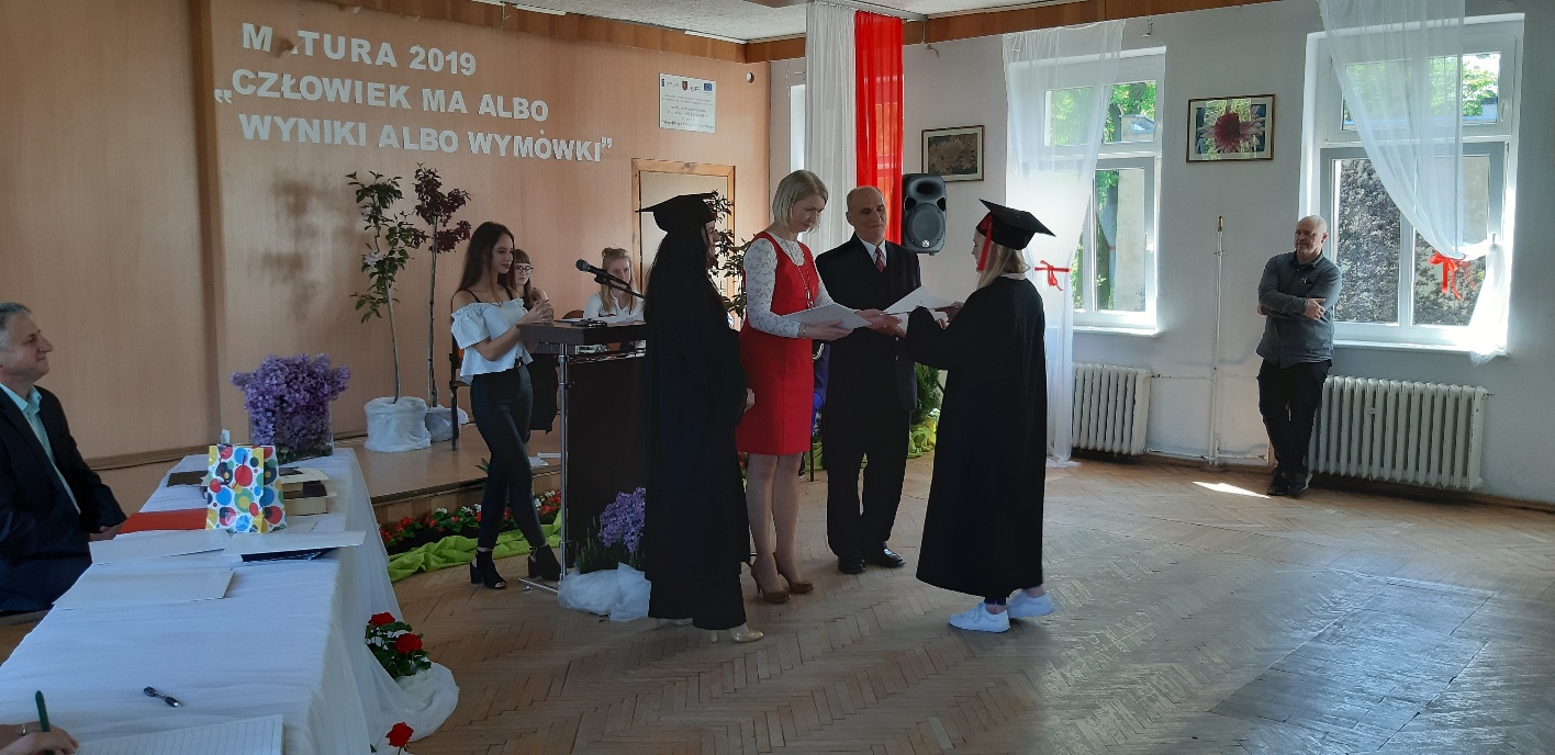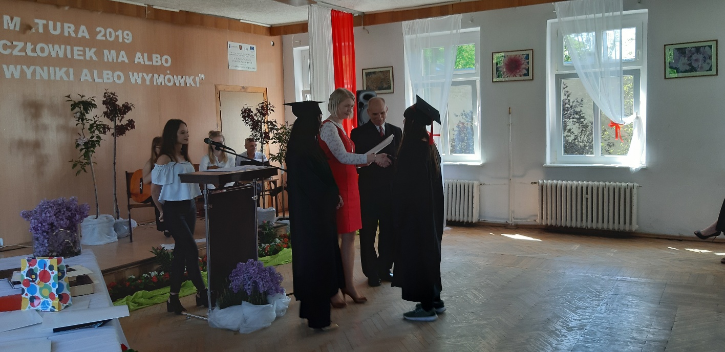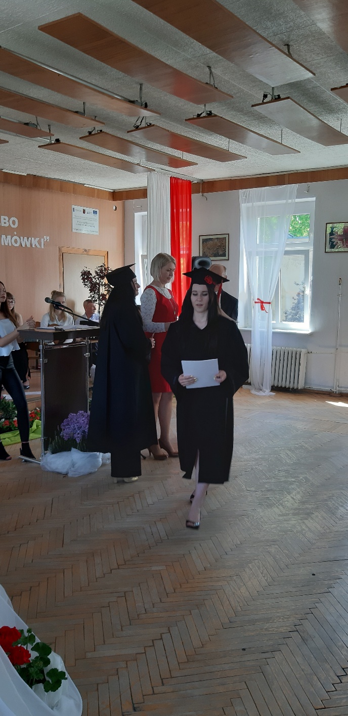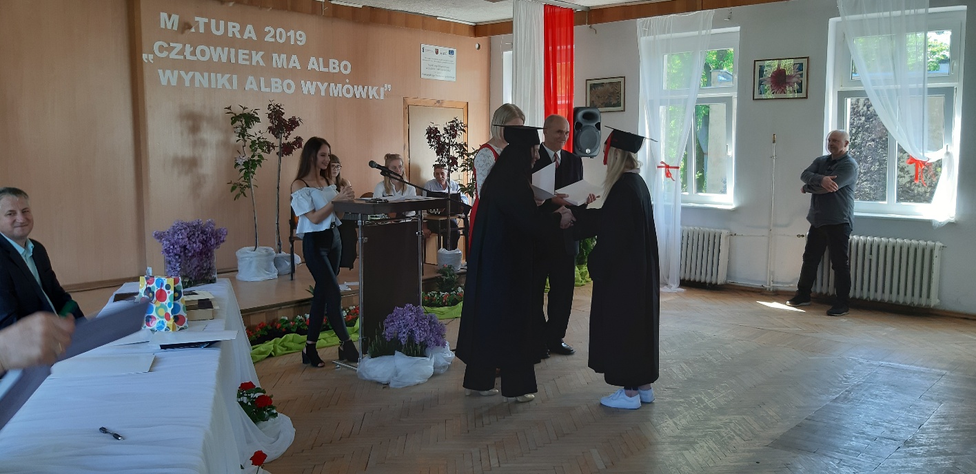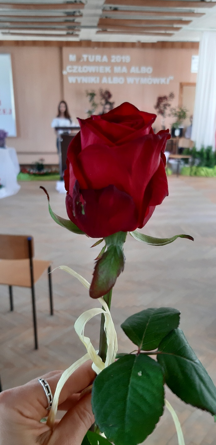 Rodzicom Gracjana wręczono List Gratulacyjny, a Przewodniczącej Rady Rodziców, pani Katarzynie Falkowskiej, podziękowania za wspieranie działalności opiekuńczo-wychowawczej szkoły. Wychowawczyni klasy, pani Andżelika Szczęch-Kaczorkiewicz, w szczególny sposób życzyła swoim podopiecznym powodzenia w dorosłym życiu – po prostu zaśpiewała a cappella ulubiony utwór ze swoich szkolnych lat. Uczniowie natomiast podziękowali nauczycielom za ich poświęcenie, za czas, za wspólne działania, za możliwość rozwijania swoich zainteresowań, za niespotykaną atmosferę zrozumienia i życzliwości. Pani Dyrektor natomiast powiedziała, by absolwenci pozwolili sobie na marzenia, by dążyli do ich spełnienia, bo bez tego człowiek się nie rozwija. Podkreśliła, że w murach szkoły spędzili 4 lata szkolne, czyli 40 miesięcy, czyli 152 tygodnie, 760 dni… Wyraziła nadzieję, że wartości, wiedza i umiejętności, które im przekazano, pomogą osiągać kolejne cele i pokonywać napotkane trudności, że warto czasem zrobić jeden krok w tył, by potem wykonać trzy w przód. Dla dodania „otuchy” przytoczyła ulubiony fragment z Pieśni IX Jana Kochanowskiego – nieco parafrazując – „Nie porzucaj nadzieje, jakoć się kolwiek dzieje: bo nie już słońce ostatnie zachodzi, a po złym dniu piękny dzień przychodzi”…