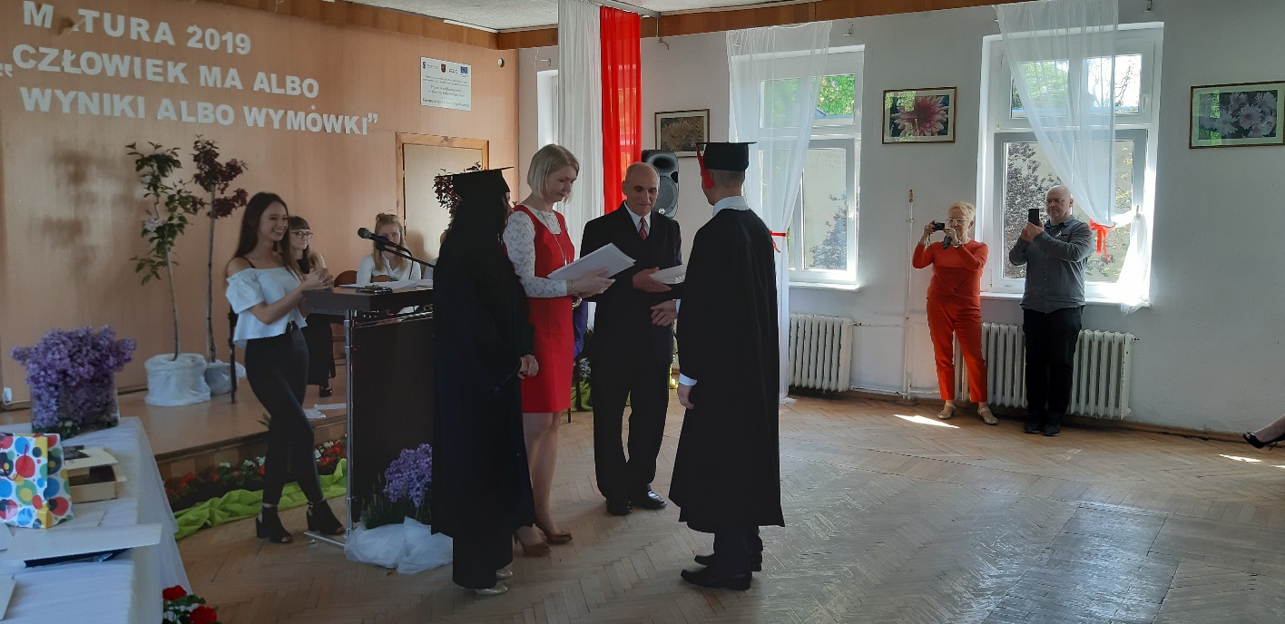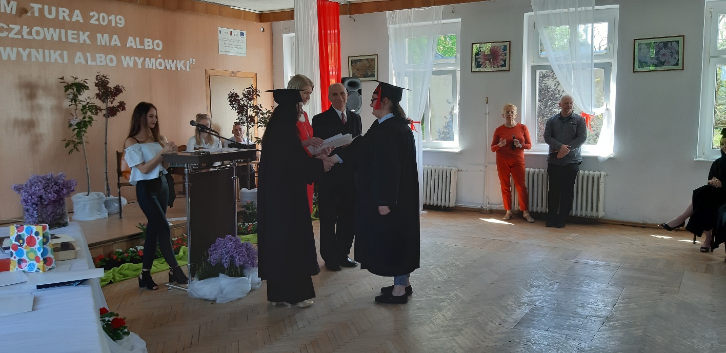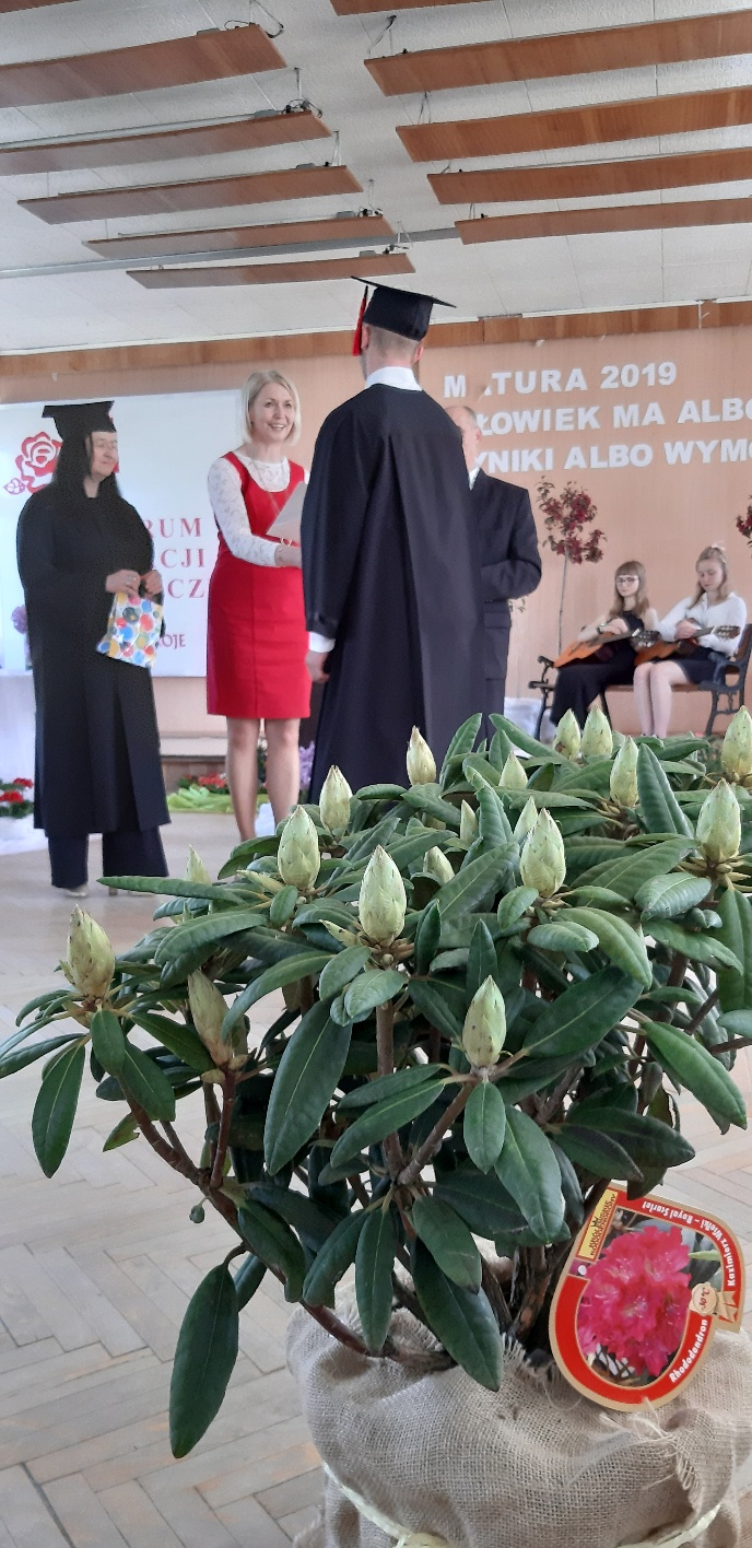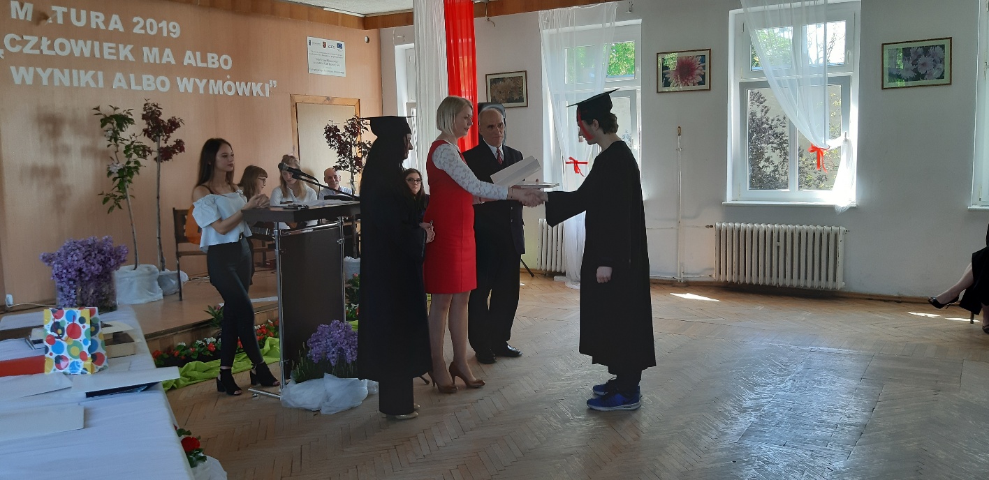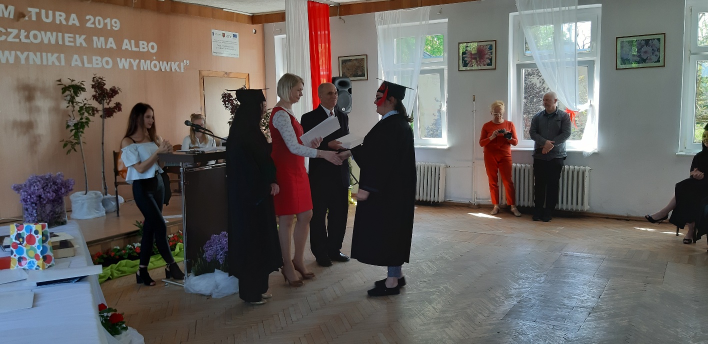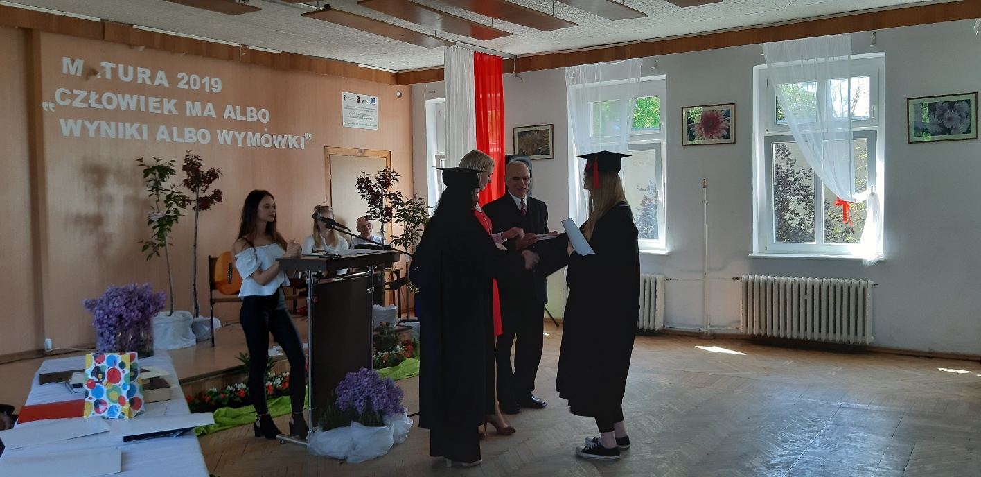 Rodzicom Gracjana wręczono List Gratulacyjny, a Przewodniczącej Rady Rodziców, pani Katarzynie Falkowskiej, podziękowania za wspieranie działalności opiekuńczo-wychowawczej szkoły. Wychowawczyni klasy, pani Andżelika Szczęch-Kaczorkiewicz, w szczególny sposób życzyła swoim podopiecznym powodzenia w dorosłym życiu – po prostu zaśpiewała a cappella ulubiony utwór ze swoich szkolnych lat. Uczniowie natomiast podziękowali nauczycielom za ich poświęcenie, za czas, za wspólne działania, za możliwość rozwijania swoich zainteresowań, za niespotykaną atmosferę zrozumienia i życzliwości. Pani Dyrektor natomiast powiedziała, by absolwenci pozwolili sobie na marzenia, by dążyli do ich spełnienia, bo bez tego człowiek się nie rozwija. Podkreśliła, że w murach szkoły spędzili 4 lata szkolne, czyli 40 miesięcy, czyli 152 tygodnie, 760 dni… Wyraziła nadzieję, że wartości, wiedza i umiejętności, które im przekazano, pomogą osiągać kolejne cele i pokonywać napotkane trudności, że warto czasem zrobić jeden krok w tył, by potem wykonać trzy w przód. Dla dodania „otuchy” przytoczyła ulubiony fragment z Pieśni IX Jana Kochanowskiego – nieco parafrazując – „Nie porzucaj nadzieje, jakoć się kolwiek dzieje: bo nie już słońce ostatnie zachodzi, a po złym dniu piękny dzień przychodzi”…