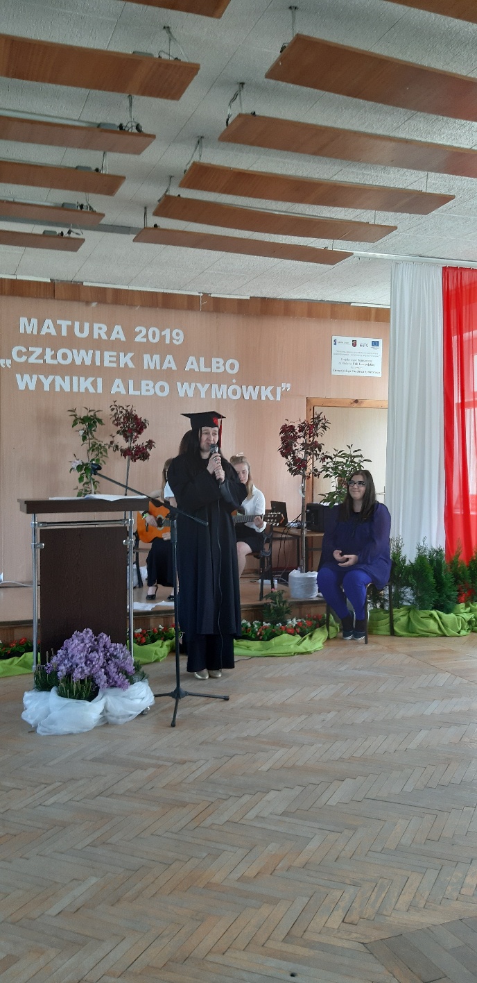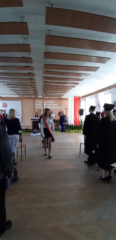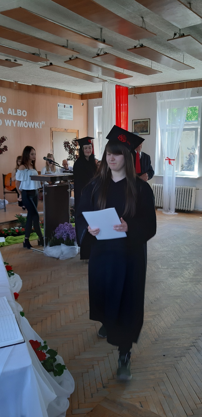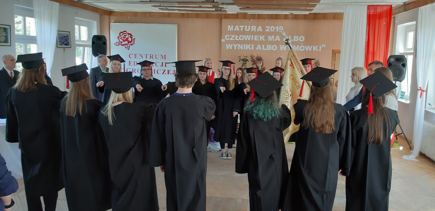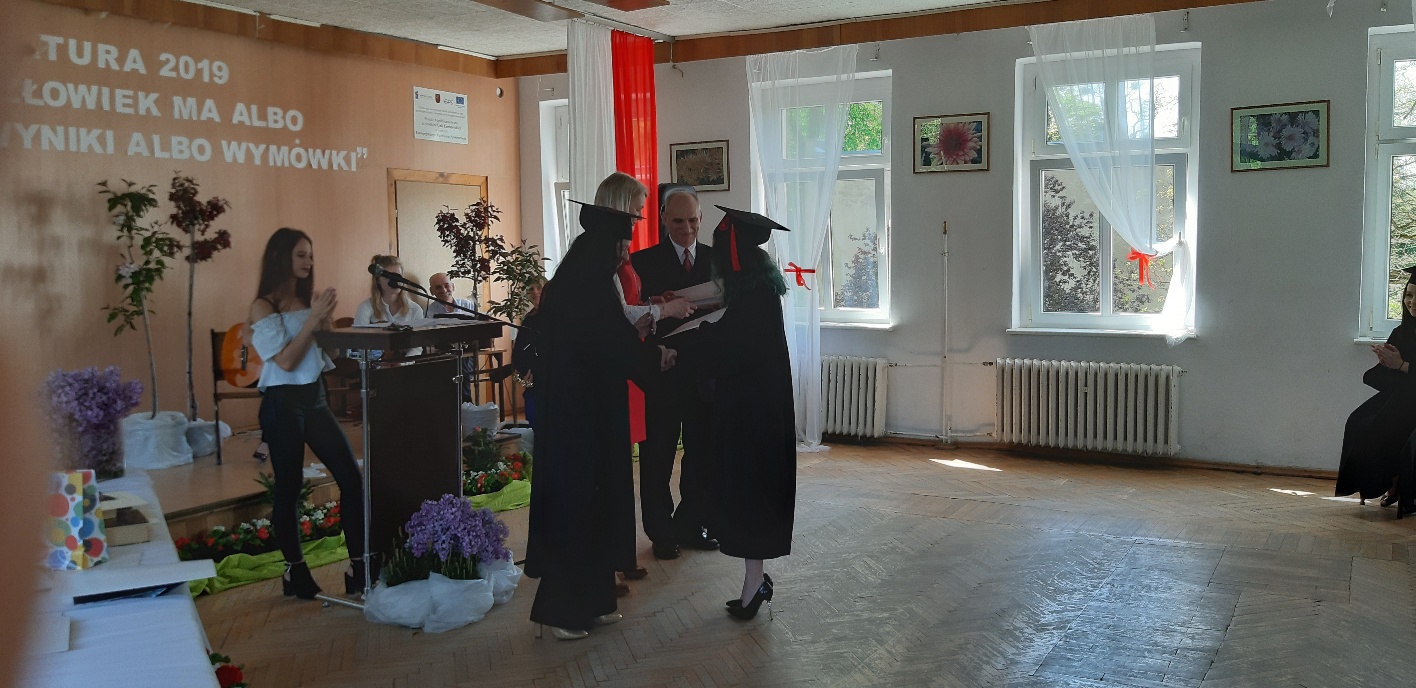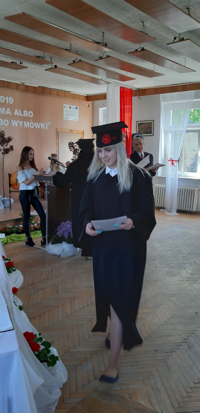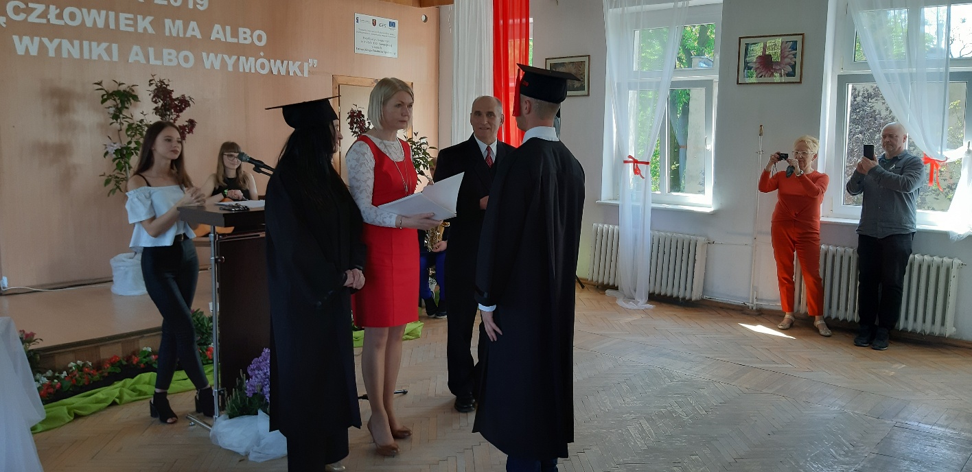 Rodzicom Gracjana wręczono List Gratulacyjny, a Przewodniczącej Rady Rodziców, pani Katarzynie Falkowskiej, podziękowania za wspieranie działalności opiekuńczo-wychowawczej szkoły. Wychowawczyni klasy, pani Andżelika Szczęch-Kaczorkiewicz, w szczególny sposób życzyła swoim podopiecznym powodzenia w dorosłym życiu – po prostu zaśpiewała a cappella ulubiony utwór ze swoich szkolnych lat. Uczniowie natomiast podziękowali nauczycielom za ich poświęcenie, za czas, za wspólne działania, za możliwość rozwijania swoich zainteresowań, za niespotykaną atmosferę zrozumienia i życzliwości. Pani Dyrektor natomiast powiedziała, by absolwenci pozwolili sobie na marzenia, by dążyli do ich spełnienia, bo bez tego człowiek się nie rozwija. Podkreśliła, że w murach szkoły spędzili 4 lata szkolne, czyli 40 miesięcy, czyli 152 tygodnie, 760 dni… Wyraziła nadzieję, że wartości, wiedza i umiejętności, które im przekazano, pomogą osiągać kolejne cele i pokonywać napotkane trudności, że warto czasem zrobić jeden krok w tył, by potem wykonać trzy w przód. Dla dodania „otuchy” przytoczyła ulubiony fragment z Pieśni IX Jana Kochanowskiego – nieco parafrazując – „Nie porzucaj nadzieje, jakoć się kolwiek dzieje: bo nie już słońce ostatnie zachodzi, a po złym dniu piękny dzień przychodzi”…