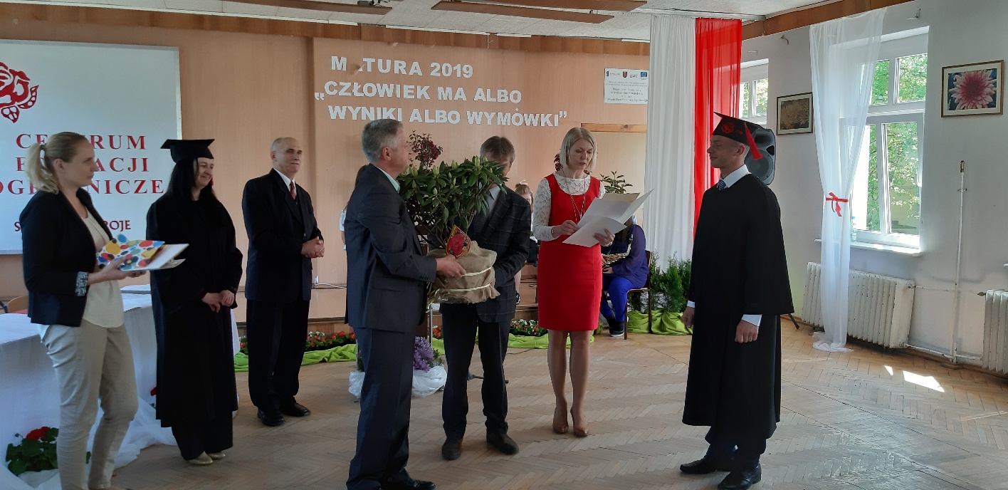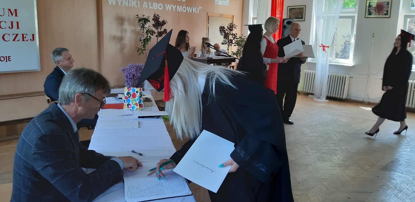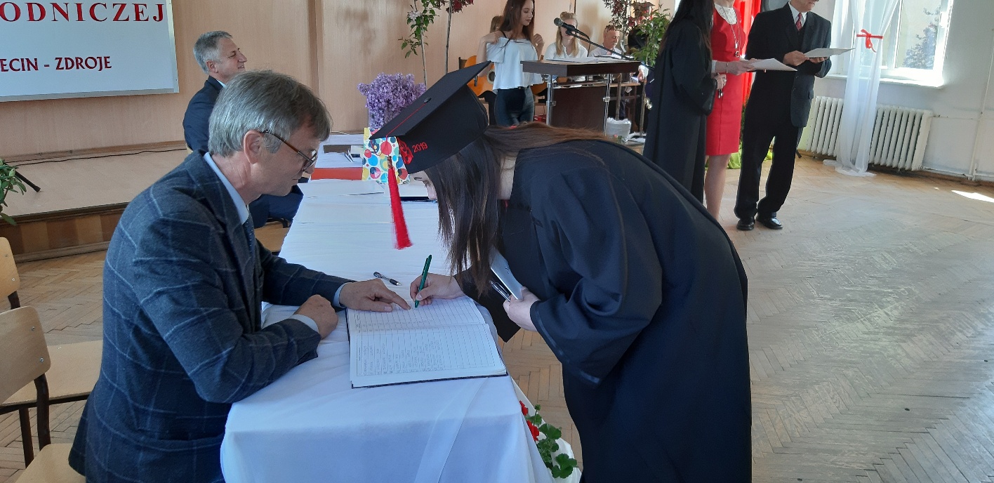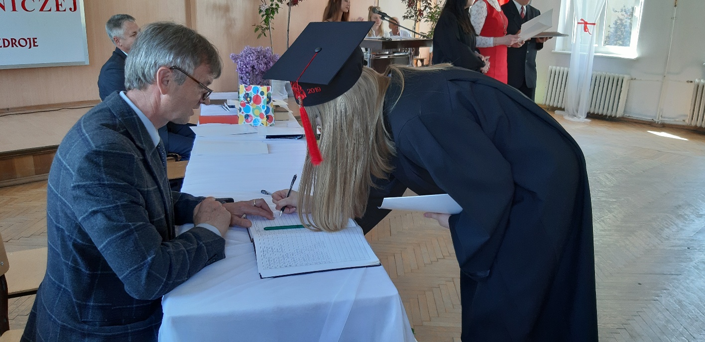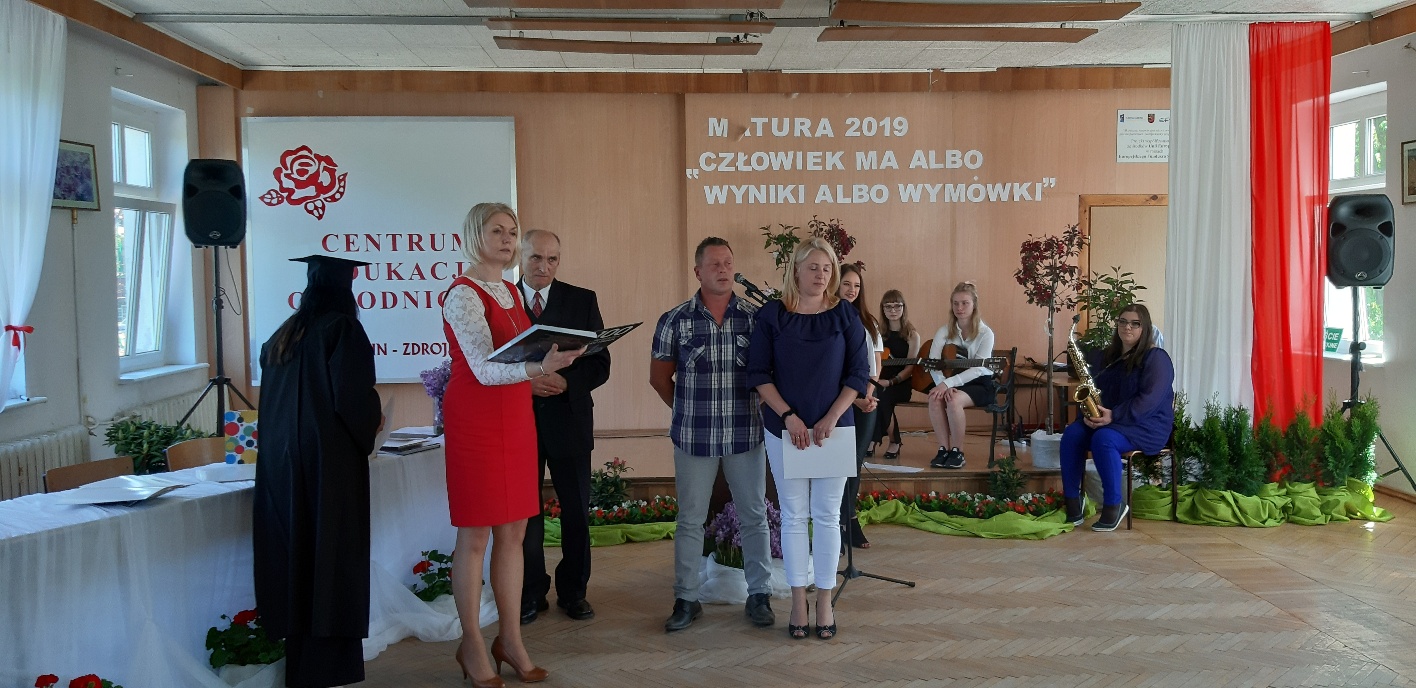 Rodzicom Gracjana wręczono List Gratulacyjny, a Przewodniczącej Rady Rodziców, pani Katarzynie Falkowskiej, podziękowania za wspieranie działalności opiekuńczo-wychowawczej szkoły. Wychowawczyni klasy, pani Andżelika Szczęch-Kaczorkiewicz, w szczególny sposób życzyła swoim podopiecznym powodzenia w dorosłym życiu – po prostu zaśpiewała a cappella ulubiony utwór ze swoich szkolnych lat. Uczniowie natomiast podziękowali nauczycielom za ich poświęcenie, za czas, za wspólne działania, za możliwość rozwijania swoich zainteresowań, za niespotykaną atmosferę zrozumienia i życzliwości. Pani Dyrektor natomiast powiedziała, by absolwenci pozwolili sobie na marzenia, by dążyli do ich spełnienia, bo bez tego człowiek się nie rozwija. Podkreśliła, że w murach szkoły spędzili 4 lata szkolne, czyli 40 miesięcy, czyli 152 tygodnie, 760 dni… Wyraziła nadzieję, że wartości, wiedza i umiejętności, które im przekazano, pomogą osiągać kolejne cele i pokonywać napotkane trudności, że warto czasem zrobić jeden krok w tył, by potem wykonać trzy w przód. Dla dodania „otuchy” przytoczyła ulubiony fragment z Pieśni IX Jana Kochanowskiego – nieco parafrazując – „Nie porzucaj nadzieje, jakoć się kolwiek dzieje: bo nie już słońce ostatnie zachodzi, a po złym dniu piękny dzień przychodzi”…