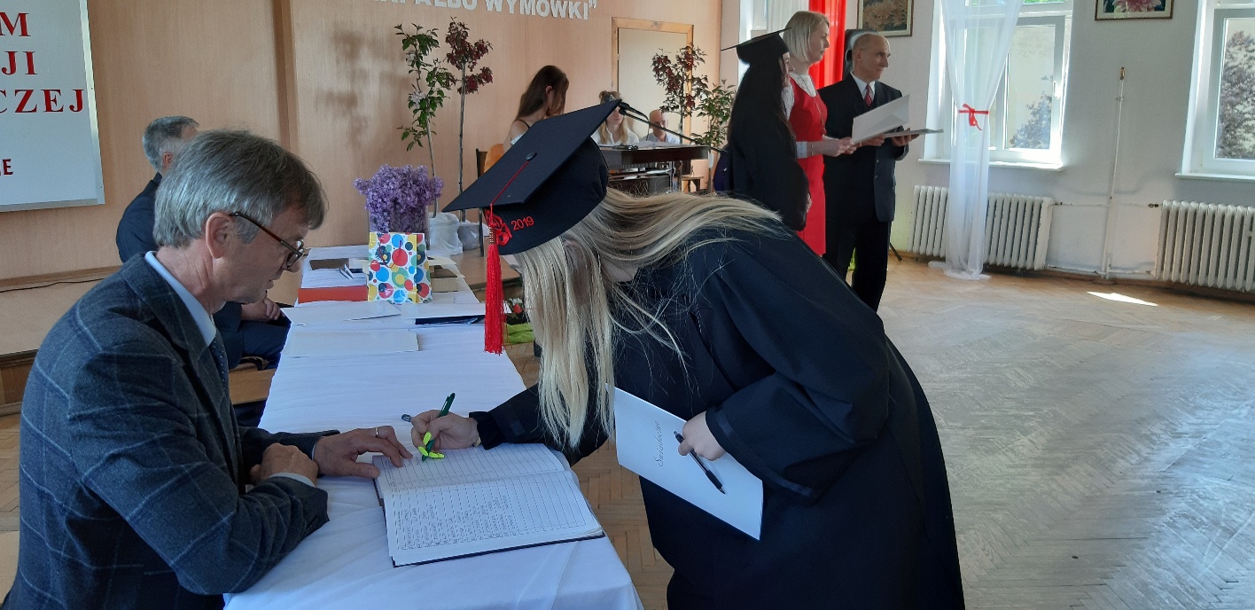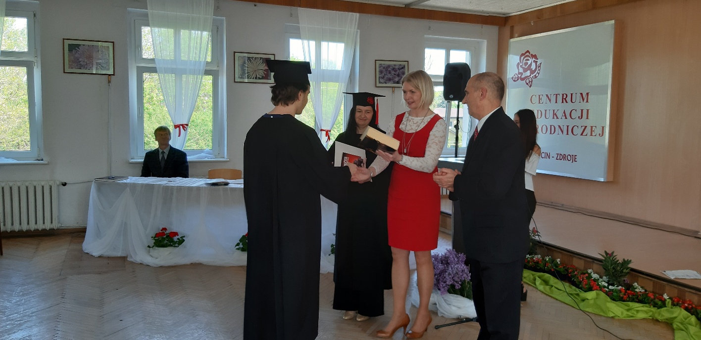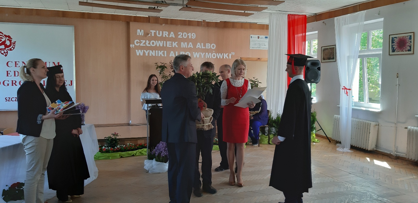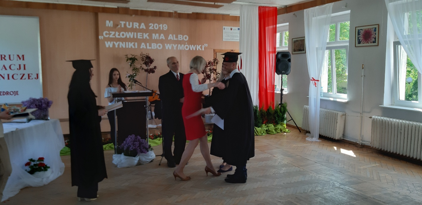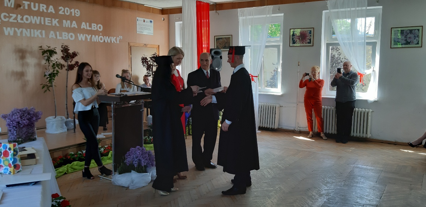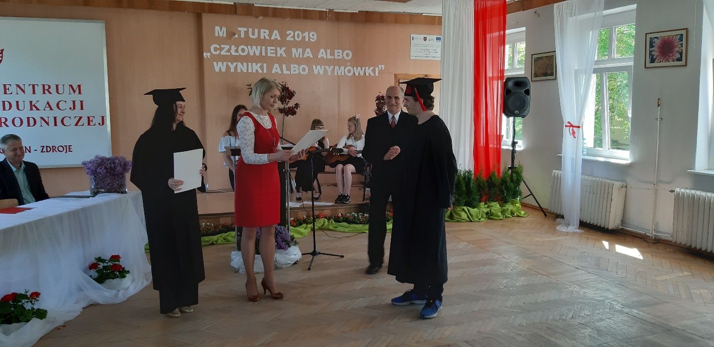 Rodzicom Gracjana wręczono List Gratulacyjny, a Przewodniczącej Rady Rodziców, pani Katarzynie Falkowskiej, podziękowania za wspieranie działalności opiekuńczo-wychowawczej szkoły. Wychowawczyni klasy, pani Andżelika Szczęch-Kaczorkiewicz, w szczególny sposób życzyła swoim podopiecznym powodzenia w dorosłym życiu – po prostu zaśpiewała a cappella ulubiony utwór ze swoich szkolnych lat. Uczniowie natomiast podziękowali nauczycielom za ich poświęcenie, za czas, za wspólne działania, za możliwość rozwijania swoich zainteresowań, za niespotykaną atmosferę zrozumienia i życzliwości. Pani Dyrektor natomiast powiedziała, by absolwenci pozwolili sobie na marzenia, by dążyli do ich spełnienia, bo bez tego człowiek się nie rozwija. Podkreśliła, że w murach szkoły spędzili 4 lata szkolne, czyli 40 miesięcy, czyli 152 tygodnie, 760 dni… Wyraziła nadzieję, że wartości, wiedza i umiejętności, które im przekazano, pomogą osiągać kolejne cele i pokonywać napotkane trudności, że warto czasem zrobić jeden krok w tył, by potem wykonać trzy w przód. Dla dodania „otuchy” przytoczyła ulubiony fragment z Pieśni IX Jana Kochanowskiego – nieco parafrazując – „Nie porzucaj nadzieje, jakoć się kolwiek dzieje: bo nie już słońce ostatnie zachodzi, a po złym dniu piękny dzień przychodzi”…