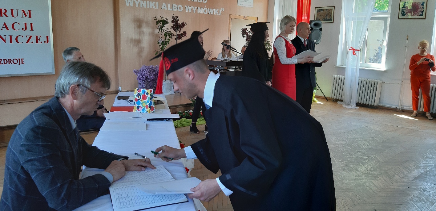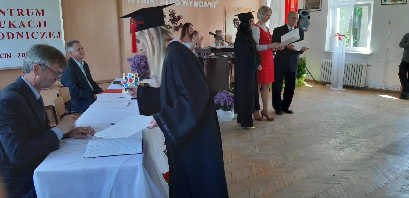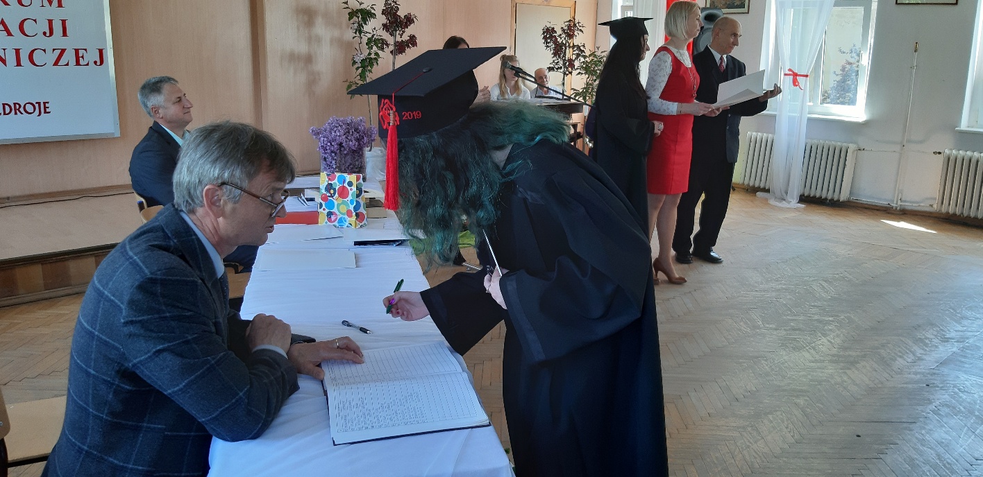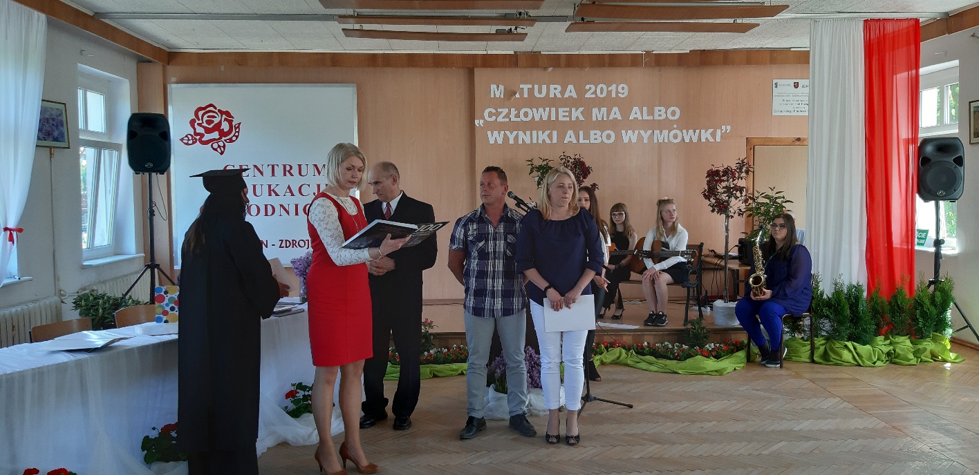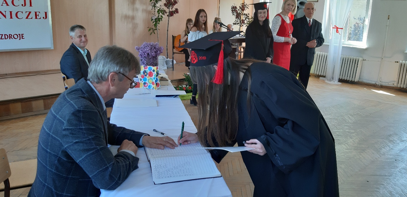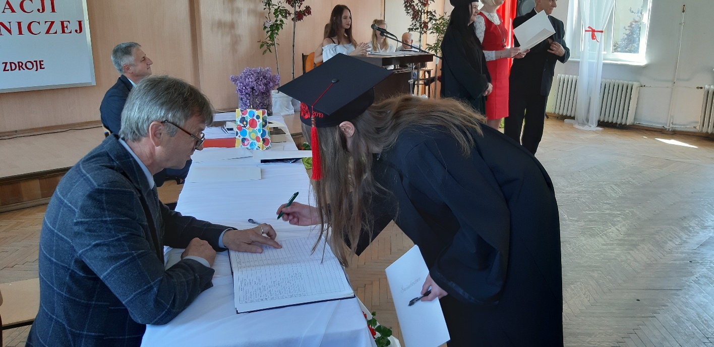 Rodzicom Gracjana wręczono List Gratulacyjny, a Przewodniczącej Rady Rodziców, pani Katarzynie Falkowskiej, podziękowania za wspieranie działalności opiekuńczo-wychowawczej szkoły. Wychowawczyni klasy, pani Andżelika Szczęch-Kaczorkiewicz, w szczególny sposób życzyła swoim podopiecznym powodzenia w dorosłym życiu – po prostu zaśpiewała a cappella ulubiony utwór ze swoich szkolnych lat. Uczniowie natomiast podziękowali nauczycielom za ich poświęcenie, za czas, za wspólne działania, za możliwość rozwijania swoich zainteresowań, za niespotykaną atmosferę zrozumienia i życzliwości. Pani Dyrektor natomiast powiedziała, by absolwenci pozwolili sobie na marzenia, by dążyli do ich spełnienia, bo bez tego człowiek się nie rozwija. Podkreśliła, że w murach szkoły spędzili 4 lata szkolne, czyli 40 miesięcy, czyli 152 tygodnie, 760 dni… Wyraziła nadzieję, że wartości, wiedza i umiejętności, które im przekazano, pomogą osiągać kolejne cele i pokonywać napotkane trudności, że warto czasem zrobić jeden krok w tył, by potem wykonać trzy w przód. Dla dodania „otuchy” przytoczyła ulubiony fragment z Pieśni IX Jana Kochanowskiego – nieco parafrazując – „Nie porzucaj nadzieje, jakoć się kolwiek dzieje: bo nie już słońce ostatnie zachodzi, a po złym dniu piękny dzień przychodzi”…