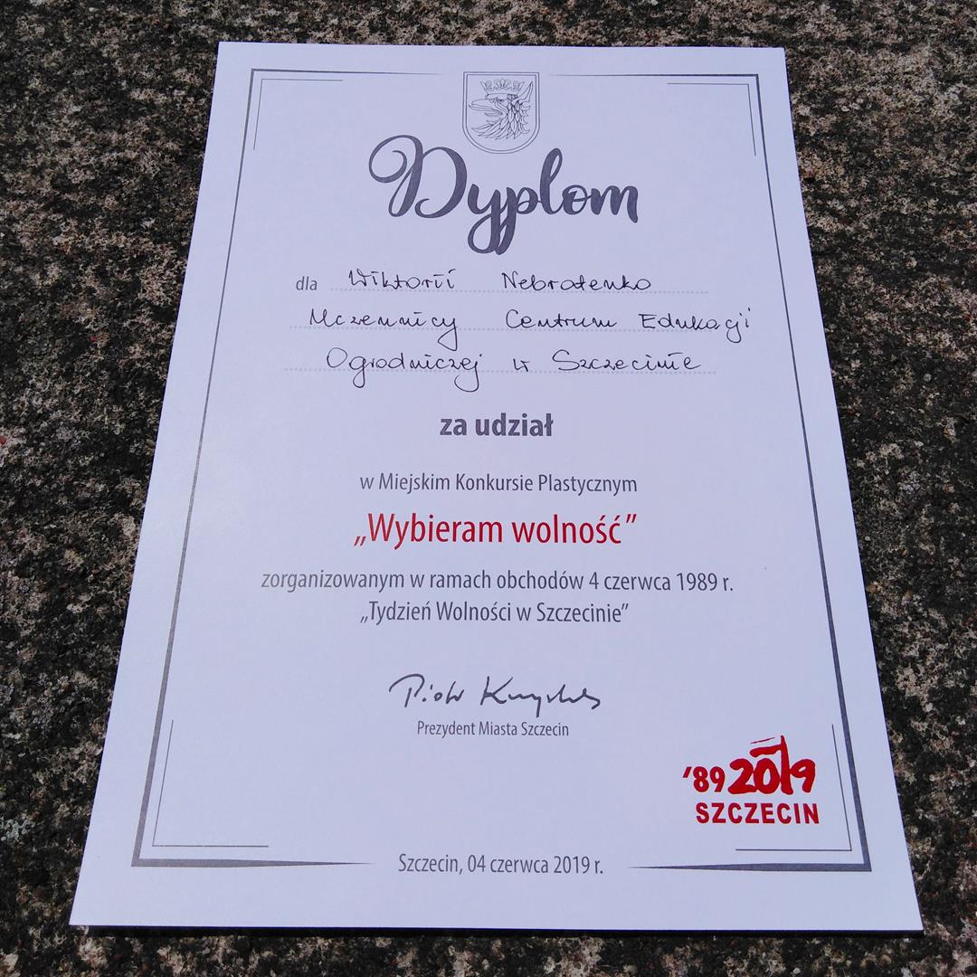 Rozstrzygniecie imprezy odbyło się 4 czerwca w Urzędzie Miasta Szczecin. Wiktoria Nebratenko, uczennica klasy I w zawodzie technik architektury krajobrazu otrzymała wyróżnienie. Wiktoria przedstawił swoją pracę o wolności pod postacią białych gołębi oraz Polski jako tętniącego serca Europy. Nasza uczennica osobiście odebrała dyplom i nagrodę z rąk Zastępcy Prezydenta Miasta Szczecin, Pana Krzysztofa Soski. Pracę Wiktorii oraz innych laureatów można osobiście oglądać w siedzibie Magistratu – w Galerii Prezydenckiej.