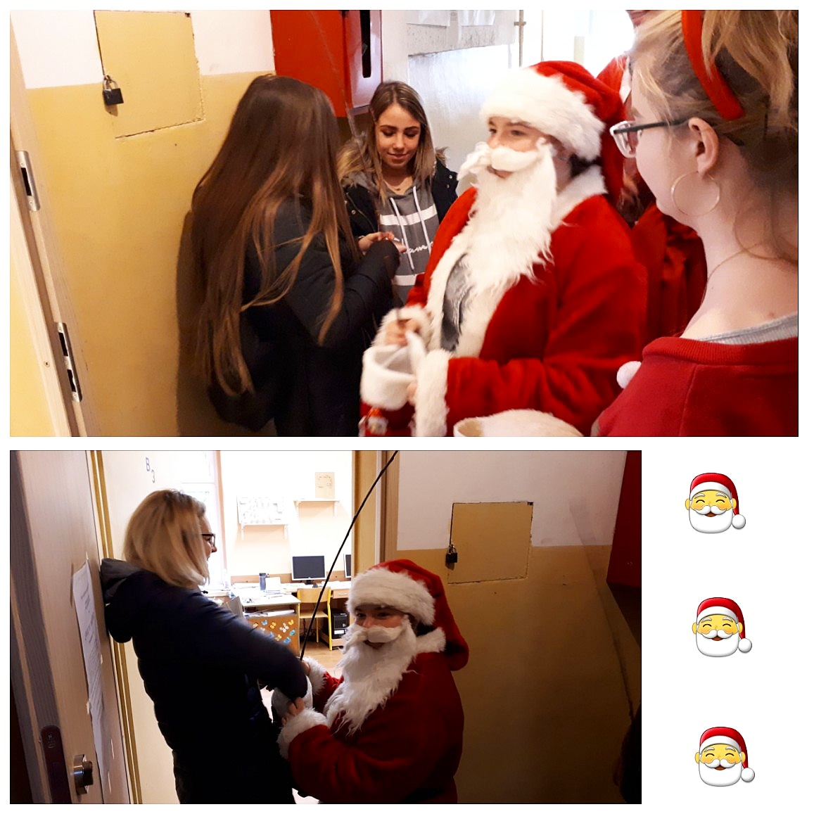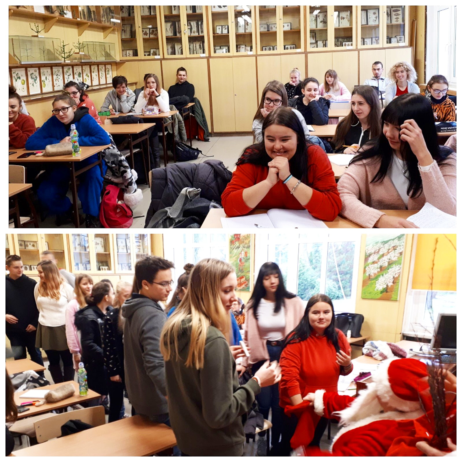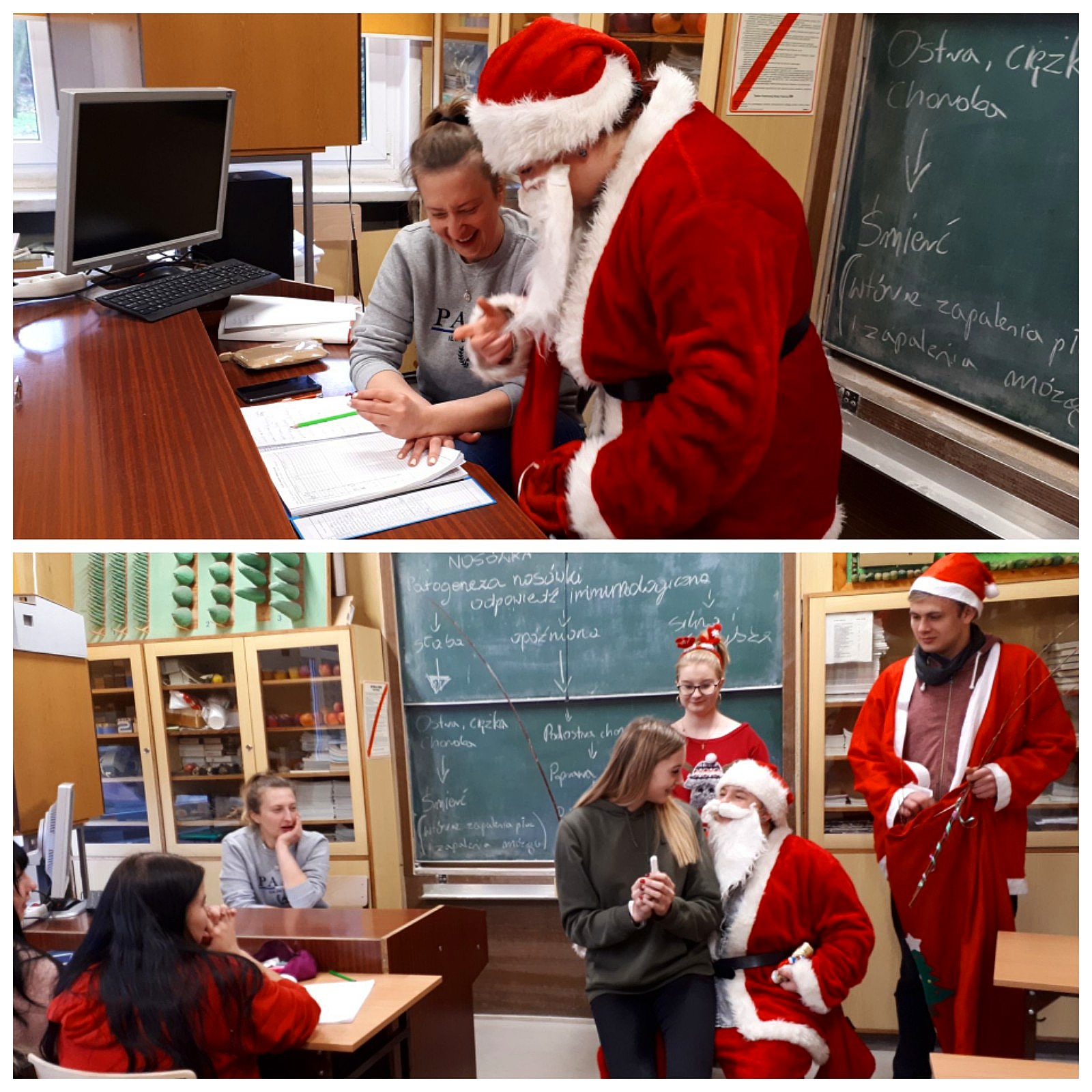 Jak co roku, mimo ciepłej aury i braku białego puchu, tak i tym razem, 6 grudnia do naszej szkoły zawitał Święty Mikołaj. Jest to dobry znak, świadczący o tym, że zarówno uczniowie naszej szkoły, jak i grono pedagogiczne było grzeczne i zasłużyło na drobne upominki i słodkości. Nasz GOŚĆ z Laponii odwiedził wszystkie klasy, nie zapomniał również o dyrekcji, nauczycielach oraz pracownikach administracji, którym wręczał czekoladowe cukierki i – żeby nie było za słodko – rózgi!:)) Wizyta ta wywołała ogrom przeżyć i uśmiechu na twarzach, zarówno uczniów, jak i nauczycieli oraz wprowadziła naszą szkołę w wyjątkowo świąteczny nastrój.
