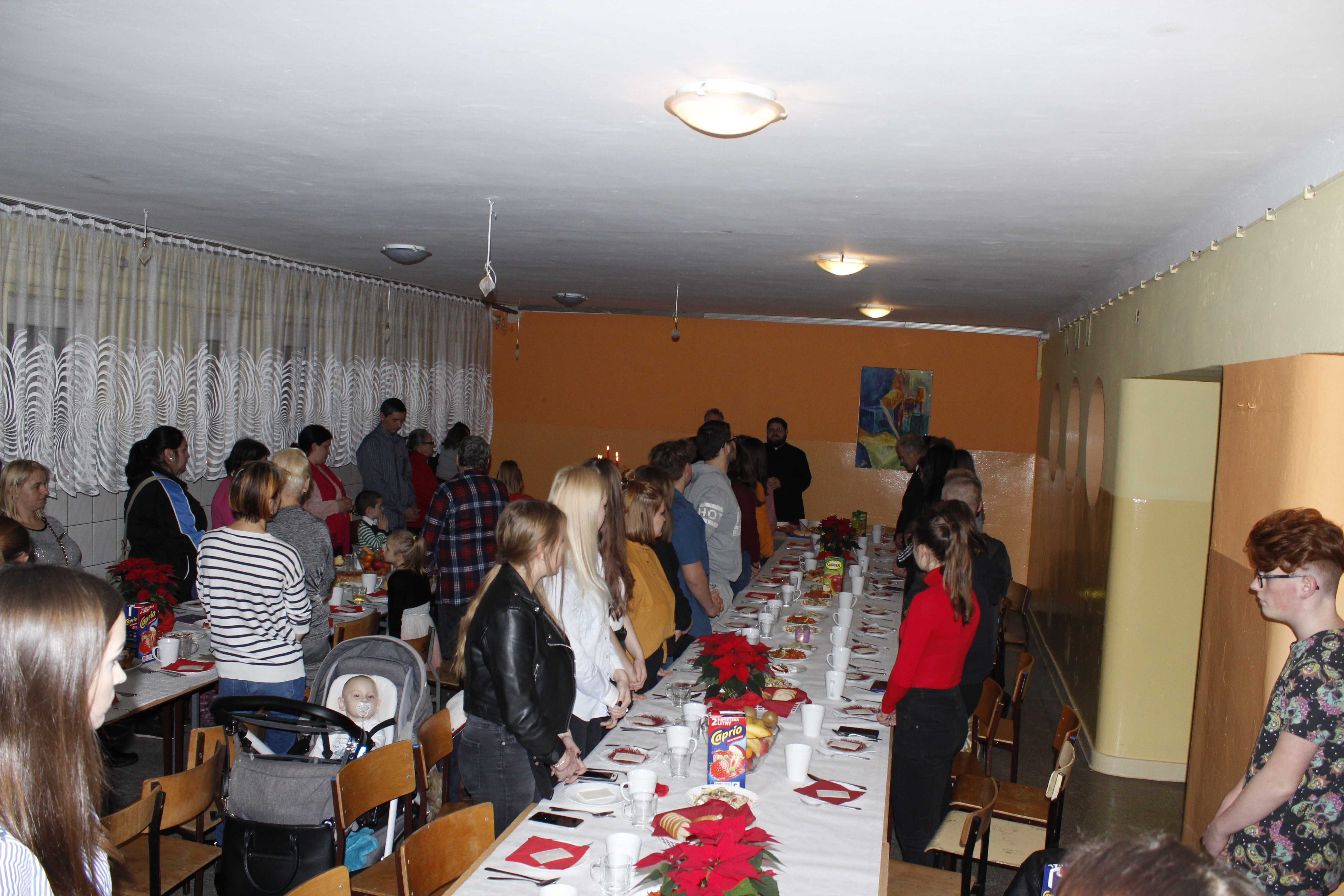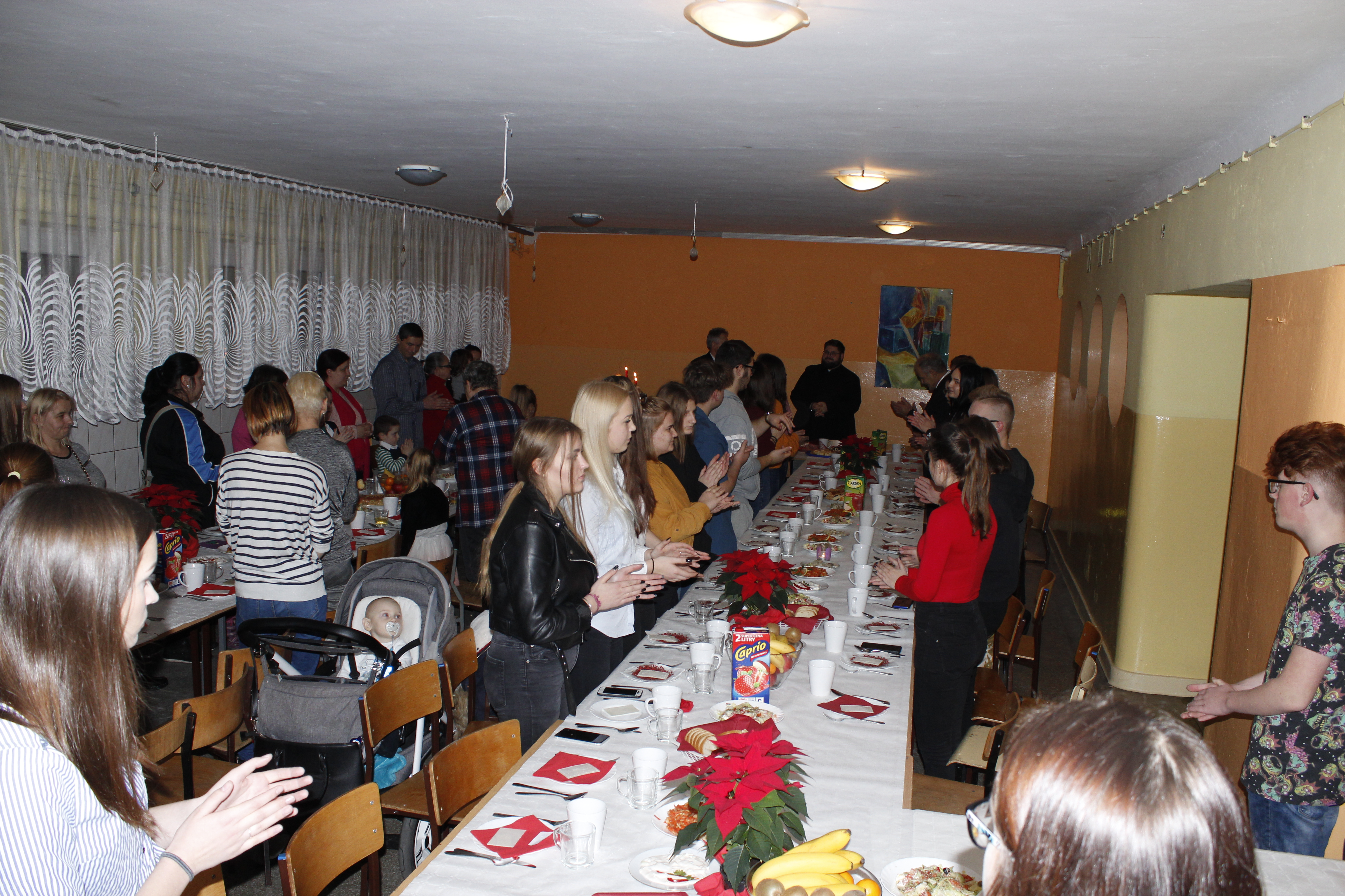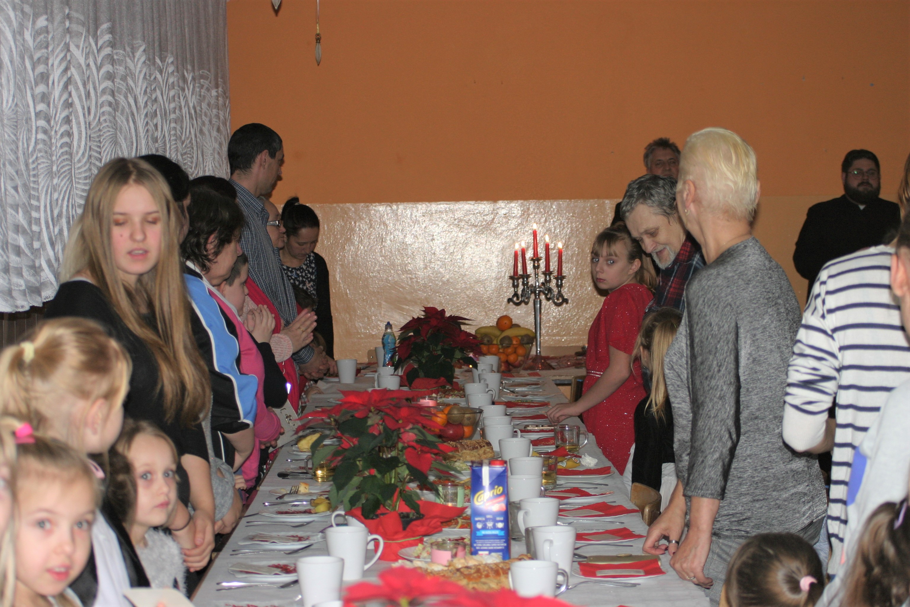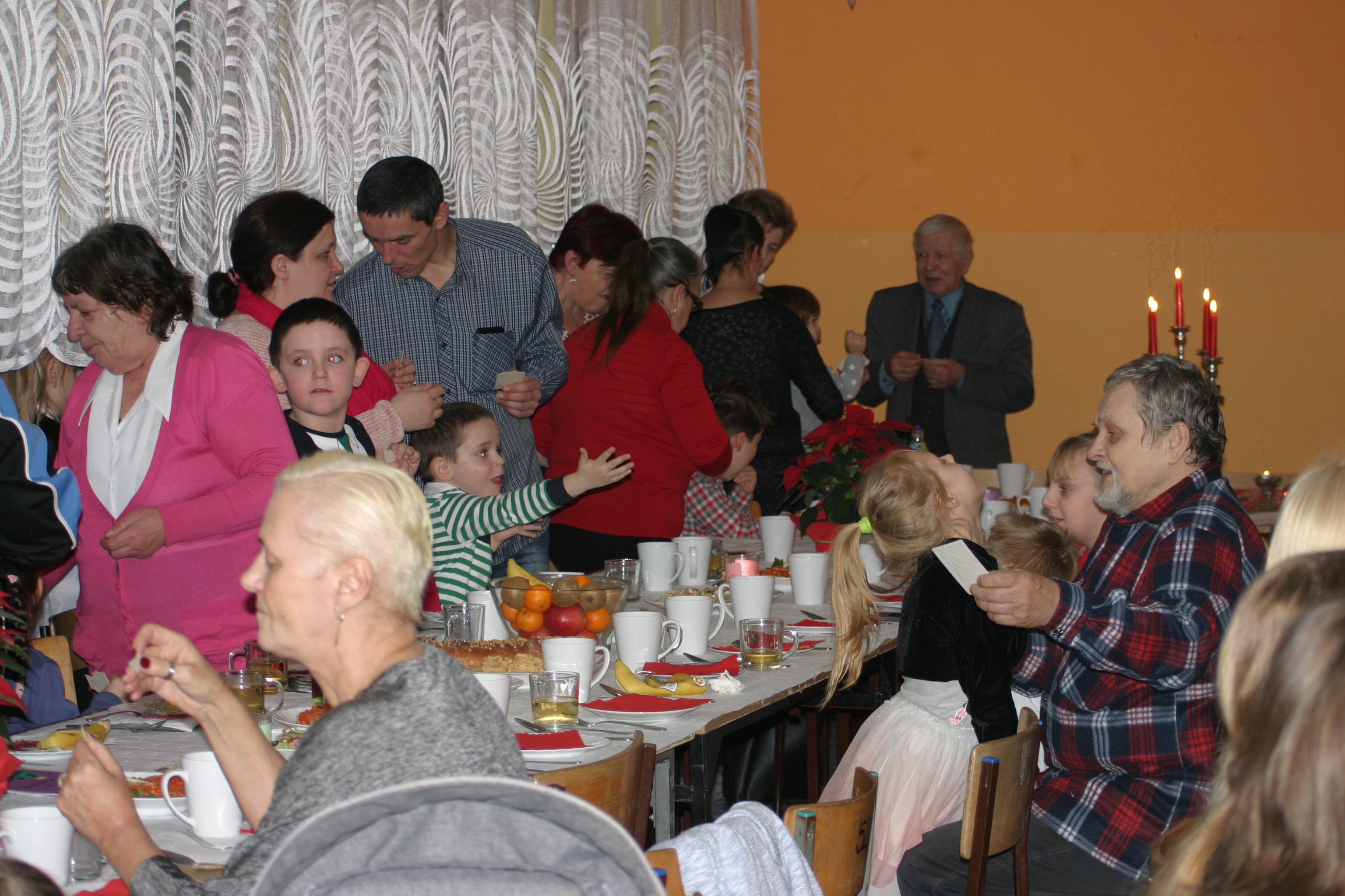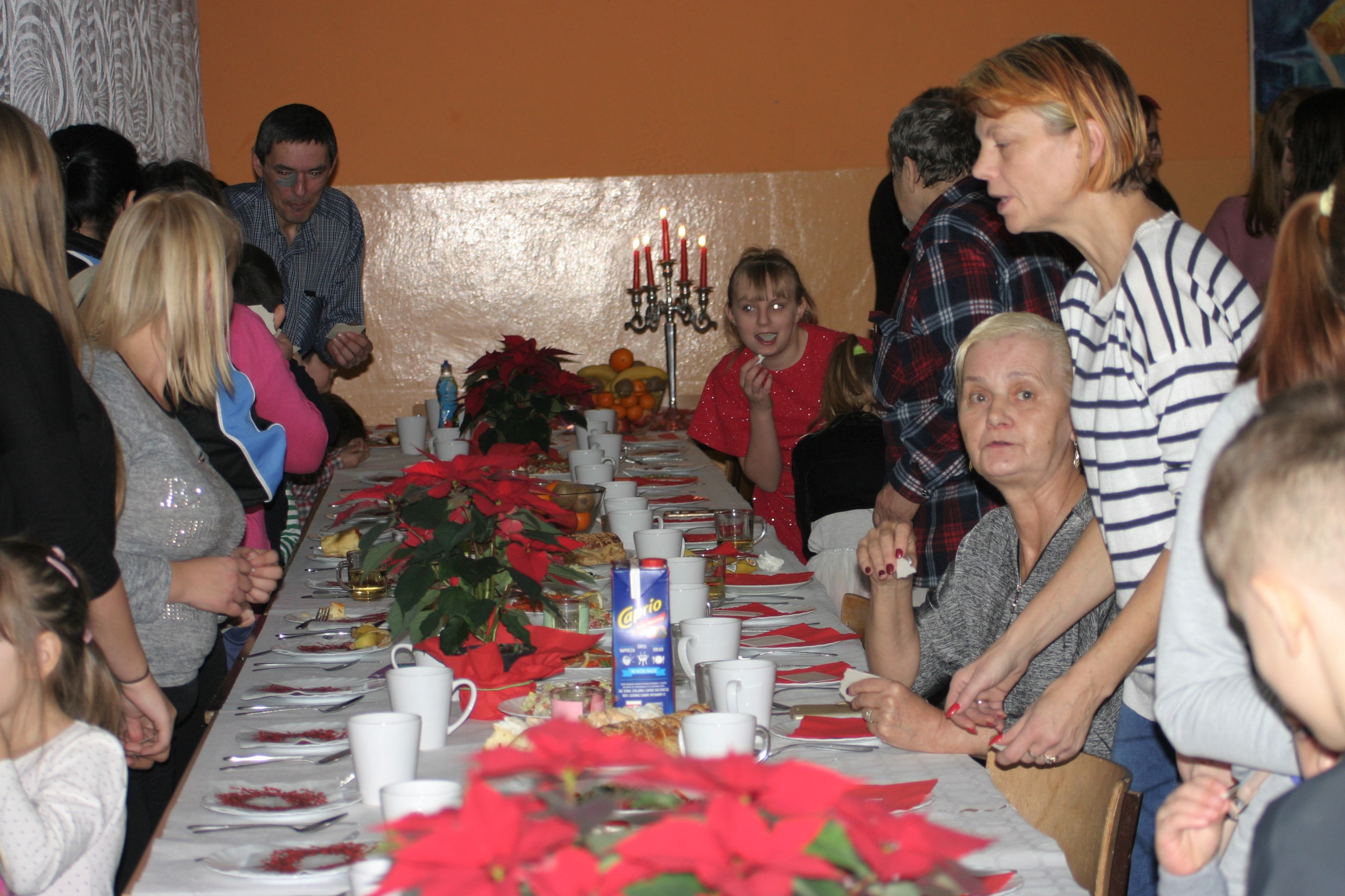 Ksiądz Łukasz – składając wszystkim bożonarodzeniowe życzenia – rozpoczął dzielenie się opłatkiem. A potem zaczęliśmy ucztować. Na kolacji pojawiły się – zgodnie z obyczajem – postne dania wigilijne: barszcz, pierogi, makowiec. Niespodziewanie pojawił się Święty Mikołaj, który dzięki porozumieniu ze sponsorami (Caritas Polska i Rada Osiedla „Zdroje”) obdarował przybyłych zawartością przyniesionego wielkiego worka. Kolacja zakończyła się w radosnym nastroju ubarwionym śpiewem pięknych kolęd oraz wręczeniem podziękowań dla naszych darczyńców, dzięki którym mogliśmy ofiarować dzieciom szczęście i uśmiech na twarzy, za co pięknie dziękujemy 🙂