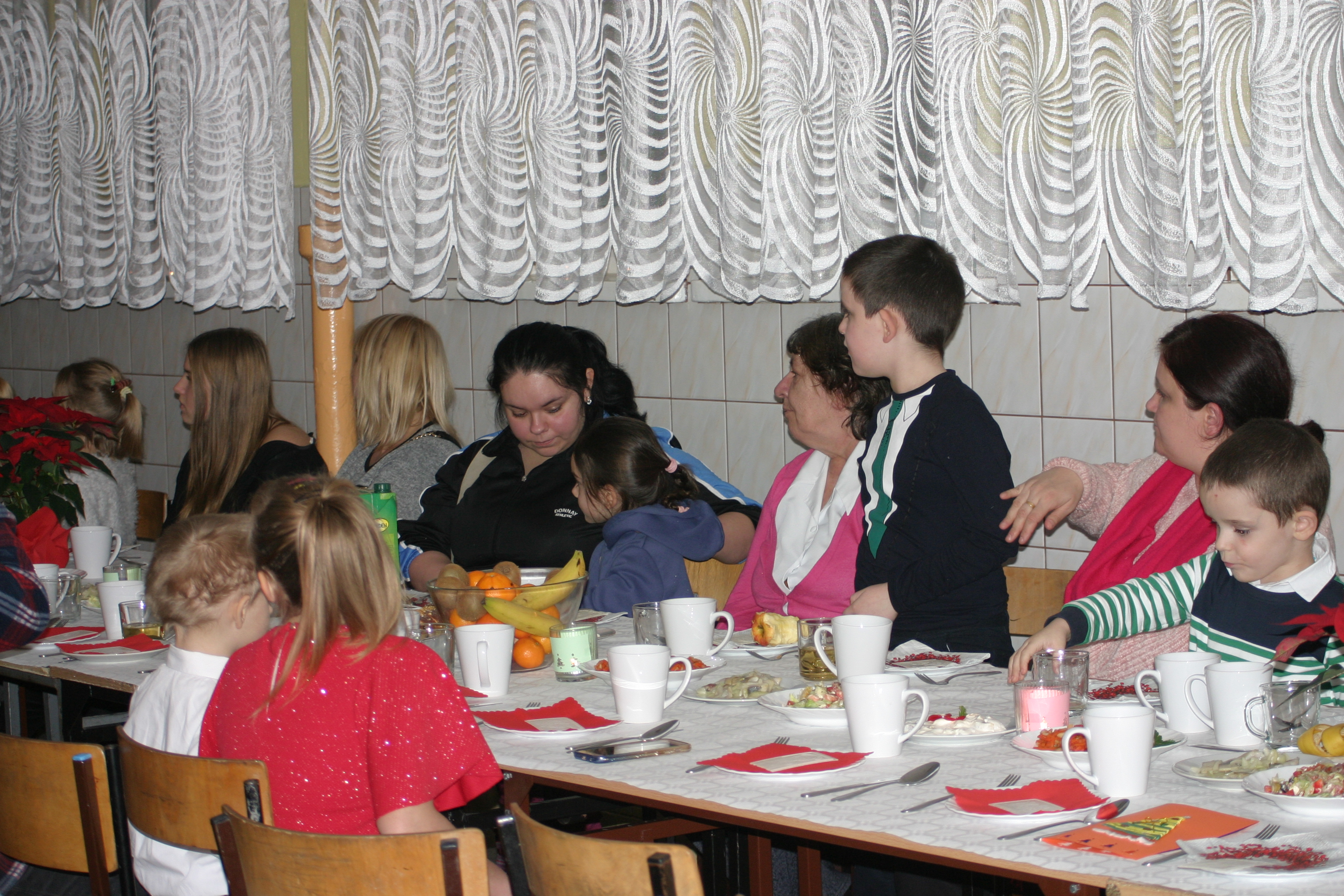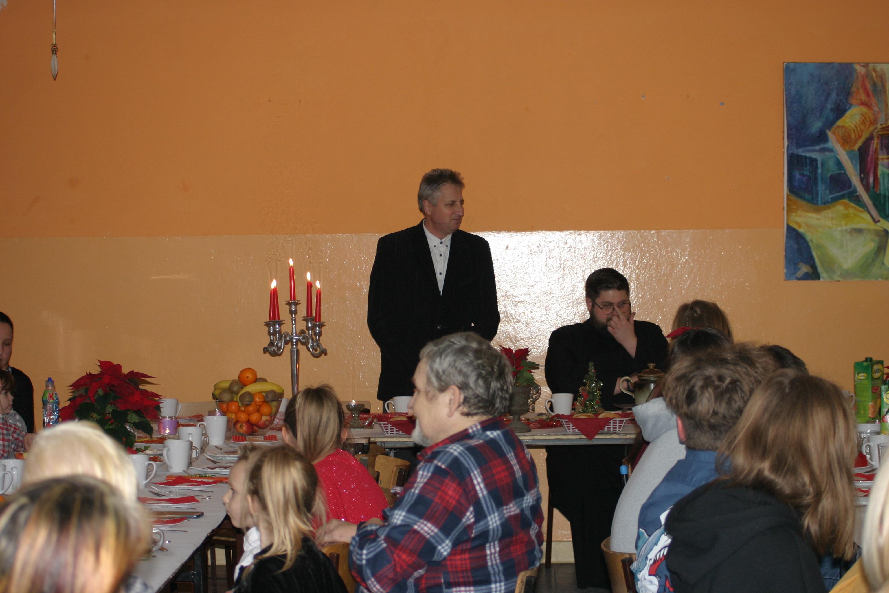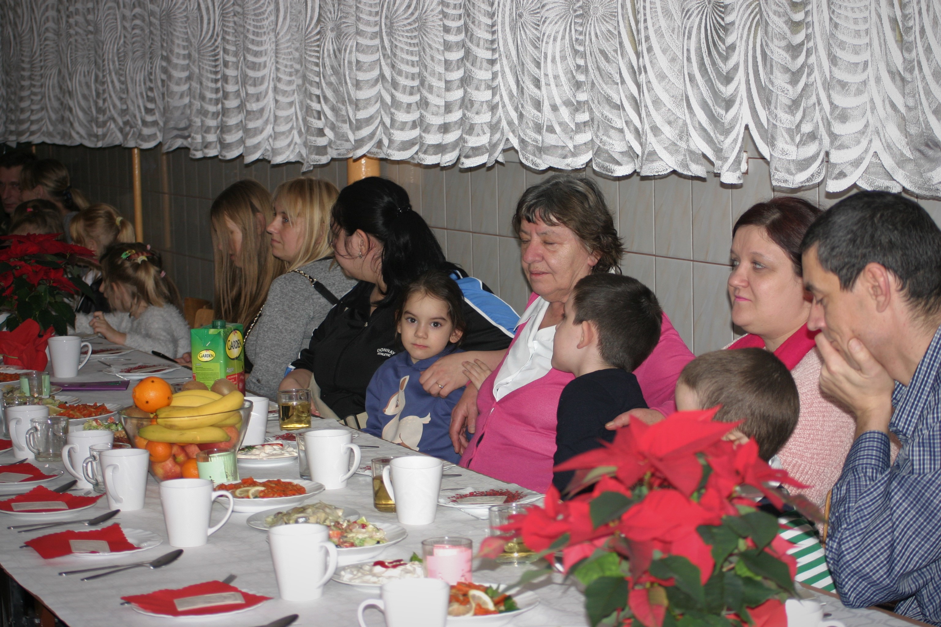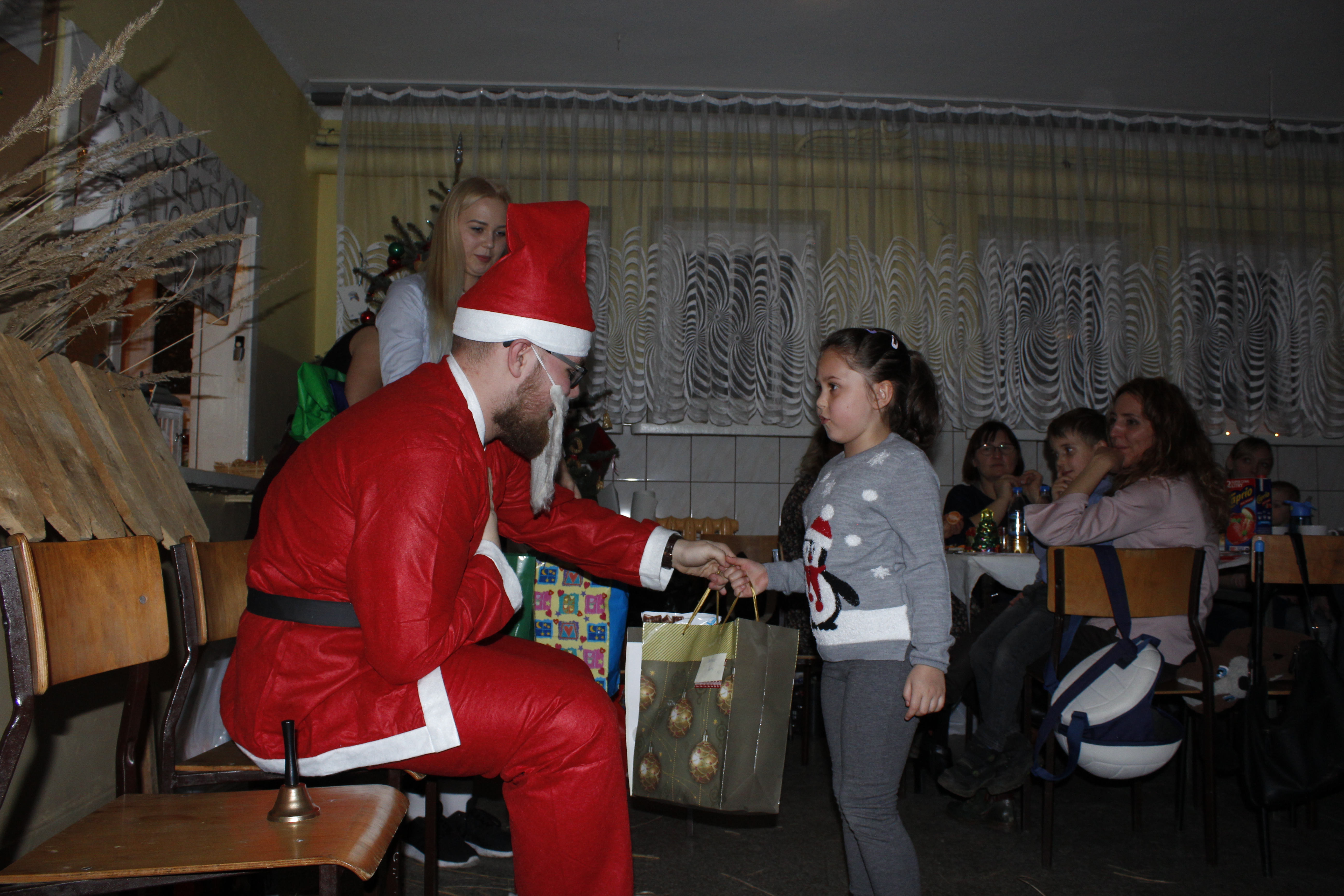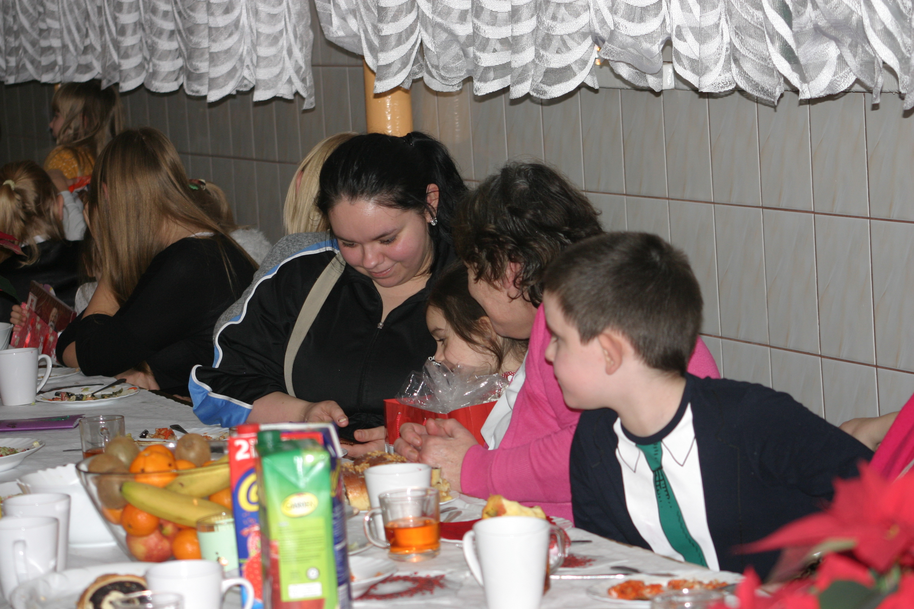 Ksiądz Łukasz – składając wszystkim bożonarodzeniowe życzenia – rozpoczął dzielenie się opłatkiem. A potem zaczęliśmy ucztować. Na kolacji pojawiły się – zgodnie z obyczajem – postne dania wigilijne: barszcz, pierogi, makowiec. Niespodziewanie pojawił się Święty Mikołaj, który dzięki porozumieniu ze sponsorami (Caritas Polska i Rada Osiedla „Zdroje”) obdarował przybyłych zawartością przyniesionego wielkiego worka. Kolacja zakończyła się w radosnym nastroju ubarwionym śpiewem pięknych kolęd oraz wręczeniem podziękowań dla naszych darczyńców, dzięki którym mogliśmy ofiarować dzieciom szczęście i uśmiech na twarzy, za co pięknie dziękujemy 🙂