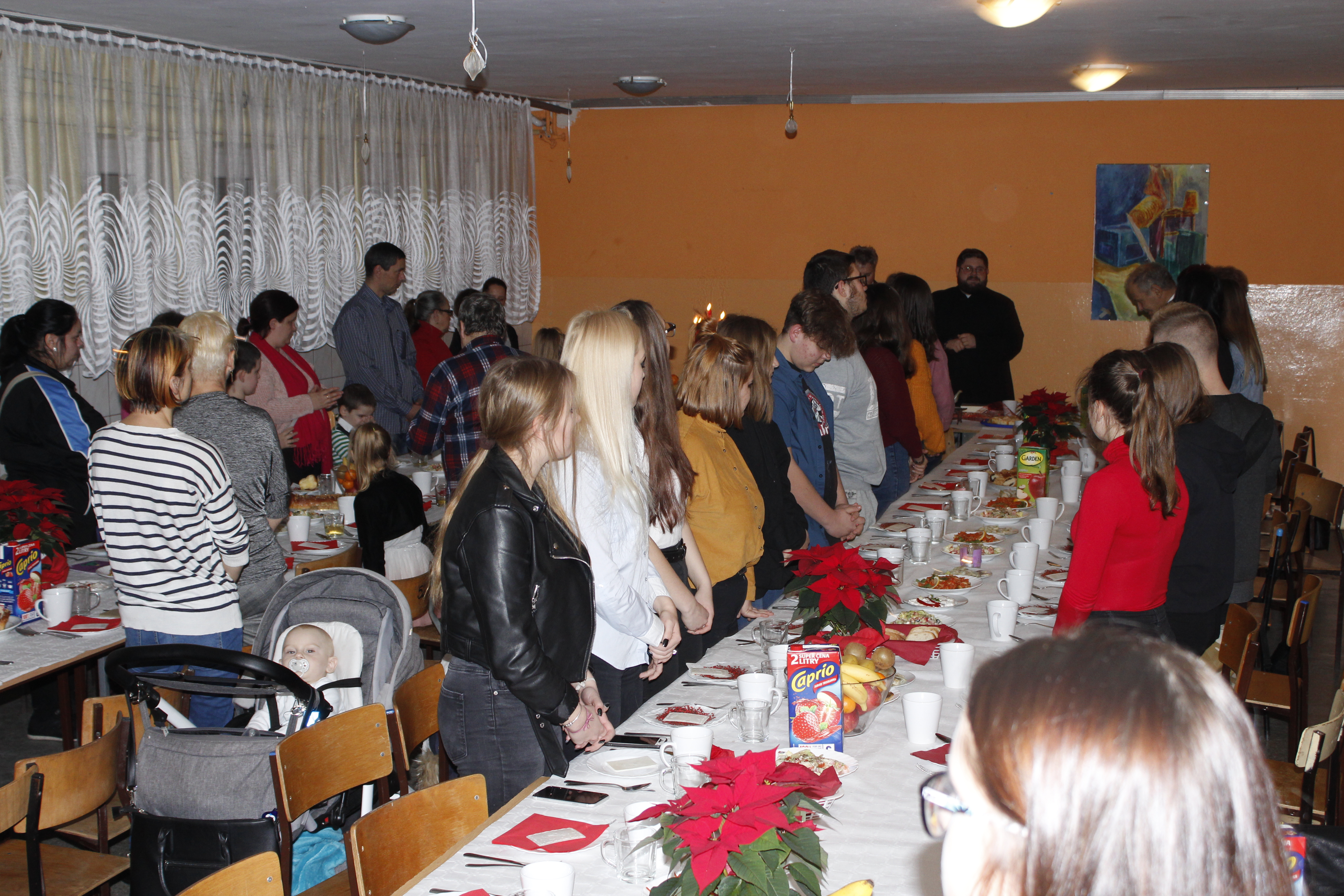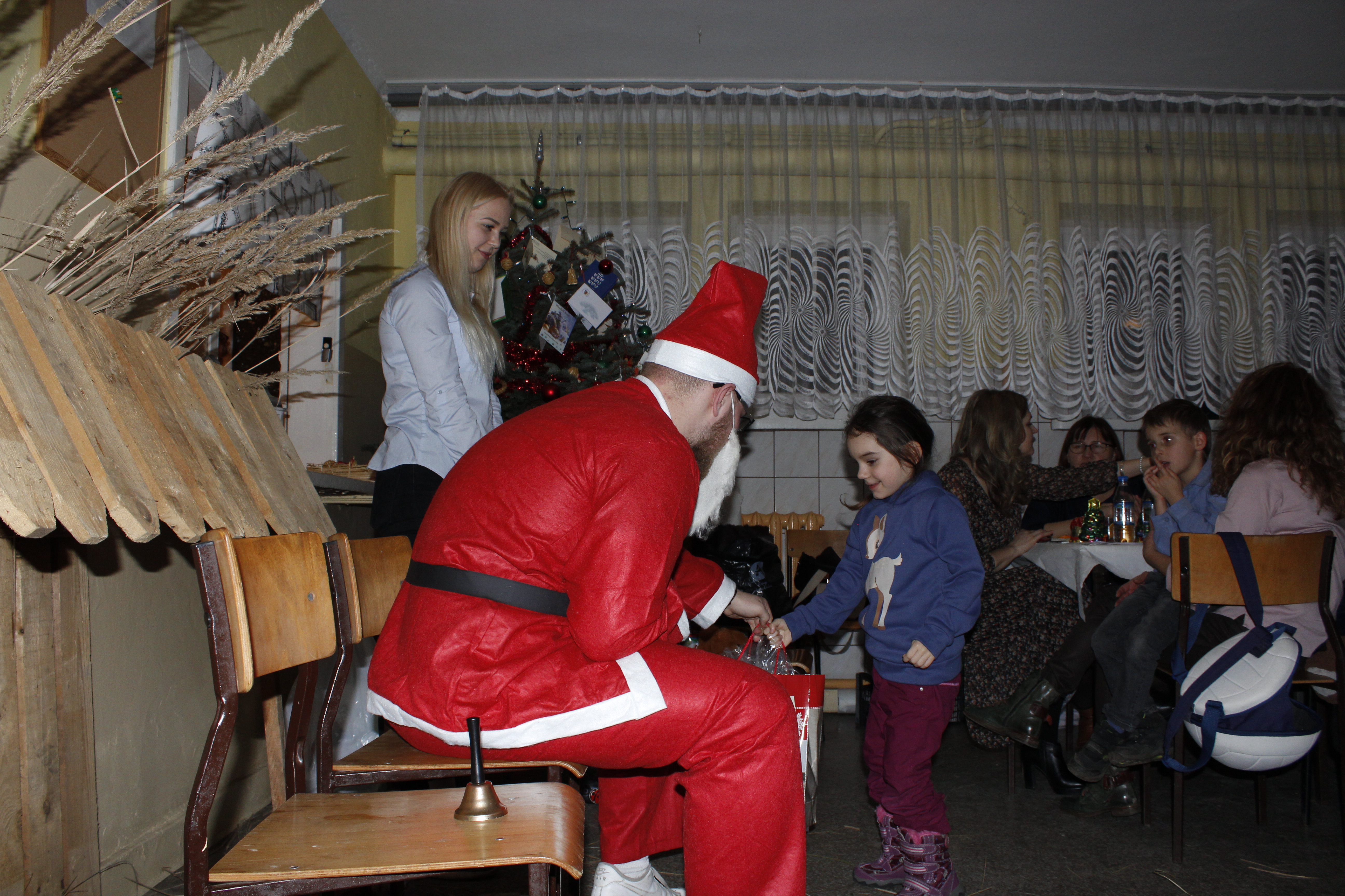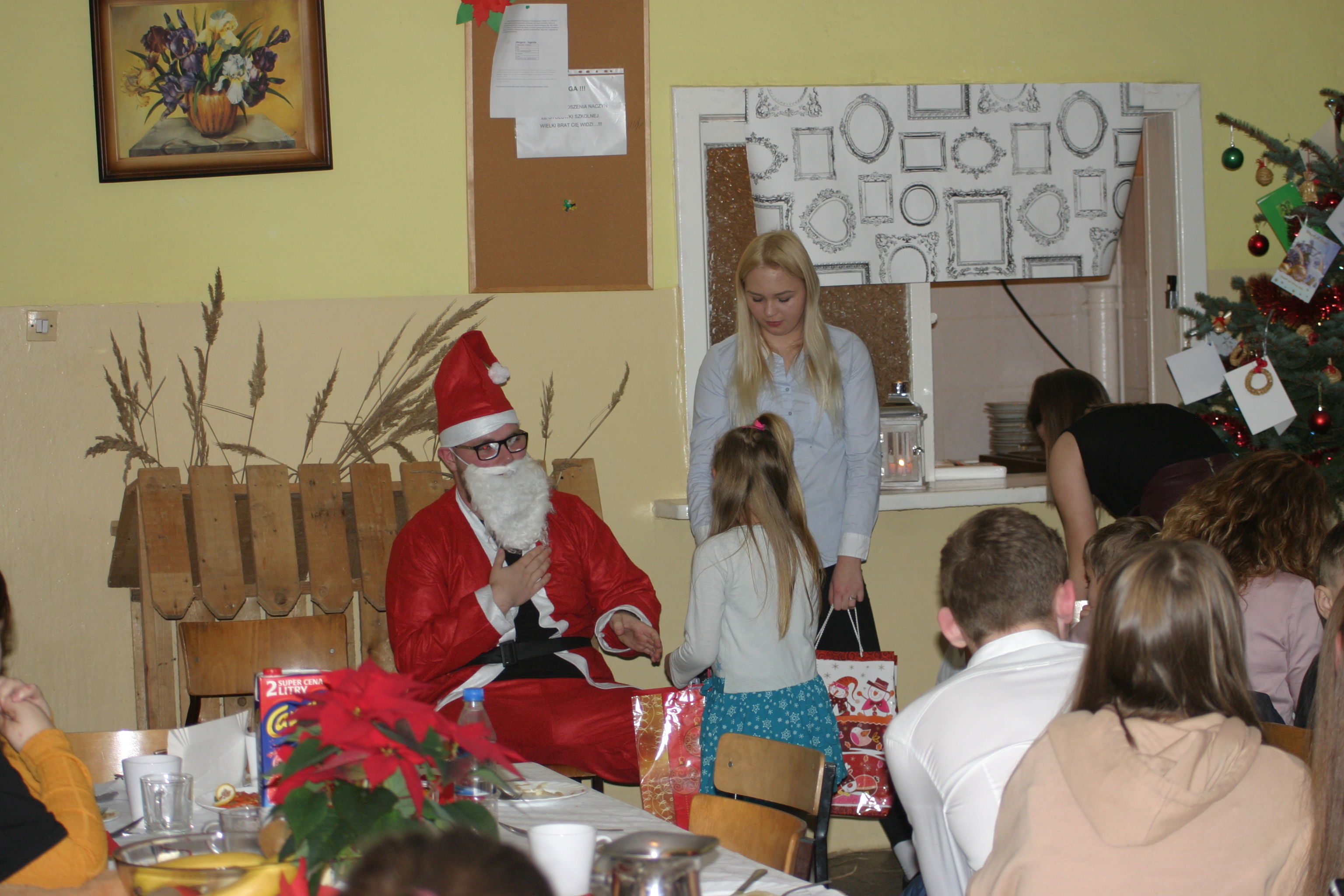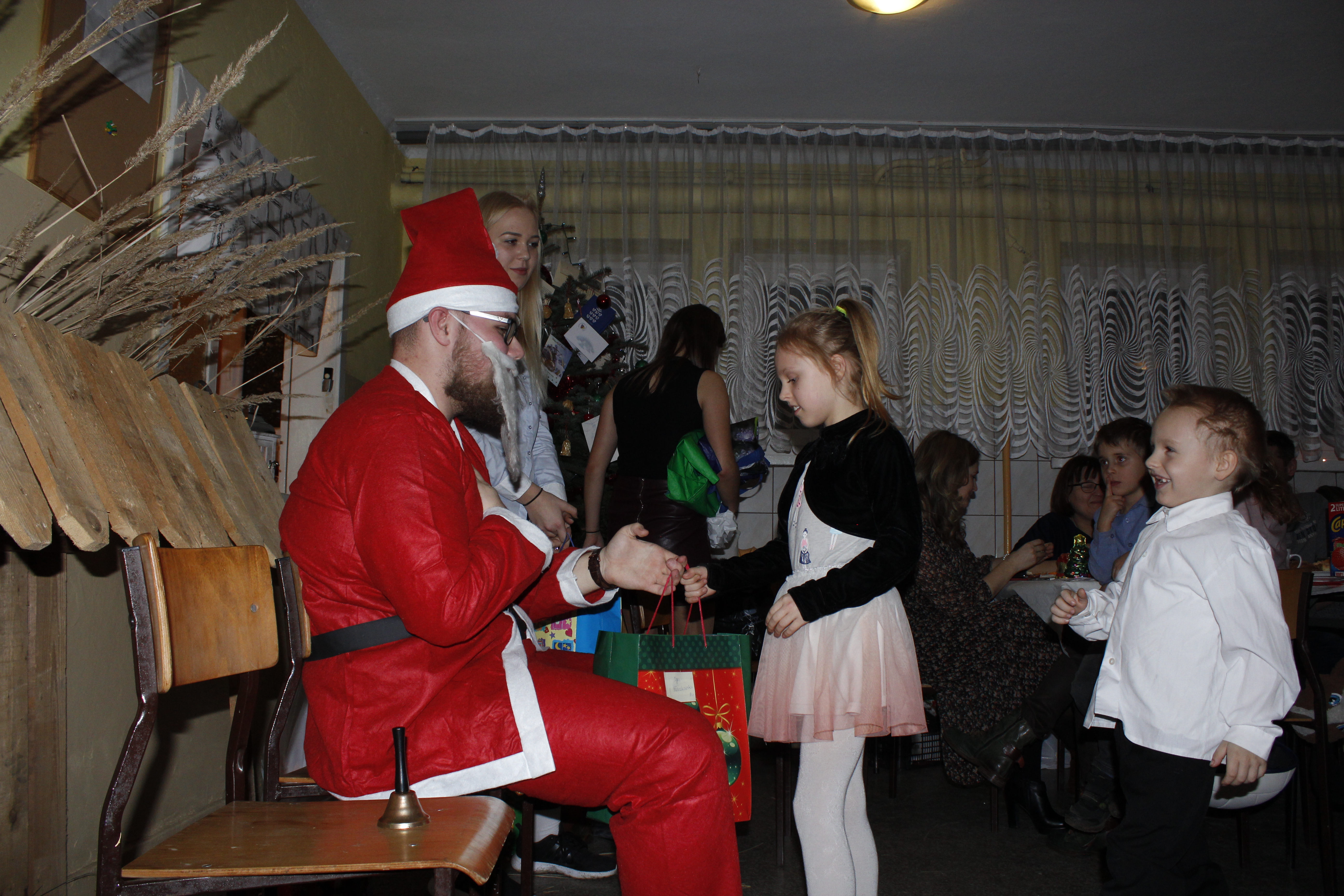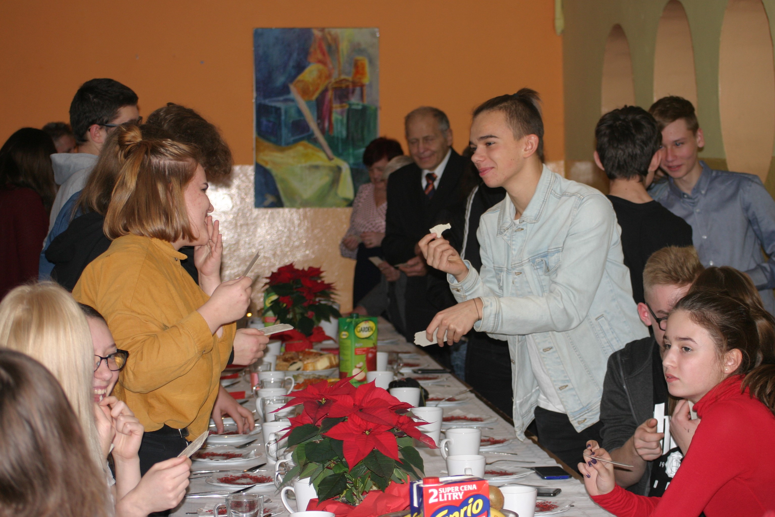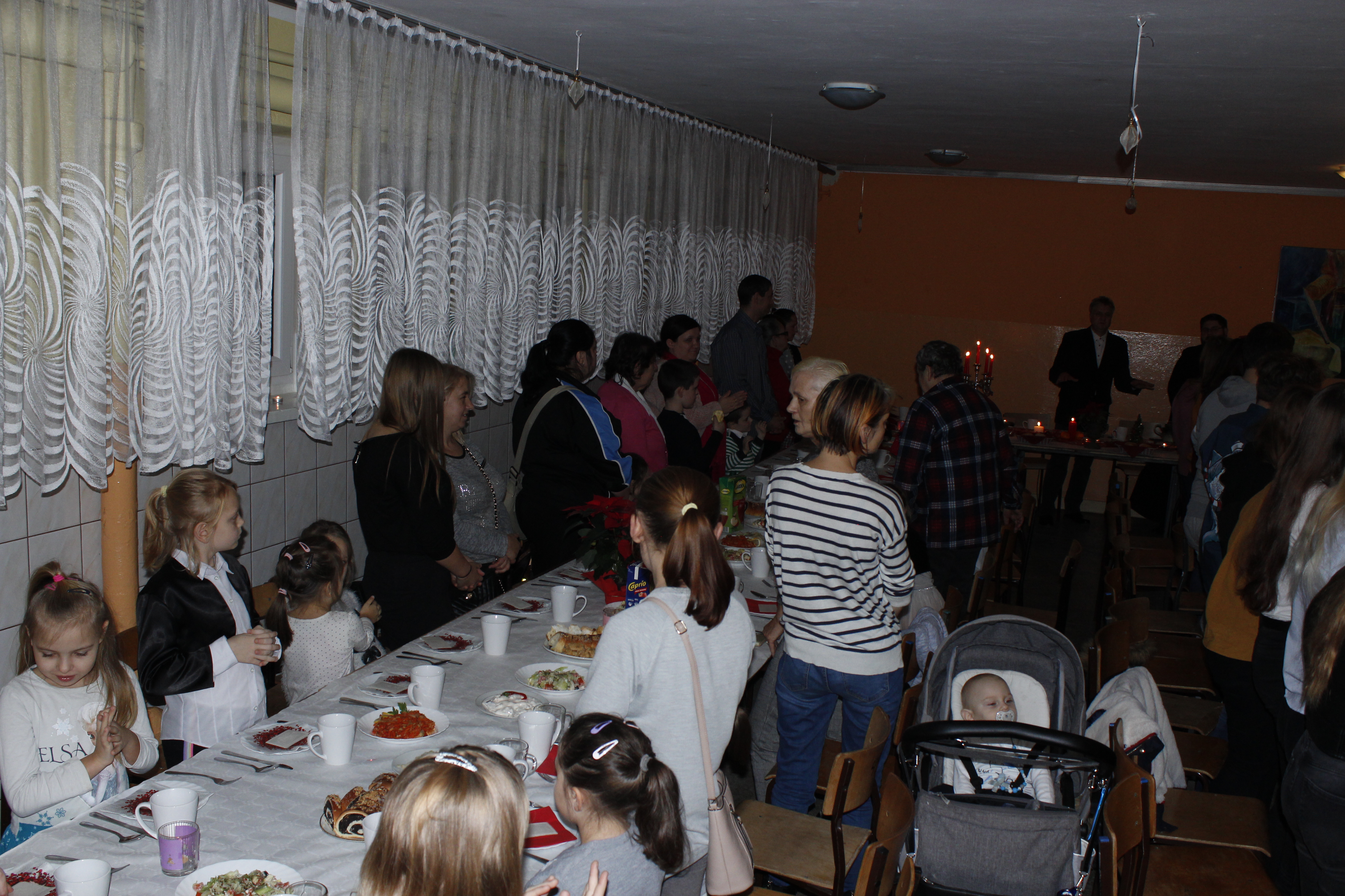 Ksiądz Łukasz – składając wszystkim bożonarodzeniowe życzenia – rozpoczął dzielenie się opłatkiem. A potem zaczęliśmy ucztować. Na kolacji pojawiły się – zgodnie z obyczajem – postne dania wigilijne: barszcz, pierogi, makowiec. Niespodziewanie pojawił się Święty Mikołaj, który dzięki porozumieniu ze sponsorami (Caritas Polska i Rada Osiedla „Zdroje”) obdarował przybyłych zawartością przyniesionego wielkiego worka. Kolacja zakończyła się w radosnym nastroju ubarwionym śpiewem pięknych kolęd oraz wręczeniem podziękowań dla naszych darczyńców, dzięki którym mogliśmy ofiarować dzieciom szczęście i uśmiech na twarzy, za co pięknie dziękujemy 🙂