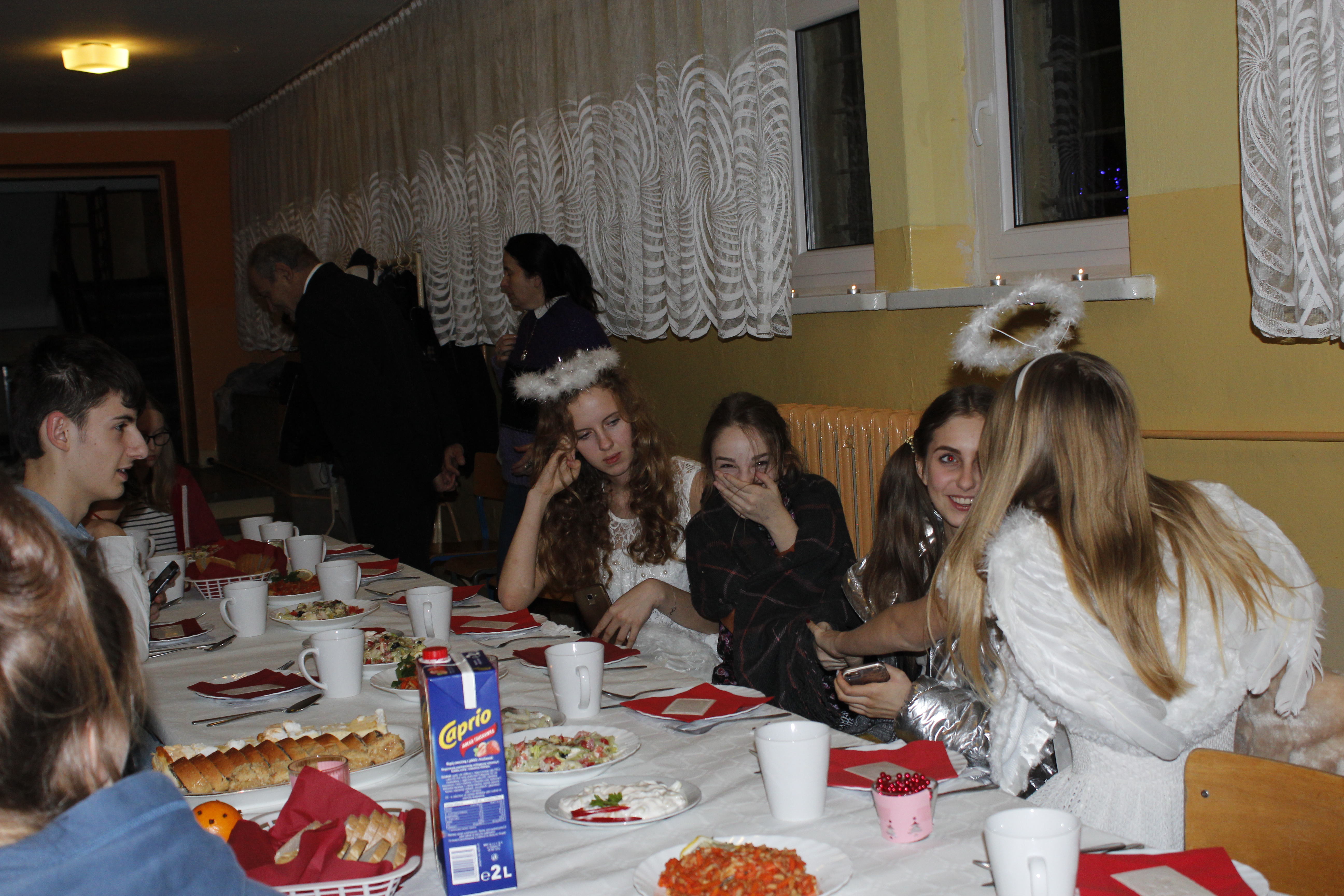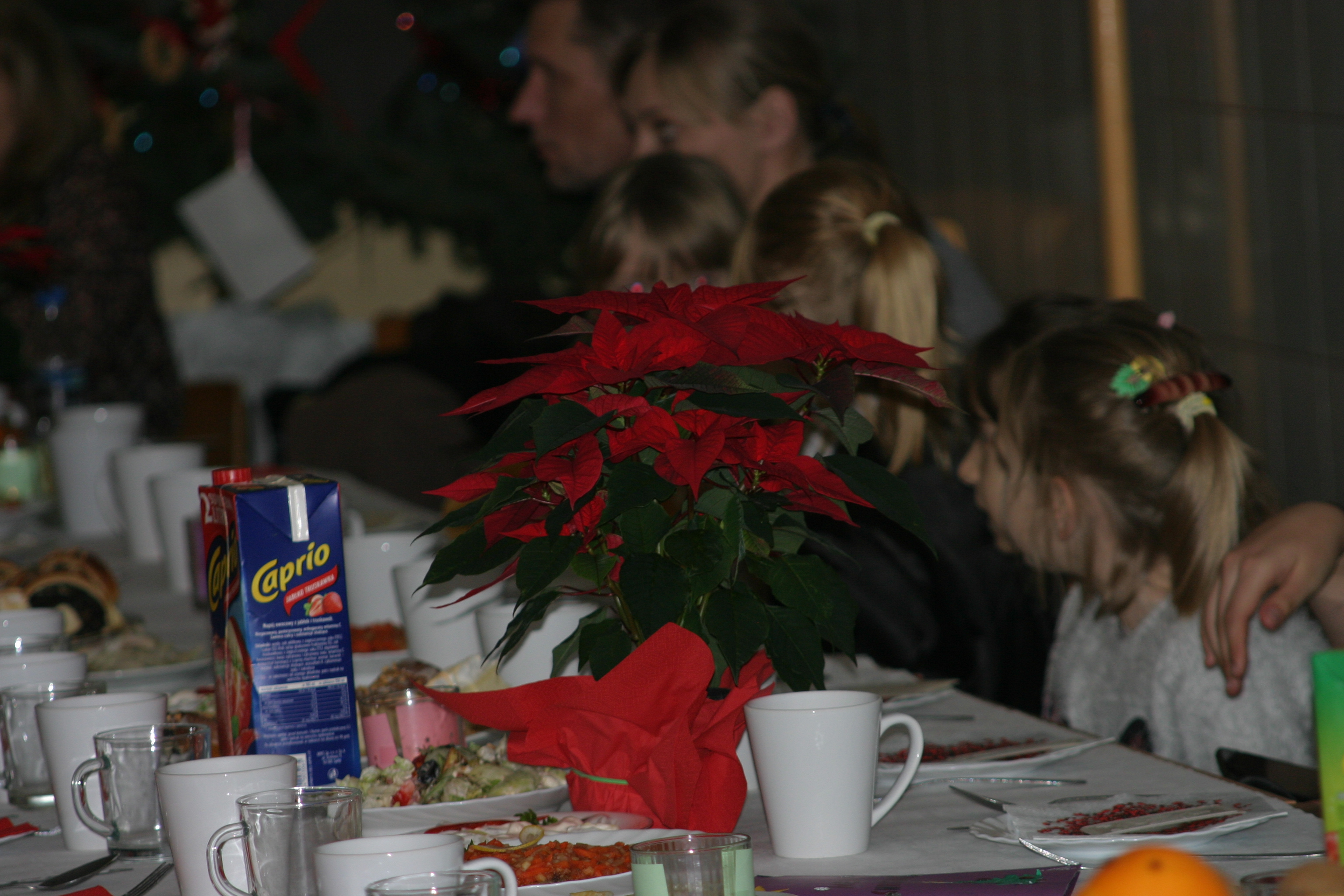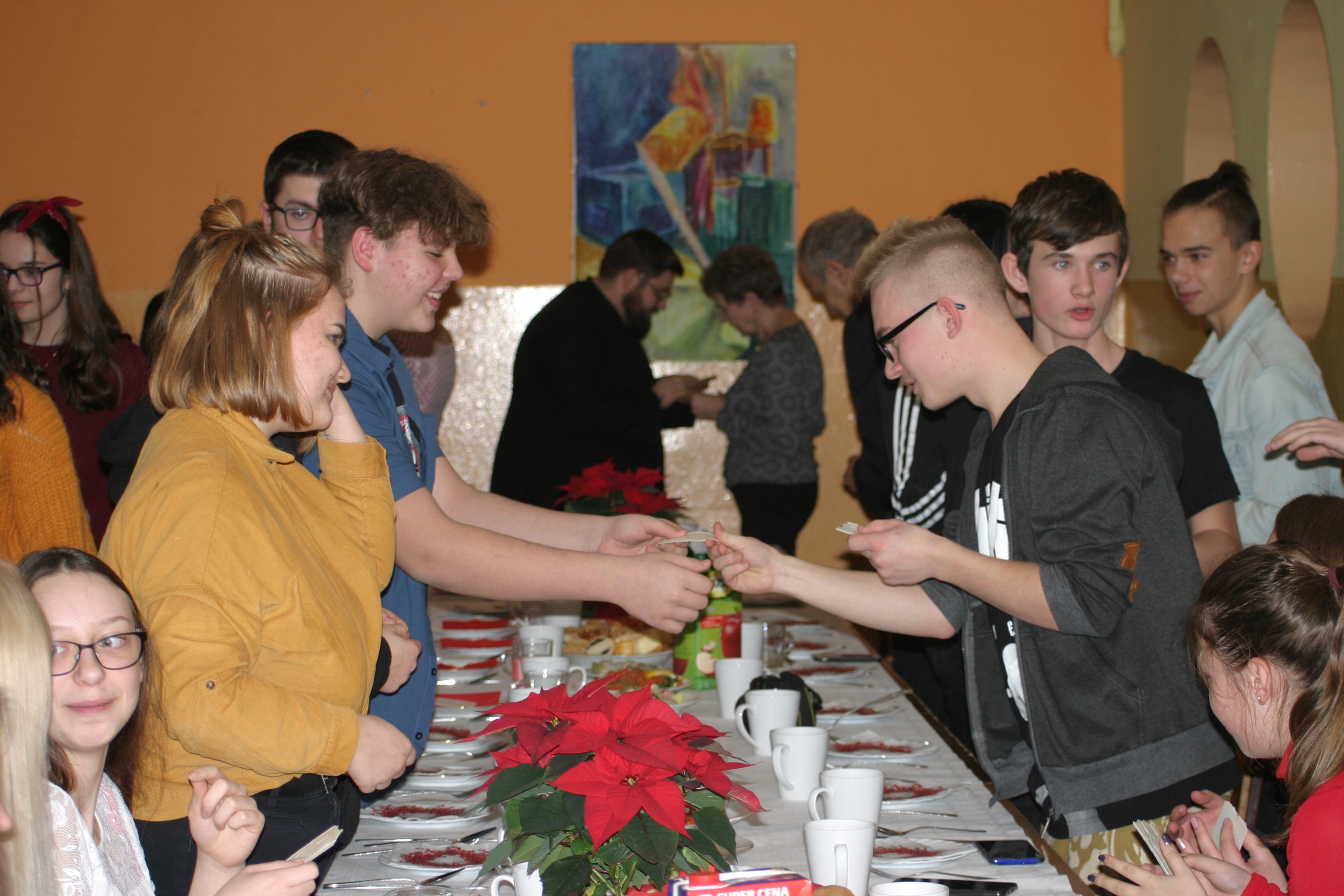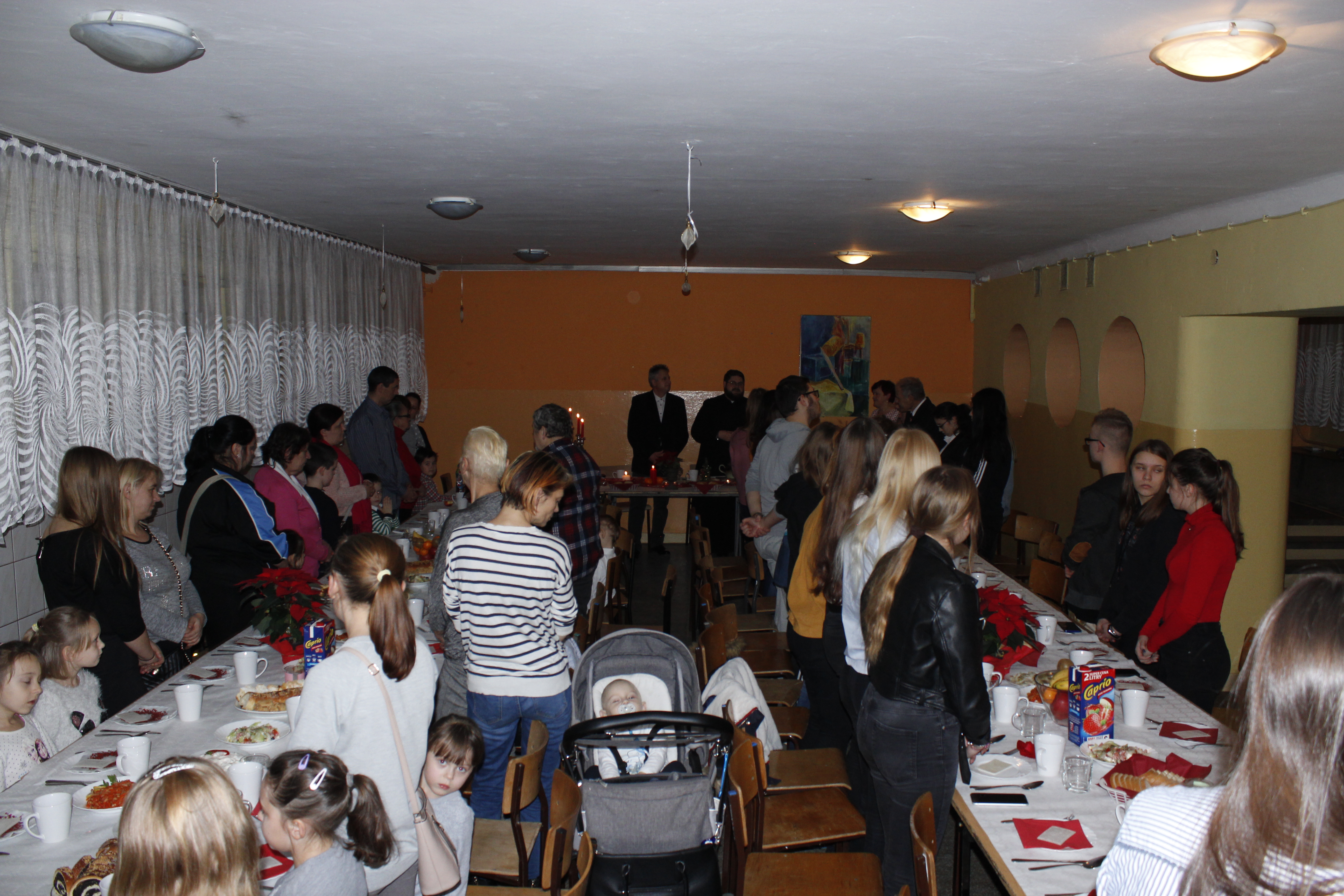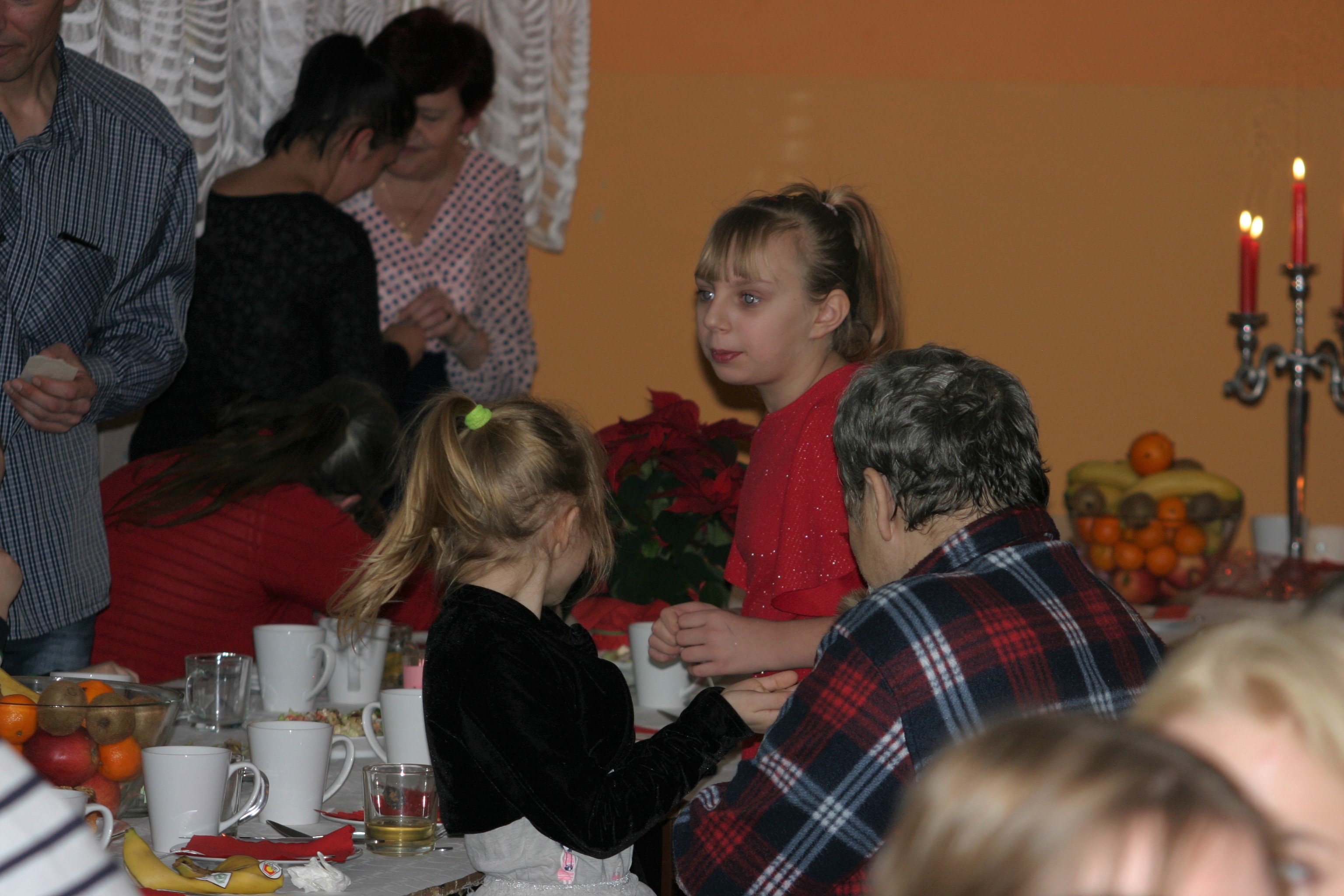 Ksiądz Łukasz – składając wszystkim bożonarodzeniowe życzenia – rozpoczął dzielenie się opłatkiem. A potem zaczęliśmy ucztować. Na kolacji pojawiły się – zgodnie z obyczajem – postne dania wigilijne: barszcz, pierogi, makowiec. Niespodziewanie pojawił się Święty Mikołaj, który dzięki porozumieniu ze sponsorami (Caritas Polska i Rada Osiedla „Zdroje”) obdarował przybyłych zawartością przyniesionego wielkiego worka. Kolacja zakończyła się w radosnym nastroju ubarwionym śpiewem pięknych kolęd oraz wręczeniem podziękowań dla naszych darczyńców, dzięki którym mogliśmy ofiarować dzieciom szczęście i uśmiech na twarzy, za co pięknie dziękujemy 🙂