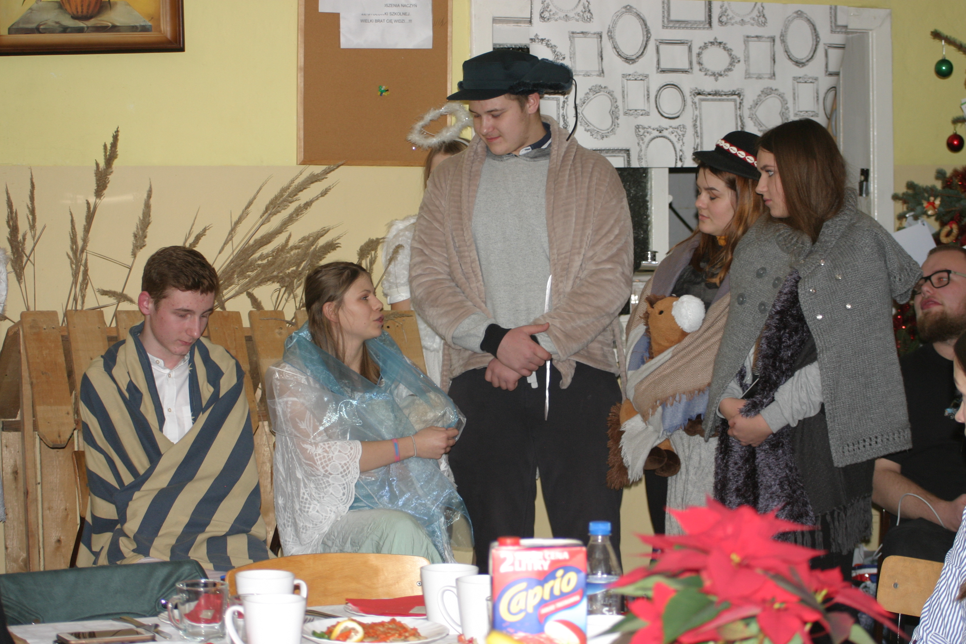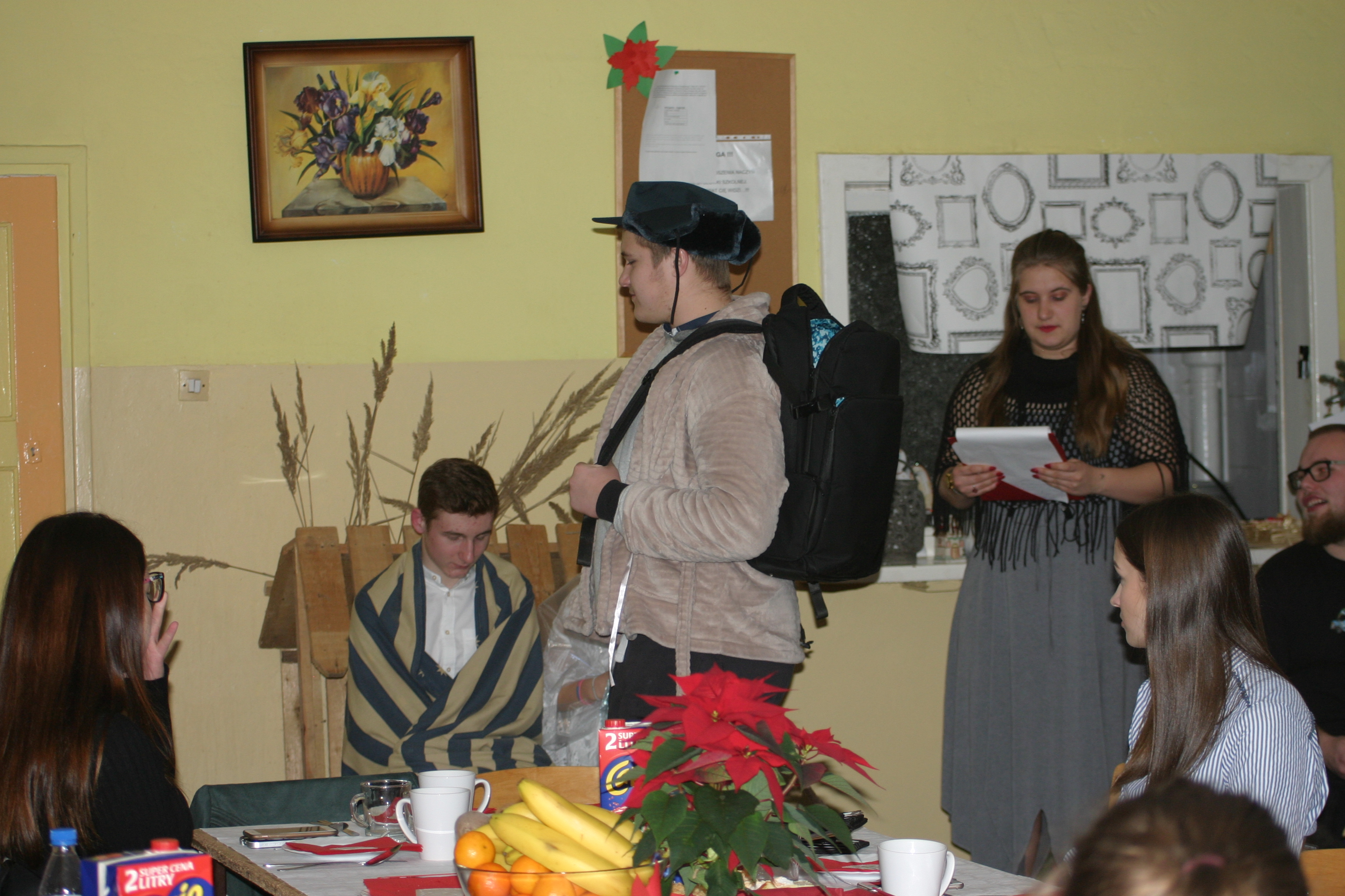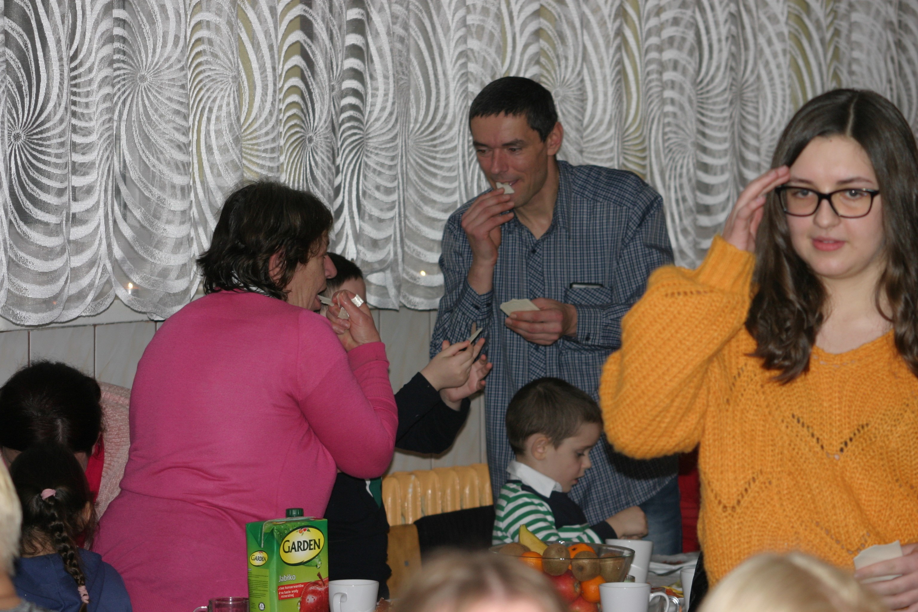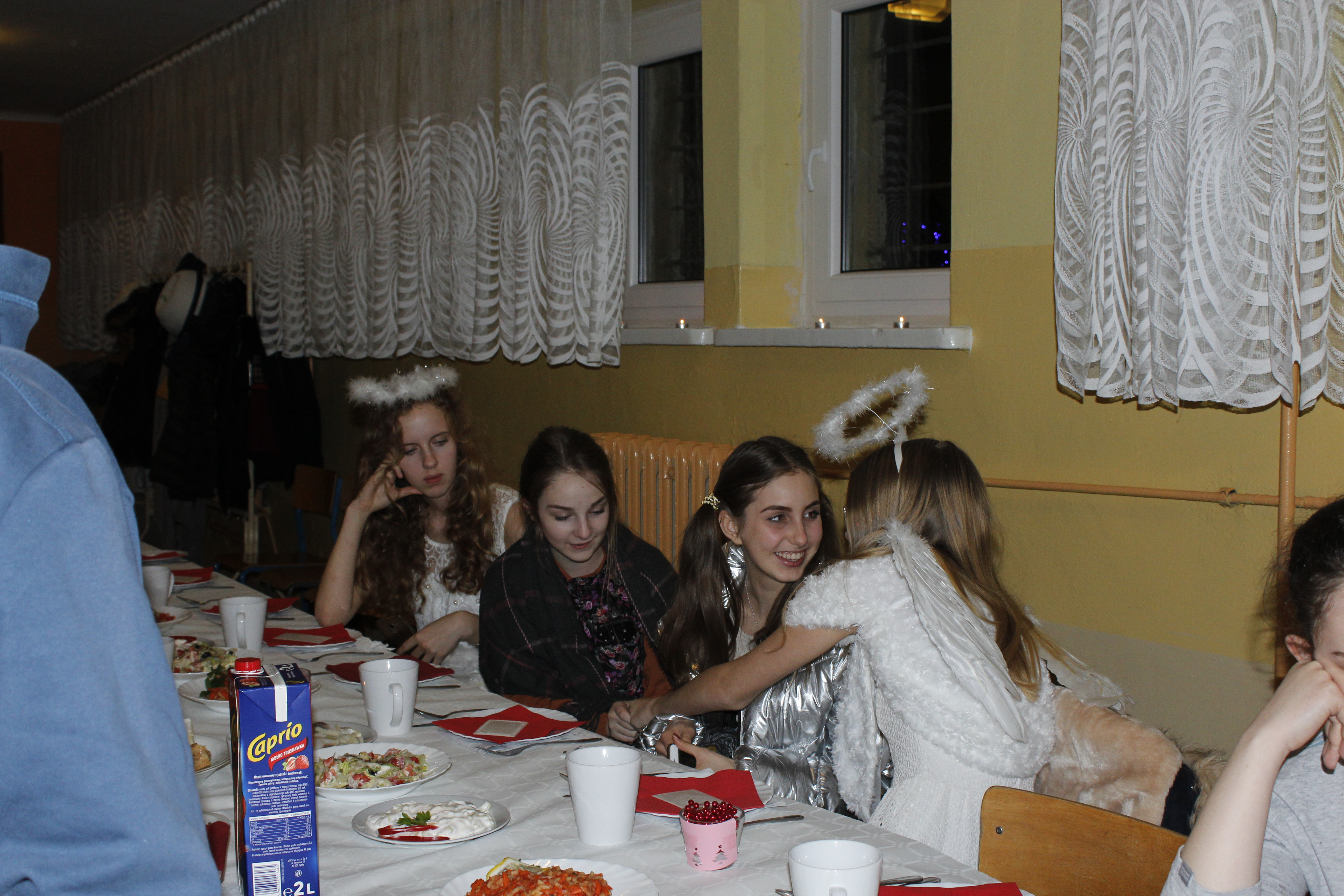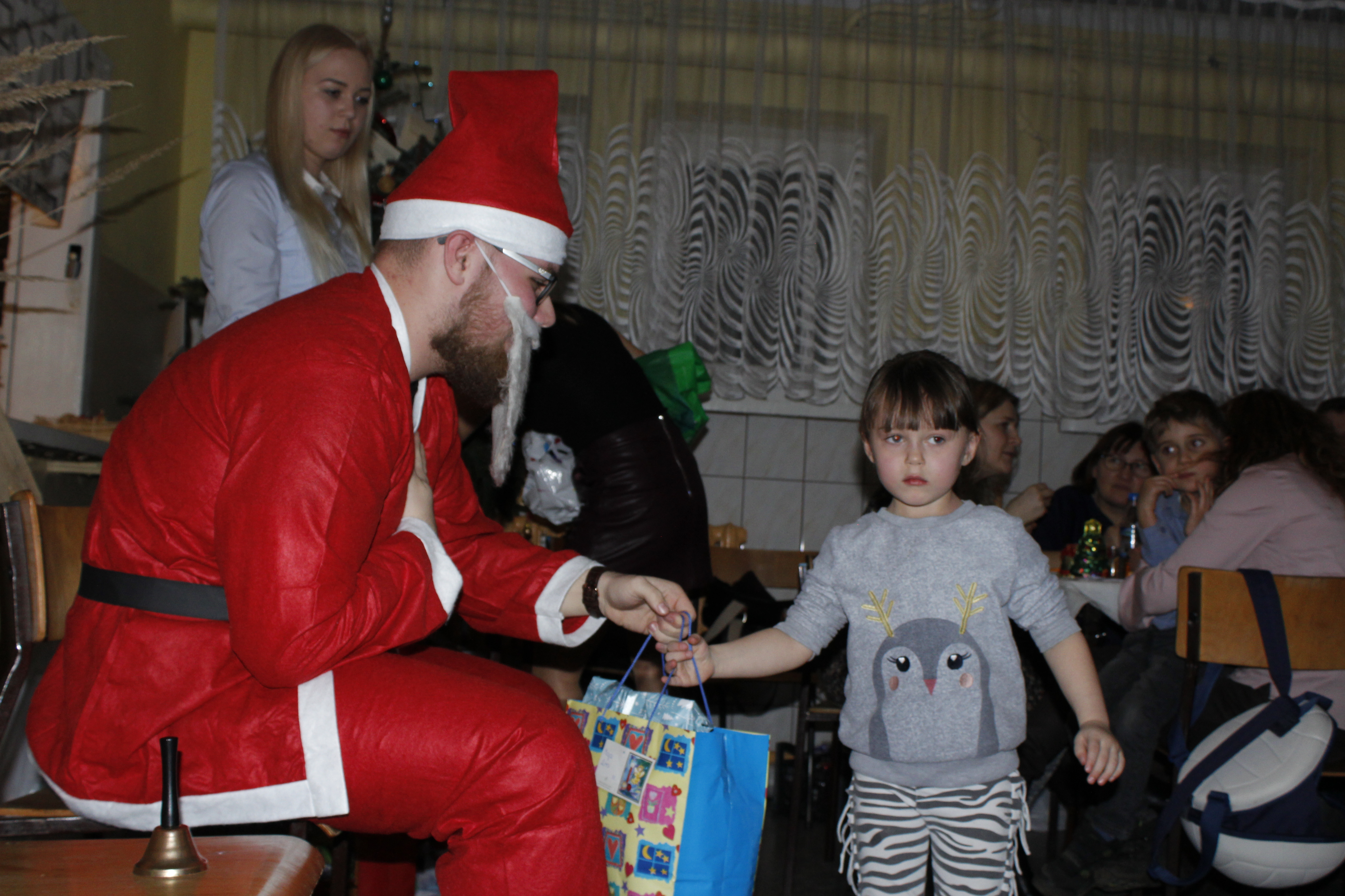 Ksiądz Łukasz – składając wszystkim bożonarodzeniowe życzenia – rozpoczął dzielenie się opłatkiem. A potem zaczęliśmy ucztować. Na kolacji pojawiły się – zgodnie z obyczajem – postne dania wigilijne: barszcz, pierogi, makowiec. Niespodziewanie pojawił się Święty Mikołaj, który dzięki porozumieniu ze sponsorami (Caritas Polska i Rada Osiedla „Zdroje”) obdarował przybyłych zawartością przyniesionego wielkiego worka. Kolacja zakończyła się w radosnym nastroju ubarwionym śpiewem pięknych kolęd oraz wręczeniem podziękowań dla naszych darczyńców, dzięki którym mogliśmy ofiarować dzieciom szczęście i uśmiech na twarzy, za co pięknie dziękujemy 🙂