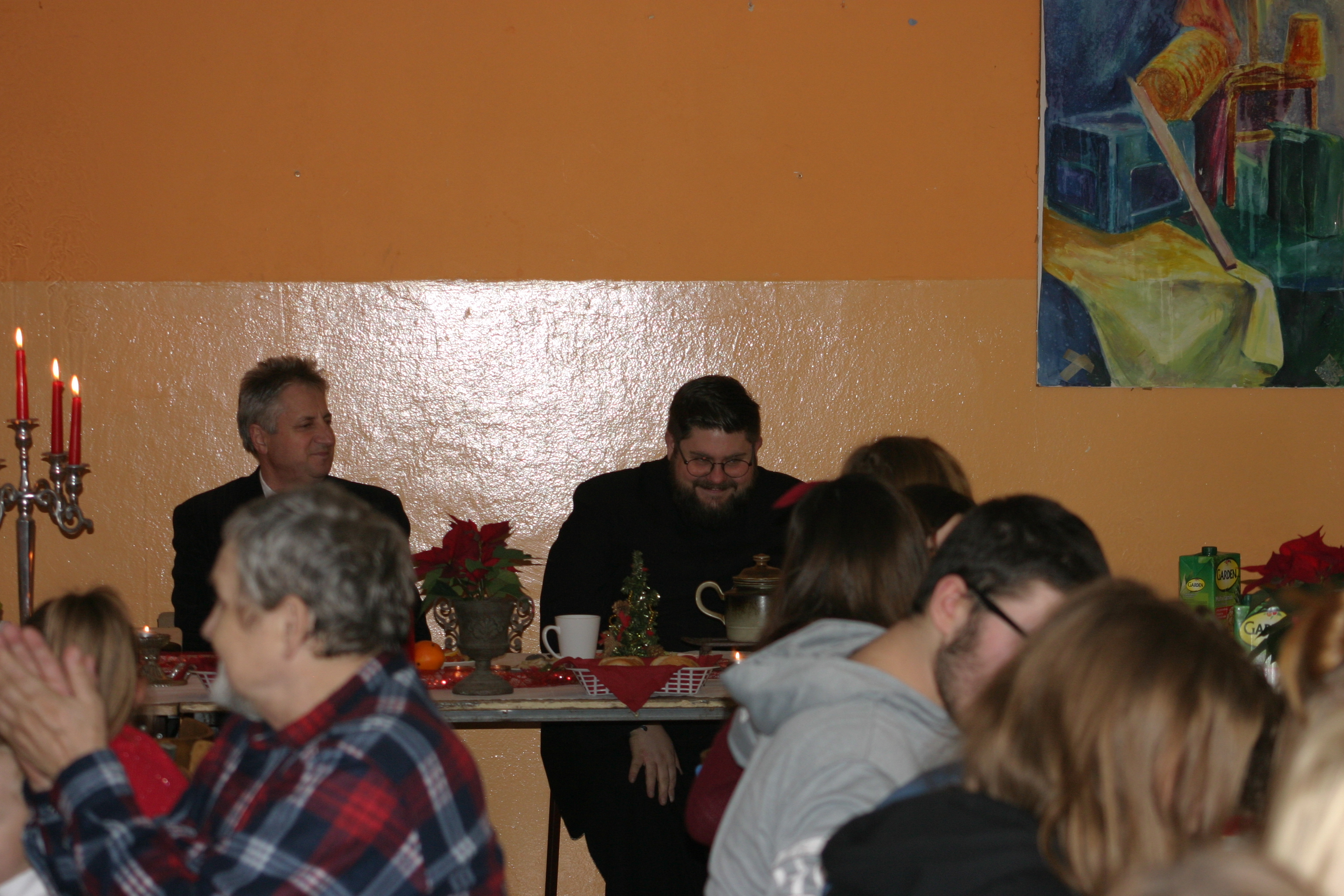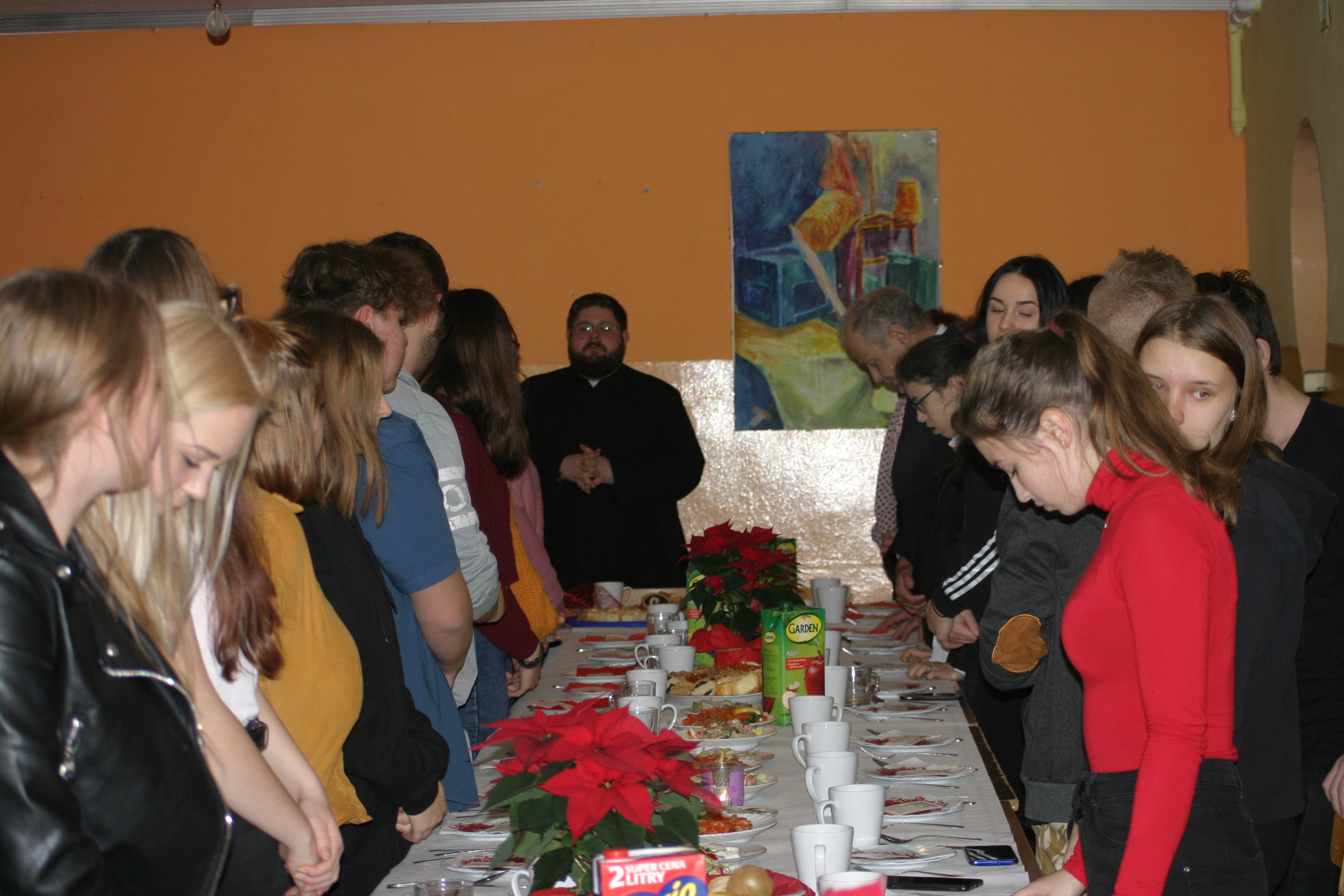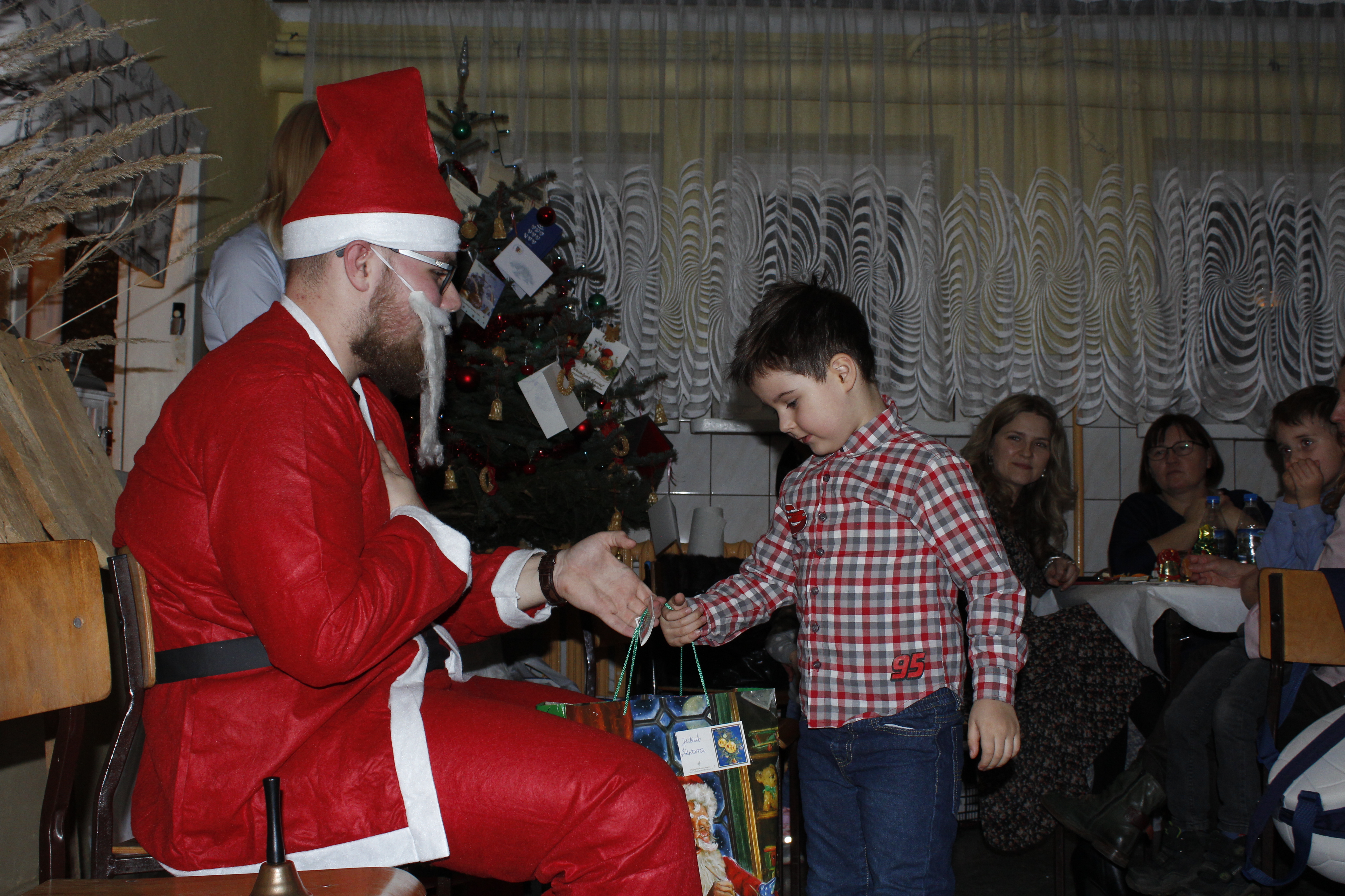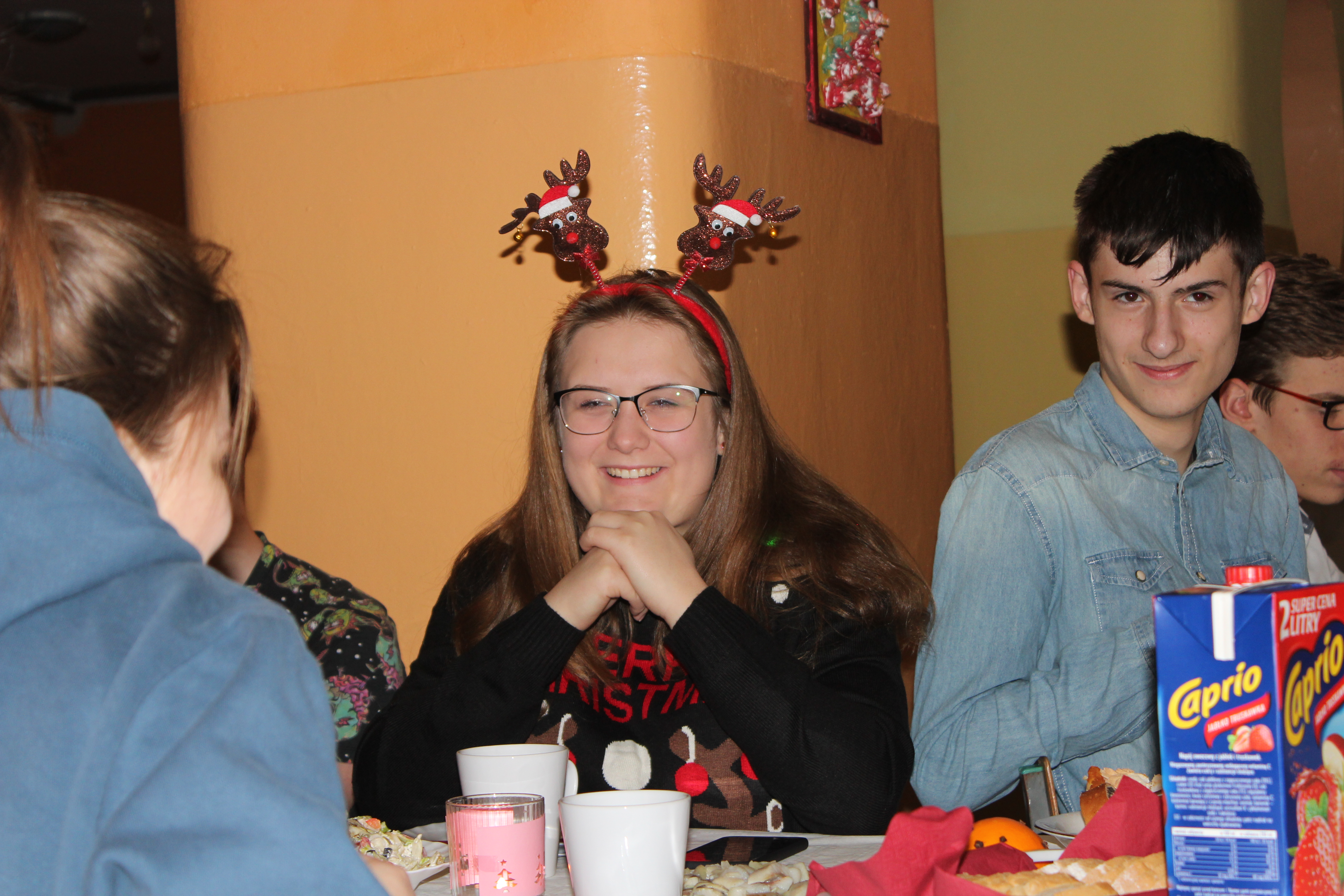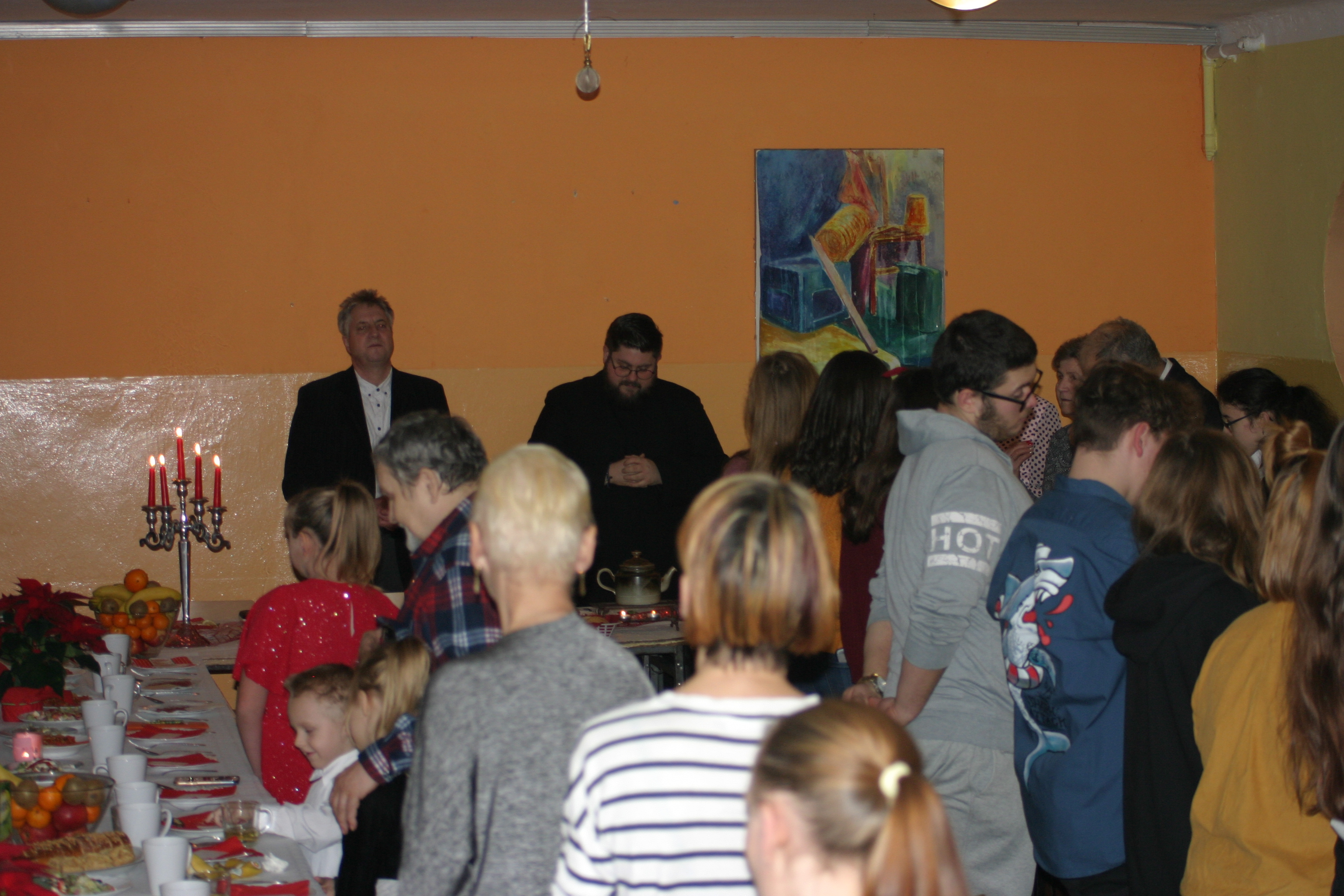 Ksiądz Łukasz – składając wszystkim bożonarodzeniowe życzenia – rozpoczął dzielenie się opłatkiem. A potem zaczęliśmy ucztować. Na kolacji pojawiły się – zgodnie z obyczajem – postne dania wigilijne: barszcz, pierogi, makowiec. Niespodziewanie pojawił się Święty Mikołaj, który dzięki porozumieniu ze sponsorami (Caritas Polska i Rada Osiedla „Zdroje”) obdarował przybyłych zawartością przyniesionego wielkiego worka. Kolacja zakończyła się w radosnym nastroju ubarwionym śpiewem pięknych kolęd oraz wręczeniem podziękowań dla naszych darczyńców, dzięki którym mogliśmy ofiarować dzieciom szczęście i uśmiech na twarzy, za co pięknie dziękujemy 🙂