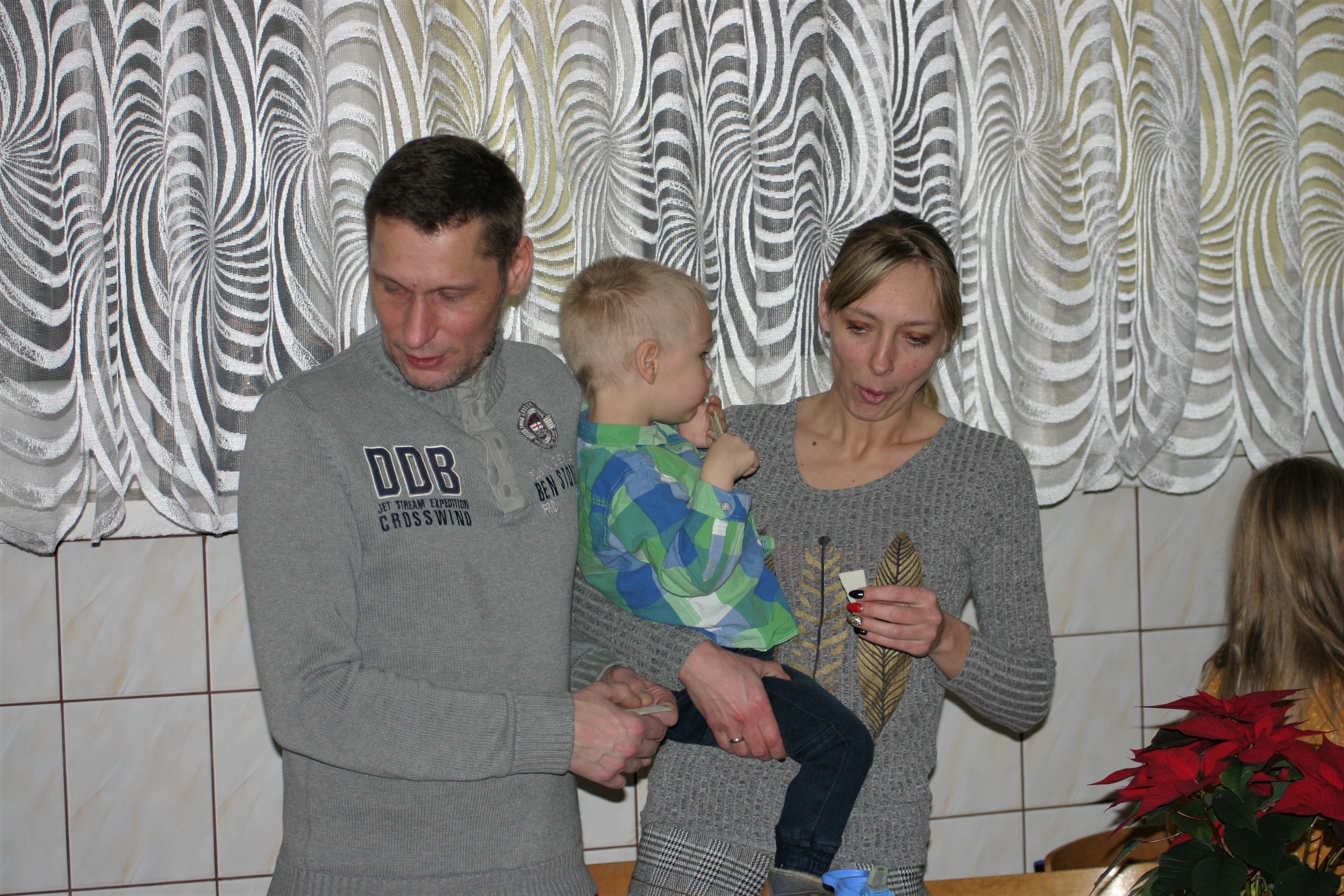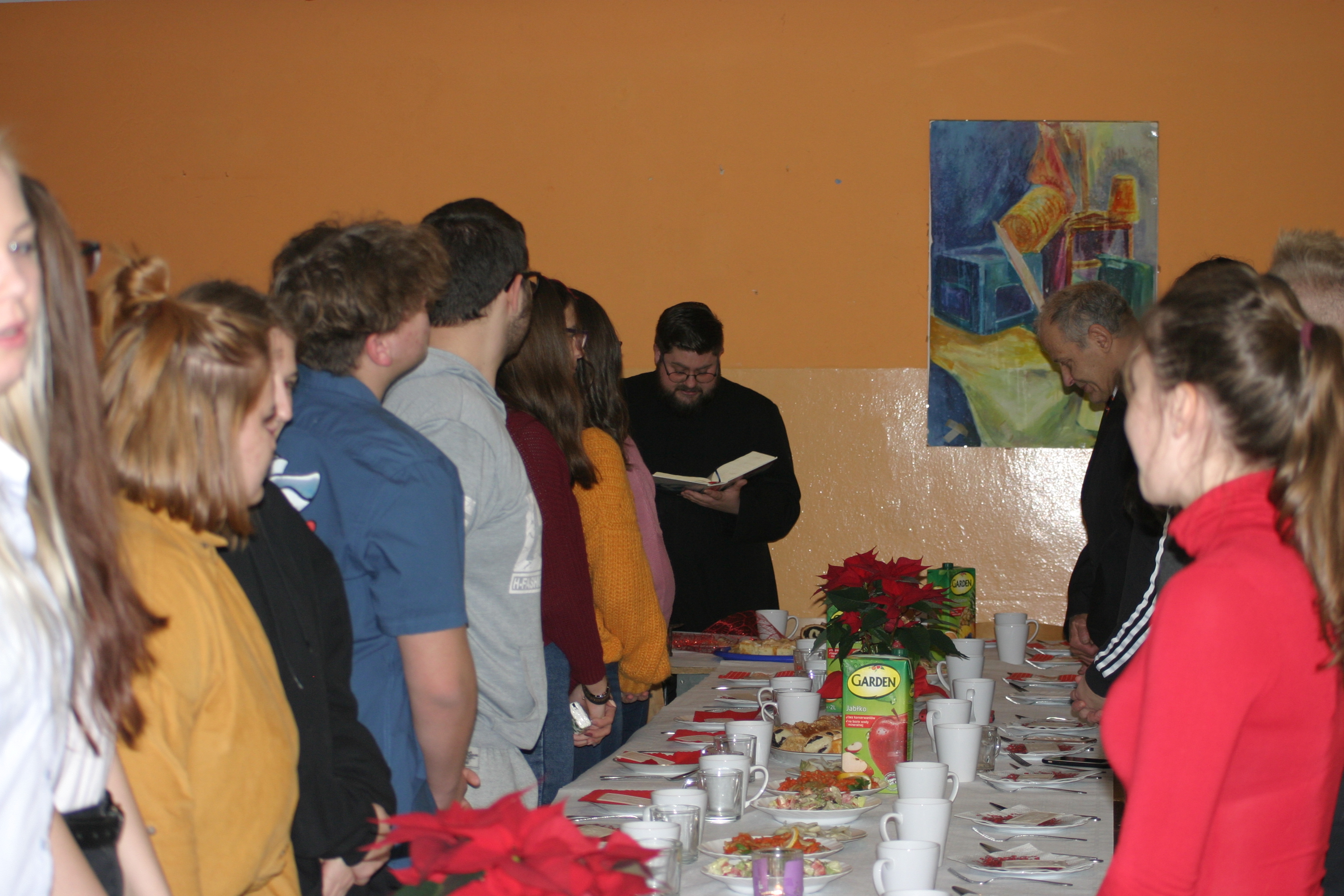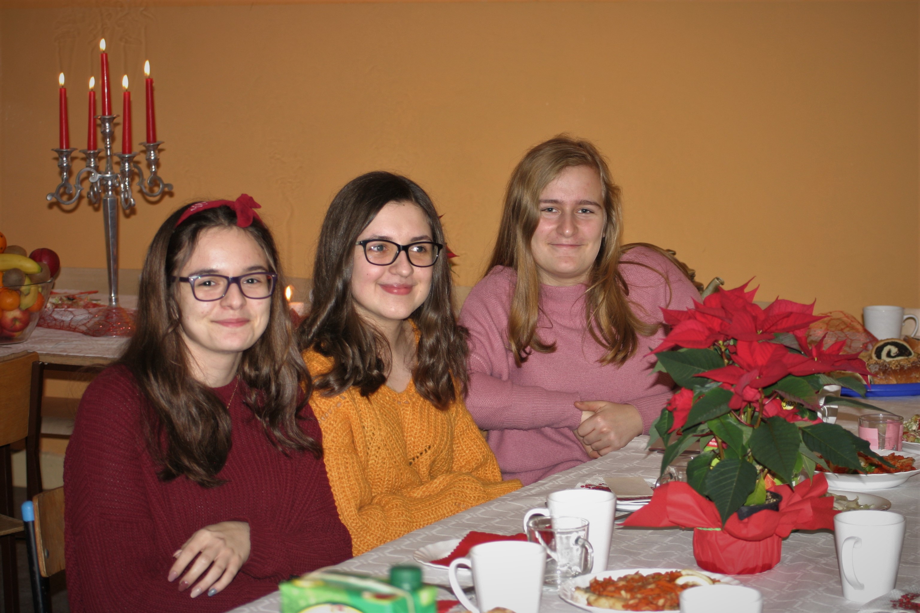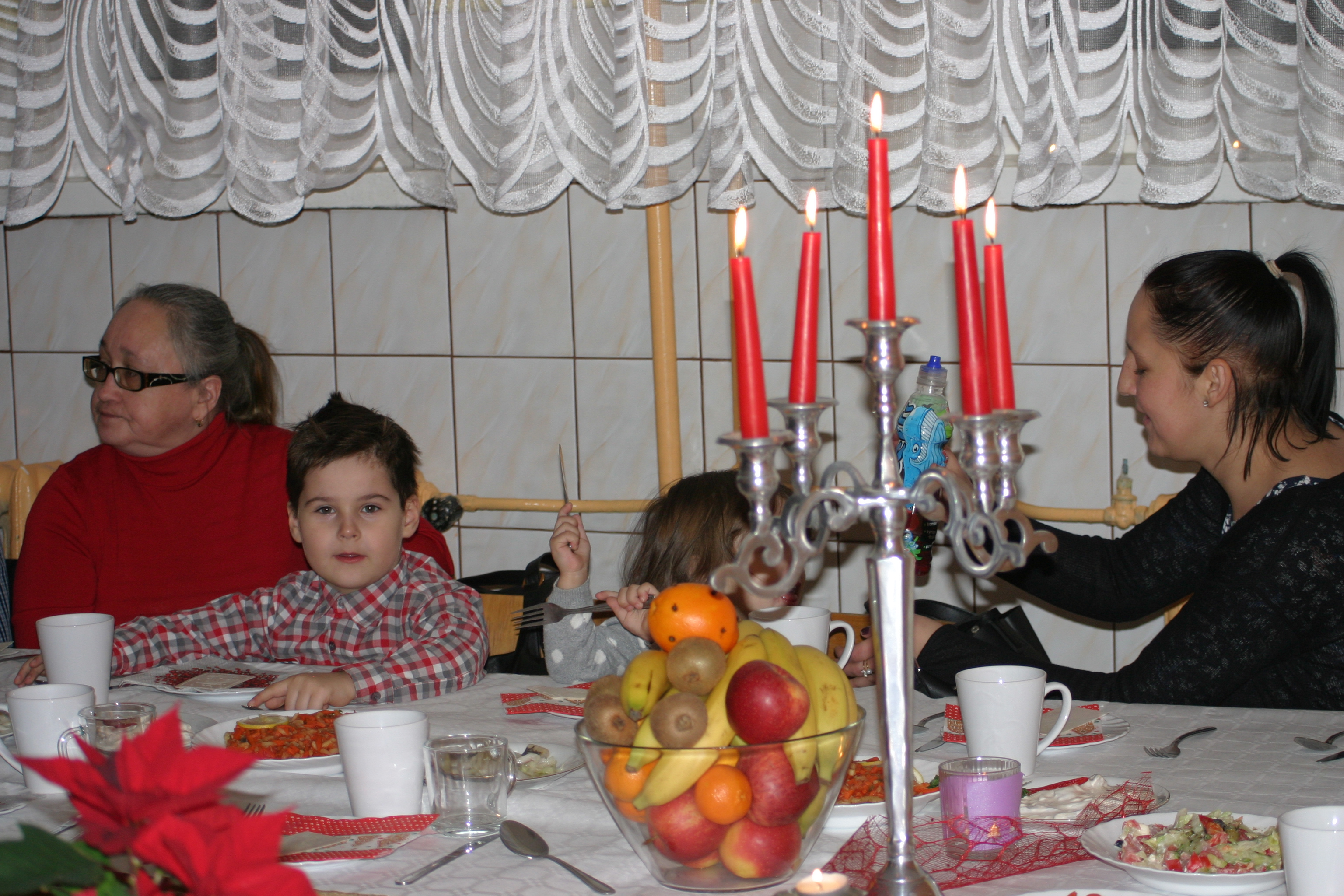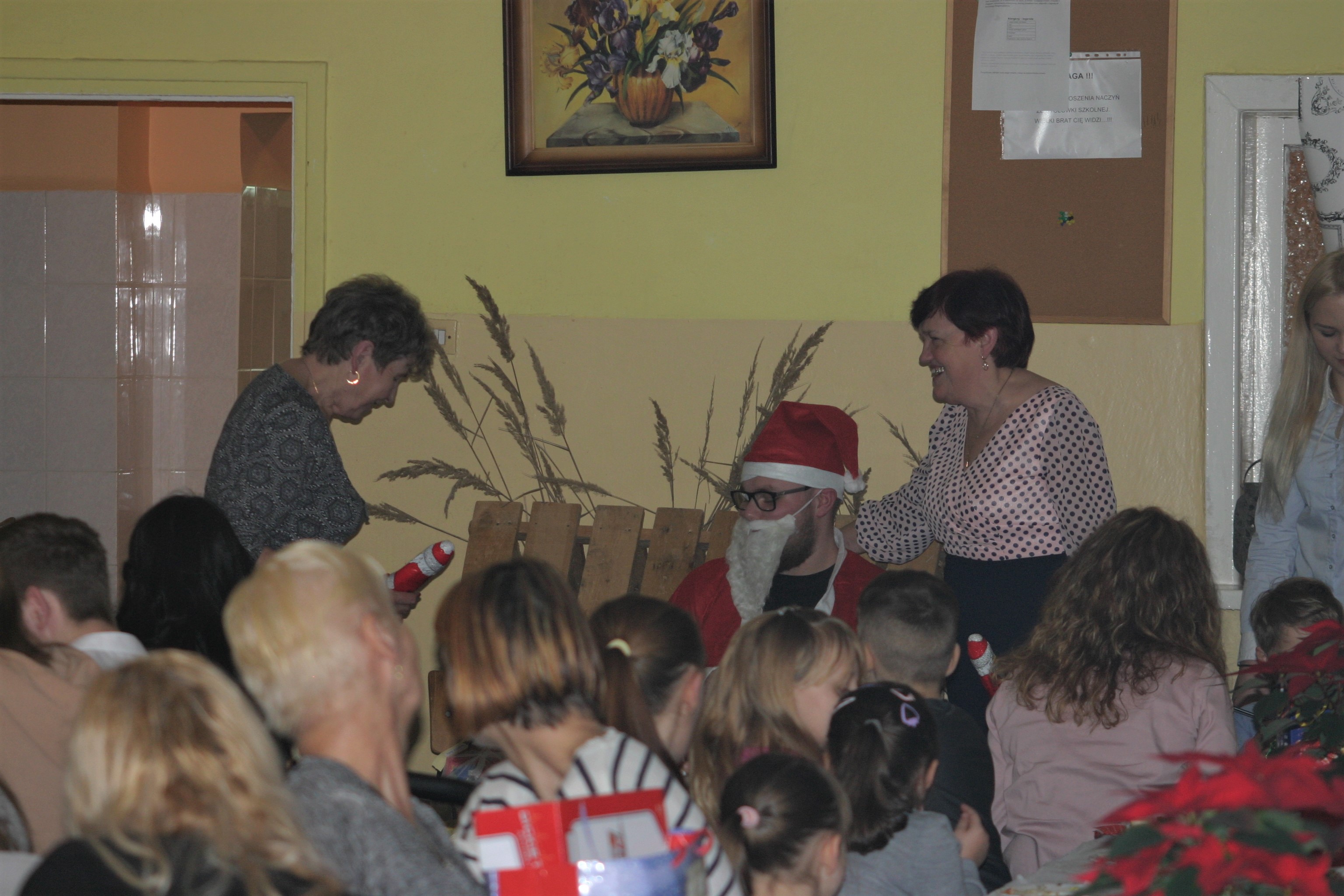Ksiądz Łukasz – składając wszystkim bożonarodzeniowe życzenia – rozpoczął dzielenie się opłatkiem. A potem zaczęliśmy ucztować. Na kolacji pojawiły się – zgodnie z obyczajem – postne dania wigilijne: barszcz, pierogi, makowiec. Niespodziewanie pojawił się Święty Mikołaj, który dzięki porozumieniu ze sponsorami (Caritas Polska i Rada Osiedla „Zdroje”) obdarował przybyłych zawartością przyniesionego wielkiego worka. Kolacja zakończyła się w radosnym nastroju ubarwionym śpiewem pięknych kolęd oraz wręczeniem podziękowań dla naszych darczyńców, dzięki którym mogliśmy ofiarować dzieciom szczęście i uśmiech na twarzy, za co pięknie dziękujemy 🙂
