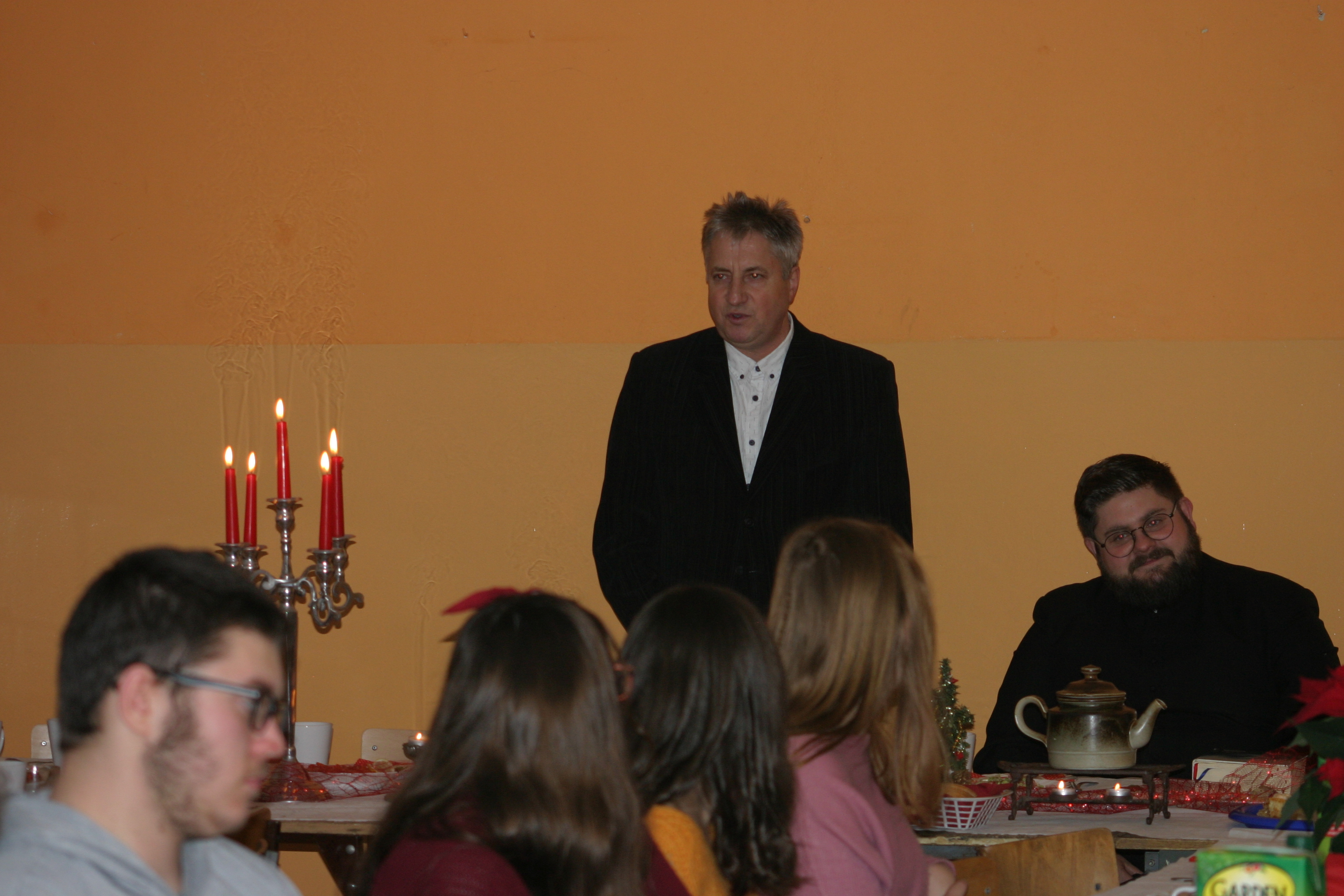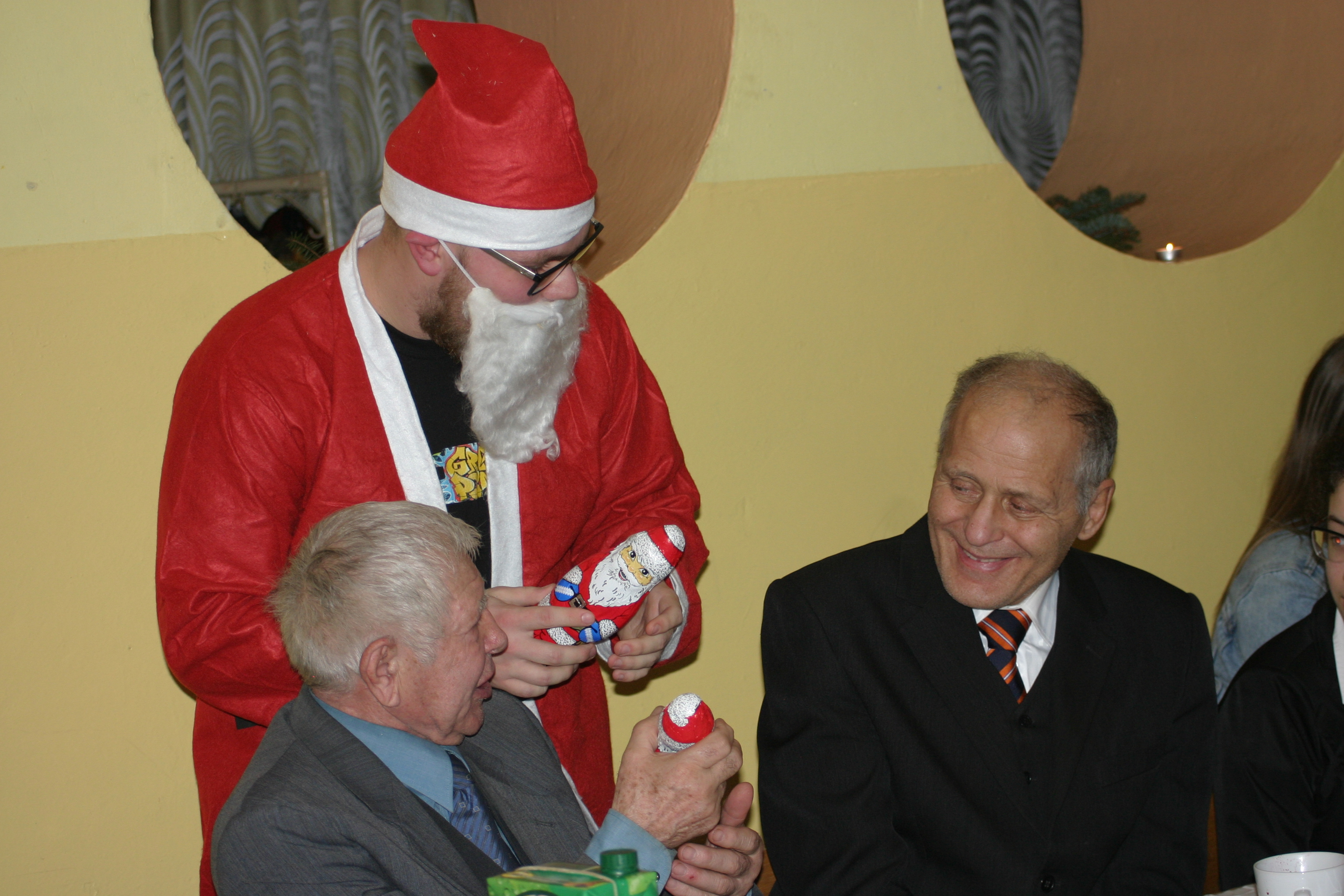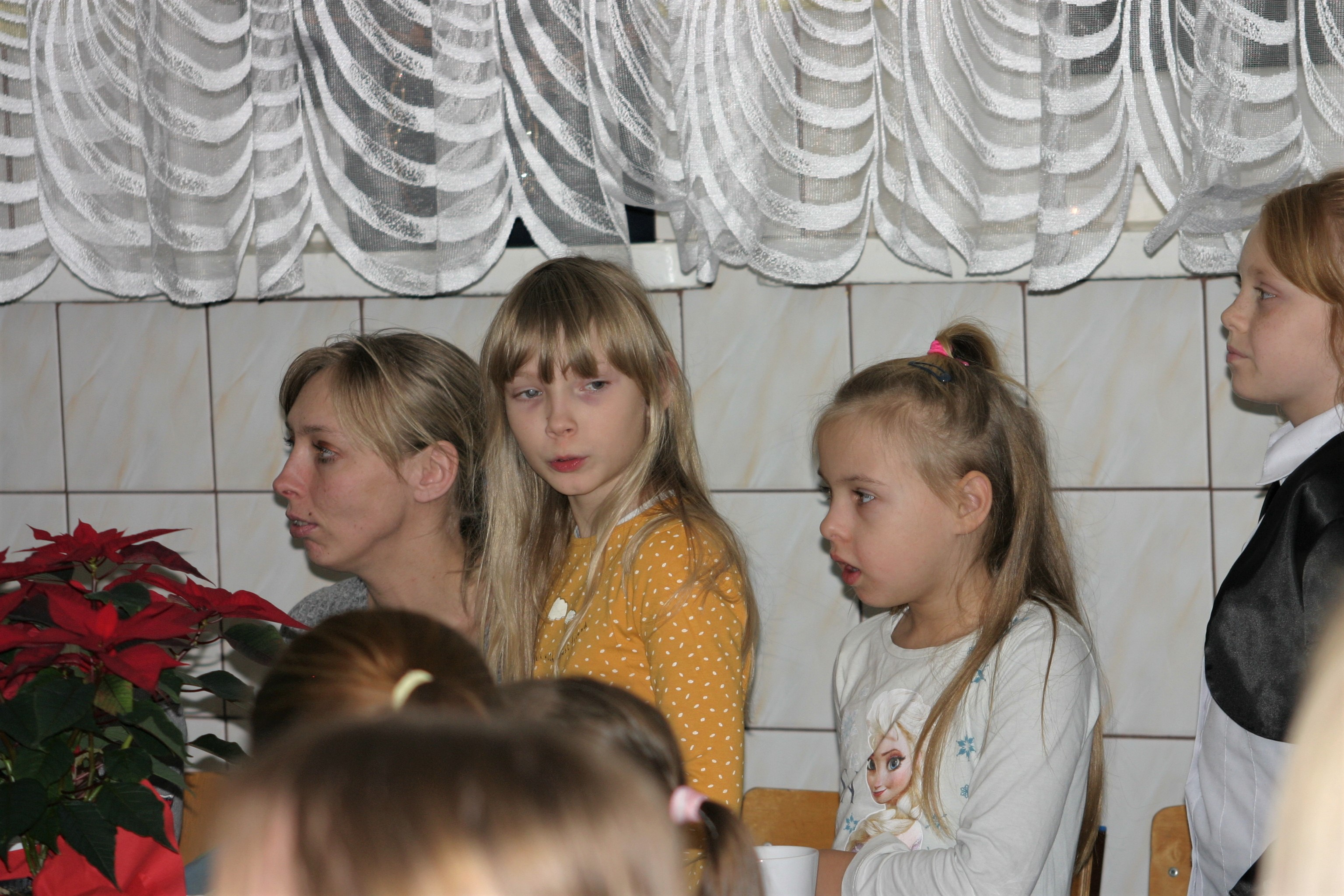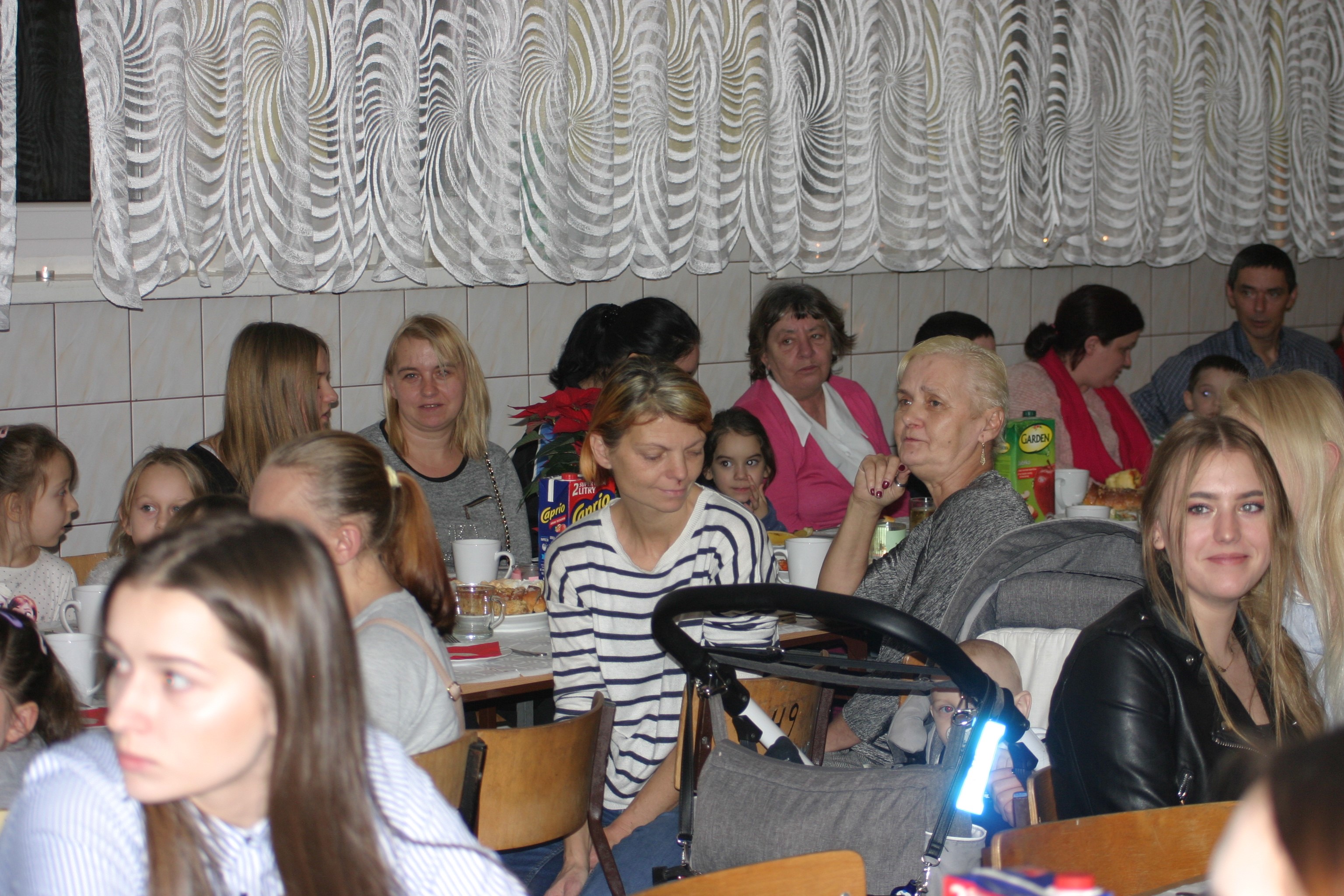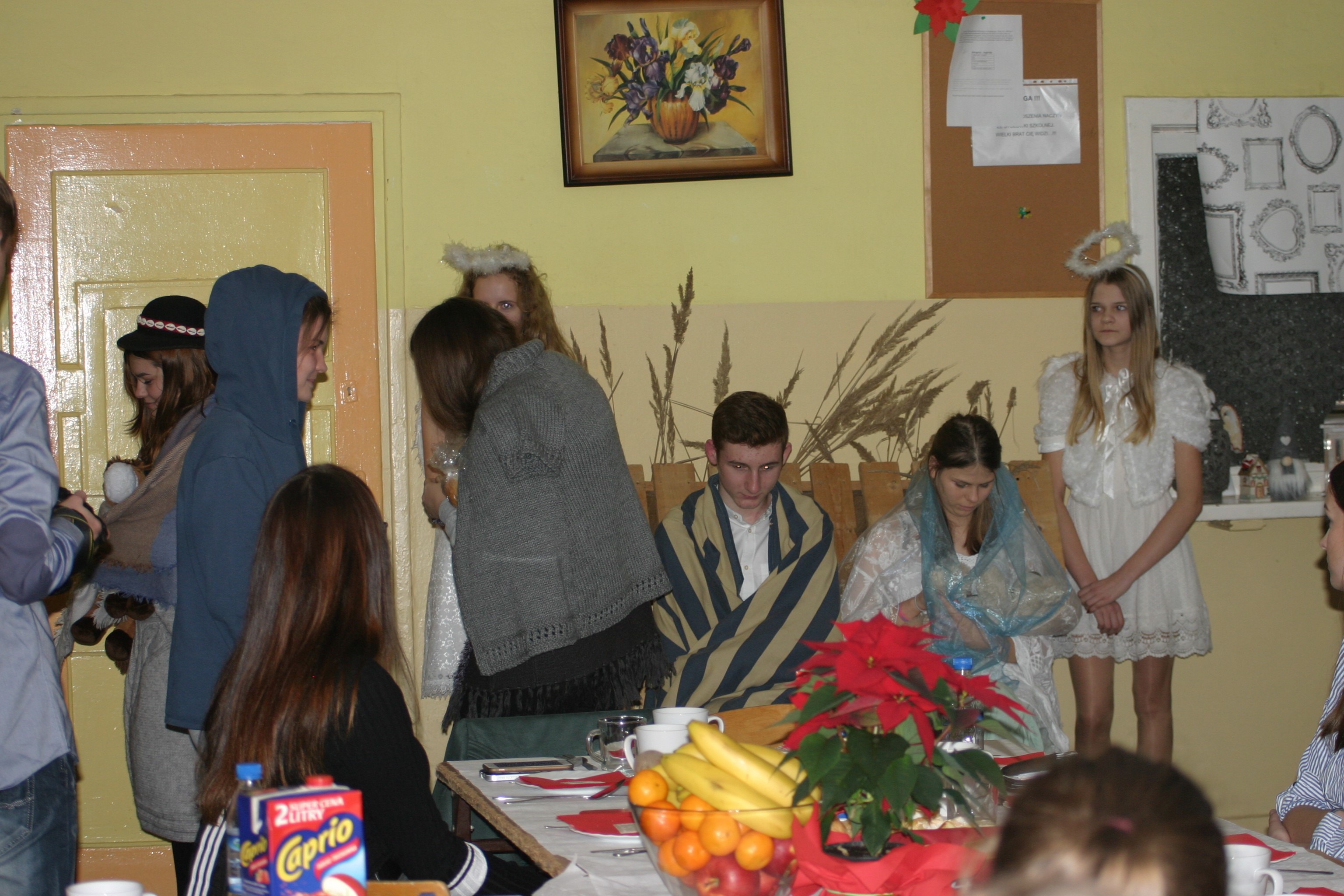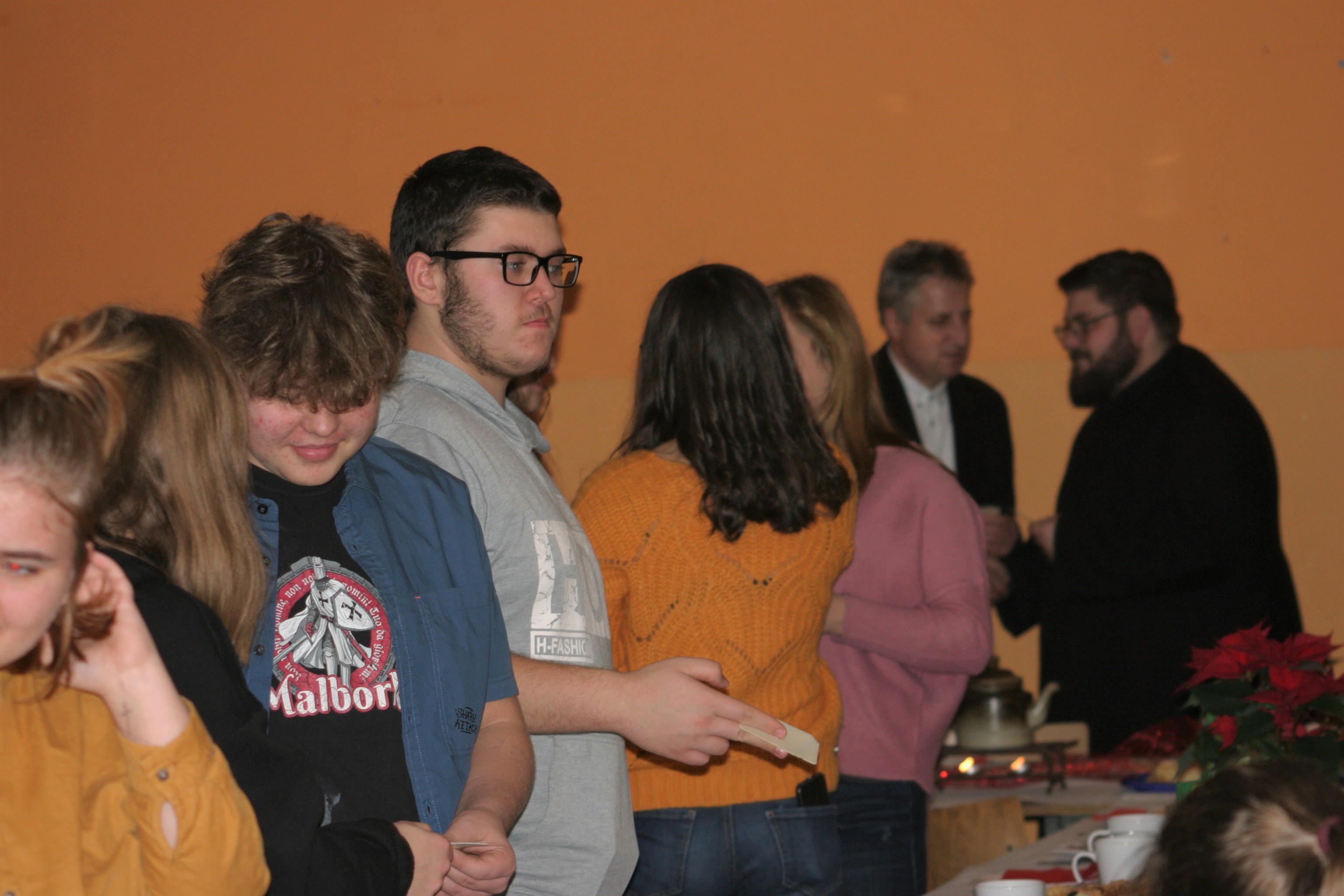 Ksiądz Łukasz – składając wszystkim bożonarodzeniowe życzenia – rozpoczął dzielenie się opłatkiem. A potem zaczęliśmy ucztować. Na kolacji pojawiły się – zgodnie z obyczajem – postne dania wigilijne: barszcz, pierogi, makowiec. Niespodziewanie pojawił się Święty Mikołaj, który dzięki porozumieniu ze sponsorami (Caritas Polska i Rada Osiedla „Zdroje”) obdarował przybyłych zawartością przyniesionego wielkiego worka. Kolacja zakończyła się w radosnym nastroju ubarwionym śpiewem pięknych kolęd oraz wręczeniem podziękowań dla naszych darczyńców, dzięki którym mogliśmy ofiarować dzieciom szczęście i uśmiech na twarzy, za co pięknie dziękujemy 🙂