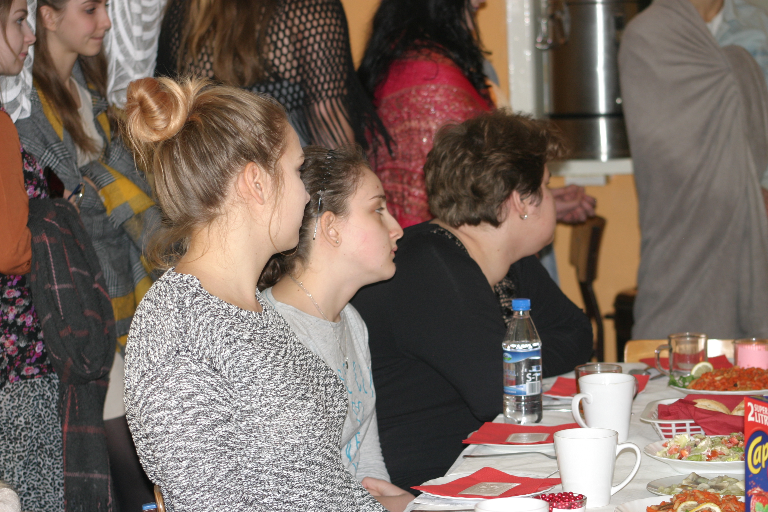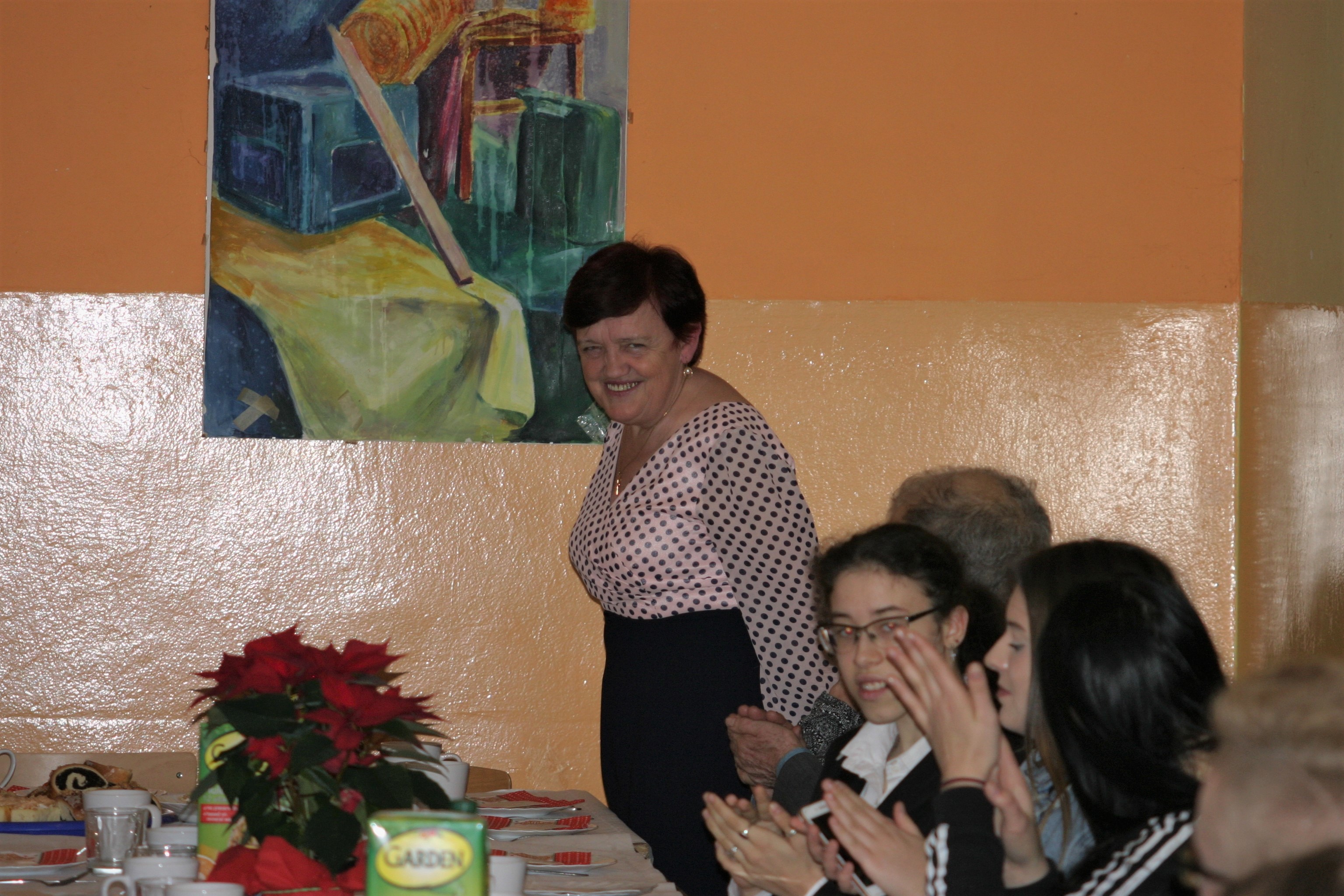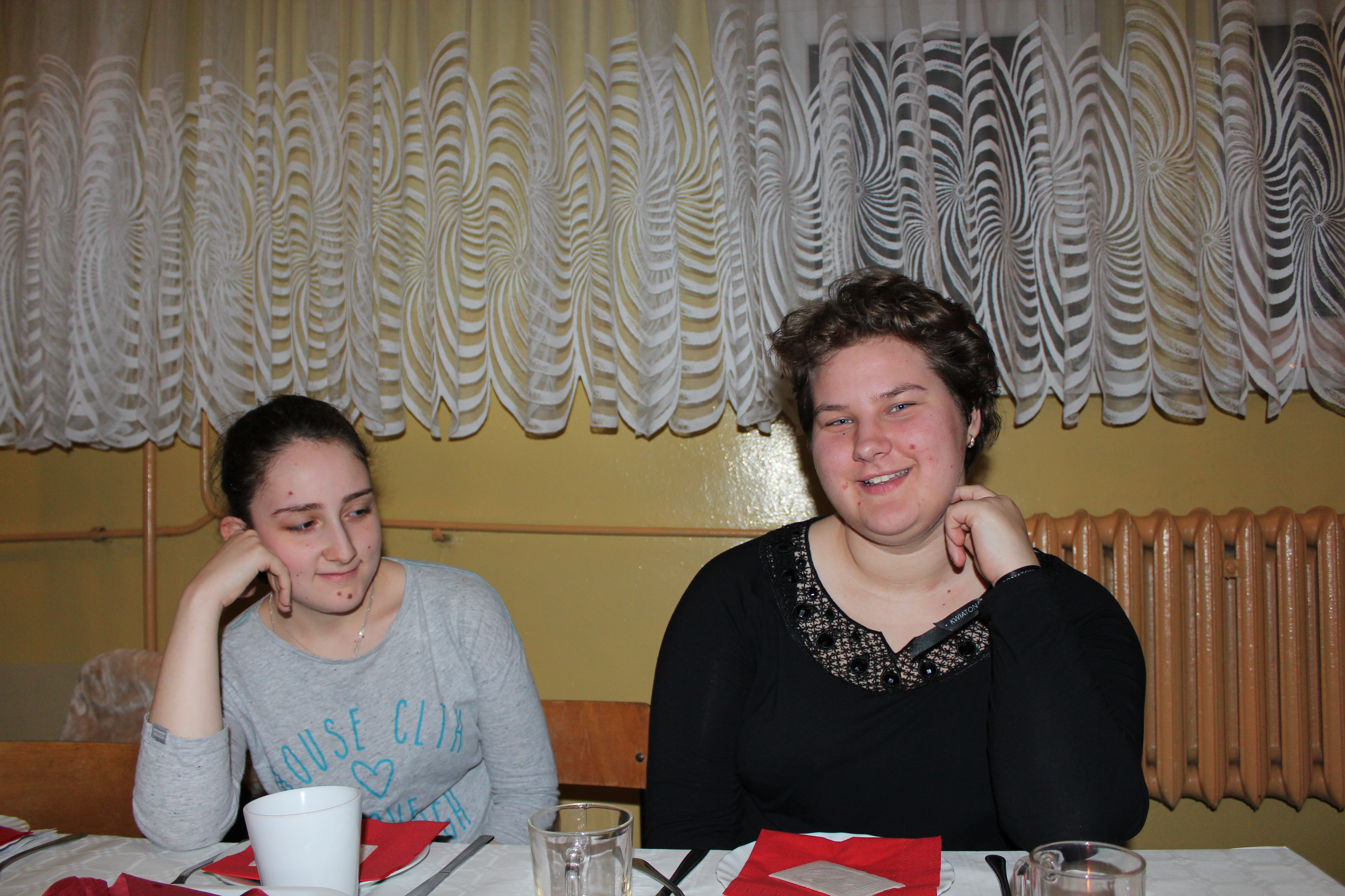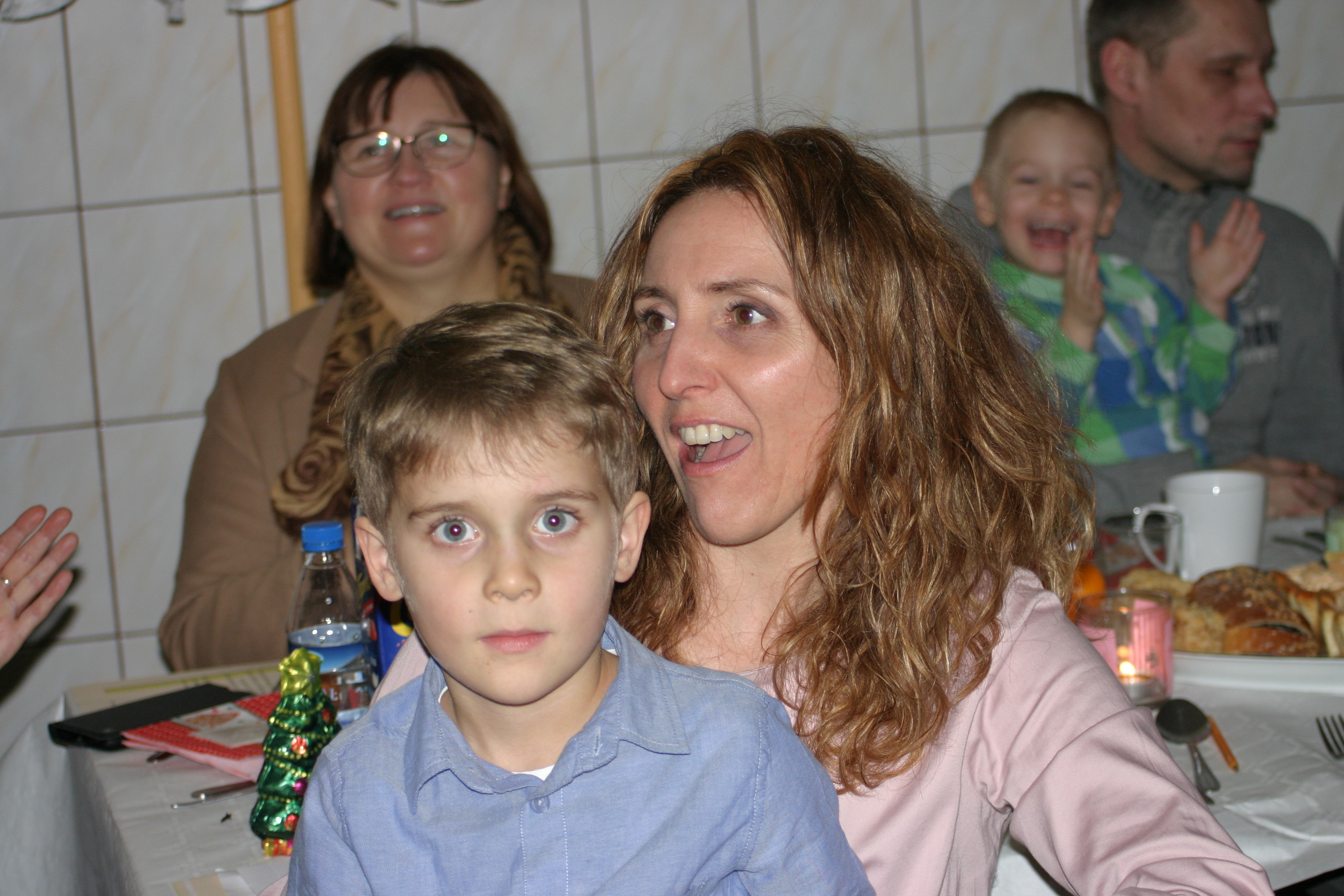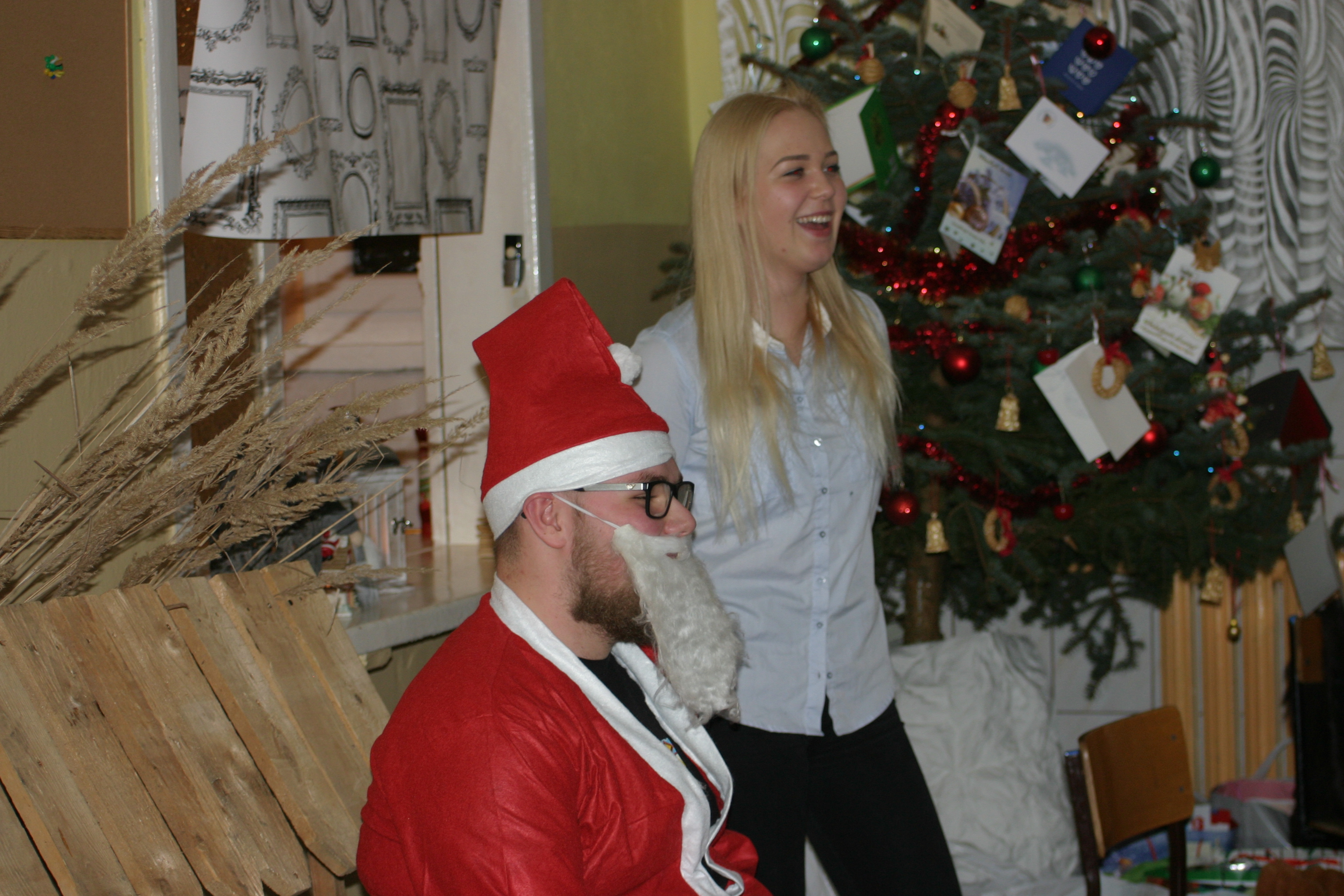 Ksiądz Łukasz – składając wszystkim bożonarodzeniowe życzenia – rozpoczął dzielenie się opłatkiem. A potem zaczęliśmy ucztować. Na kolacji pojawiły się – zgodnie z obyczajem – postne dania wigilijne: barszcz, pierogi, makowiec. Niespodziewanie pojawił się Święty Mikołaj, który dzięki porozumieniu ze sponsorami (Caritas Polska i Rada Osiedla „Zdroje”) obdarował przybyłych zawartością przyniesionego wielkiego worka. Kolacja zakończyła się w radosnym nastroju ubarwionym śpiewem pięknych kolęd oraz wręczeniem podziękowań dla naszych darczyńców, dzięki którym mogliśmy ofiarować dzieciom szczęście i uśmiech na twarzy, za co pięknie dziękujemy 🙂