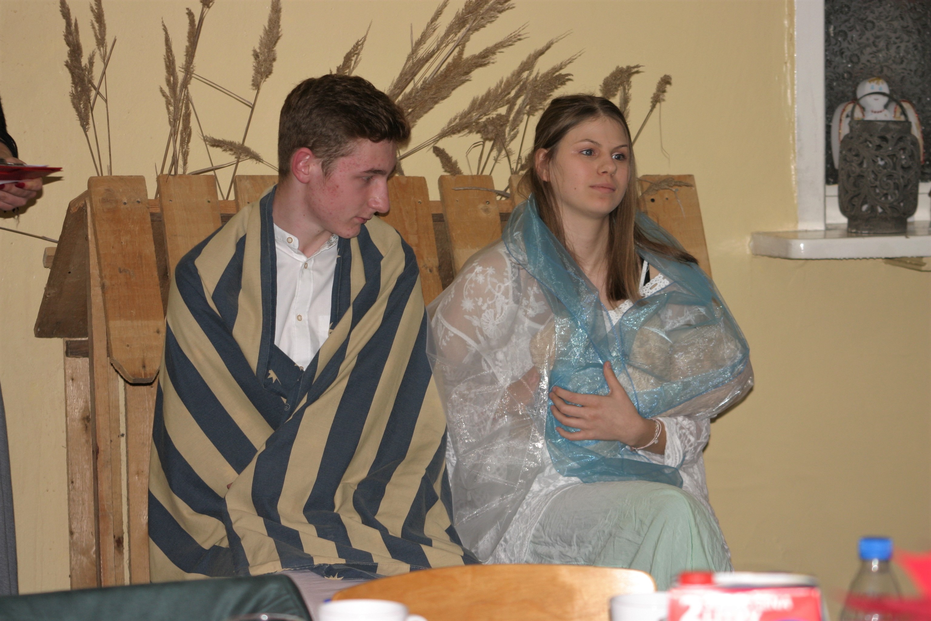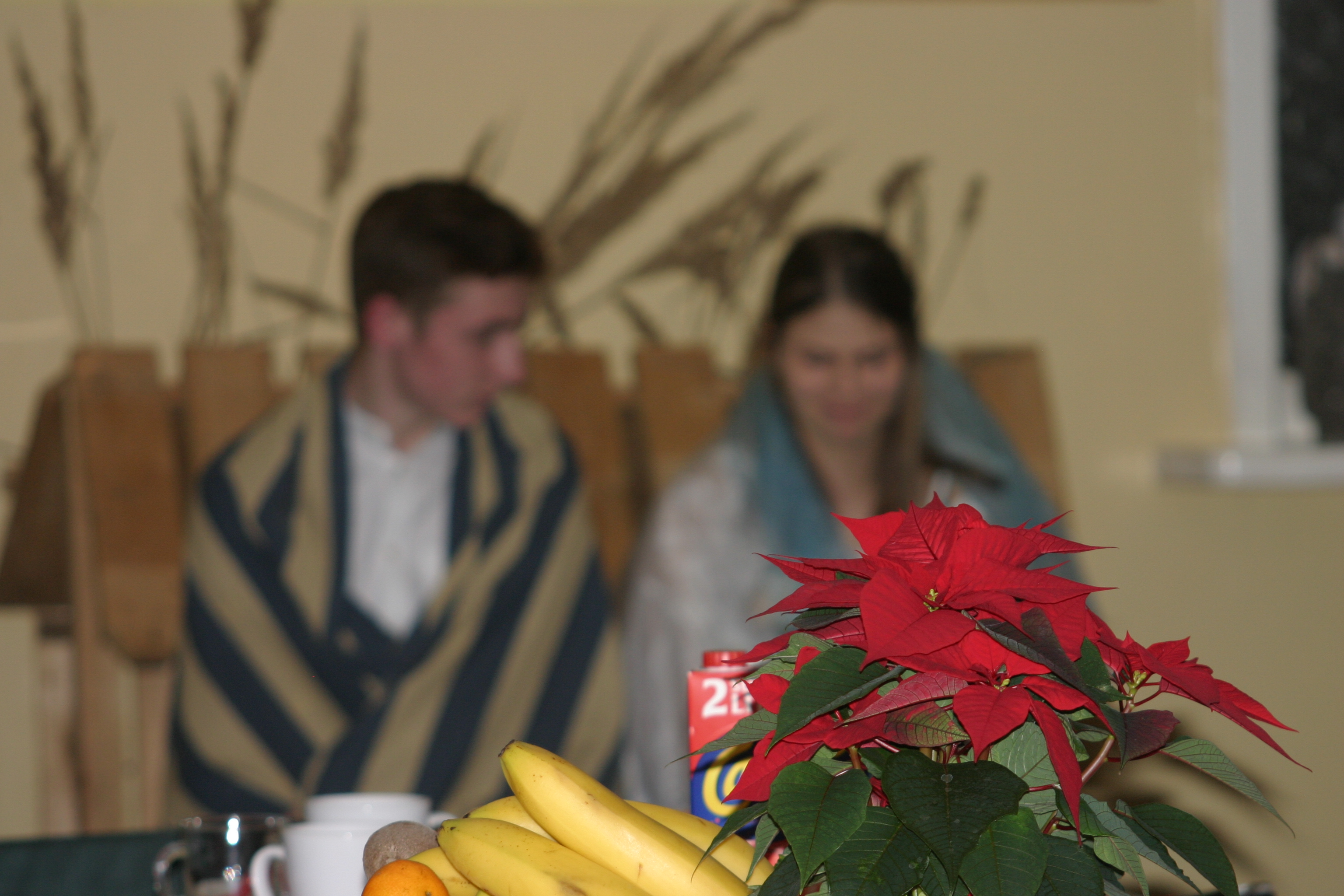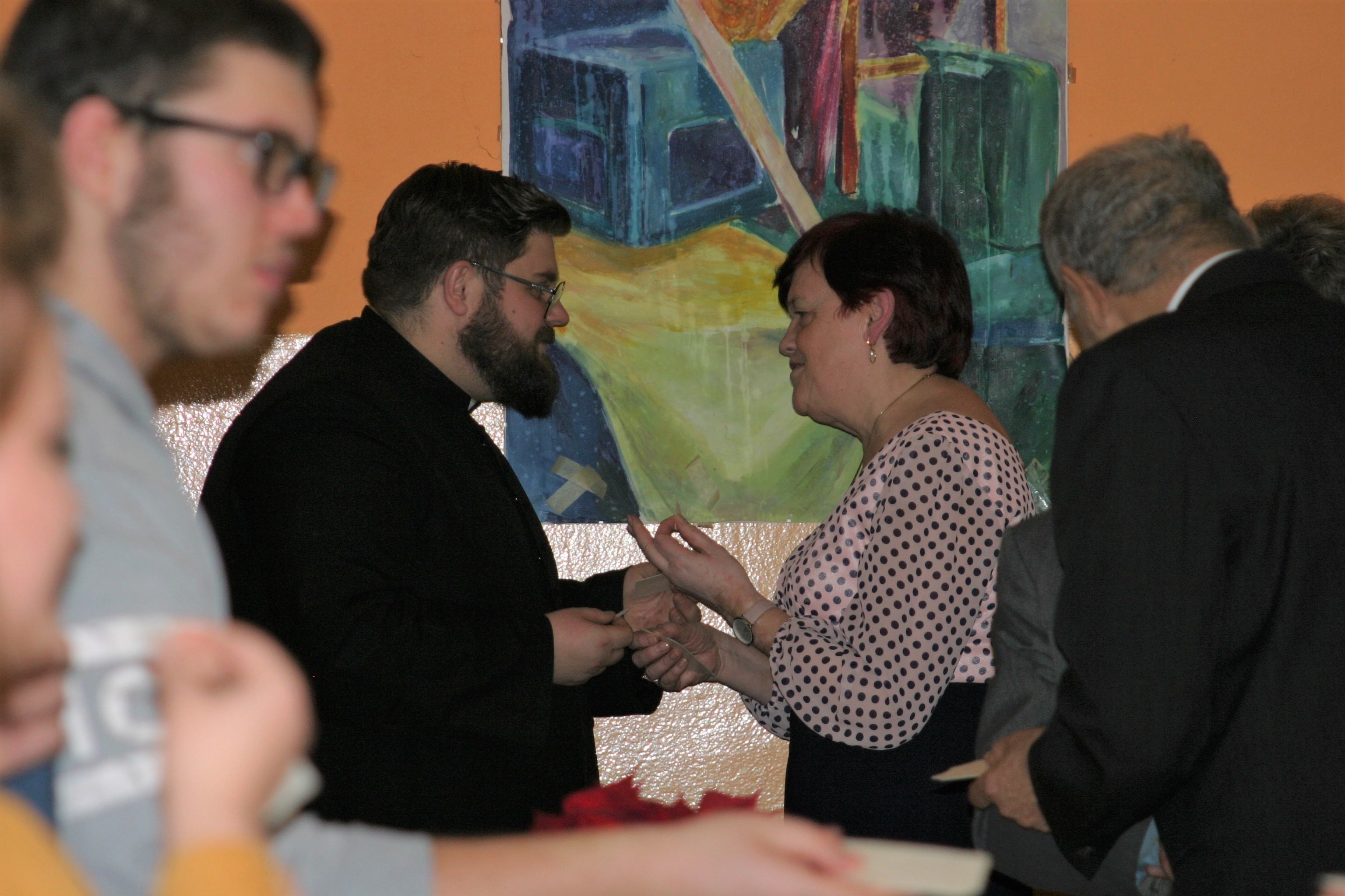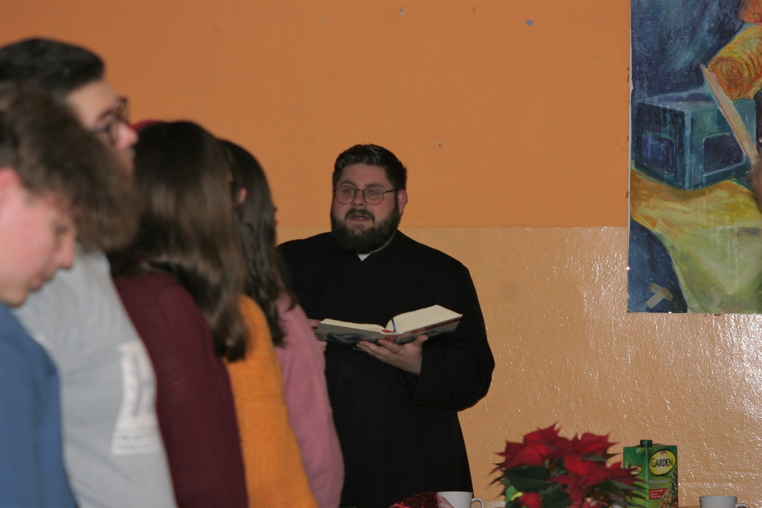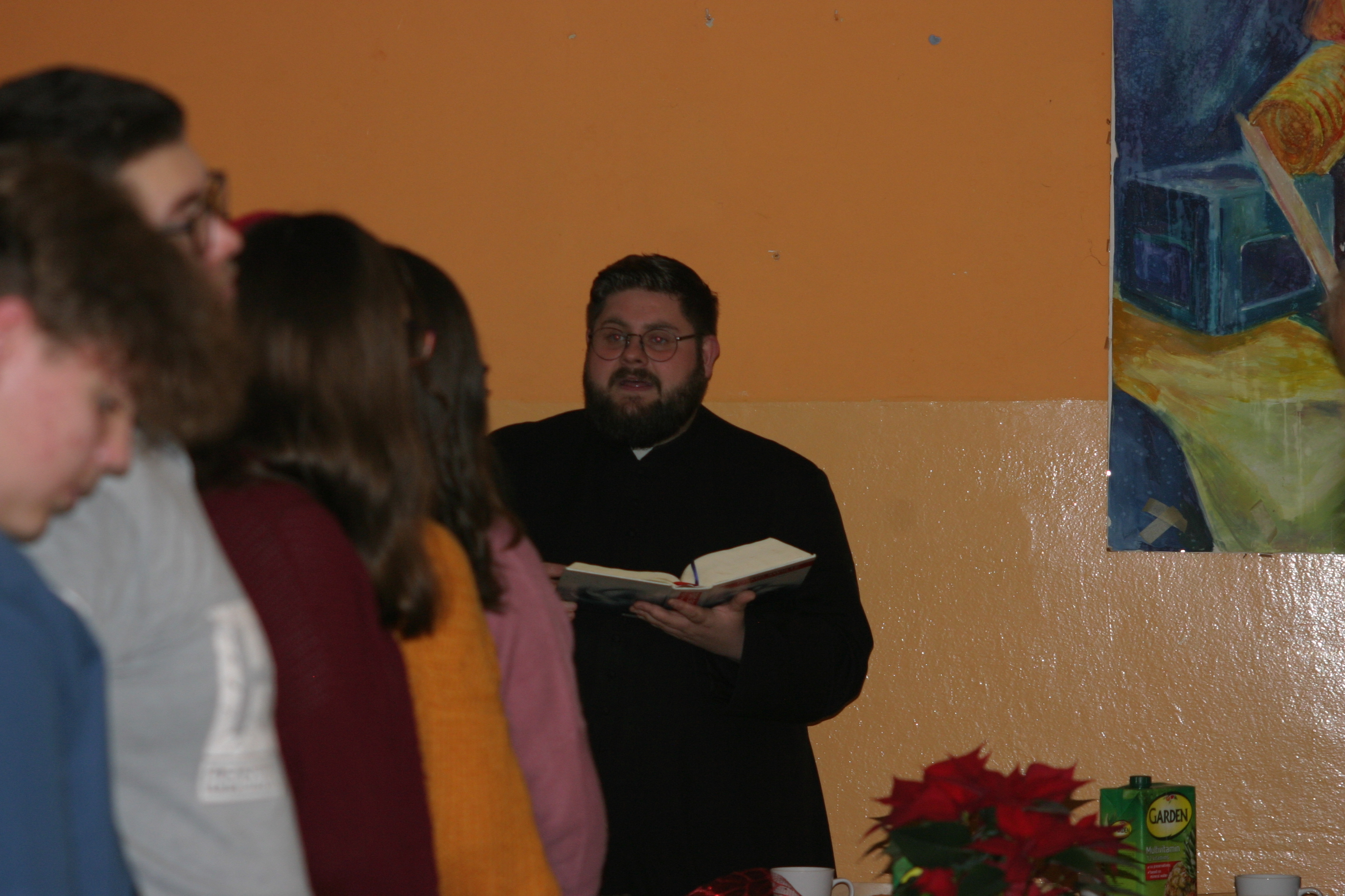 Ksiądz Łukasz – składając wszystkim bożonarodzeniowe życzenia – rozpoczął dzielenie się opłatkiem. A potem zaczęliśmy ucztować. Na kolacji pojawiły się – zgodnie z obyczajem – postne dania wigilijne: barszcz, pierogi, makowiec. Niespodziewanie pojawił się Święty Mikołaj, który dzięki porozumieniu ze sponsorami (Caritas Polska i Rada Osiedla „Zdroje”) obdarował przybyłych zawartością przyniesionego wielkiego worka. Kolacja zakończyła się w radosnym nastroju ubarwionym śpiewem pięknych kolęd oraz wręczeniem podziękowań dla naszych darczyńców, dzięki którym mogliśmy ofiarować dzieciom szczęście i uśmiech na twarzy, za co pięknie dziękujemy 🙂