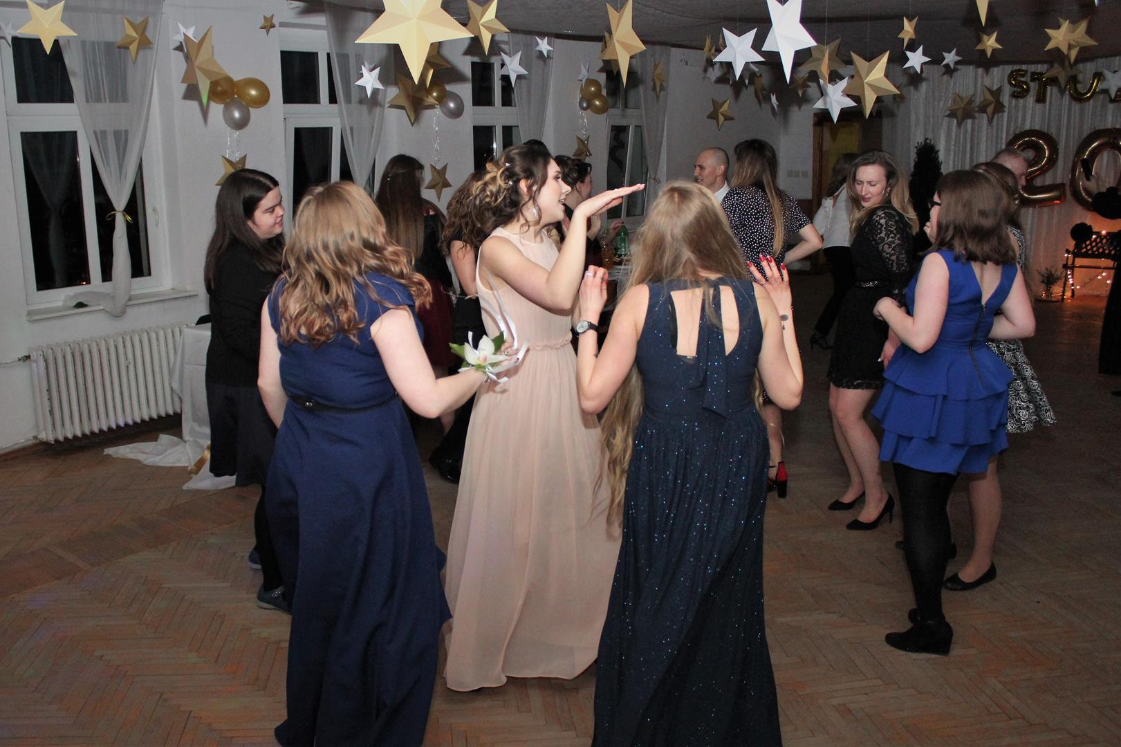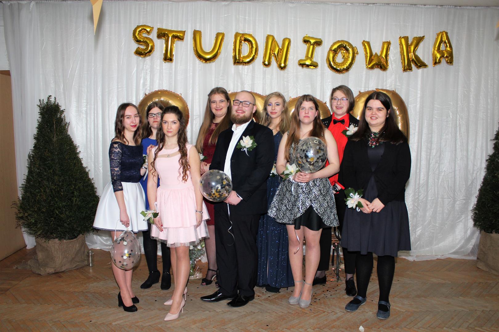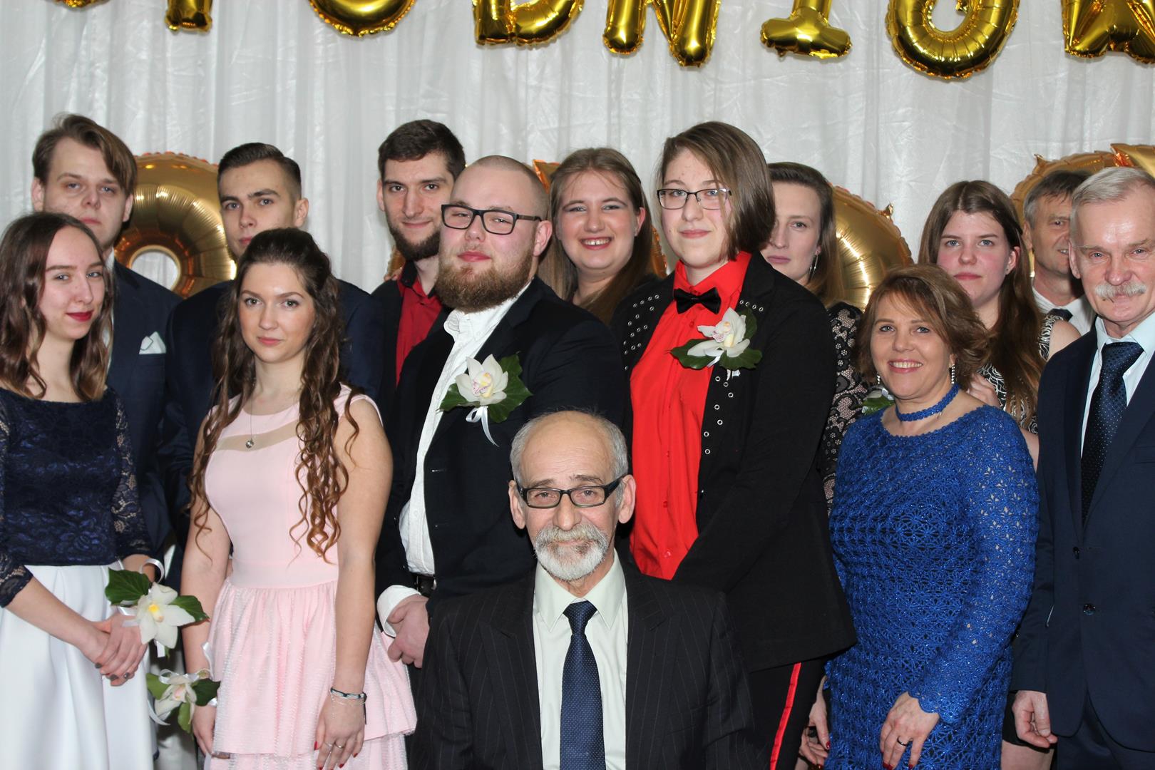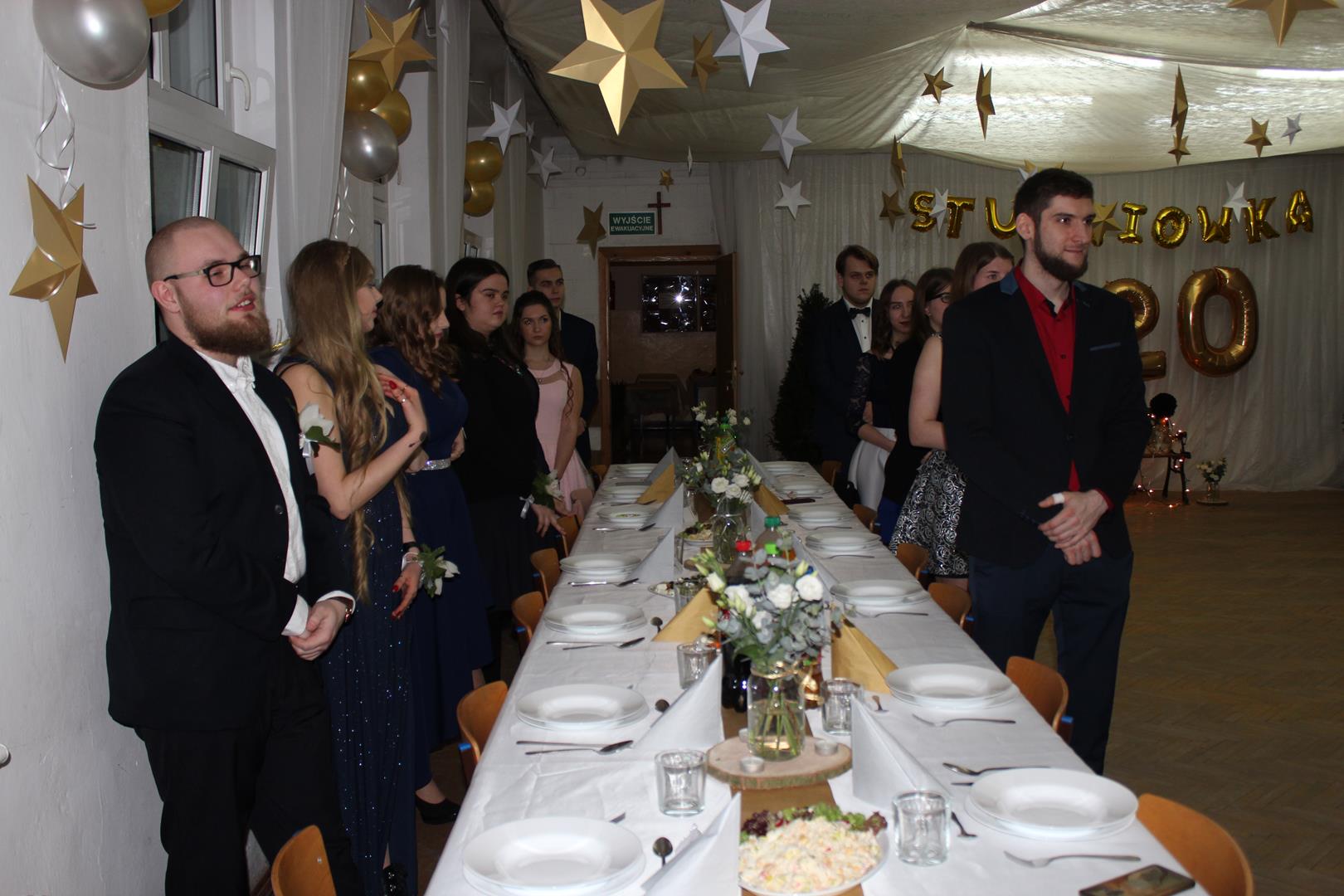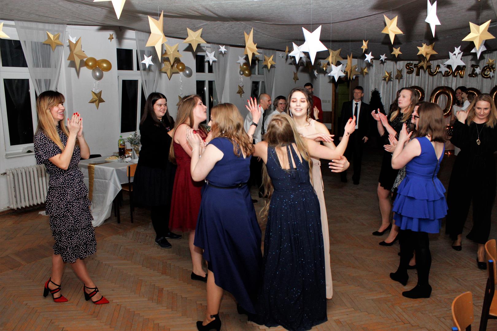Wykorzystały wieloletnią, sprawdzoną współpracę z Technikum Gastronomicznym, które w ramach warsztatów szkolnych zadbało o catering. I, co chyba najważniejsze, włączyły do organizacji swoich rodziców. Ich pomoc i obecność na imprezie dostarczyły wszystkim wielu pozytywnych wzruszeń. Pięknie nakryte stoły, uwijający się z wdziękiem kelnerzy z młodszych klas (brawo Arek i Bartek!) i zapracowani na gastronomicznym zapleczu Państwo Majewscy, to obraz świetlicy przed godziną 19.00. Gdyby nie uśmiechy nie poznałbym swoich uczennic! Tak były odmienione w wieczorowych strojach, nawet Kuba, po wizycie u dobrego barbera, wyglądał bardzo dostojnie. Gospodynie wieczoru – Karolina i Ola – ze wzruszeniem powitały gości i uczestników balu oraz zapowiedziały tradycyjnego poloneza, którego poprowadziła, z Kubą w parze, autorka układu choreograficznego Pani Dyrektor Lila Pławińska-Kopeć. Następnie były życzenia pomyślności skierowane do maturzystów od Pani Dyrektor i obecnych nauczycieli. Szczególnie ujmujące były refleksje rodziców – mamy Emilki i Moniki oraz taty Martyny, którzy wspominali czas, kiedy prowadzili swoje dzieci na pierwszy szkolny bal, a tego dnia towarzyszą im w ostatnim balu szkolnym. Trzeba było widzieć ich wzruszenie, dumę i szczęście na twarzach! Prowadzące bal niespodziewanie zmusiły do wystąpienia swego wychowawcę, który zazwyczaj unika publicznych wypowiedzi jak diabeł święconej wody. Zaskoczony zamiast swojej zwykłej metody wychowawczej czyli „kija” – zastosował rzadko stosowaną „marchewkę” i wyraził przekonanie, że zarówno z egzaminami maturalnymi, jak i w pracy z ukochanymi zwierzętami jego podopieczni poradzą sobie tak jak z dotychczasową nauką, czyli dobrze. I powiedział jeszcze jedną herezję pedagogiczną, że jest dumny ze swoich uczniów! Był toast i zaczęły się tańce i swawole. Początkowe onieśmielenie maturzystów bardzo szybko im minęło, gdy zobaczyli na parkiecie tańczących rodziców i nauczycieli. No i wcale nie ustępowali im umiejętnościami tanecznymi, a przynajmniej werwą i ochotą do zabawy. Popatrzcie na ich fotografie z zabawy studniówkowej, a następne zobaczycie w kwietniu z uroczystego wręczenia świadectw ukończenia szkoły. Z pewnością będą równie uśmiechnięci.