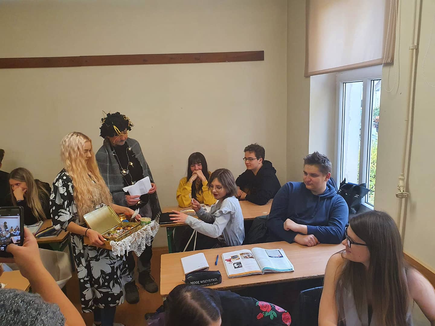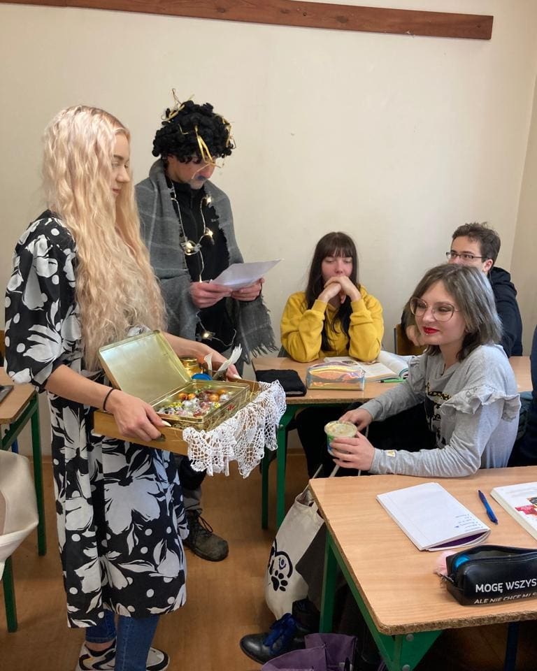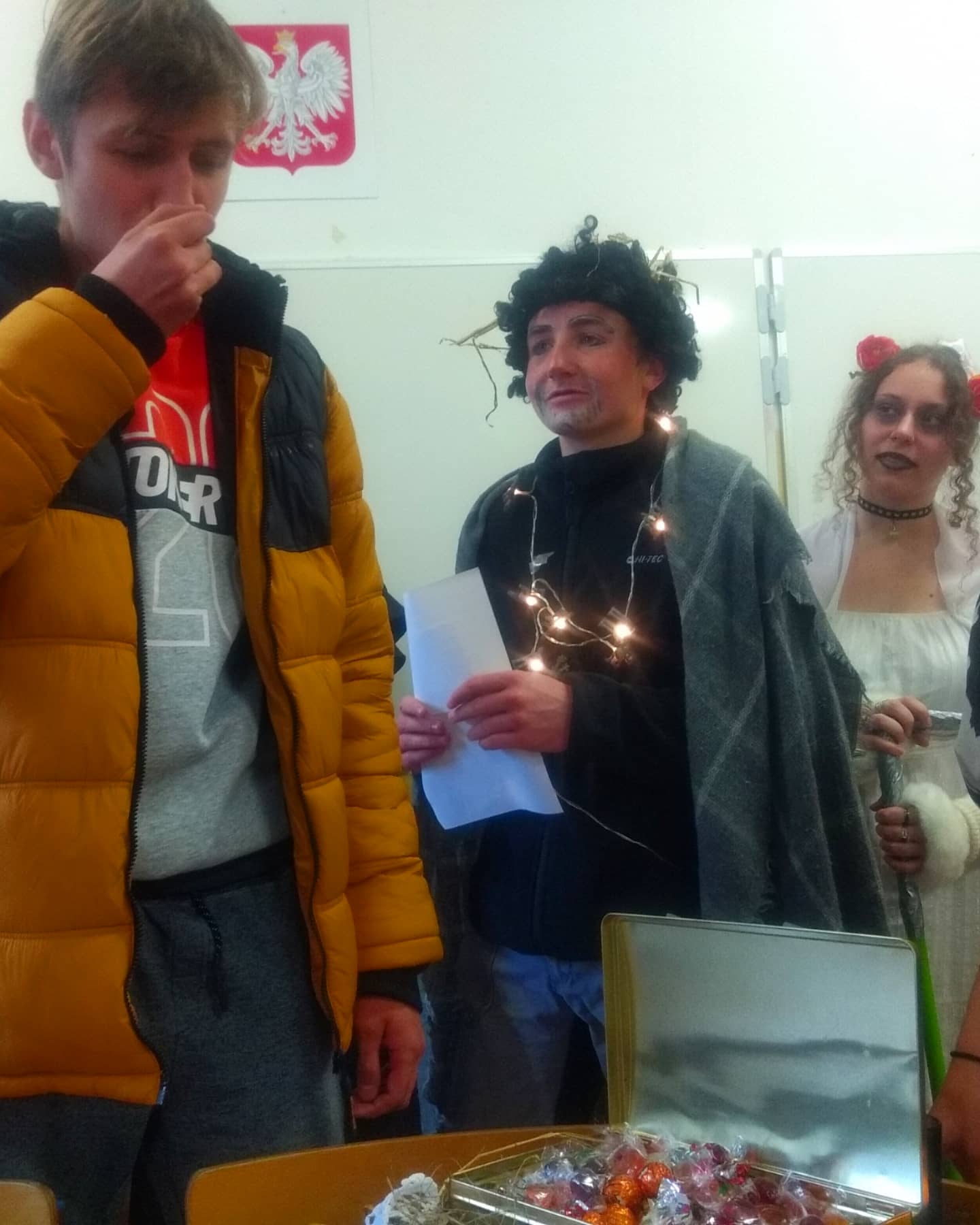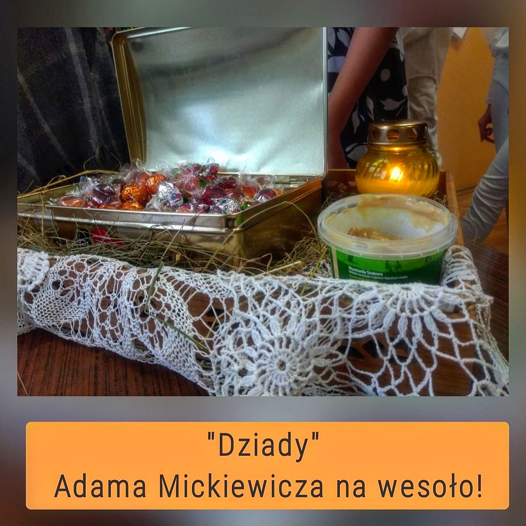 Uczniowie naszej szkoły przygotowali quiz dotyczący ,,Dziadów, część II”. Uczestnicy musieli odpowiadać na pytania dotyczące utworu. Brak wiedzy na temat treści dramatu skutkował zaznaniem goryczy w życiu ( zjedzenie porcji musztardy – symbol gorczycy która dzieci powinny dostać aby trafić do nieba), a udzielenie poprawnej odpowiedzi zaznaniem słodyczy (cukierek).