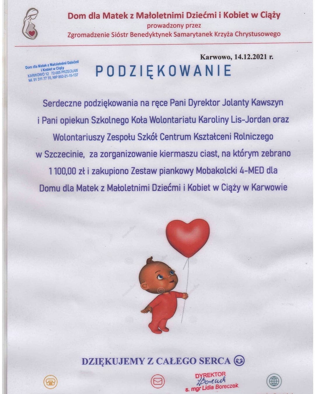 16 grudnia 2021 roku troje Wolontariuszy z ZS CKR w Szczecinie już po raz czwarty zawiozło dary dla podopiecznych Domu Samotnej Matki w Karwowie. Uczniom towarzyszyła Pani Dyrektor Jolanta Kawszyn oraz Opiekun Szkolnego Koła Wolontariatu, Pani Karolina Lis-Jordan. Dzięki przeprowadzonemu w październiku „Kiermaszu Ciast” udało się zebrać 1100 zł, które przeznaczone zostały na zakup wspierających rozwój dużej motoryki u dzieci – klocków piankowych. Zakup klocków konstrukcyjnych miał najmłodszym mieszkańcom DSM dodatkowo umilić czas adwentowego wyczekiwania Świąt Bożego Narodzenia.