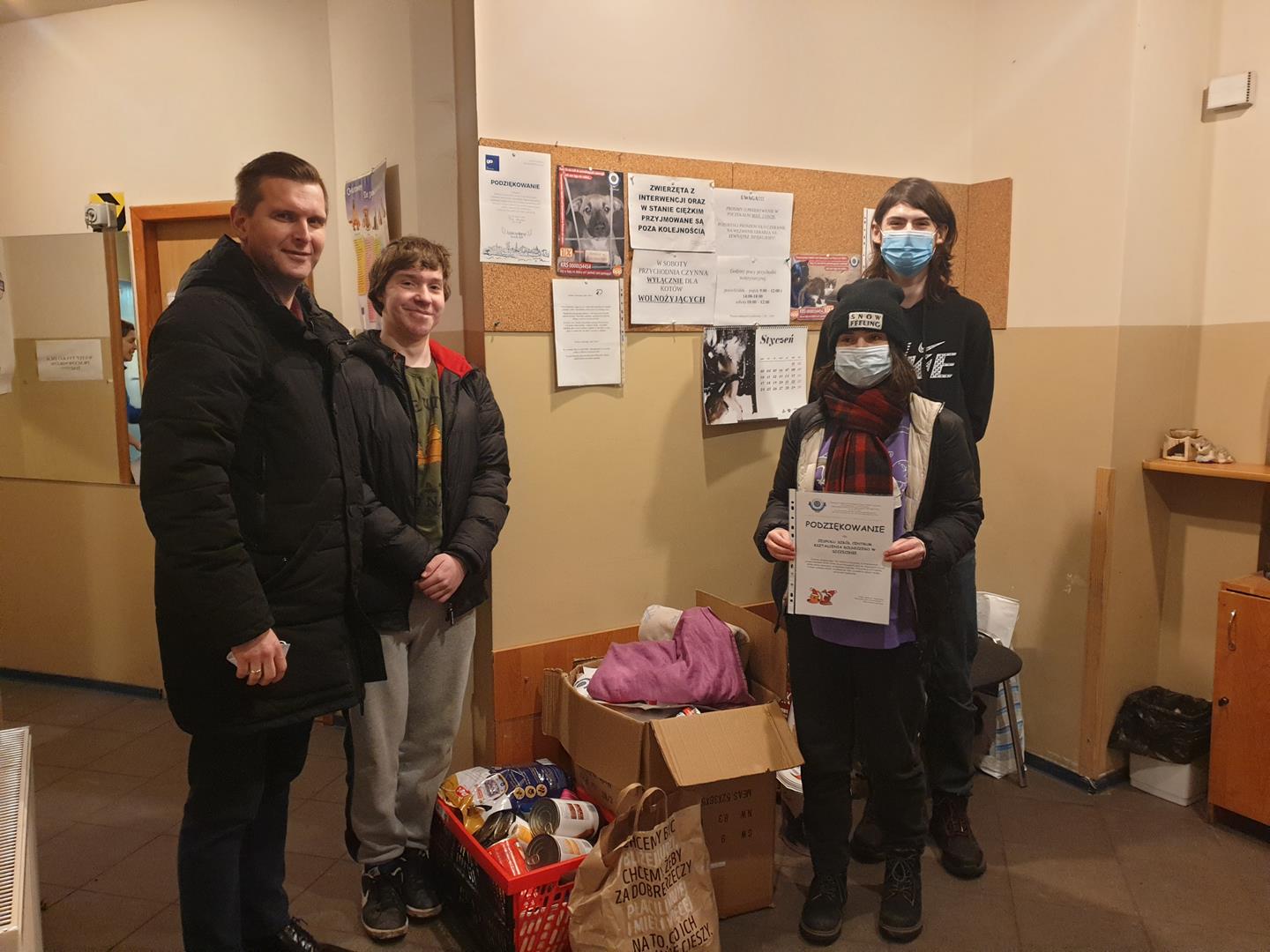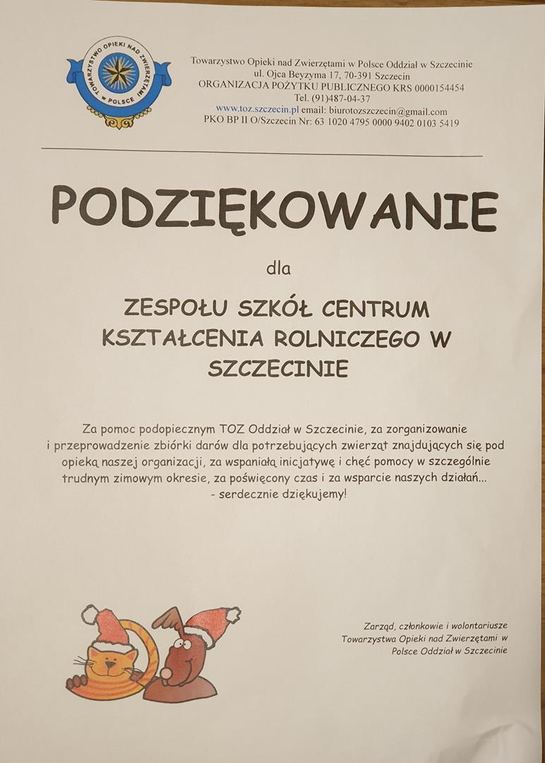 W ramach akcji Paczka dla Zwierzaczka organizowanej przez Towarzystwo Opieki nad Zwierzętami Oddział w Szczecinie z inicjatywy ucznia klasy 3 technikum weterynaryjnego Ernesta Pawłowskiego z małą pomocą nauczyciela Roberta Palacza, społeczność szkolna zebrała karmę oraz artykuły dla zwierząt. Przygotowane paczki zostały dzisiaj przekazane w siedzibie TOZ-u.W ramach współpracy uczniowie 3LT wyprowadzili róznież psy będące aktualnie pod opieką Towarzystwo Opieki nad Zwierzętami Oddział w Szczecinie.