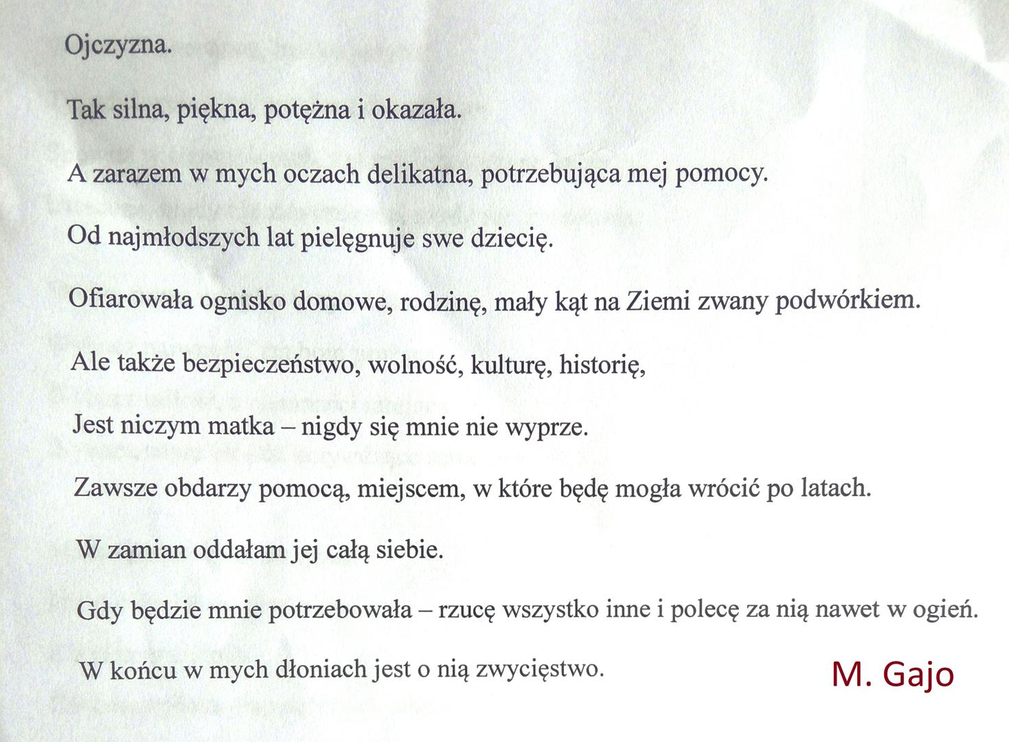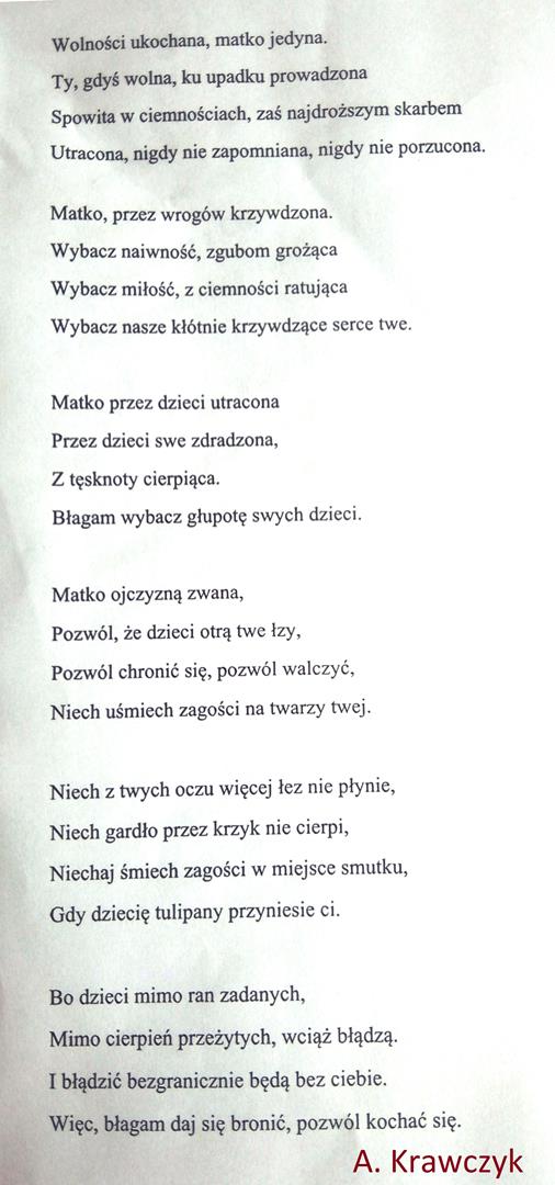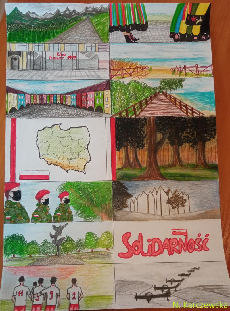 Znamy już wyniki konkursu literacko-plastycznego „Polska – ojczyzna, jaką noszę w sercu”. Wzięło w nim udział 10 uczniów – w bibliotece szkolnej złożonych zostało 6 prac plastycznych i 4 literackie (3 wiersze i 1 opowiadanie). Dwie niezależne komisje (nauczycieli oraz uczniów) wybrały… te same zwycięskie prace! Obie zostaną wysłane do publikacji książkowej, wraz z wizerunkiem i danymi osobowymi autora. Gratulujemy zwyciężczyniom – Natalii Karczewskiej z kl. 3HTD oraz Aleksandrze Jasiak z kl. 4L4, a wszystkim uczestnikom – dziękujemy za udział w konkursie.