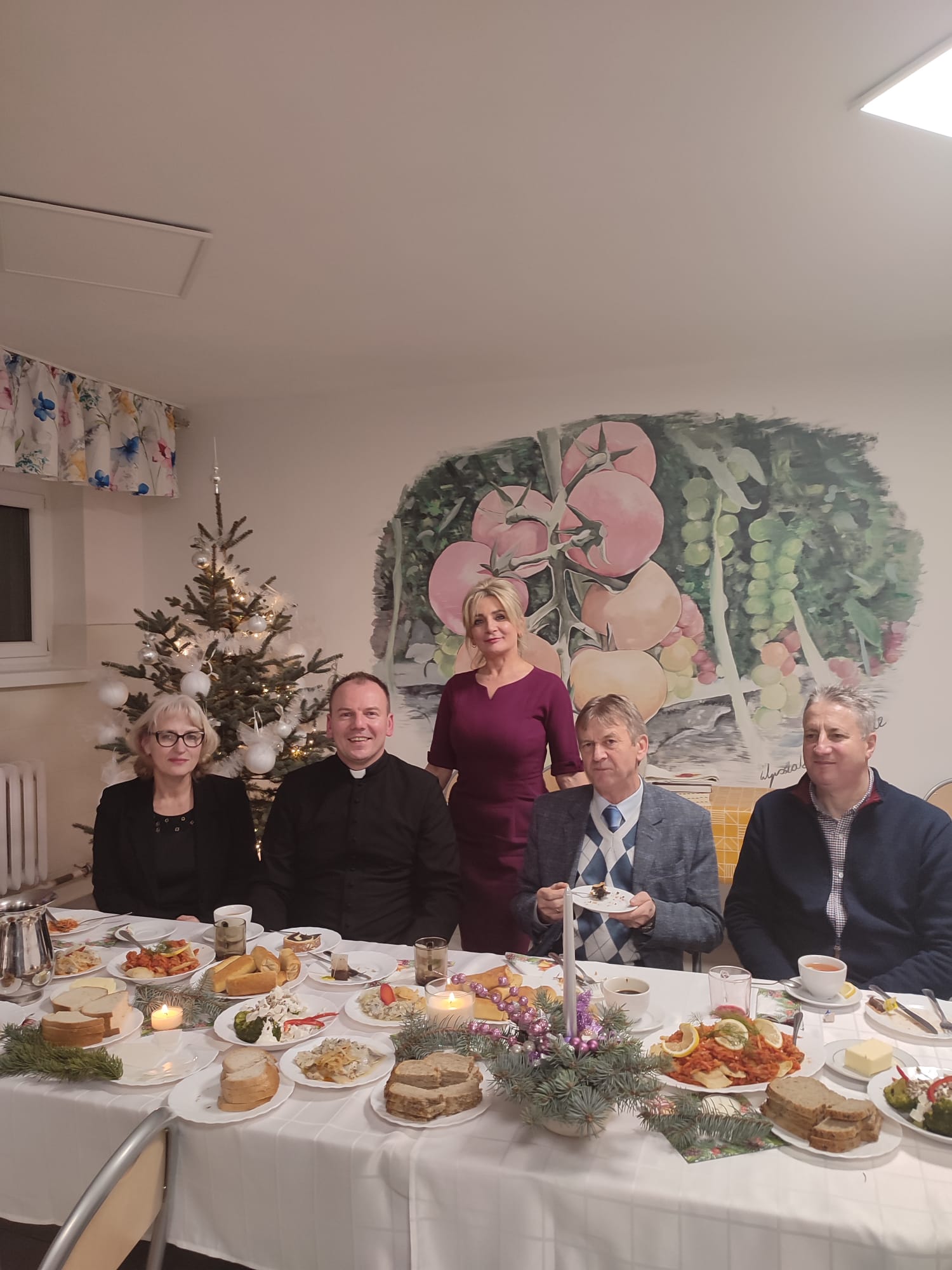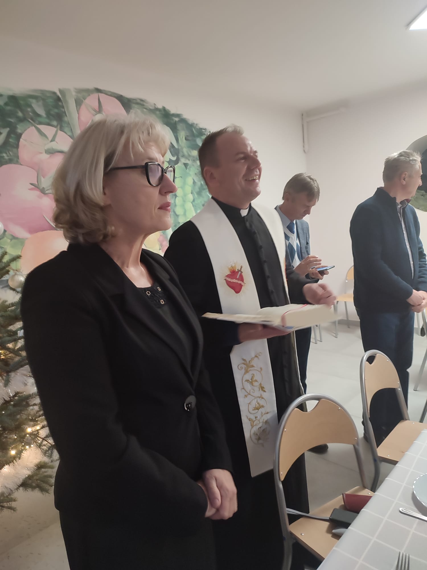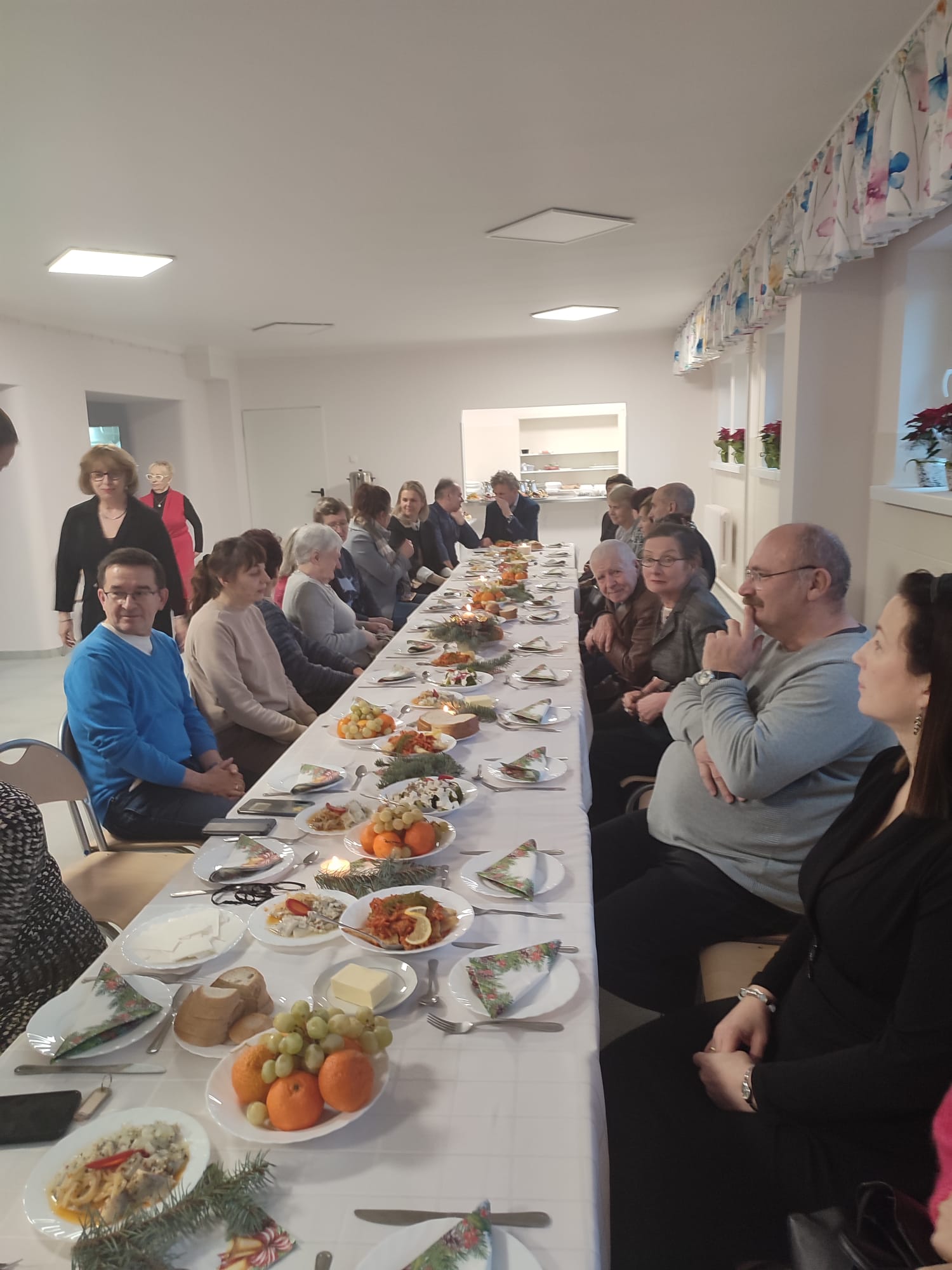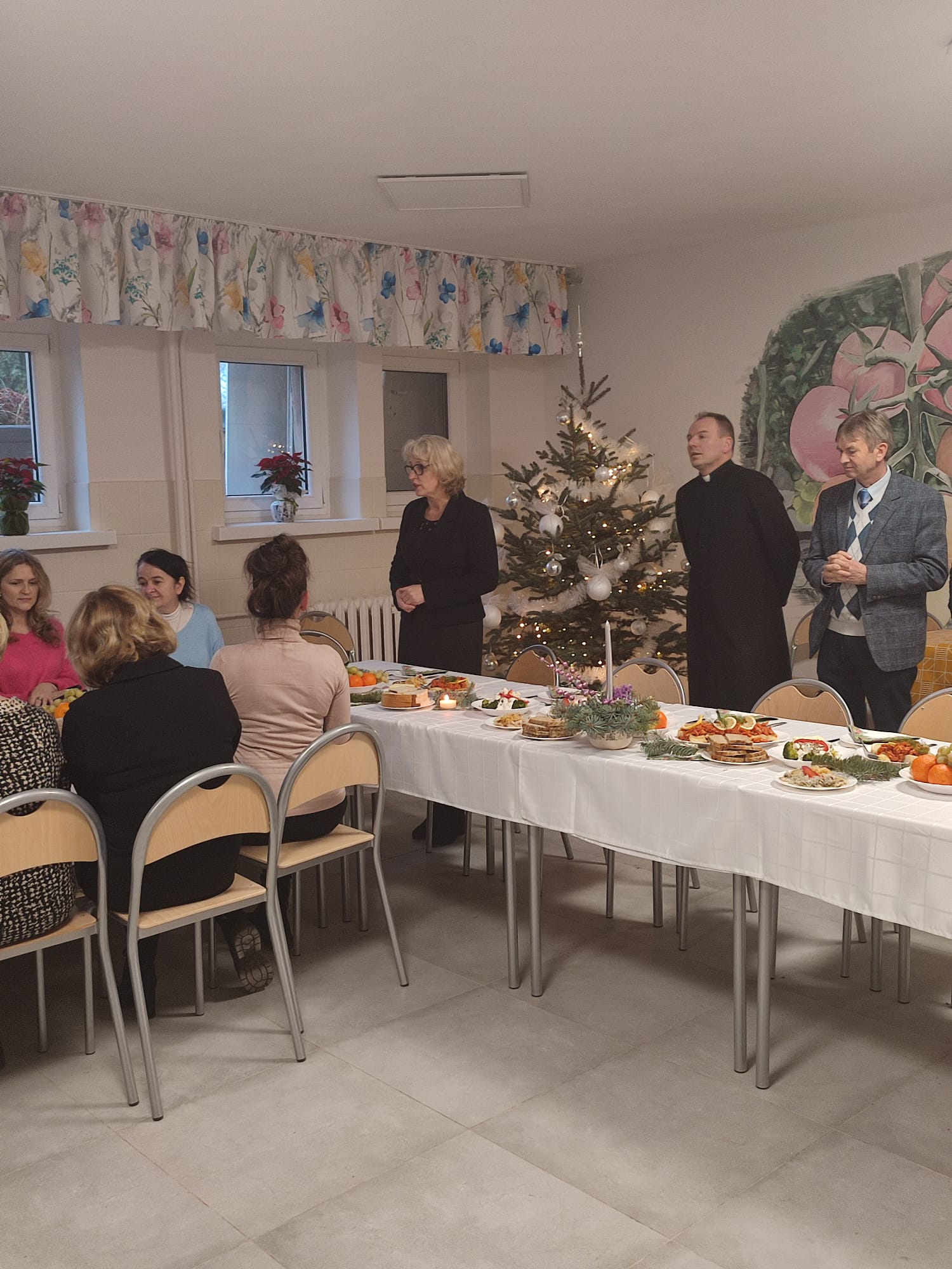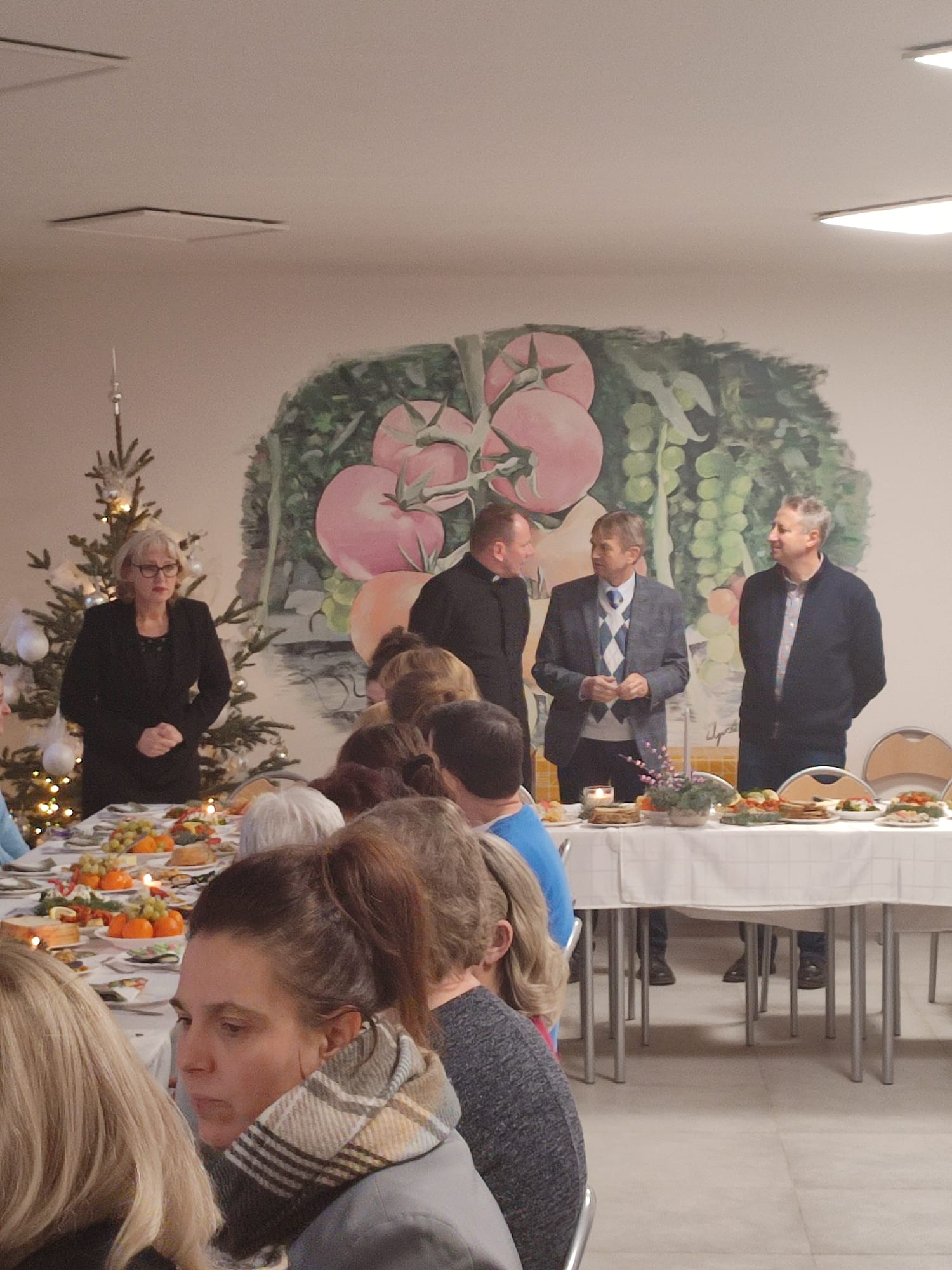 Wszystkich zgromadzonych powitała Pani Dyrektor Jolanta Kawszyn, która złożyła świąteczne życzenia i poprosiła księdza Wojciecha o modlitwę. Tradycyjna wigilia rozpoczęła się od łamania opłatkiem i serdecznych życzeń, a następnie zasiedliśmy do pięknie udekorowanego stołu, aby skosztować tradycyjnych wigilijnych potraw.
