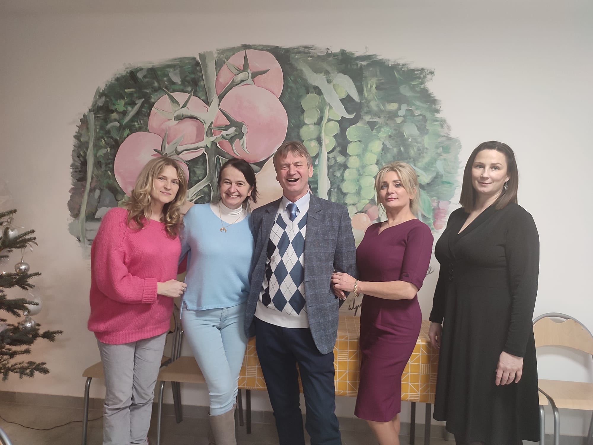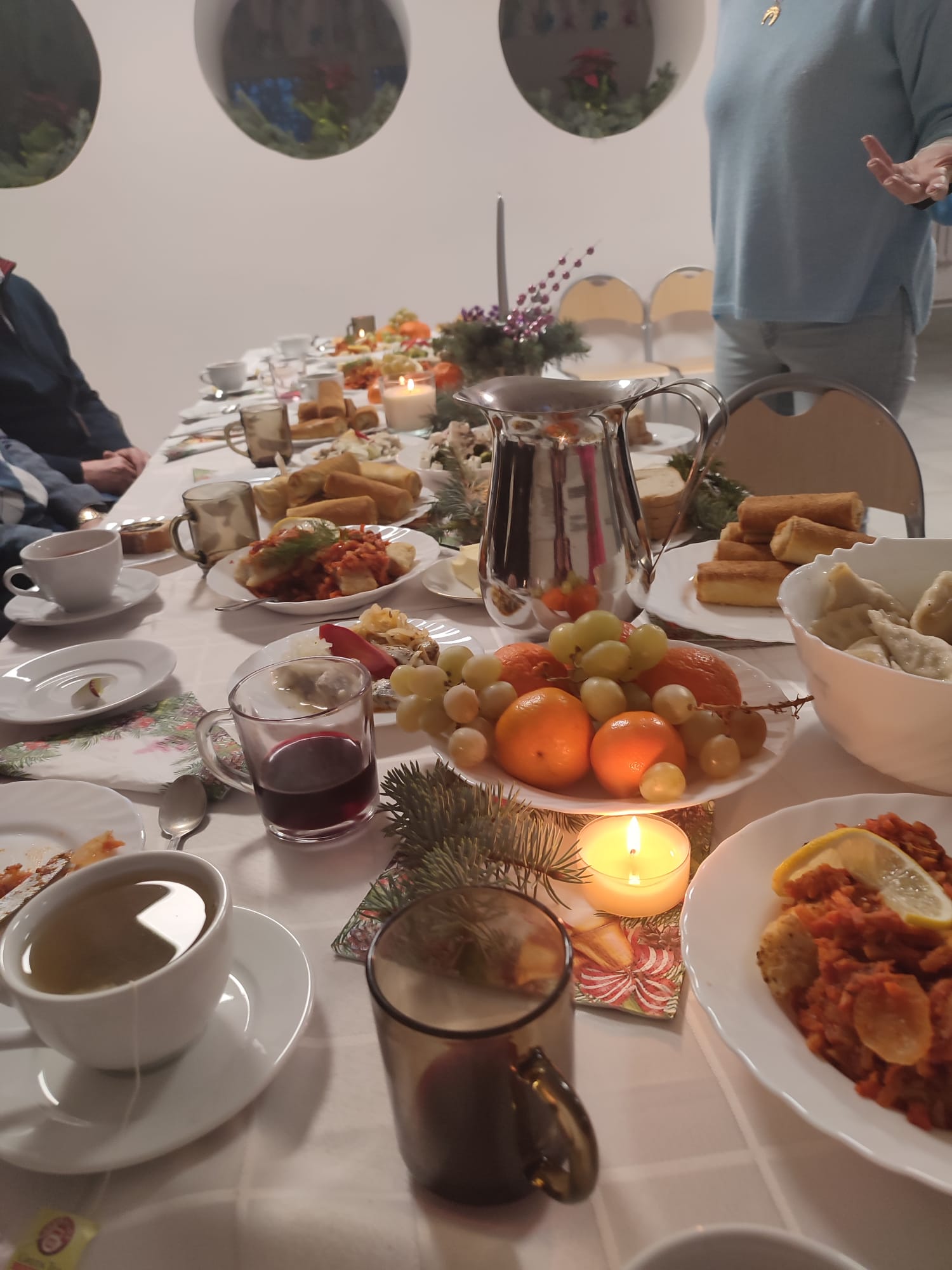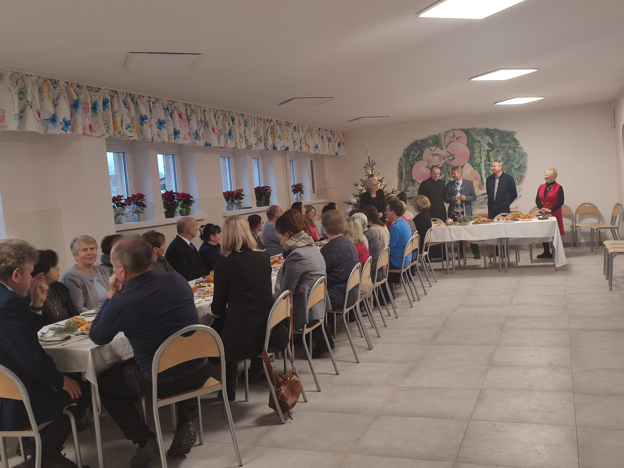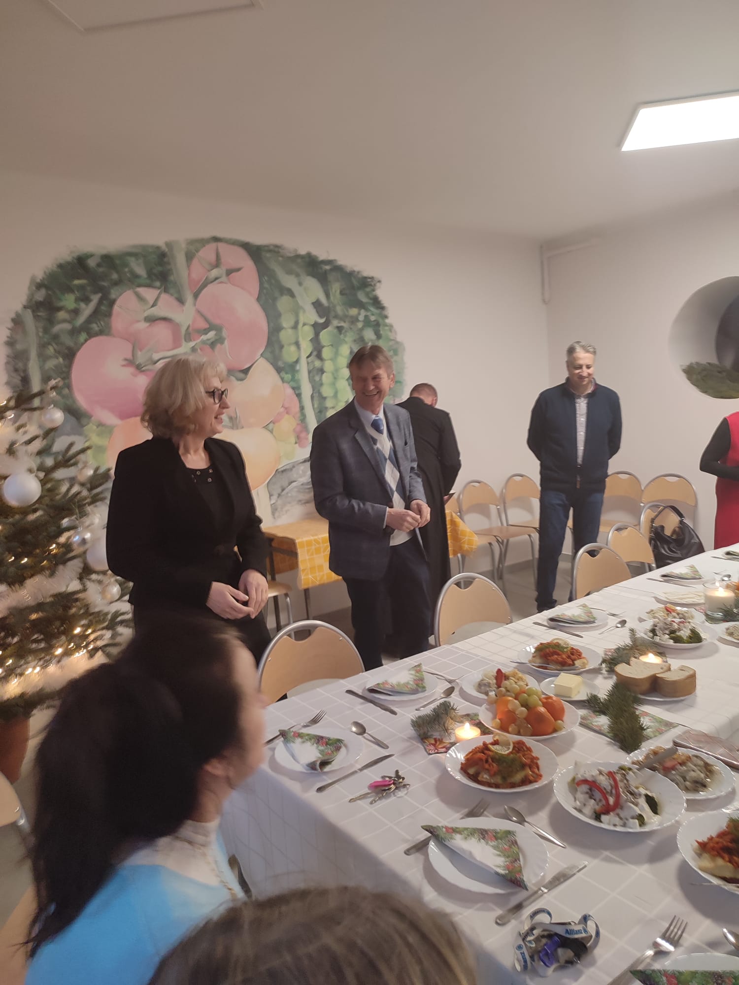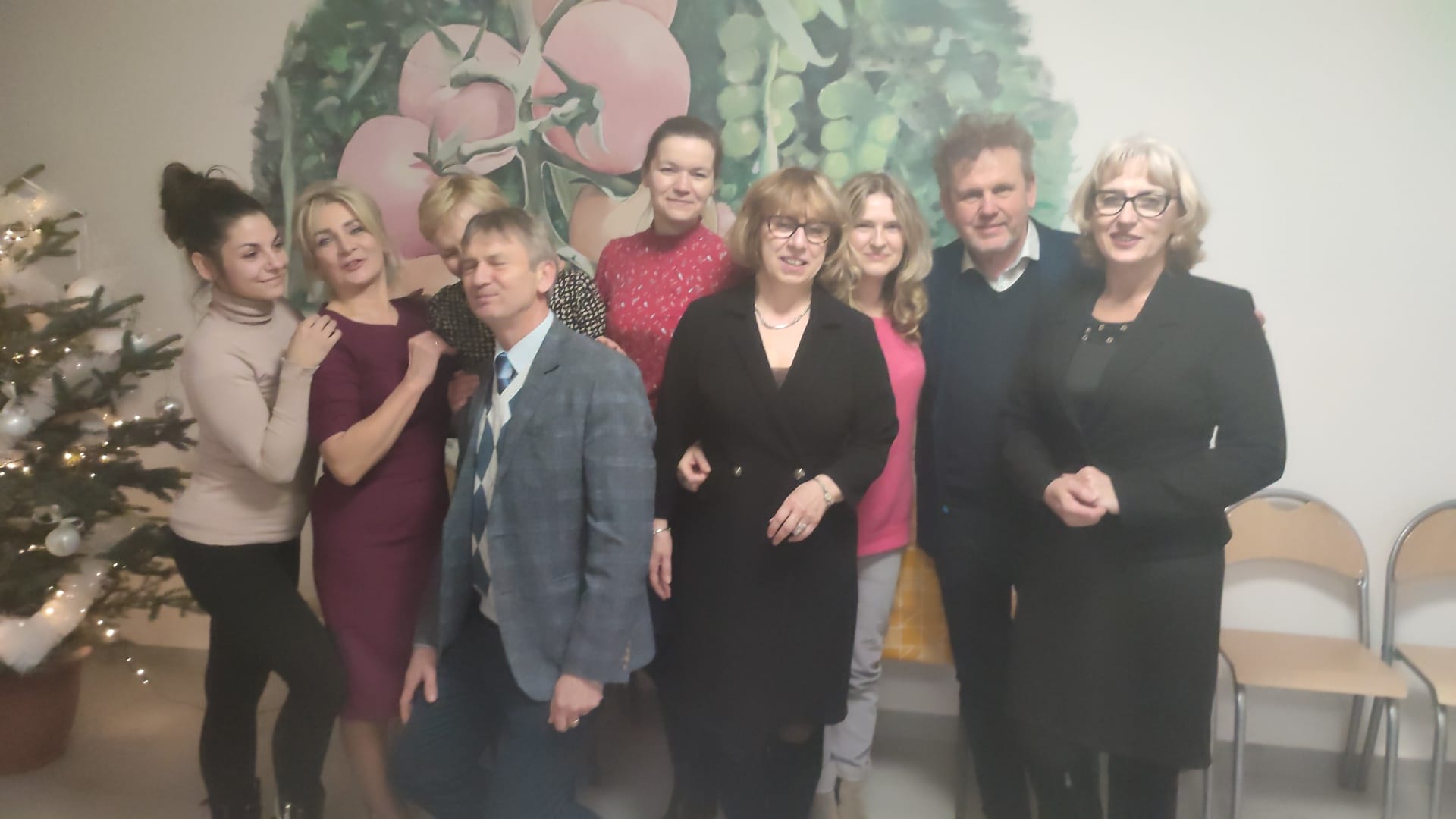 Wszystkich zgromadzonych powitała Pani Dyrektor Jolanta Kawszyn, która złożyła świąteczne życzenia i poprosiła księdza Wojciecha o modlitwę. Tradycyjna wigilia rozpoczęła się od łamania opłatkiem i serdecznych życzeń, a następnie zasiedliśmy do pięknie udekorowanego stołu, aby skosztować tradycyjnych wigilijnych potraw.