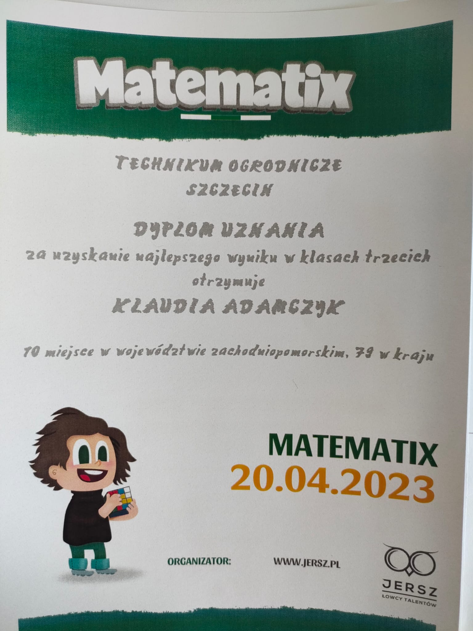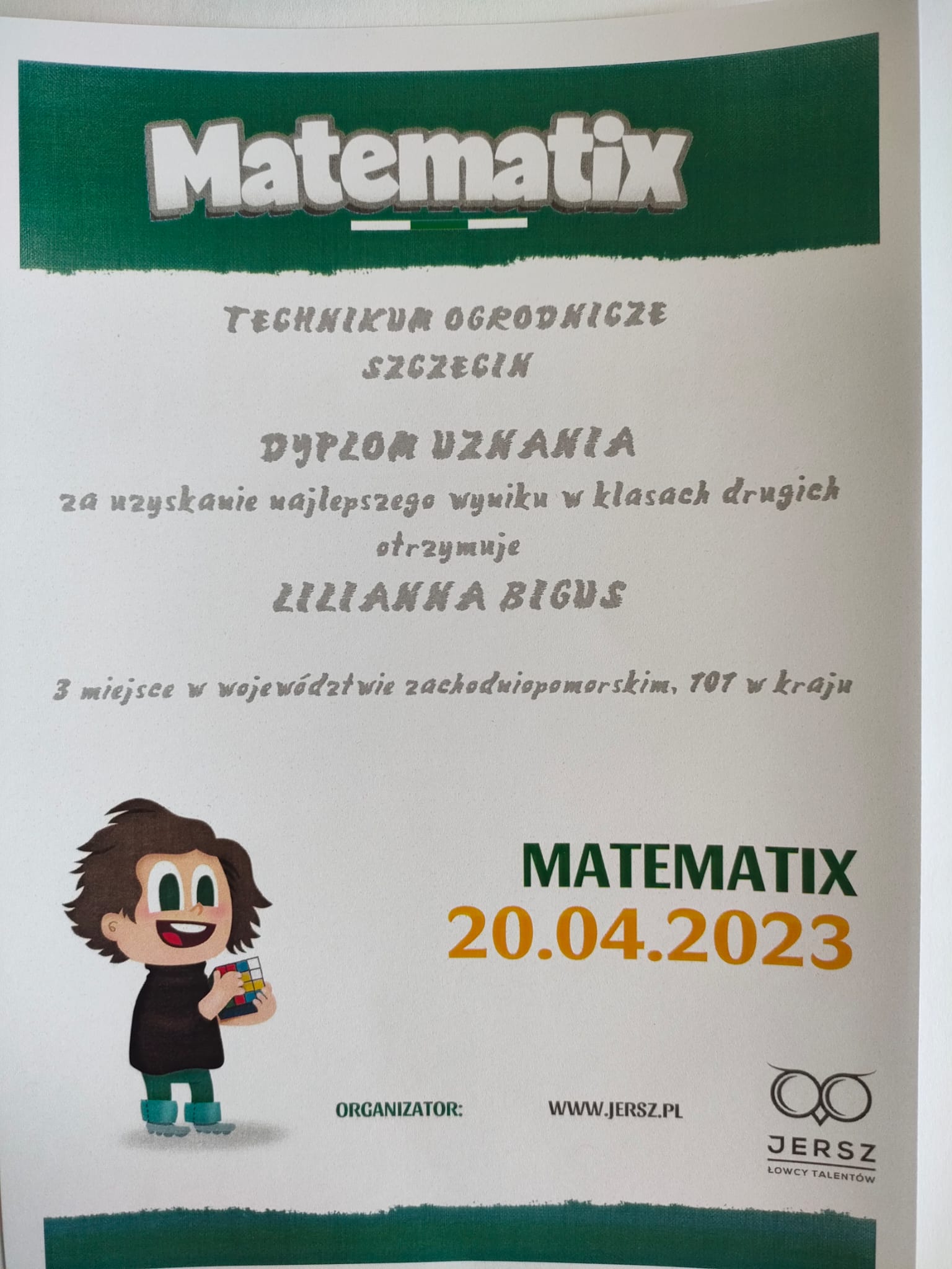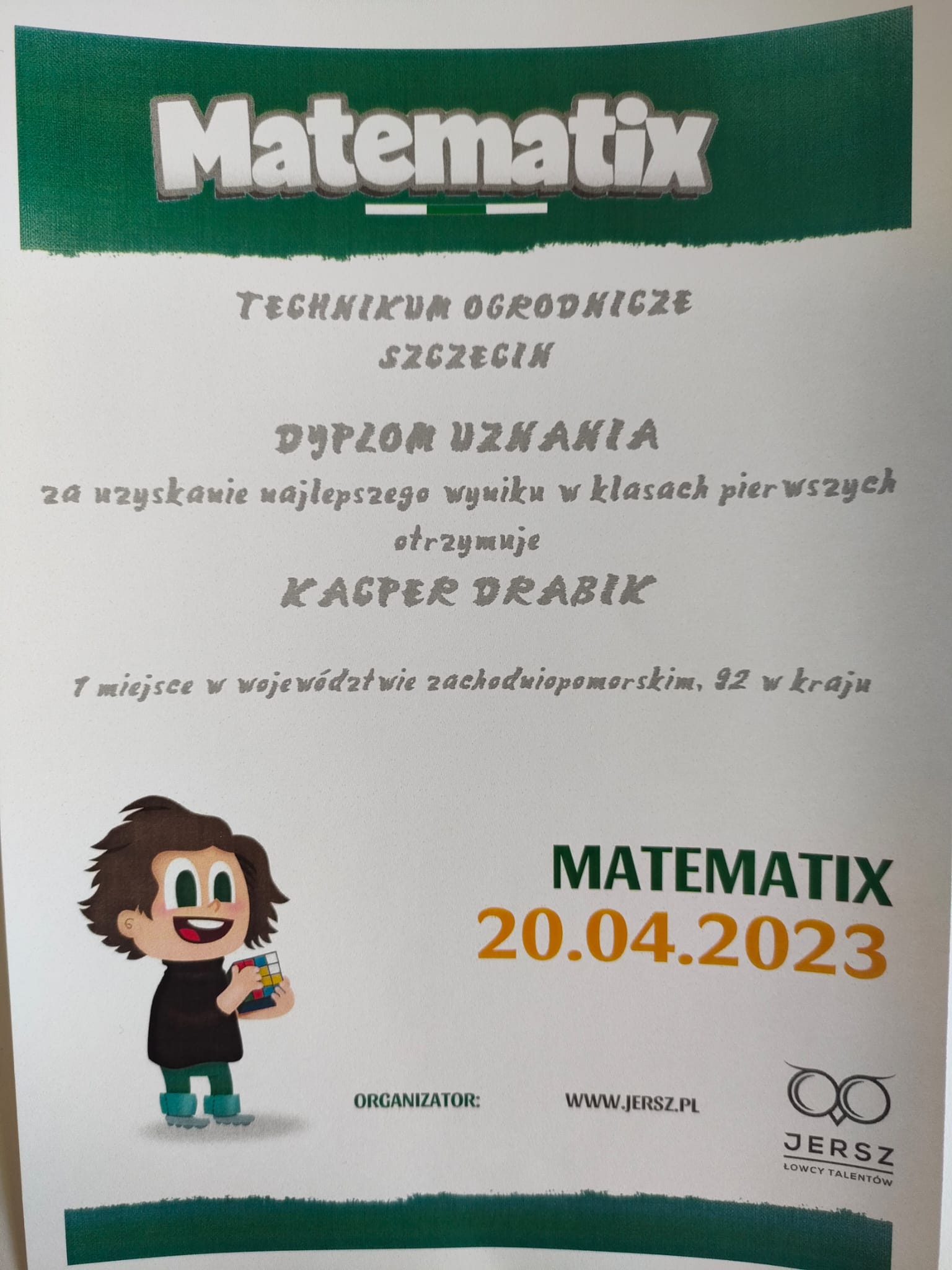 Dnia 20 kwietnia 2023 uczniowie naszej szkoły wzięli udział w Ogólnopolskim Konkursie Matematycznym MATEMATIX. W całej Polsce wyłoniono 50 laureatów spośród 2,6 tysiąca uczestników. Miło nam pochwalić się sukcesami naszych uczniów, którzy zajęli bardzo dobre lokaty na poziomie naszego województwa. Gratulujemy!!!