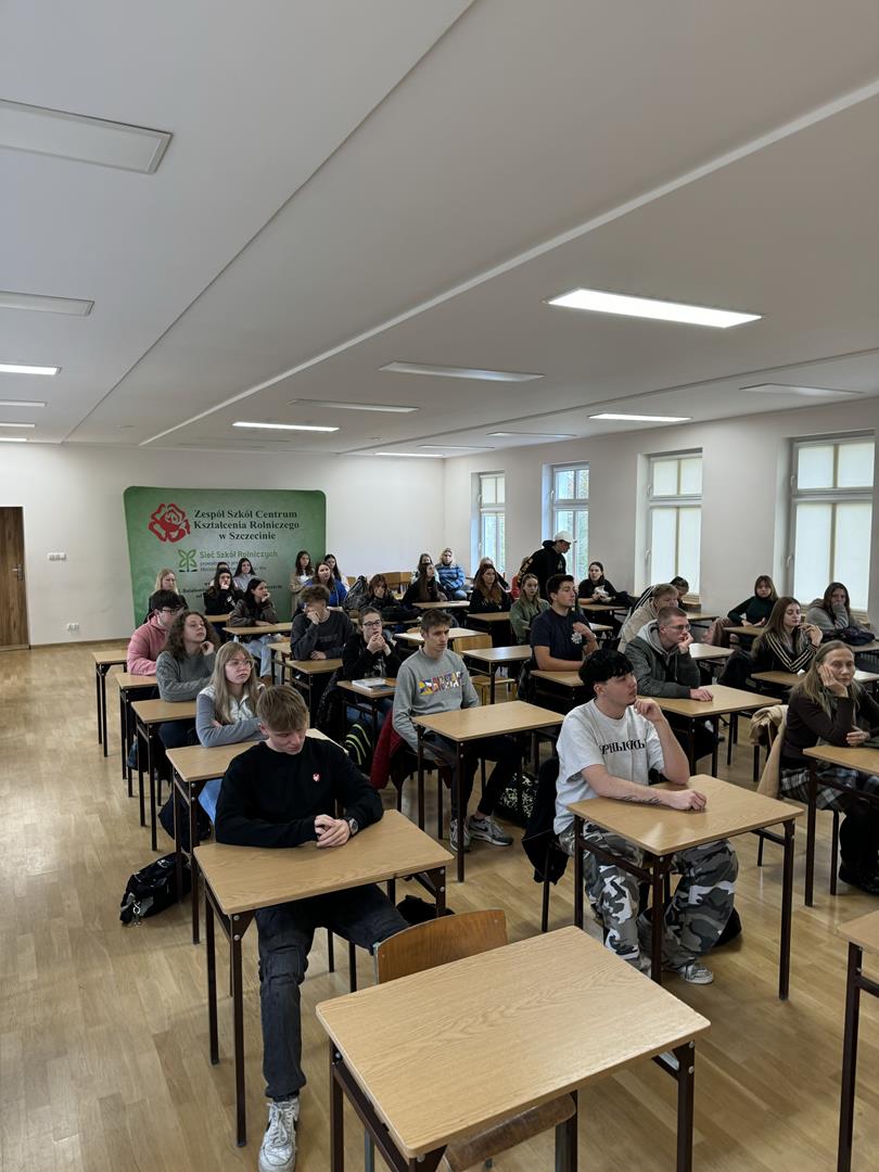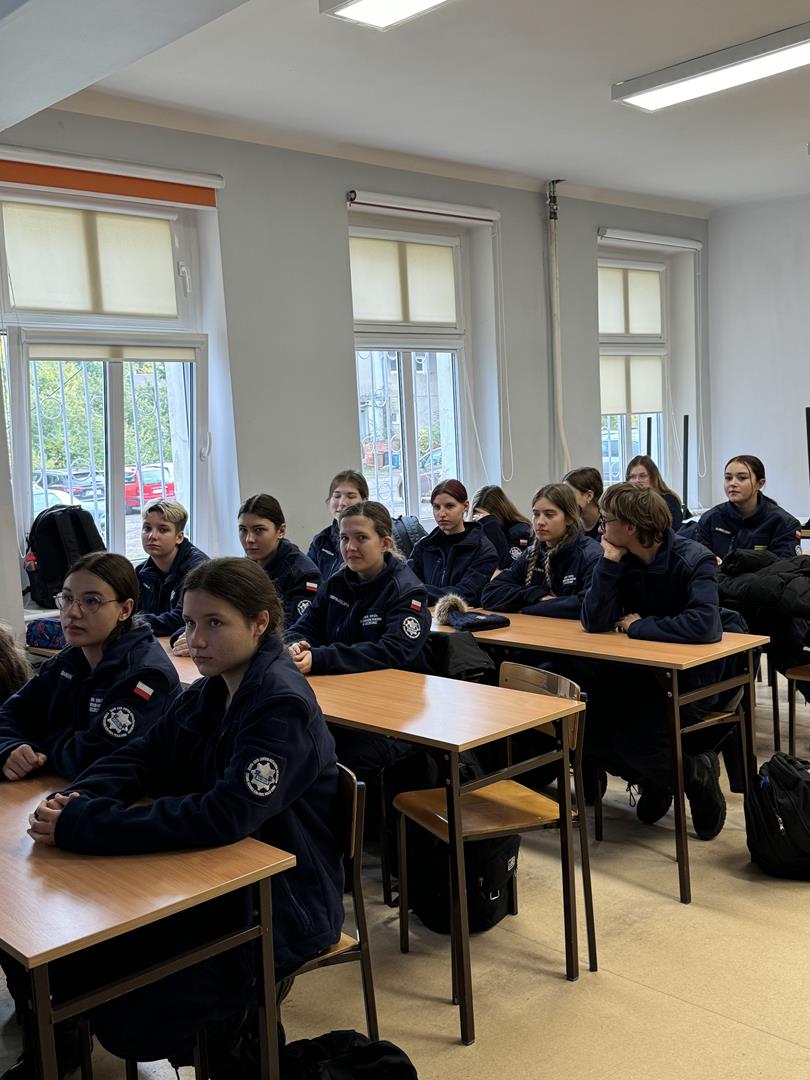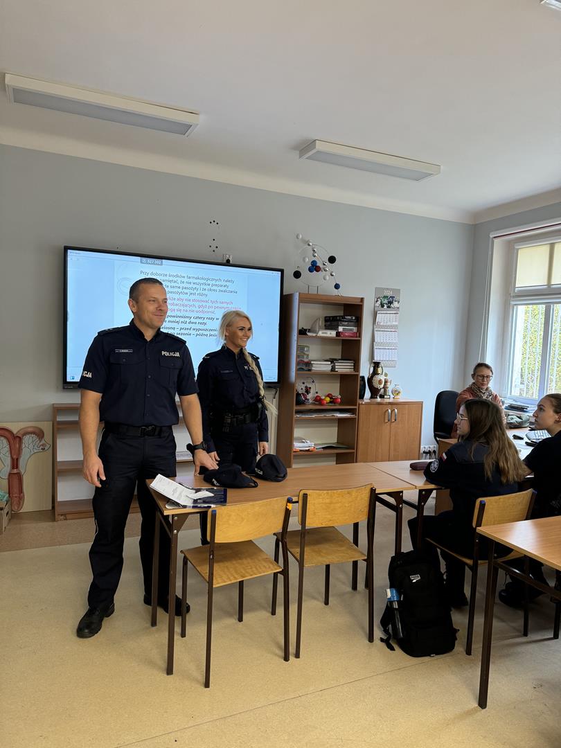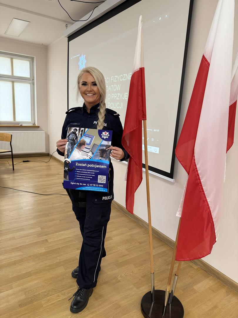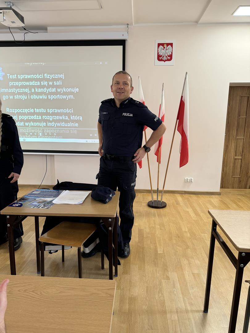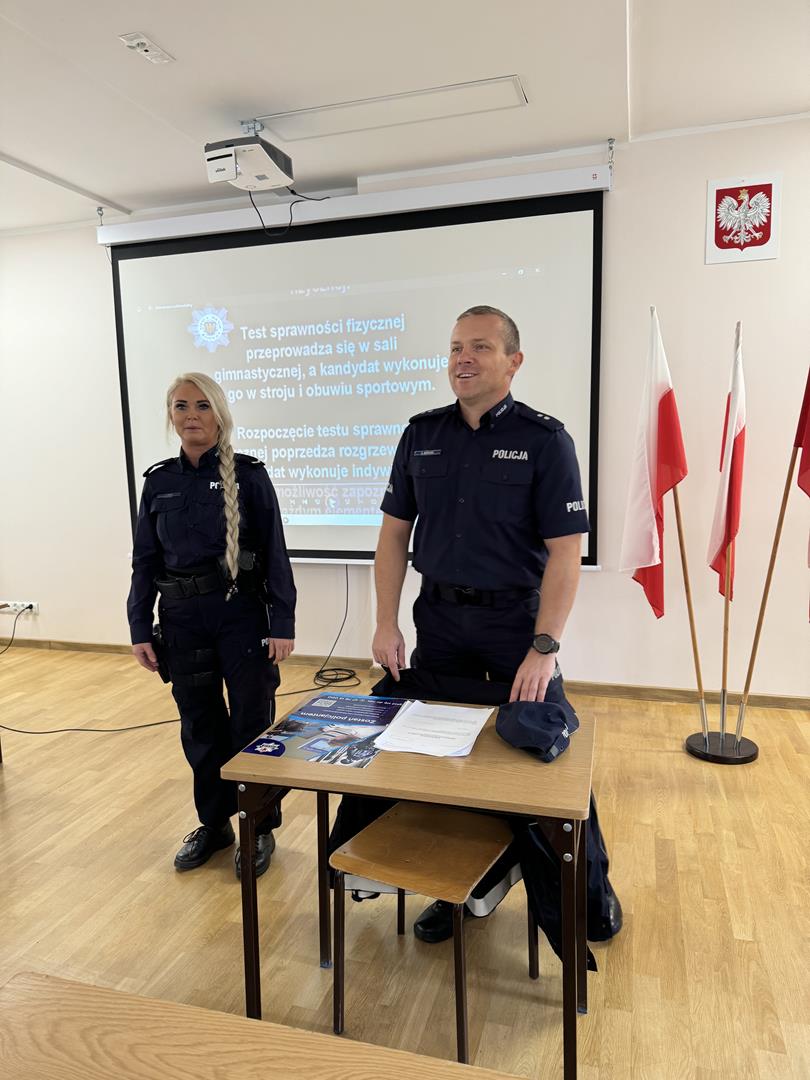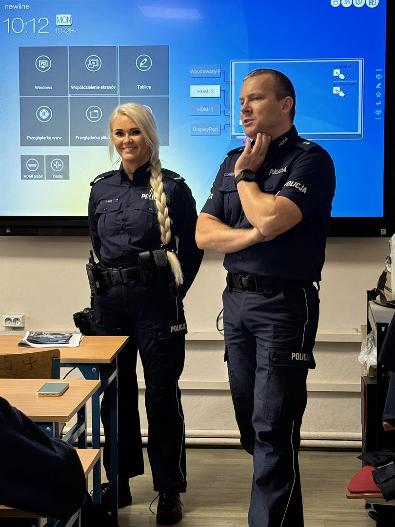 W dniu 28 października naszą szkołę odwiedził z-ca Komendanta Policji Szczecin – Dąbie podkom. Zbigniew Marasz z sierż. Leną Guzik. Wizyta miała na celu rozwianie wątpliwości uczniów dotyczących pracy w służbach mundurowych oraz dostarczenie im wiedzy na temat procedur doboru. Przyszli absolwenci mieli okazję bliżej poznać tajniki pracy policjanta, a Pani sierżant szczegółowo omówiła zarówno procedury rekrutacyjne, jak i aspekty związane z codzienną służbą. Spotkanie miało charakter otwarty, co pozwoliło na luźną wymianę myśli, zadawanie pytań i rozwiewanie ewentualnych obaw związanych z wyborem tej konkretnej ścieżki zawodowej. Zawód policjanta został przedstawiony jako nie tylko wymagający, ale także pełen wyzwań i satysfakcji. Funkcjonariuszka podkreślała różnorodność zadań, jakie mogą wykonywać, począwszy od patrolowania ulic, aż po udział w dochodzeniach czy pracy w jednostkach specjalnych. Warto również zaznaczyć, że służba w policji to nie tylko praca, ale również możliwość zaangażowania się w działalność społeczną i pomoc innym. Promocja zawodu policjanta wśród maturzystów ma na celu pokazanie, że to nie tylko praca, ale także misja i szansa na rozwijanie się w dynamicznym i odpowiedzialnym środowisku. Policjanci chcą, aby przyszli absolwenci postrzegali ich zawód jako atrakcyjną perspektywę rozwoju zawodowego. Sier. Lena Guzik dostarczyła naszym uczniom wiele cennych informacji i inspiracji do zastanowienia się nad wyborem kierunku zawodowego. Wartościowe spotkania takie jak to, pomagają kształtować przyszłość młodych ludzi. Być może kiedyś zobaczymy wielu z nich pełniących służbę na rzecz mieszkańców Szczecina.