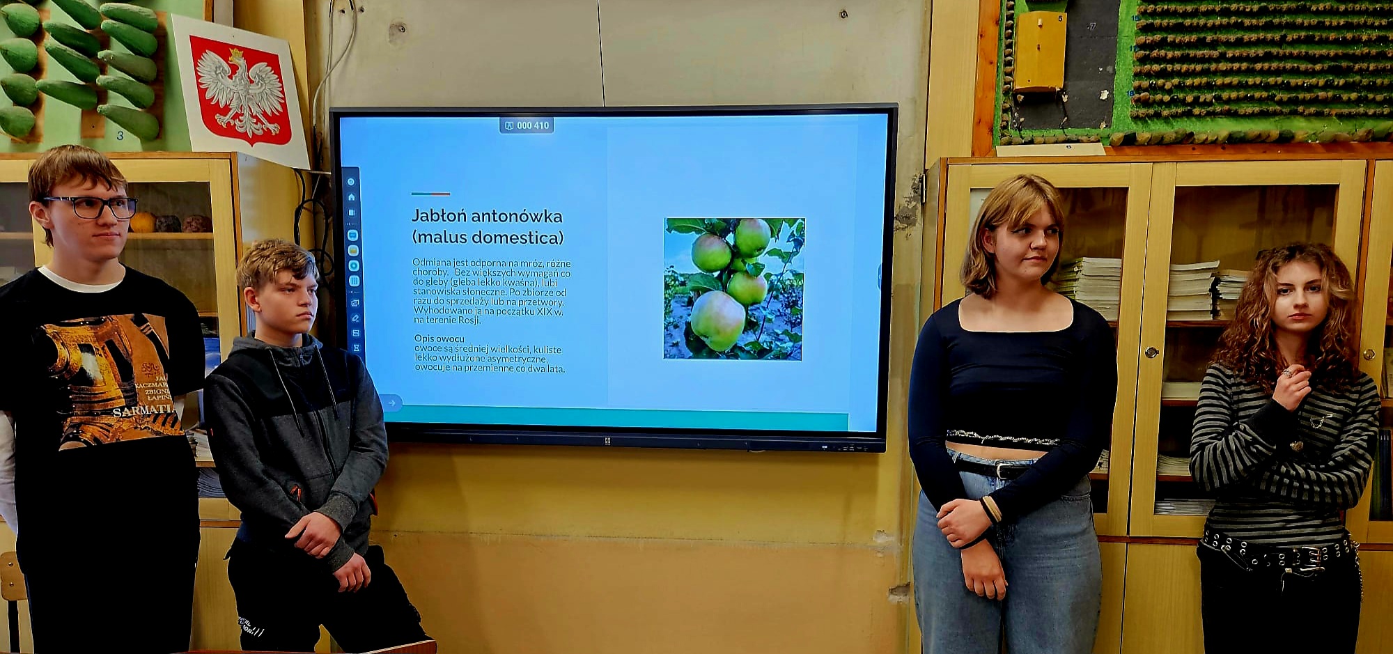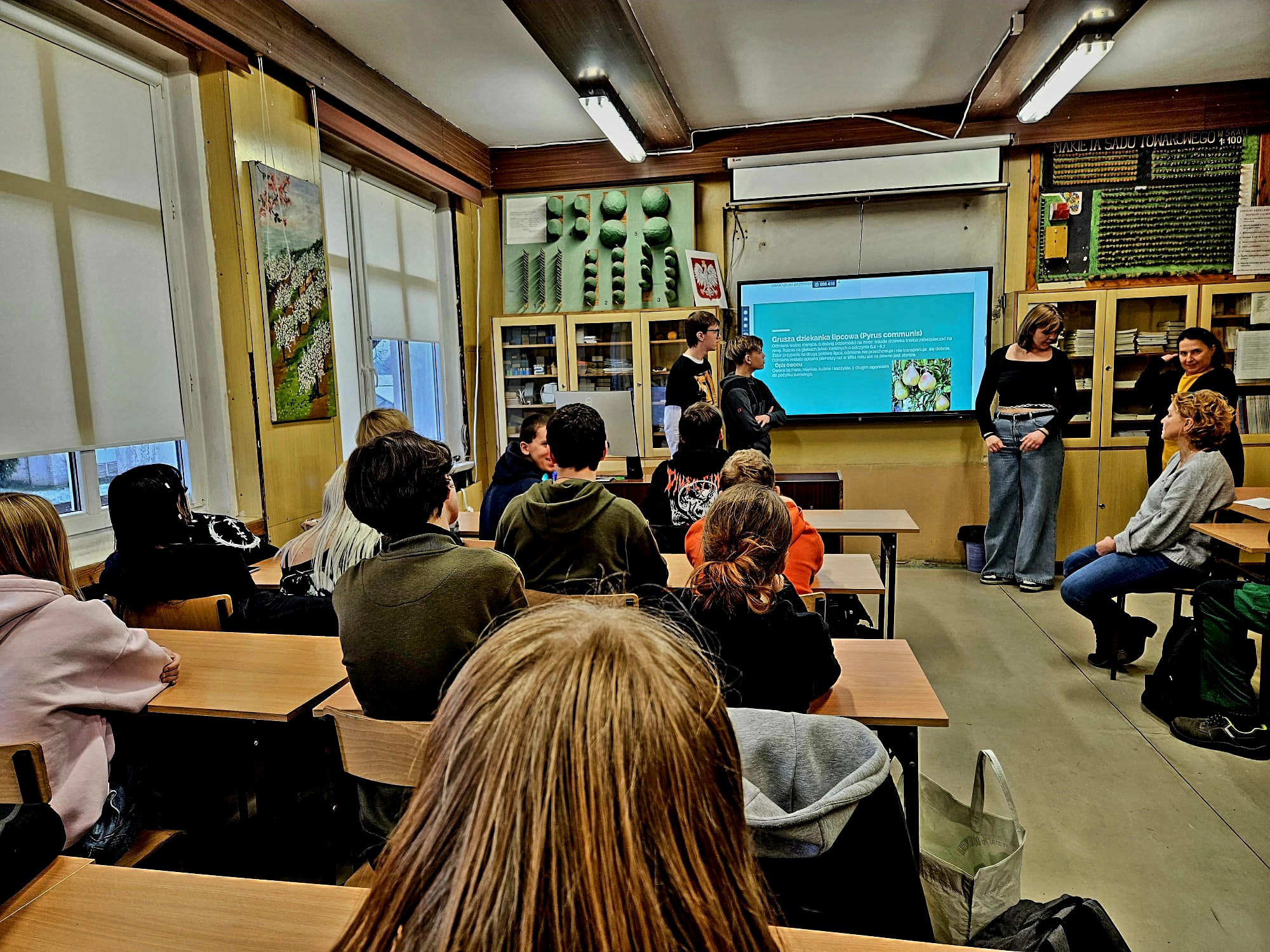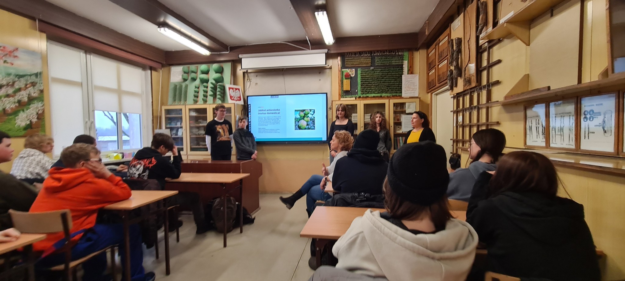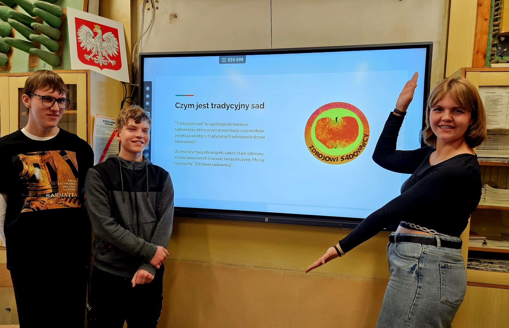 p. Adriana Płatek-Mąkosa. Uczniowie mieli okazję dowiedzieć się o konkursie oraz zaletach tradycyjnych sadów. Zdrojowi sadownicy przedstawili poszczególne odmiany drzew oraz opowiadali o etapach realizacji projektu.