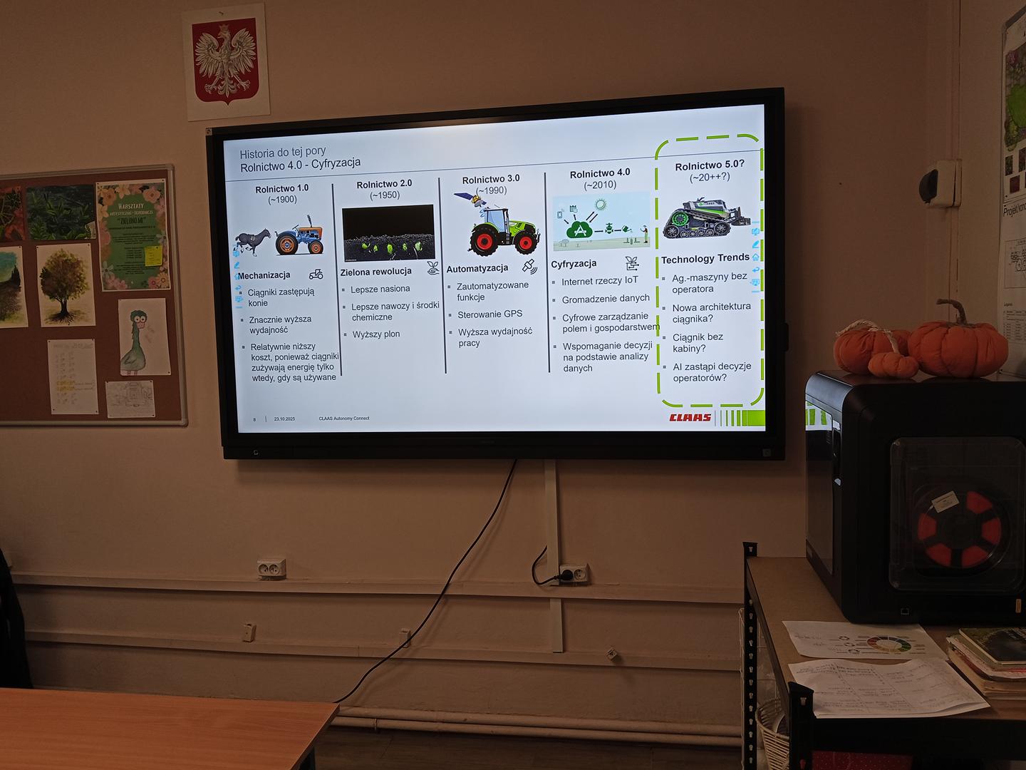 W dniu 23 października 2025 roku odbyło się spotkanie uczniów naszej szkoły z Panem Łukaszem Nalewajko przedstawicielem firmy ULENBERG Pyrzyce – kierownikiem ds. Rolnictwa Precyzyjnego. Spotkanie miało charakter dydaktyczny i szkoleniowy. Wiodącym tematem były trendy i wyzwania w rolnictwie precyzyjnym oraz autonomia w rolnictwie. Cel główny takich spotkań to przekazanie uczniom doświadczenia i wiedzy praktycznej istotnej i niezbędnej w procesie kształcenia zawodowego. W spotkaniu udział wzięli uczniowie klasy 3BBEm kształcący się w zawodzie mechanik – operator pojazdów i maszyn rolniczych.