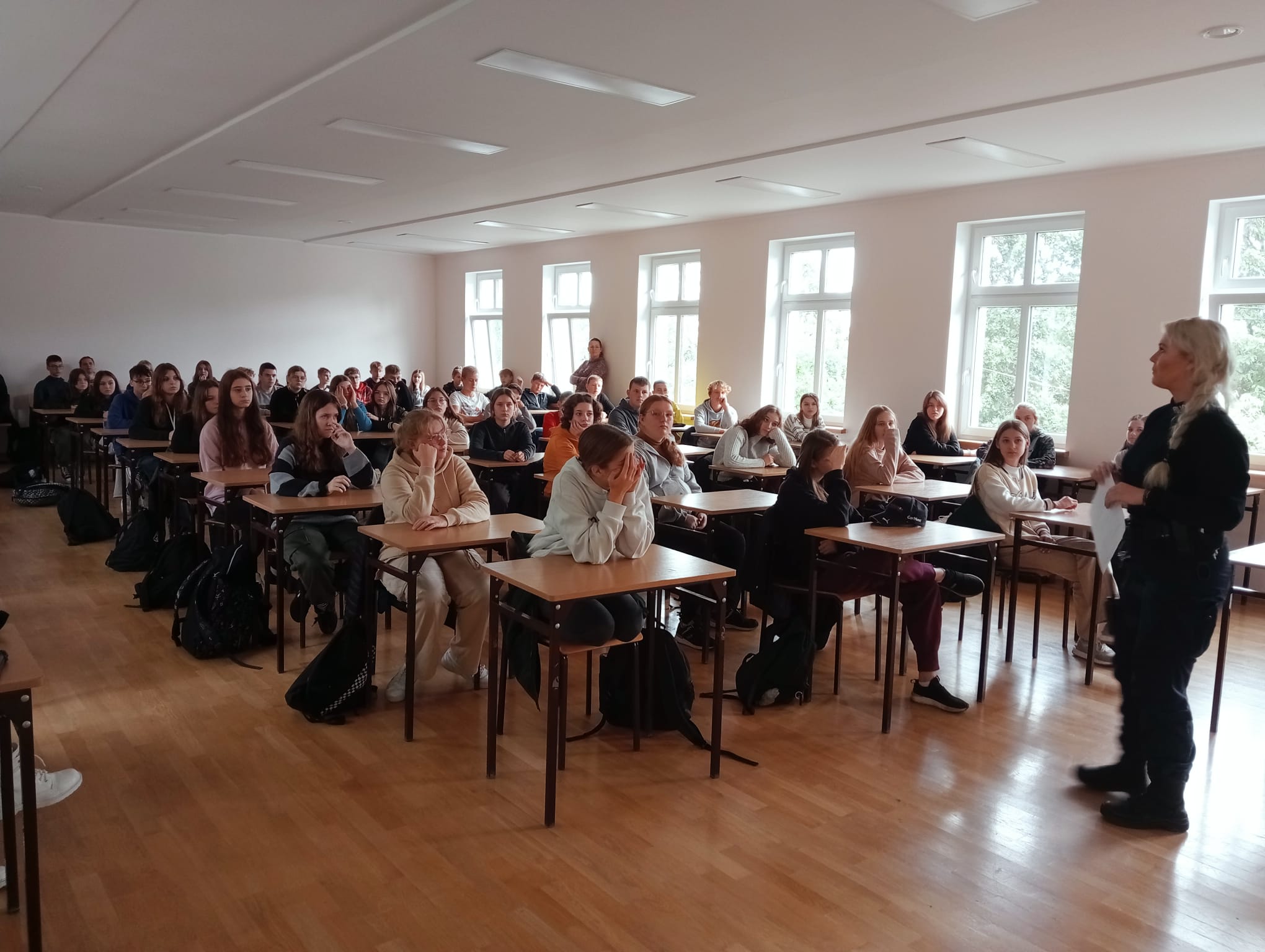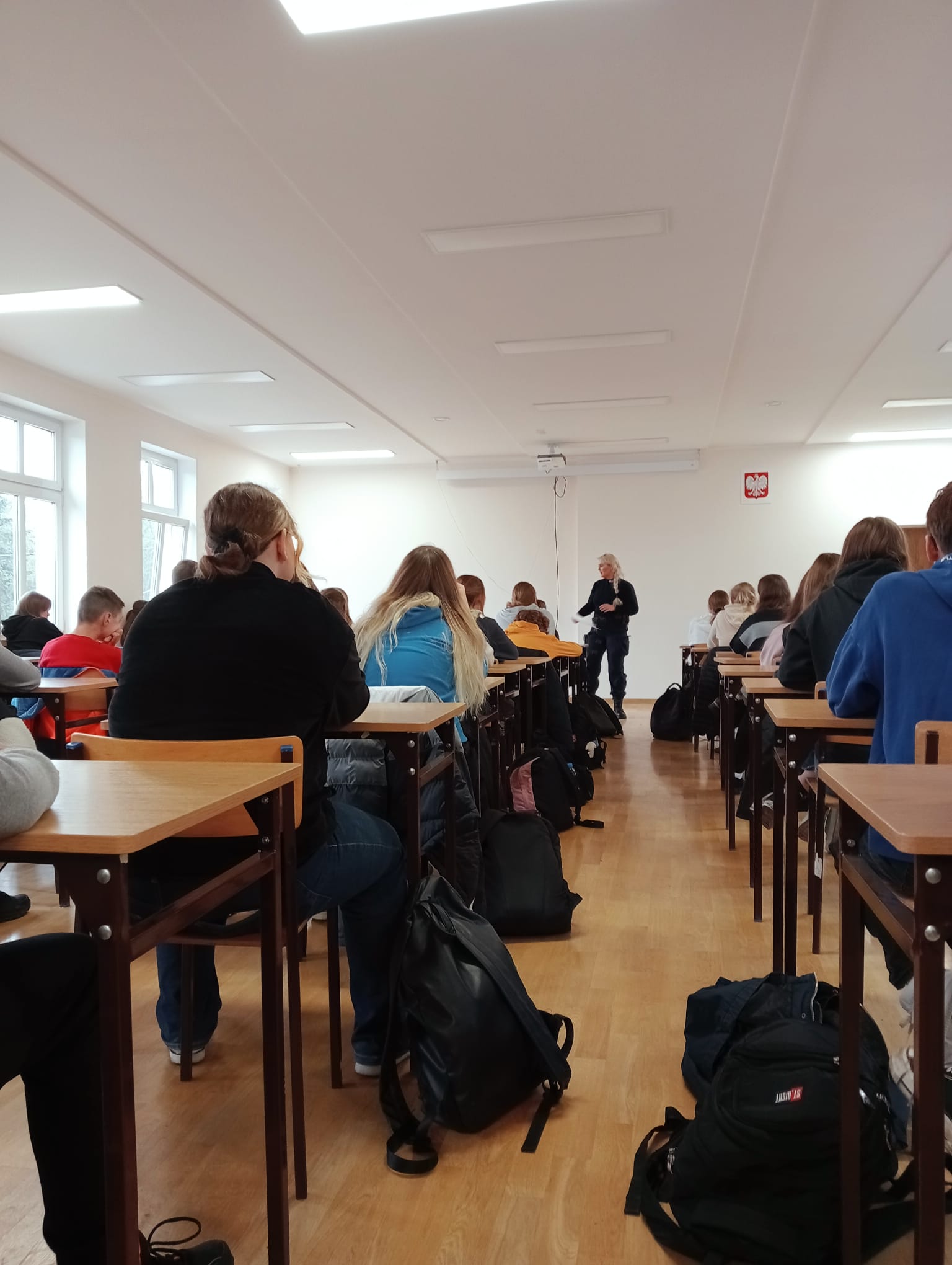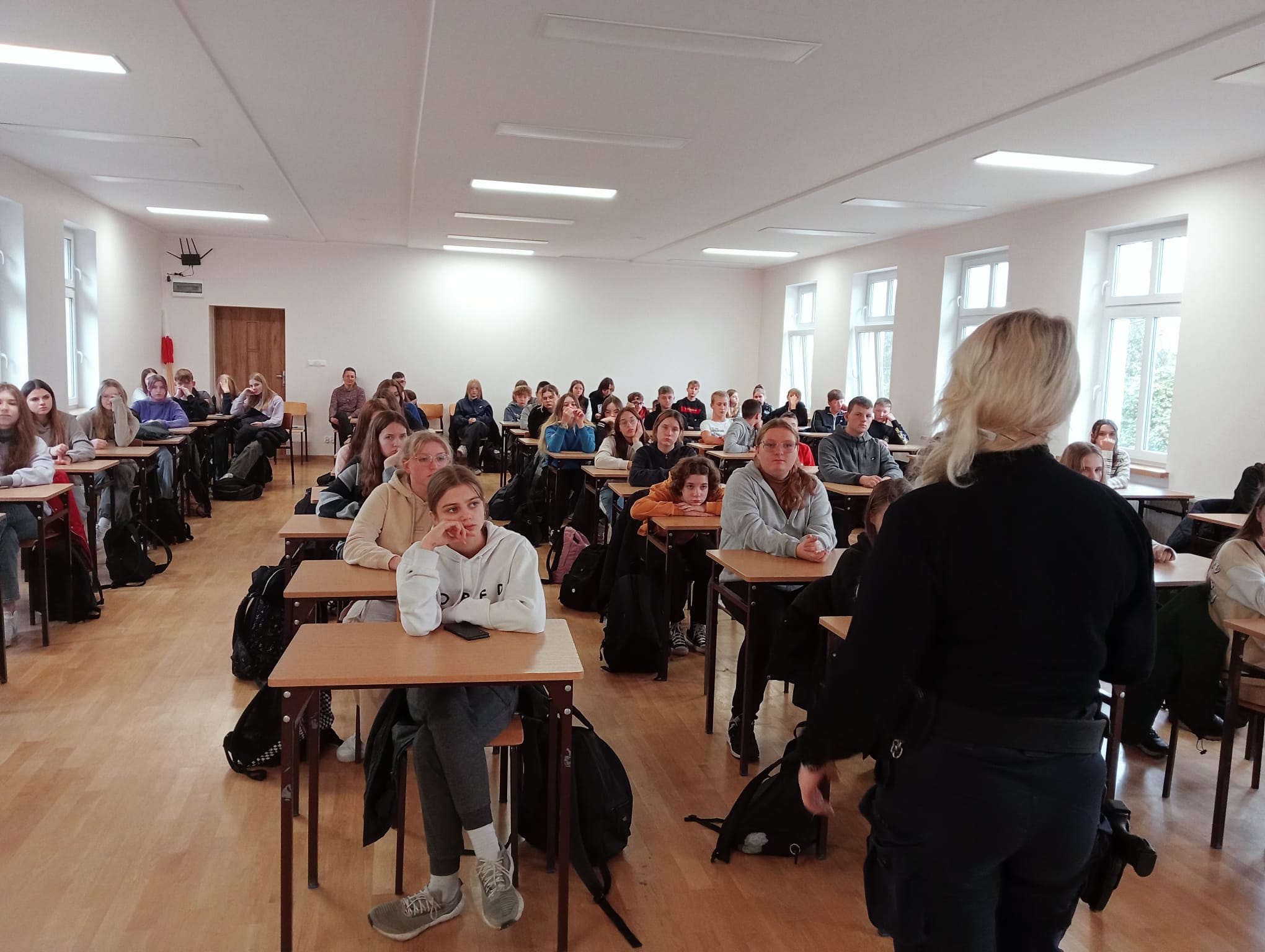 W dniu 24.10.2023 r. uczniowie klas pierwszych wysłuchali prelekcji na temat „zagrożeń wynikających z używania narkotyków i dopalaczy oraz środków odurzających w tym leków” zorganizowanych przez Policję. Spotkanie odbywało się w szkolnej auli w godzinach od 9:50 do 11:30.