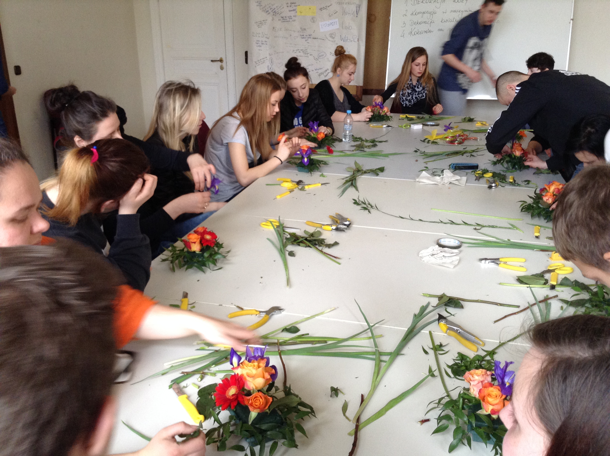 w Trebnitz. Otrzymaliśmy zaproszenie od Pani Beaty Rauch, koordynatorki projektów międzynarodowych dot. współpracy szkół przygranicznych, do poprowadzenia warsztatów florystycznych. Słuchacze Szkoły Policealnej – w ramach zajęć praktycznych – zaprezentowali swoje umiejętności florystyczne. Uczniowie z dwóch szkół z Polski i jednej szkoły z Niemiec w trakcie warsztatów zostali podzieleni na trzy zespoły. W czasie kiedy jedna grupa uczyła się języka, druga baristyki, trzecia – wykonywała kompozycje kwiatowe.