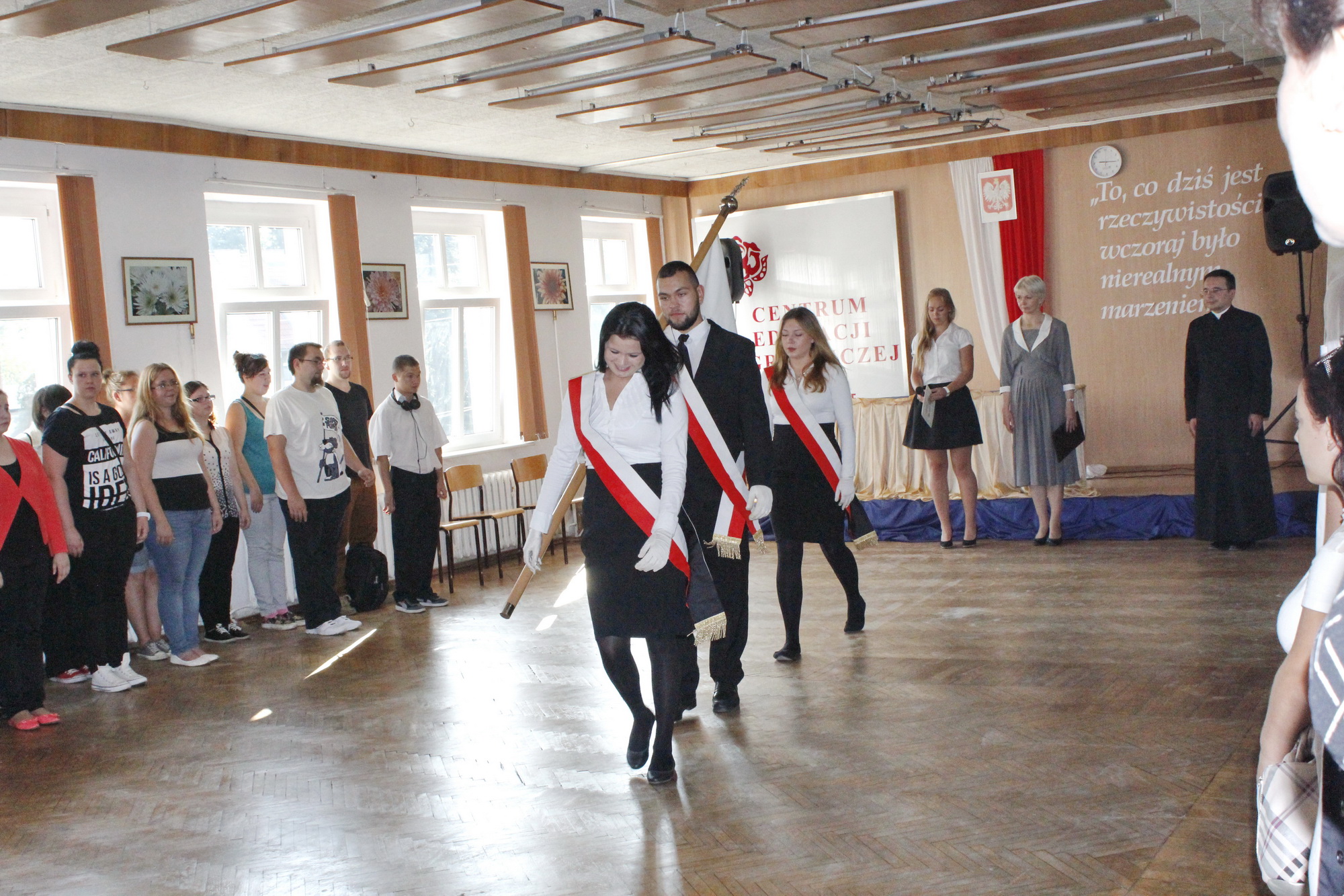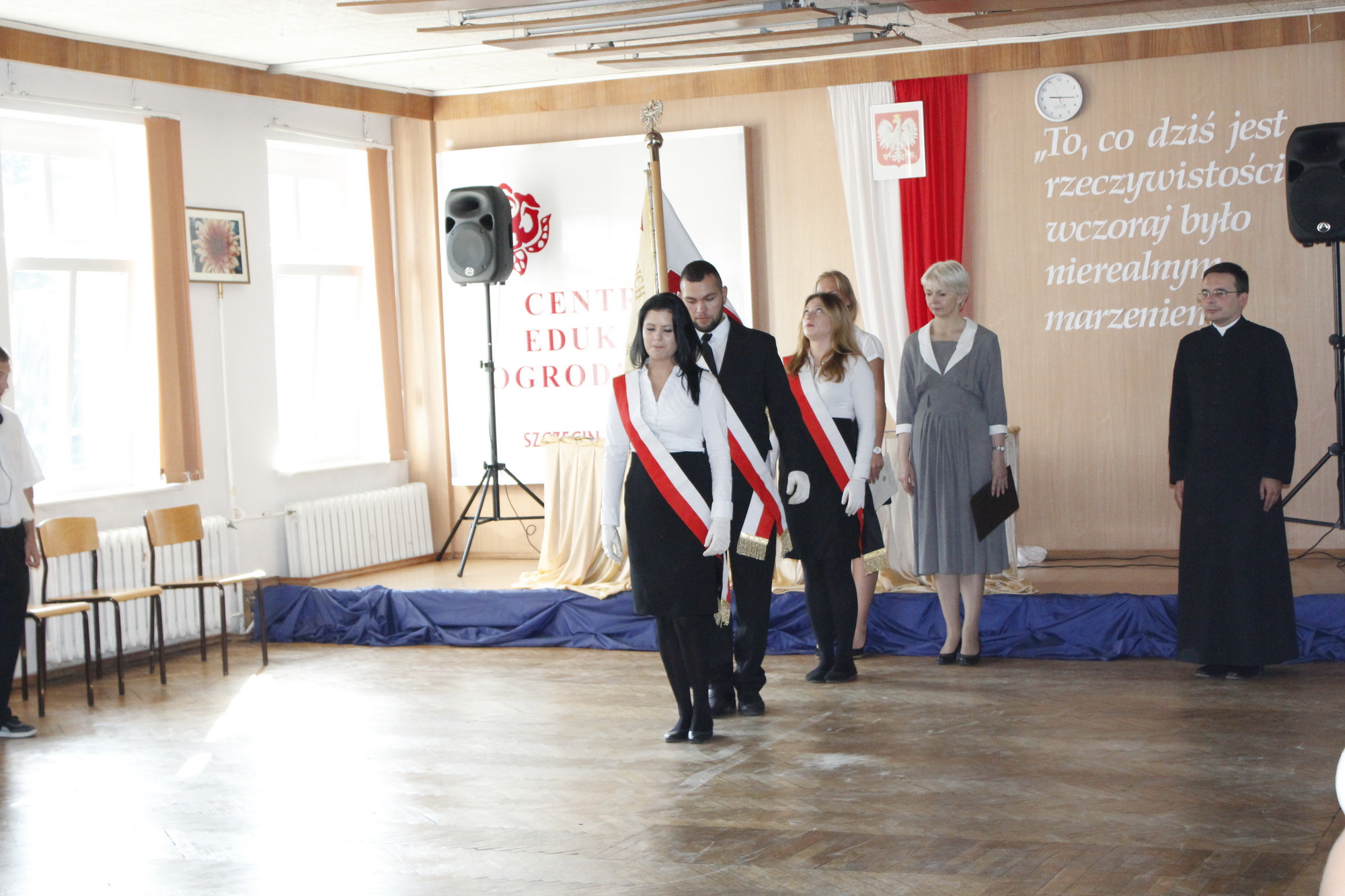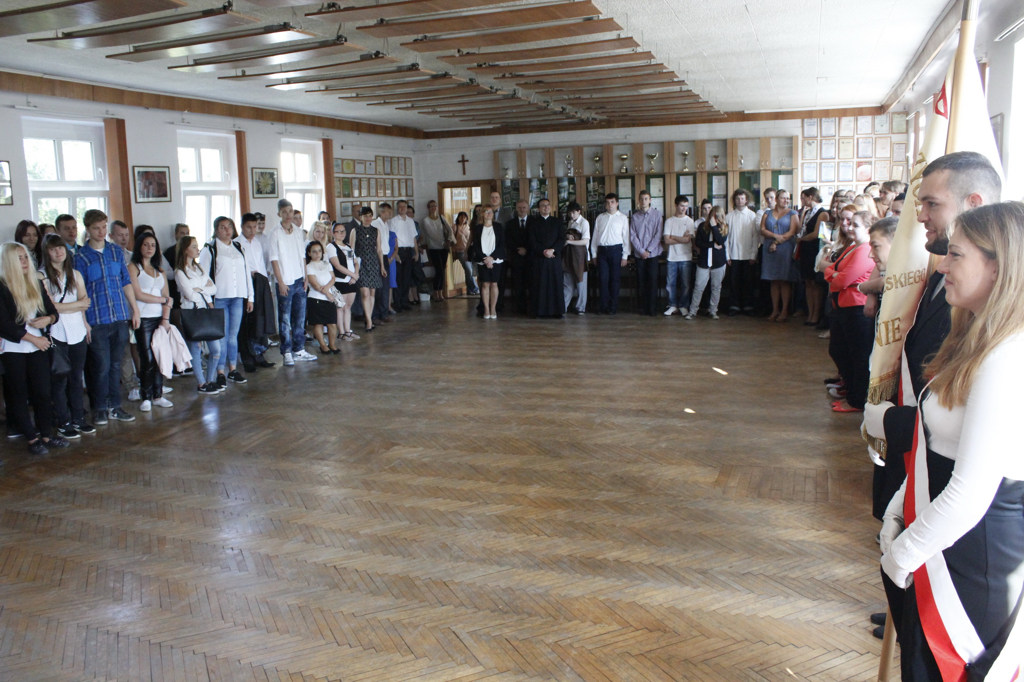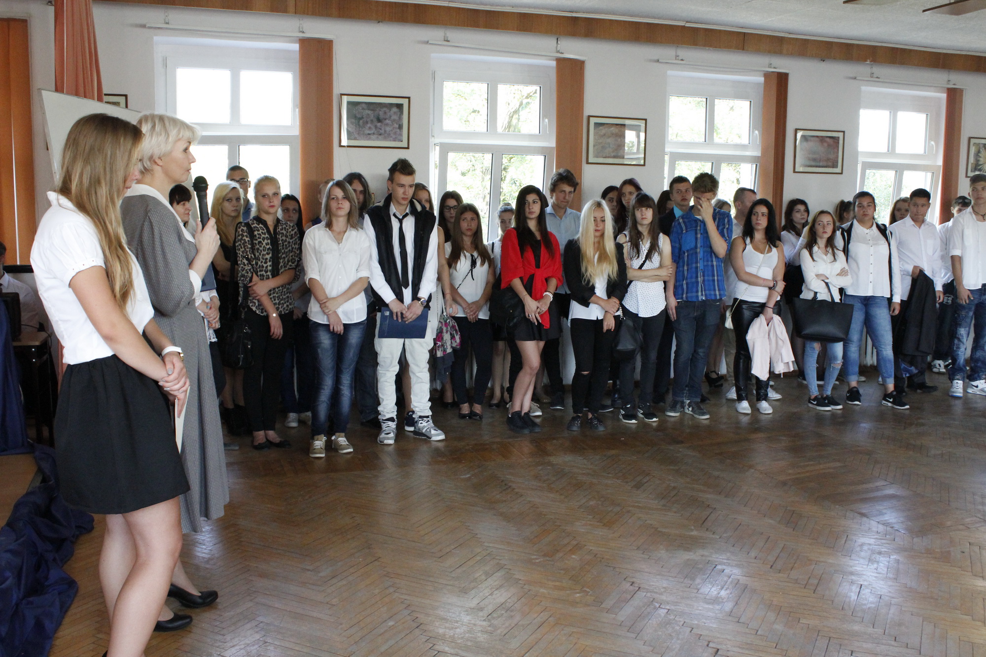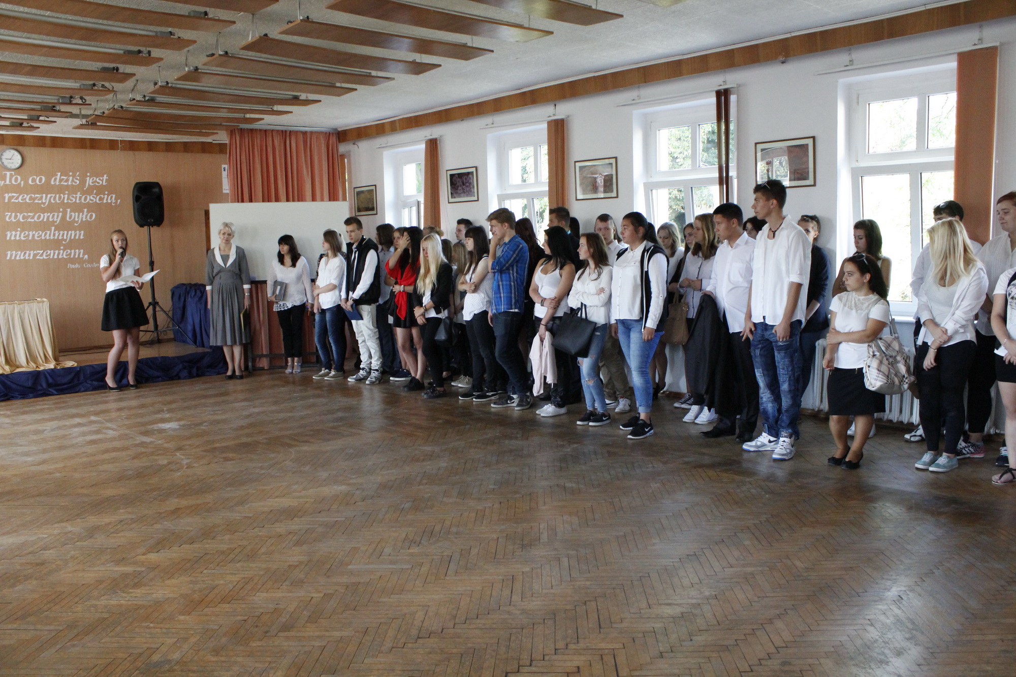 Pierwszy dzwonek – rozpoczynający nowy rok szkolny 2015/2016 – zabrzmiał (wyjątkowo) o godzinie 9.00. Pani dyrektor Lila Pławińska serdecznie powitała wszystkich przybyłych uczniów, rodziców i nauczycieli. Życzyła uczniom w nowym roku szkolnym dużo radości i przyjemności ze zdobywanej wiedzy. Niech to, czego nauczą Was wychowawcy, nauczyciele, pozostanie w Was na długo, niech kiełkuje i przyniesie owoc. Szczególne gorąco powitano nowo przybyłych uczniów klas pierwszych, którzy rozpoczynają swą przygodę z nauką w murach naszej szkoły.