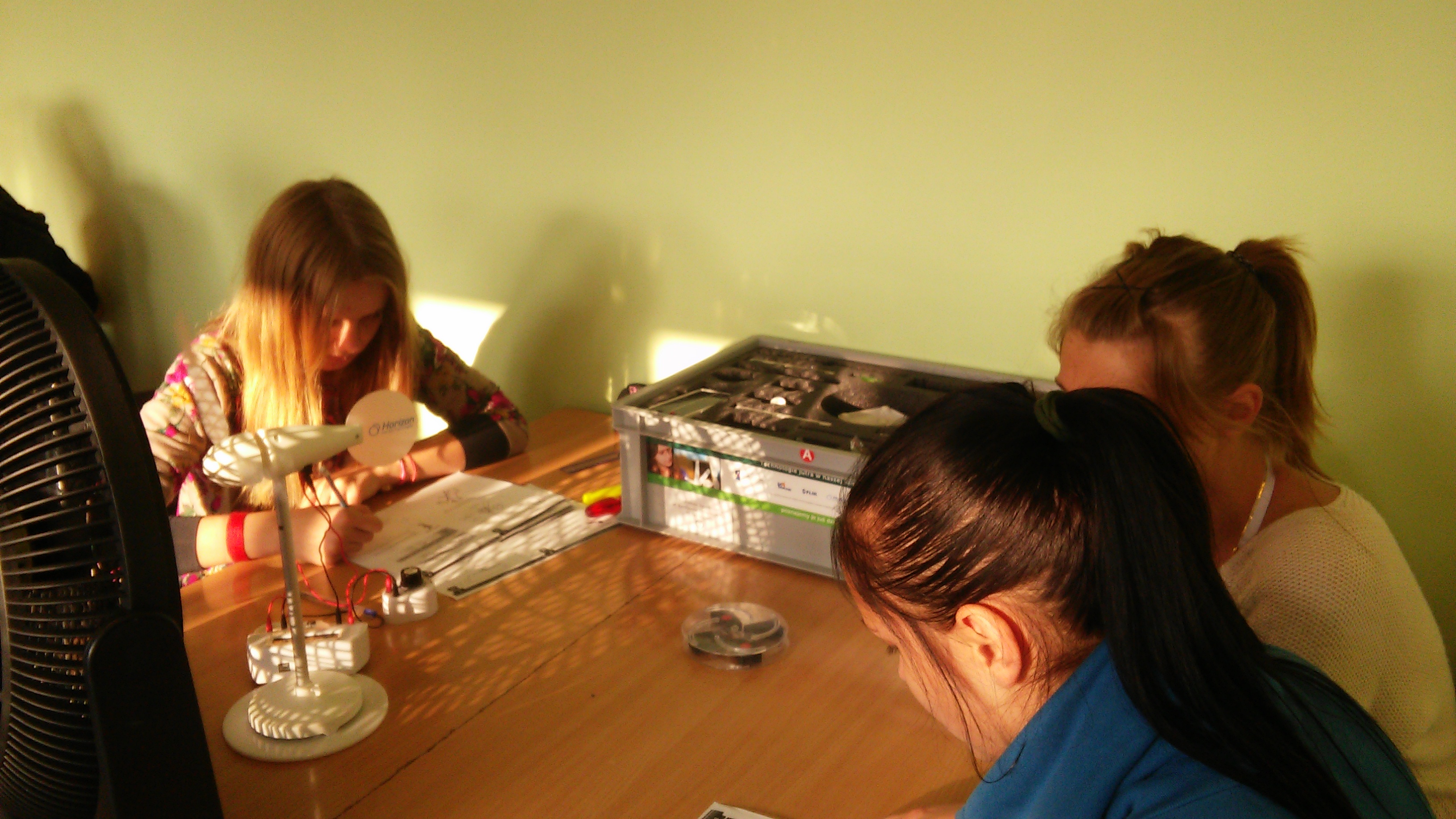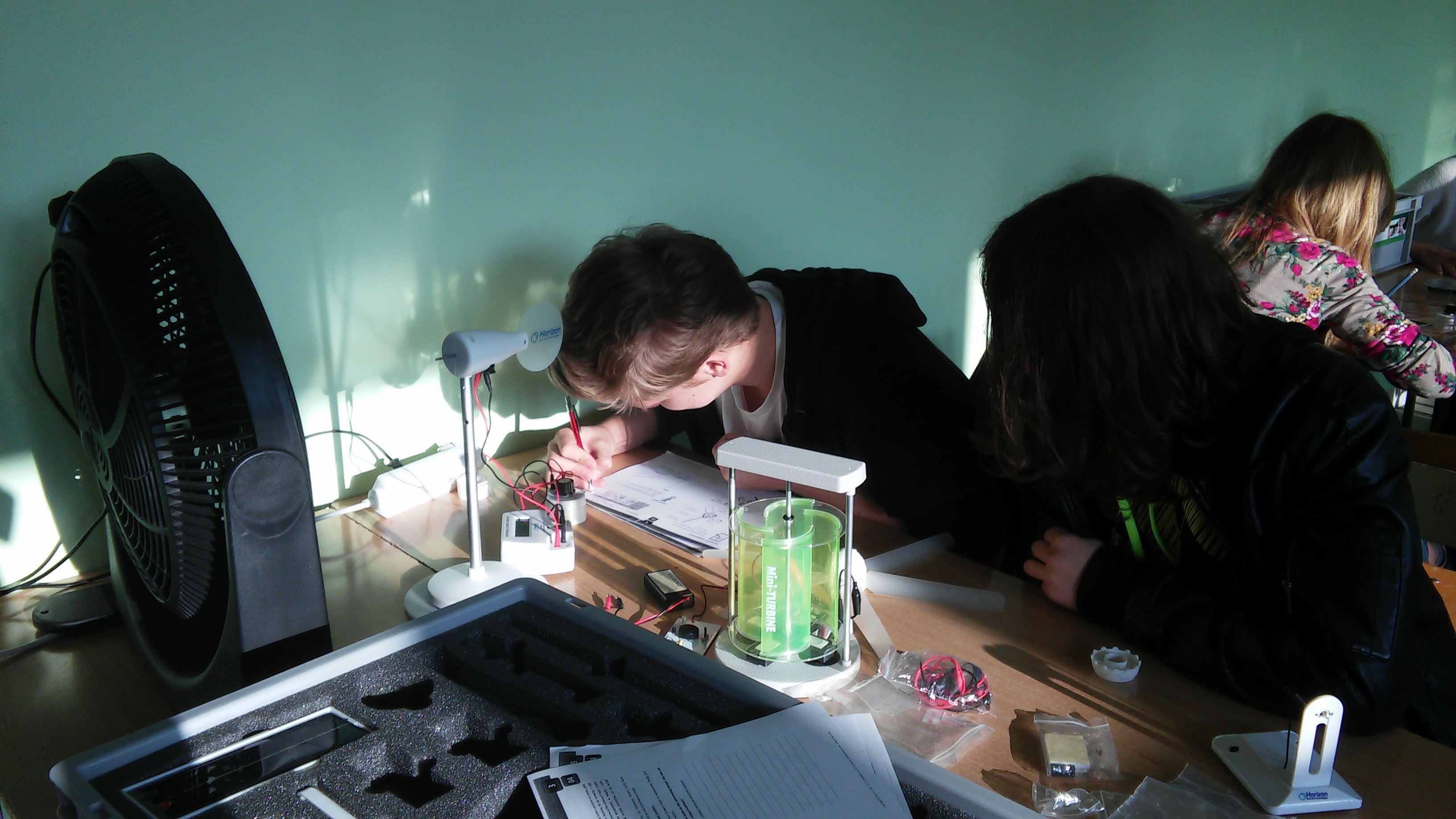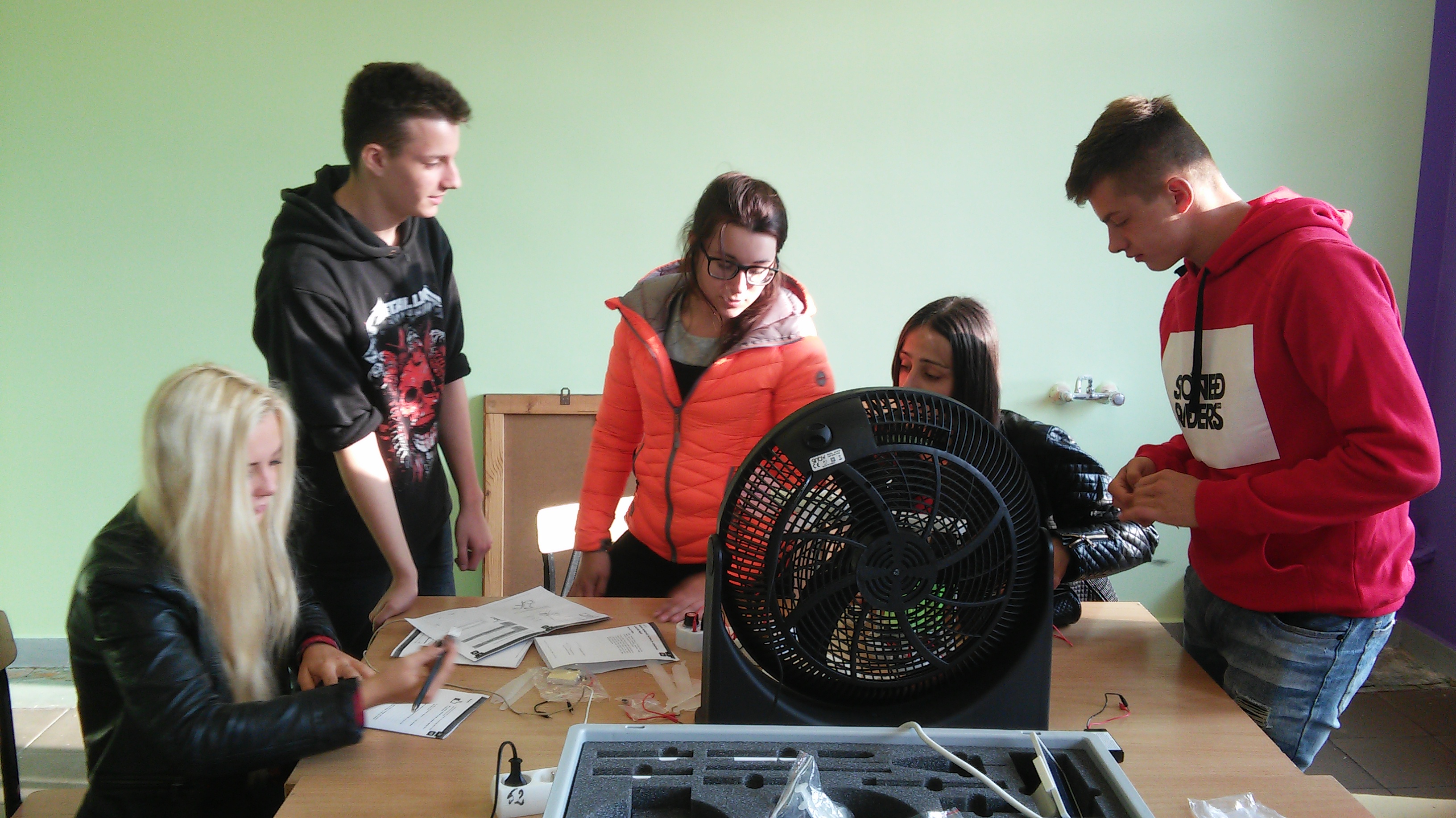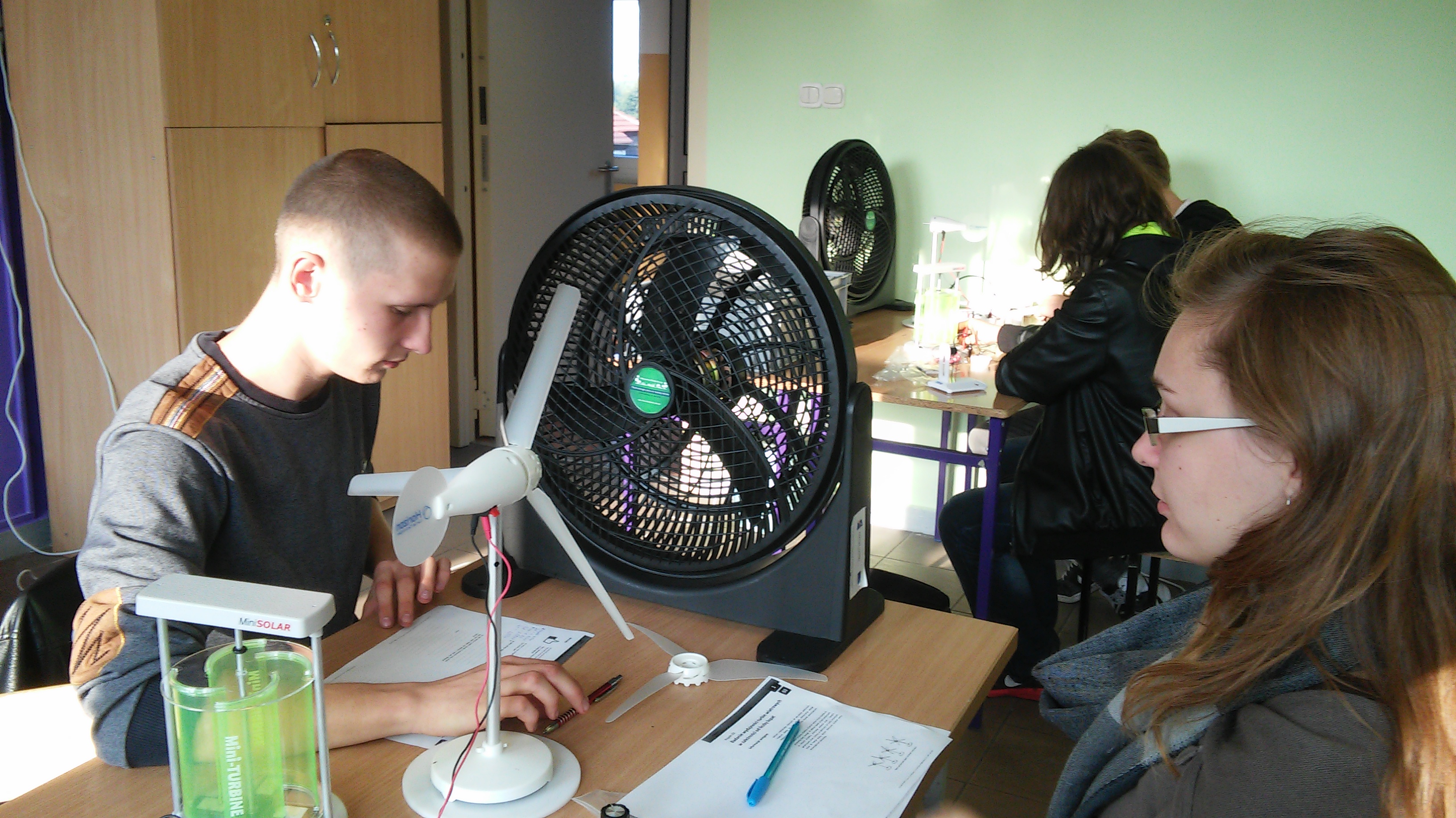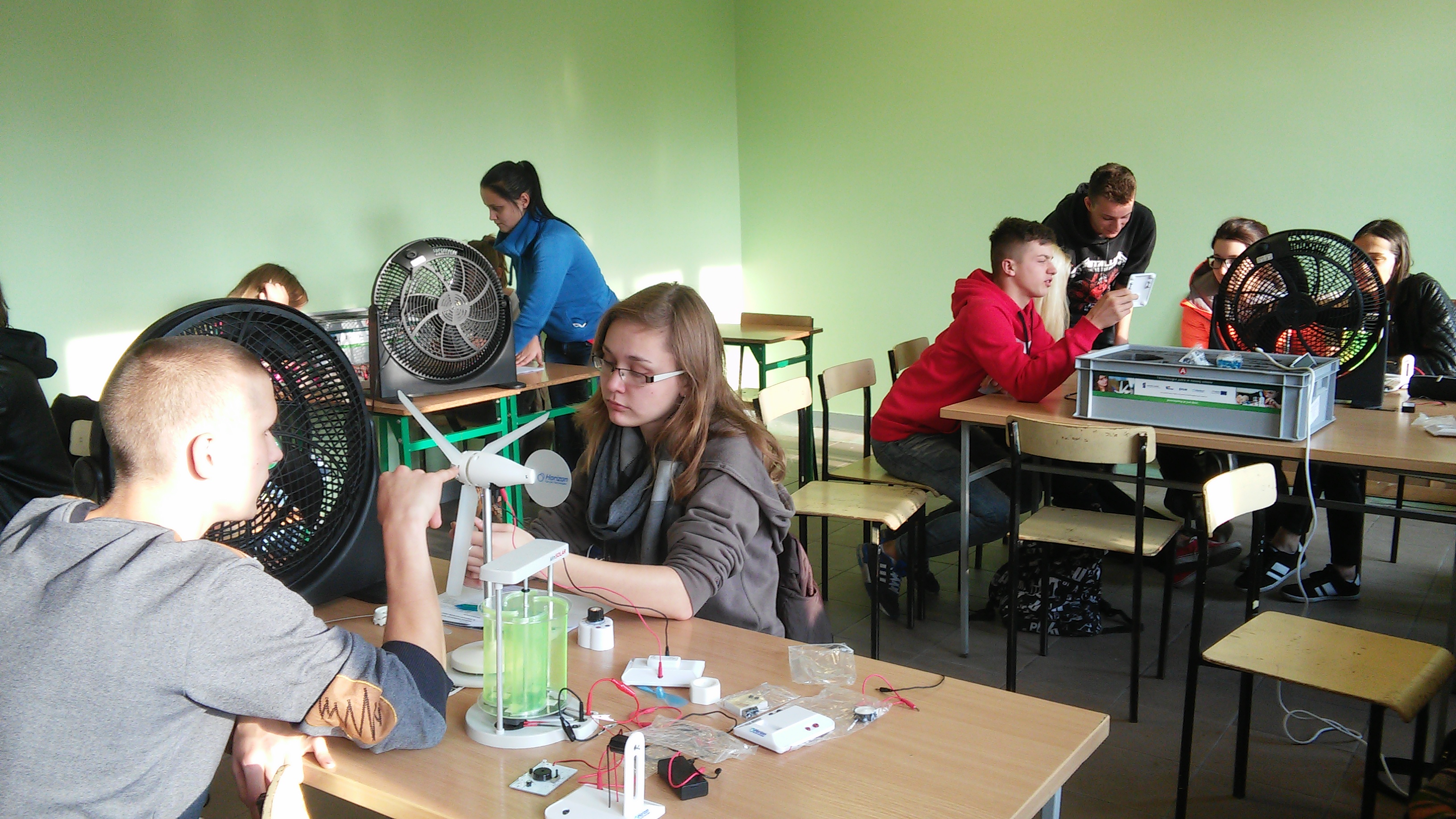 Ćwiczenia rozpoczęliśmy od omówienia zagadnień związanych z odnawialnymi źródłami energii oraz zapoznania uczniów z nowoczesnym sprzętem, za pomocą którego będą wykonywane wszystkie doświadczenia i ćwiczenia. Na początek zrealizowane zostały ćwiczenia z energii wiatrowej, m. in. budowa turbiny wiatrowej, badanie jej wydajności w zależności od liczby i kształtu łopat, ilości obrotów łopat na minutę. Na podstawie wykonanych doświadczeń uczniowie analizowali wyniki, wyciągali wnioski i przedstawiali je za pomocą wykresów. W oparciu o zdobytą wiedzę i wykonane ćwiczenia odpowiadali również na pytania zawarte w materiałach do pracy. W miłej i jednocześnie naukowej atmosferze przebiegły pierwsze zajęcia. Kolejne już za kilka dni.