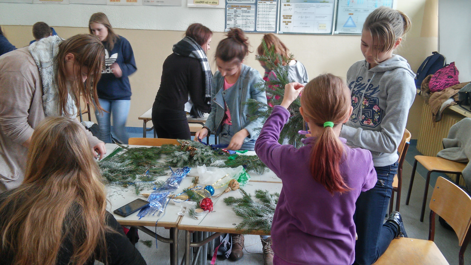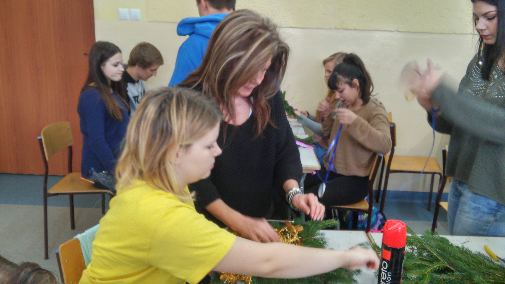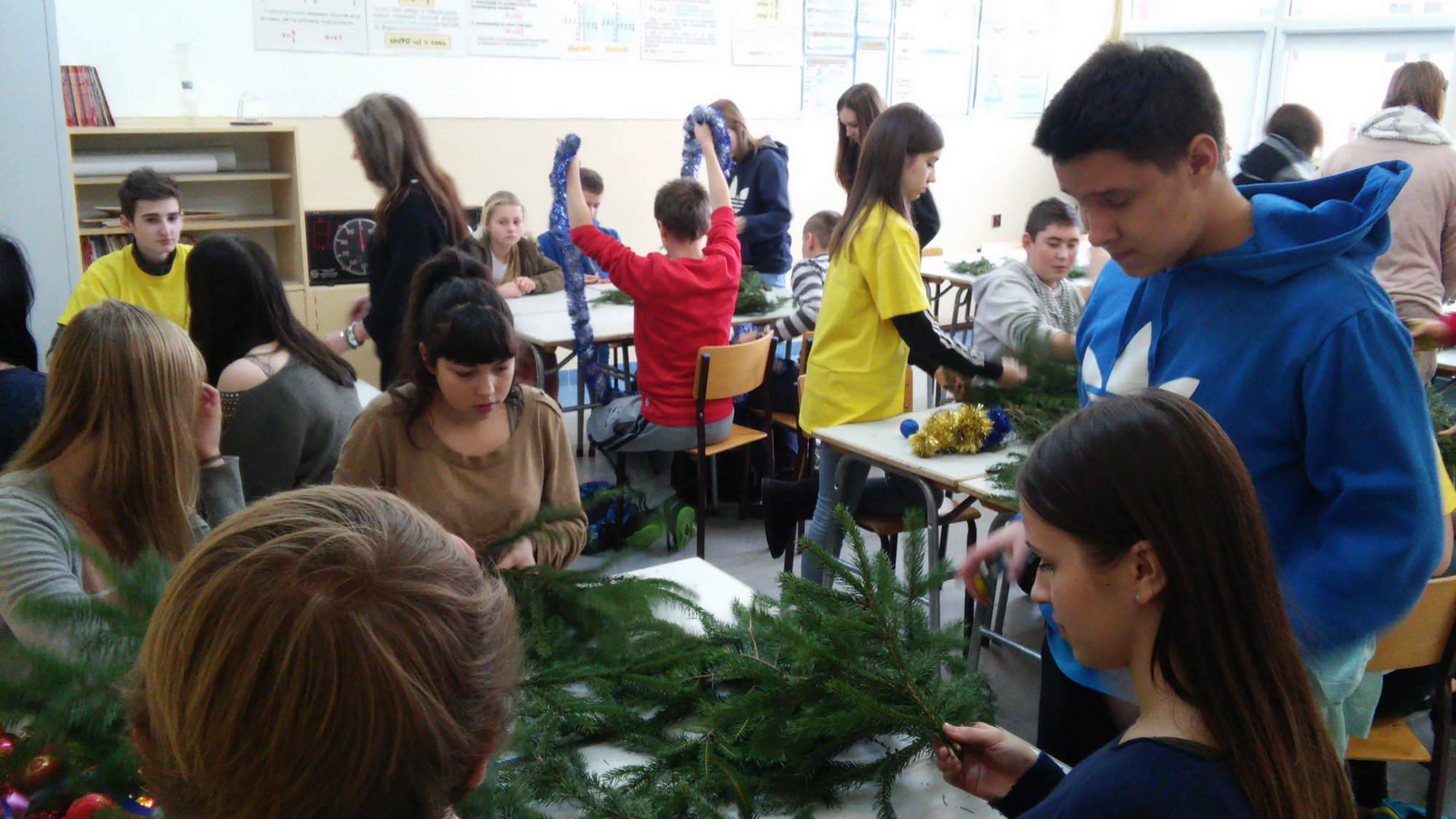 Gimnazjaliści z klasy trzeciej oraz ich młodsi koledzy i koleżanki z podstawówki przygotowali na to spotkanie niezbędne materiały dekoracyjne oraz igliwie. Przy tworzeniu dekoracji pomagali im starsi koledzy z klasy I TK. Po blisko dwugodzinnych zmaganiach powstały oryginalne, świąteczne, a co najważniejsze – własnoręcznie wykonane dekoracje.