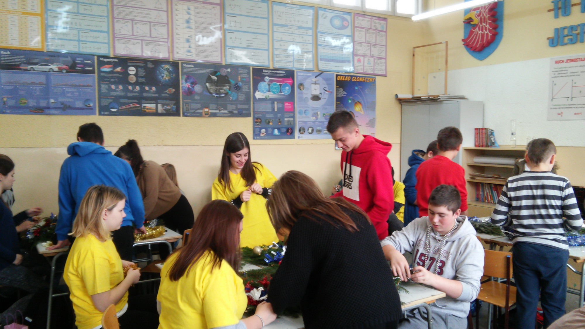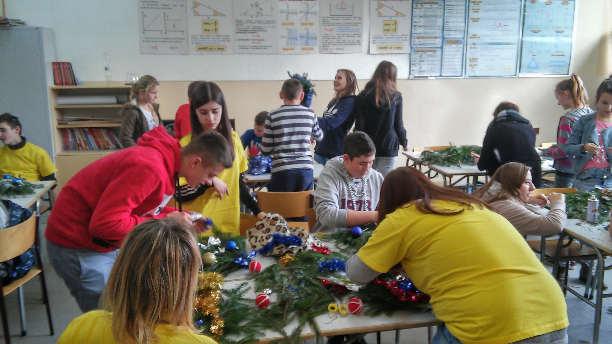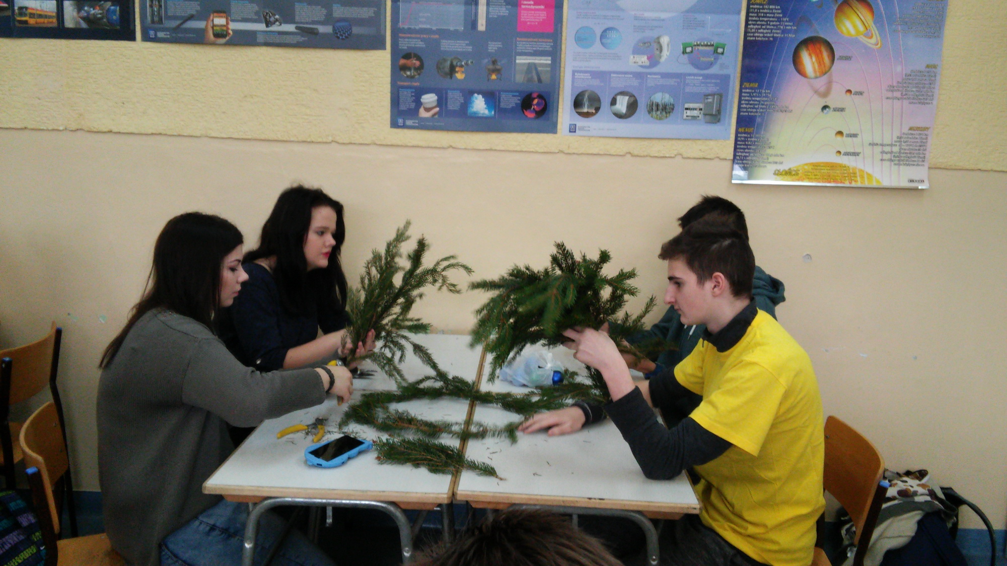 Gimnazjaliści z klasy trzeciej oraz ich młodsi koledzy i koleżanki z podstawówki przygotowali na to spotkanie niezbędne materiały dekoracyjne oraz igliwie. Przy tworzeniu dekoracji pomagali im starsi koledzy z klasy I TK. Po blisko dwugodzinnych zmaganiach powstały oryginalne, świąteczne, a co najważniejsze – własnoręcznie wykonane dekoracje.