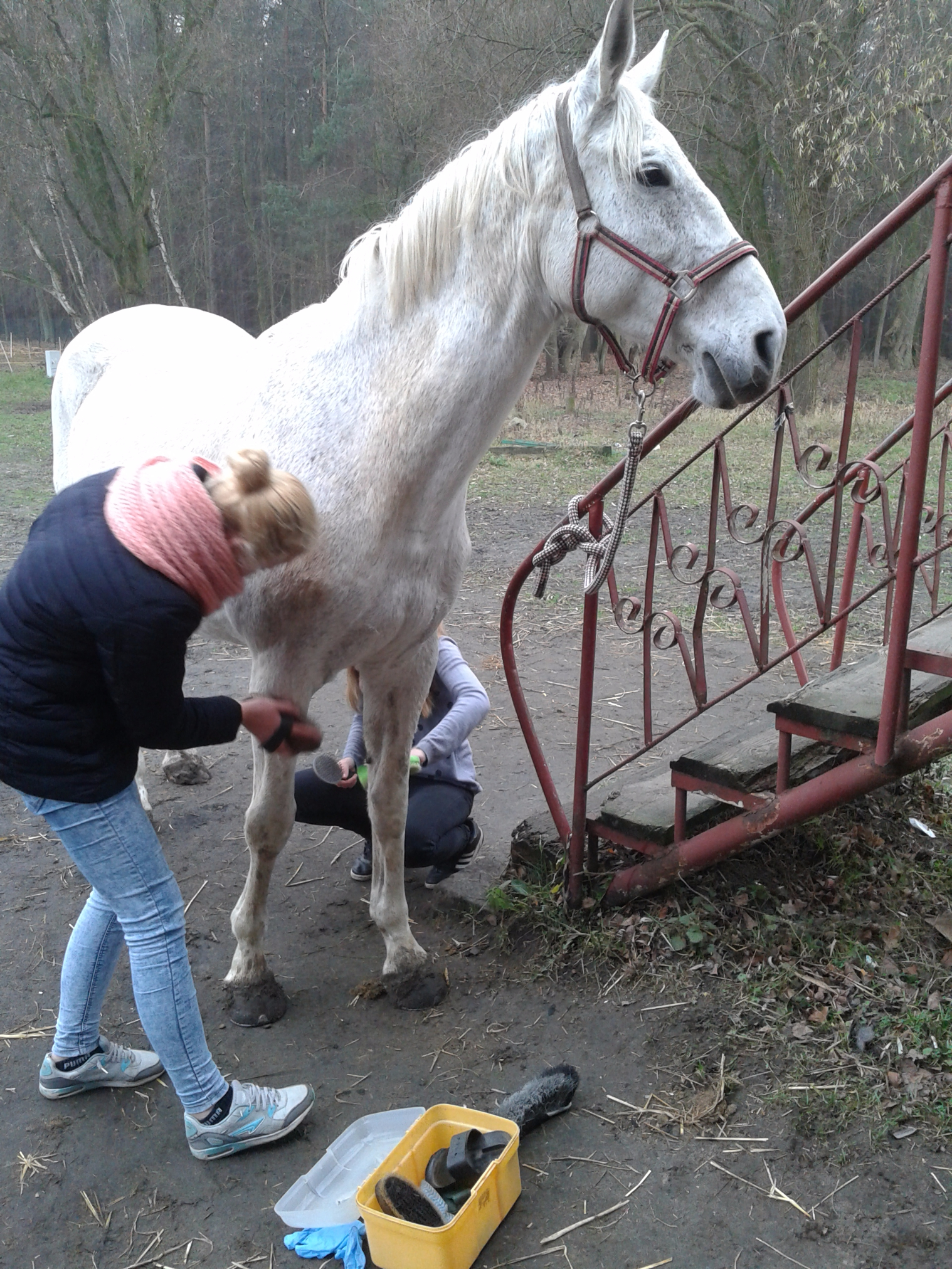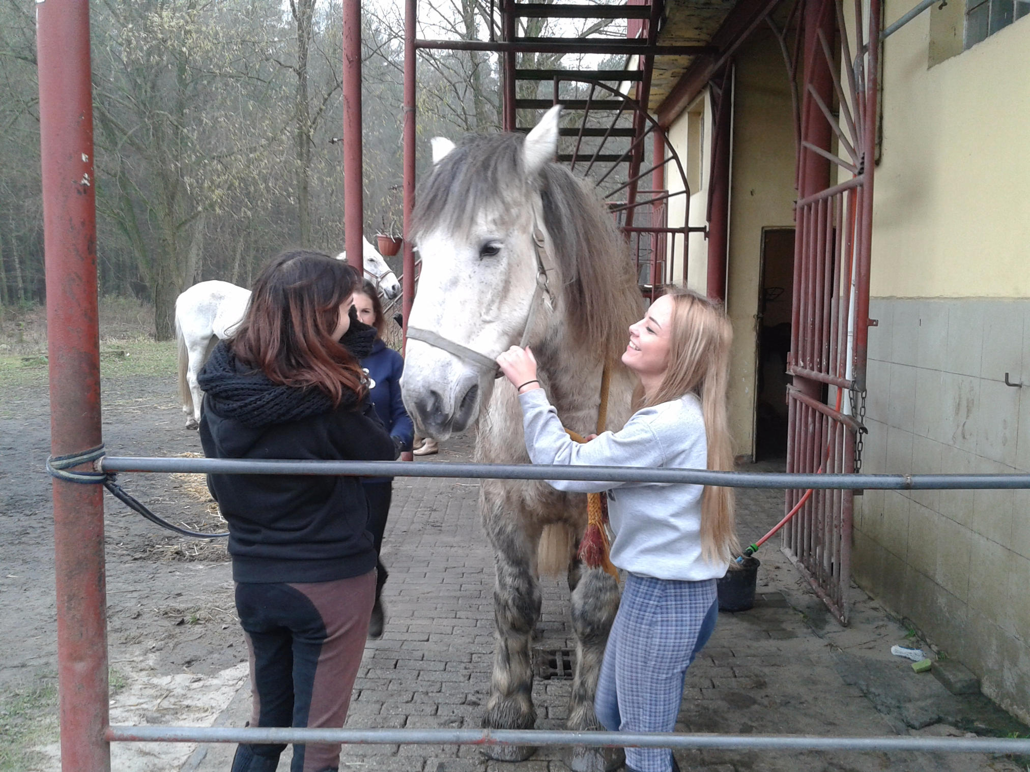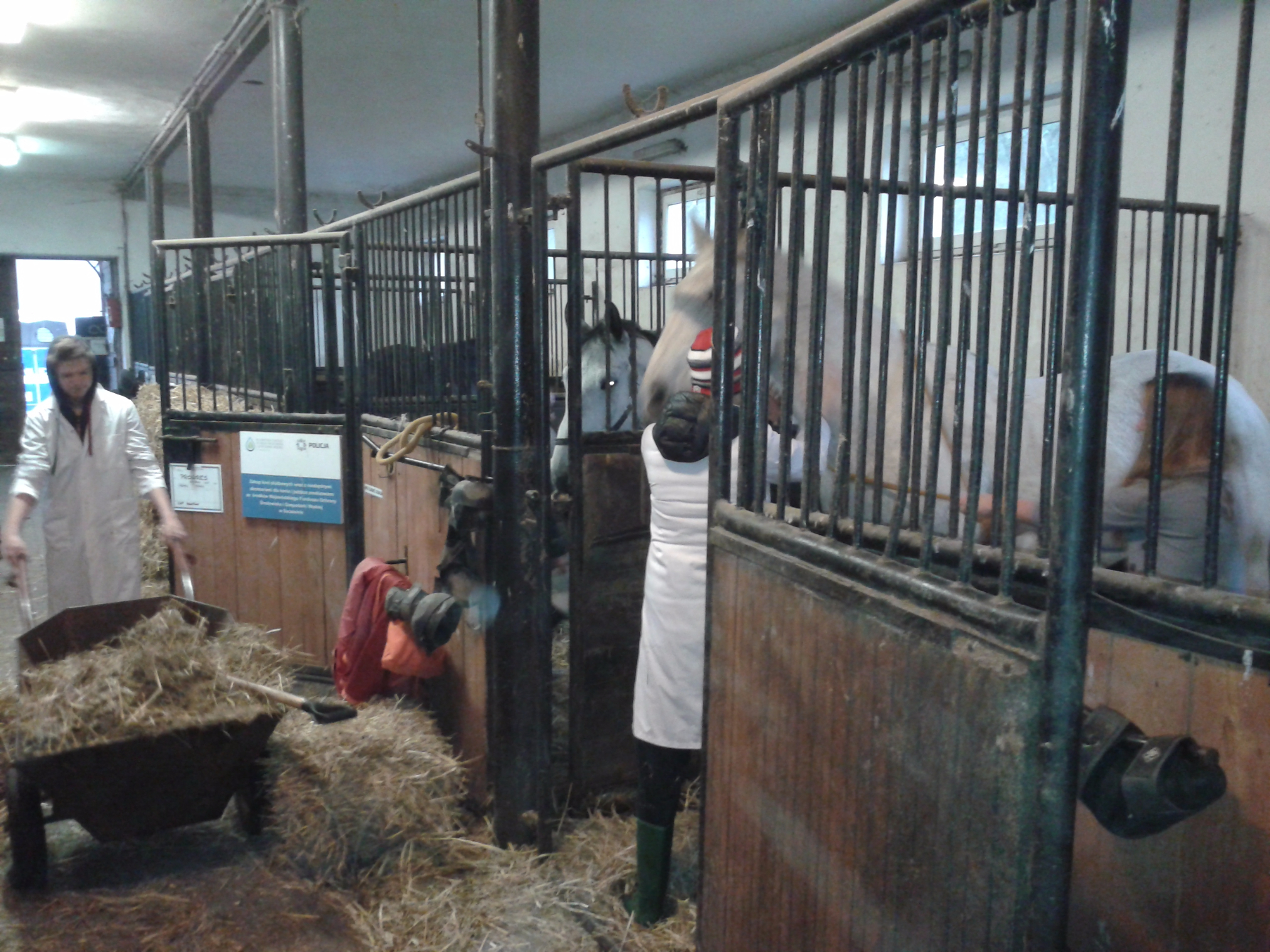 Na zajęciach praktycznych w Akademickim Ośrodku Jeździeckim ZUT w Osowie uczniowie przyszli weterynarze tym razem mieli okazje realizować zadania z zakresu anatomii topograficznej poprzez kontakt z końmi. Rozpoznawali części ciała, mierzyli, a potem wykonywali czynności z zakresu chowu i hodowli. Posprzątali i posłali boksy dla koni, oczyścili poidła, a także wyczyścili i wyszczotkowali każdego konia, jaki tylko znalazł się w ich zasięgu. Dodatkowo zostali zapoznani z procedurą zakładania uprzęży i siodła, a na koniec zajęć sprowadzili konie z dworu do stajni. Bardzo dziękujemy funkcjonariuszom Szczecińskiej Policji Konnej – których zwierzęta korzystają ze stadniny w Osowie – za udostępnienie koni do szczotkowania oraz za instruktaż z zakładania uprzęży i siodłania.
