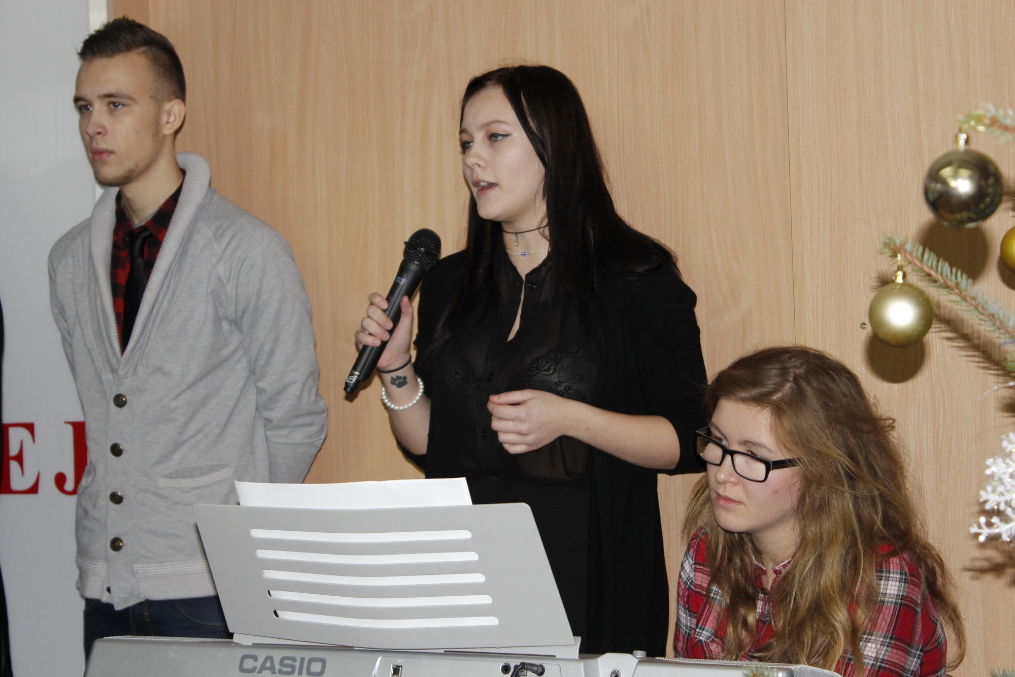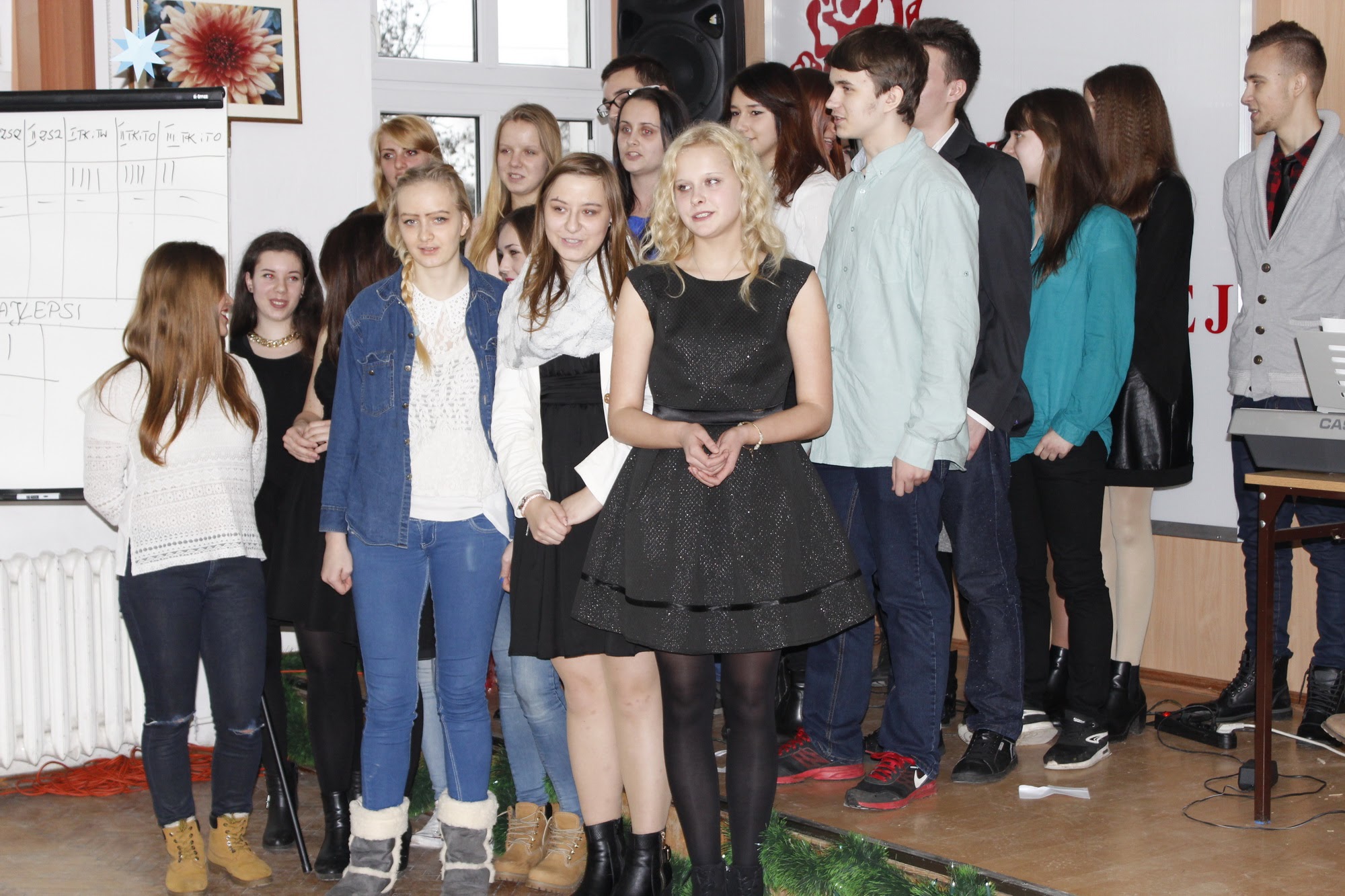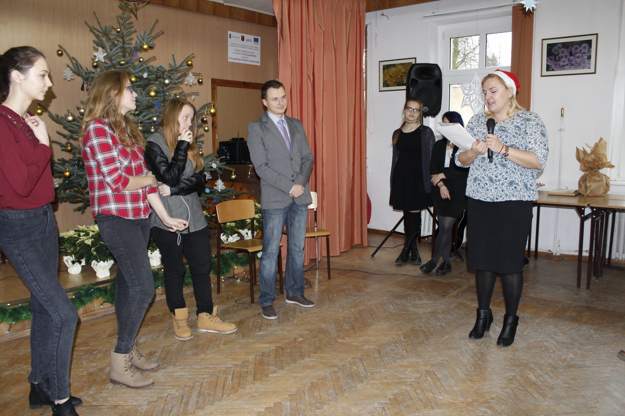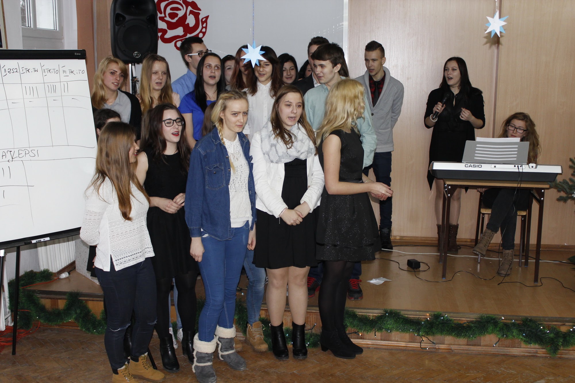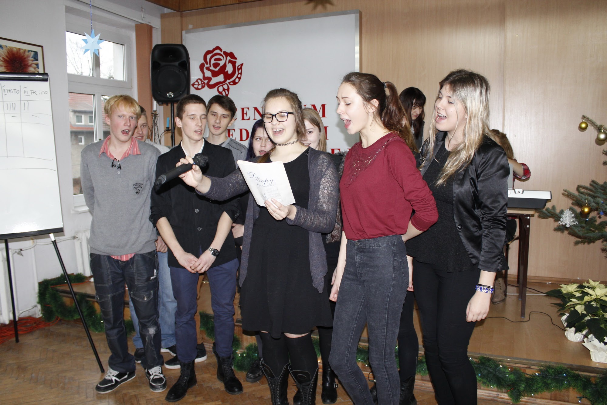 Piątek był wyjątkowym dniem w naszej szkole. Odbyły się bowiem wigilie klasowe, jasełka szkolne i coroczny konkurs kolęd. W atmosferę nadchodzących świąt wprowadził nas szkolny zespół muzyczny przygotowany przez Pana Wojciecha Majkowskiego. Uczennice nie tylko przypomniały „ideę” Bożego Narodzenia, ale zaśpiewały pastorałki i piosenki świąteczne. A potem zespoły klasowe i nauczyciele przystąpili do rywalizacji w konkursie wiedzy o tematyce bożonarodzeniowej. Dopełnieniem świątecznych zmagań był konkurs kolęd, w którym swoje umiejętności wokalne zaprezentowały poszczególne drużyny. Byli też soliści.