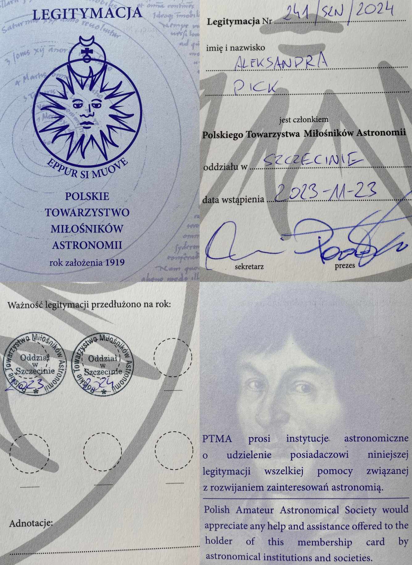 Jedna z uczennic szkoły z klasy 2 CT – Technik hodowca koni, specjalność policja konna, Aleksandra Pick, została wyróżniona za udział w spotkaniach, otrzymując Legitymację Członka Polskiego Towarzystwa Miłośników Astronomii.