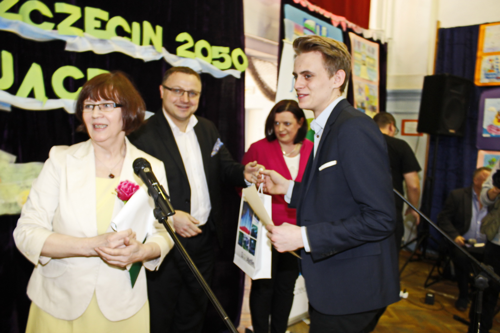 Tegoroczna VI Edycja Miejskiego Konkursu Twórczości Plastycznej i Literackiej – pod hasłem OGRODY PŁYWAJĄCE – CZYLI SZCZECIN 2050 – została rozstrzygnięta! Trzech naszych uczniów zostało jego laureatami! W kategorii „pozostałe prace plastyczne” – Aleksandra Sieradzińska i Tomasz Zdun z klasy 3 TK zdobyli I miejsce (indywidualnie), a Gracjan Falkowski z klasy 1 TK – otrzymał wyróżnienie. Uczniowie swoje prace przygotowali pod opieką Pani Joanny Sylwestrzak. Wszystkim serdecznie gratulujemy! Organizatorem konkursu jest Zespół Szkół Sportowych im. Sportowców Ziemi Szczecińskiej w Szczecinie. Wręczenie nagród odbyło się 17 marca 2016 roku.