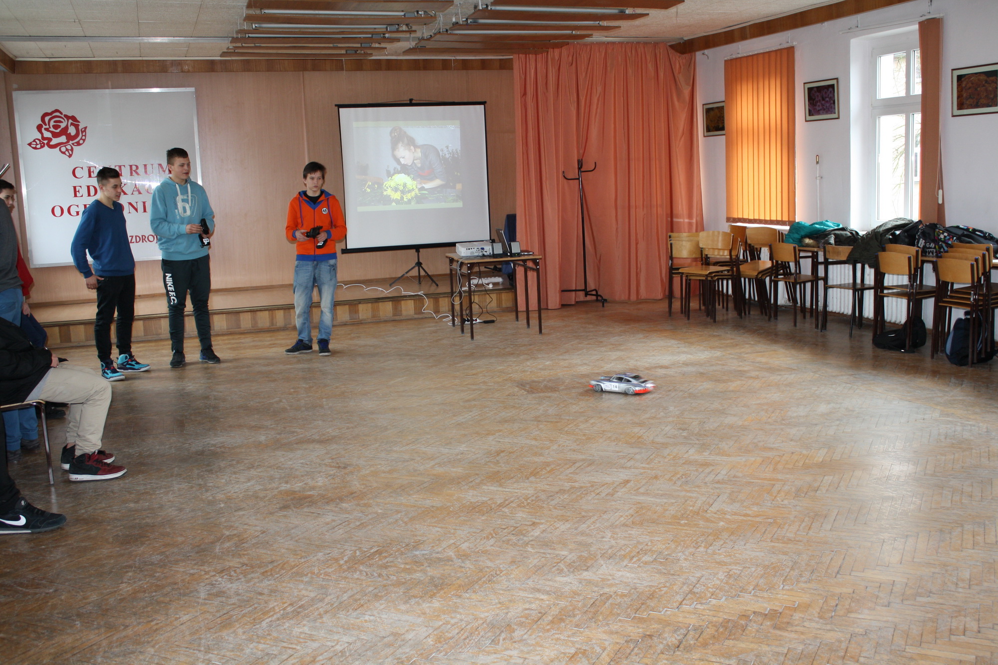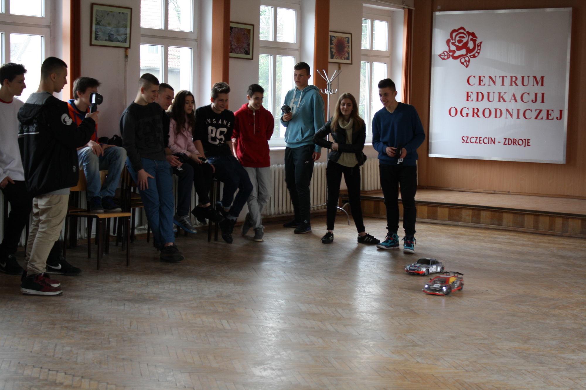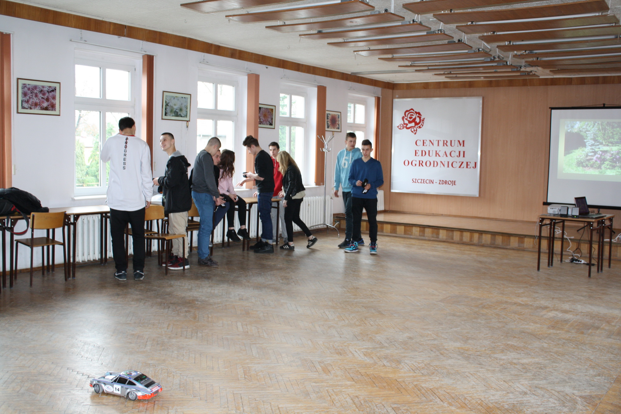 Następnie goście zostali podzieleni na dwie grupy. Pierwsza z grup uczestniczyła w warsztatach z odnawialnych źródeł energii, które prowadziła Pani Izabella de Weyher. Uczniowie mieli możliwość „przetestowania” modeli samochodów hybrydowych na placu manewrowym i wykonania pomiarów kamerą termowizyjną. Druga grupa natomiast wzięła udział w warsztatach florystycznych, w trakcie których młodzież dekorowała pierwiosnki i uczyła się wykonywania kokard na prezenty.
