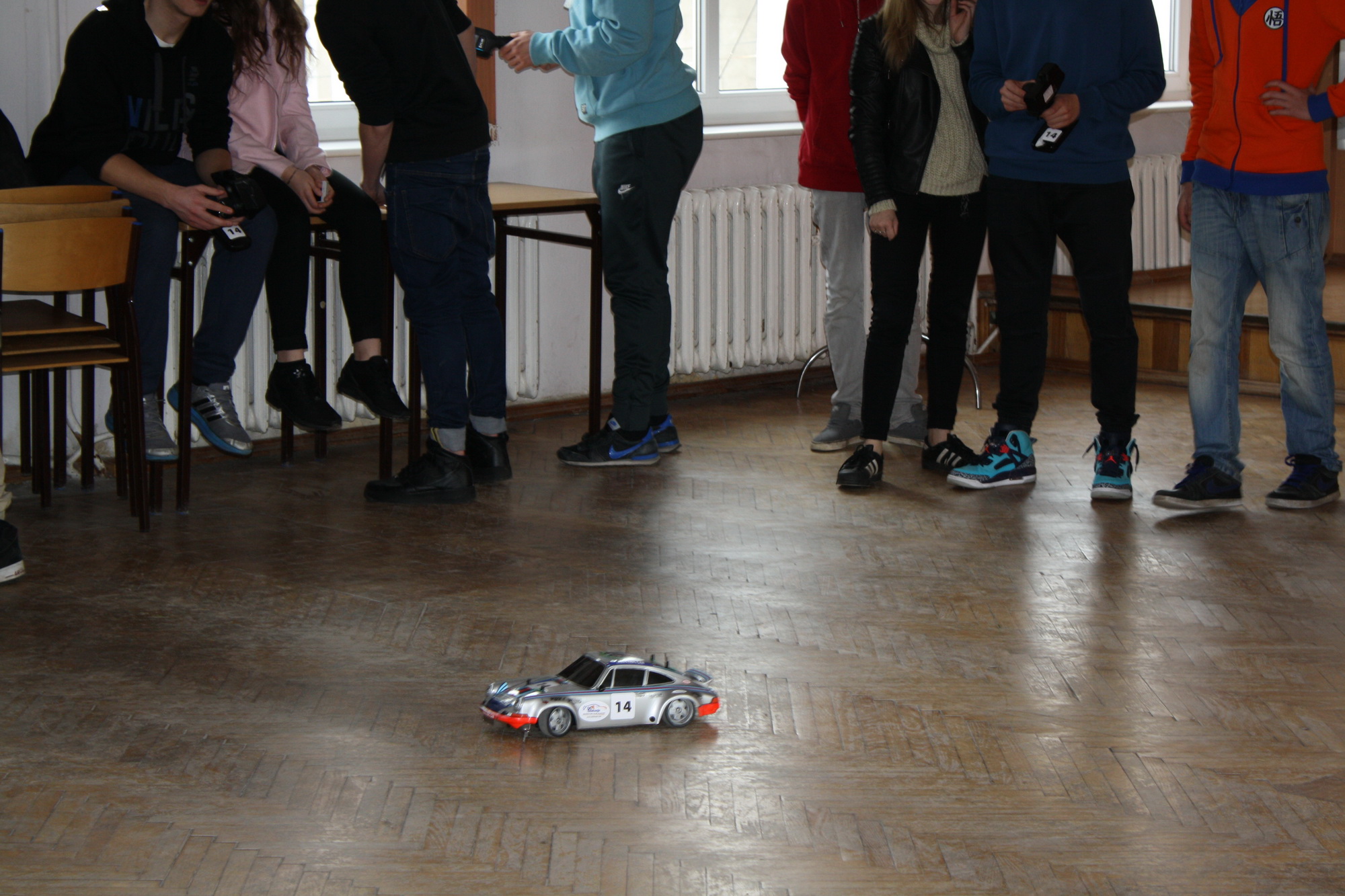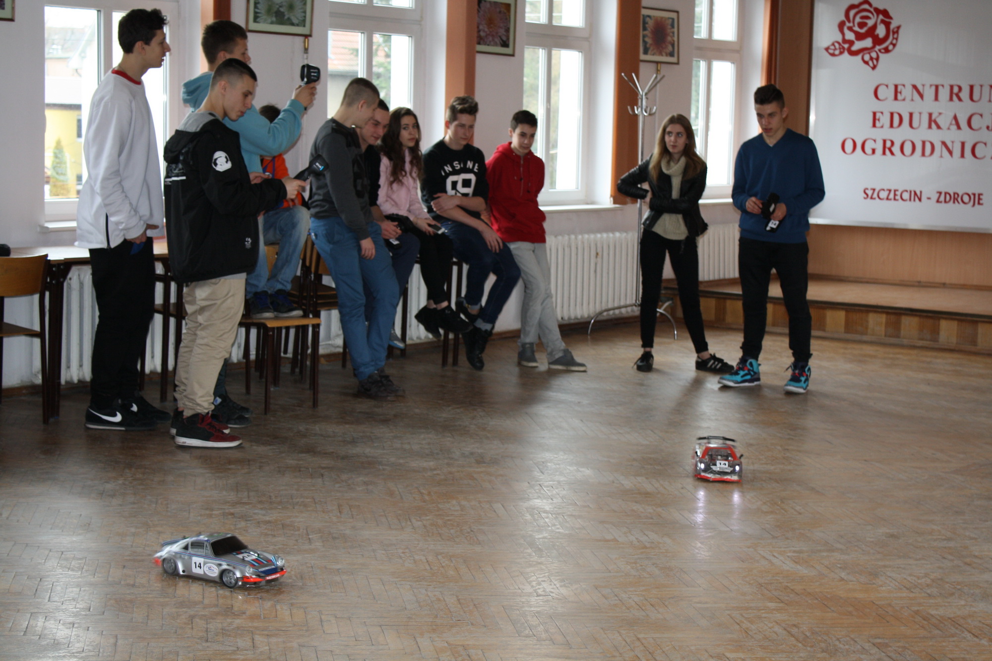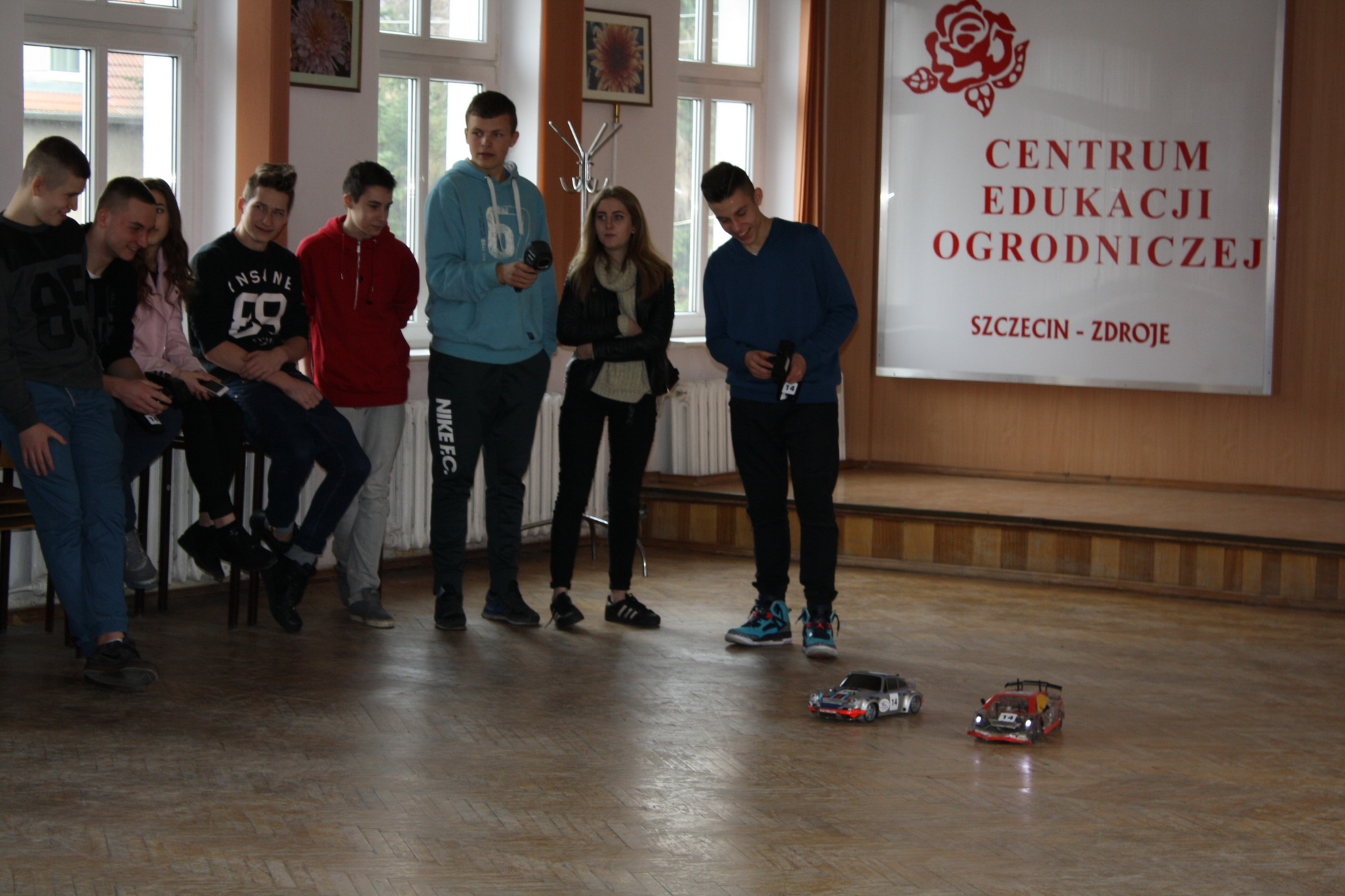Następnie goście zostali podzieleni na dwie grupy. Pierwsza z grup uczestniczyła w warsztatach z odnawialnych źródeł energii, które prowadziła Pani Izabella de Weyher. Uczniowie mieli możliwość „przetestowania” modeli samochodów hybrydowych na placu manewrowym i wykonania pomiarów kamerą termowizyjną. Druga grupa natomiast wzięła udział w warsztatach florystycznych, w trakcie których młodzież dekorowała pierwiosnki i uczyła się wykonywania kokard na prezenty.