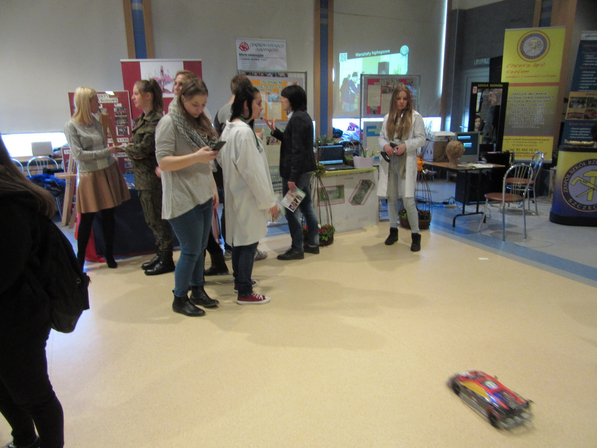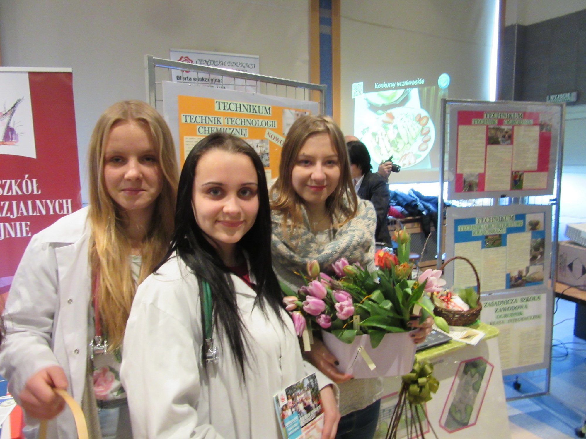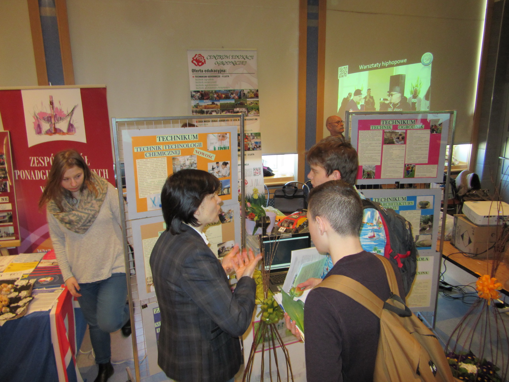 Stoisko oraz oferta edukacyjna naszej szkoły spotkała się z dużym zainteresowaniem. Młodzi ludzie zadawali wiele pytań dotyczących zawodów, a zwłaszcza pytali o praktyki, zajęcia praktyczne – gdzie są realizowane, czy szkoła je zapewnia oraz – czy po naszych kierunkach można znaleźć pracę. Wielu trzecioklasistów pytało także o nasz nowy kierunek – technik technologii chemicznej. Dużym wsparciem była młodzież, która opowiadała o szkole i zachęcała gimnazjalistów do kontynuowania nauki w naszej szkole. Prezentacja szkoły w formie multimedialnej – skierowana wyłącznie do uczniów gimnazjalnych klas trzecich – była uwieńczeniem promocji. Wierzymy, że poprzez wspólne działanie pomogliśmy młodym ludziom w wyborze ścieżki zawodowej.