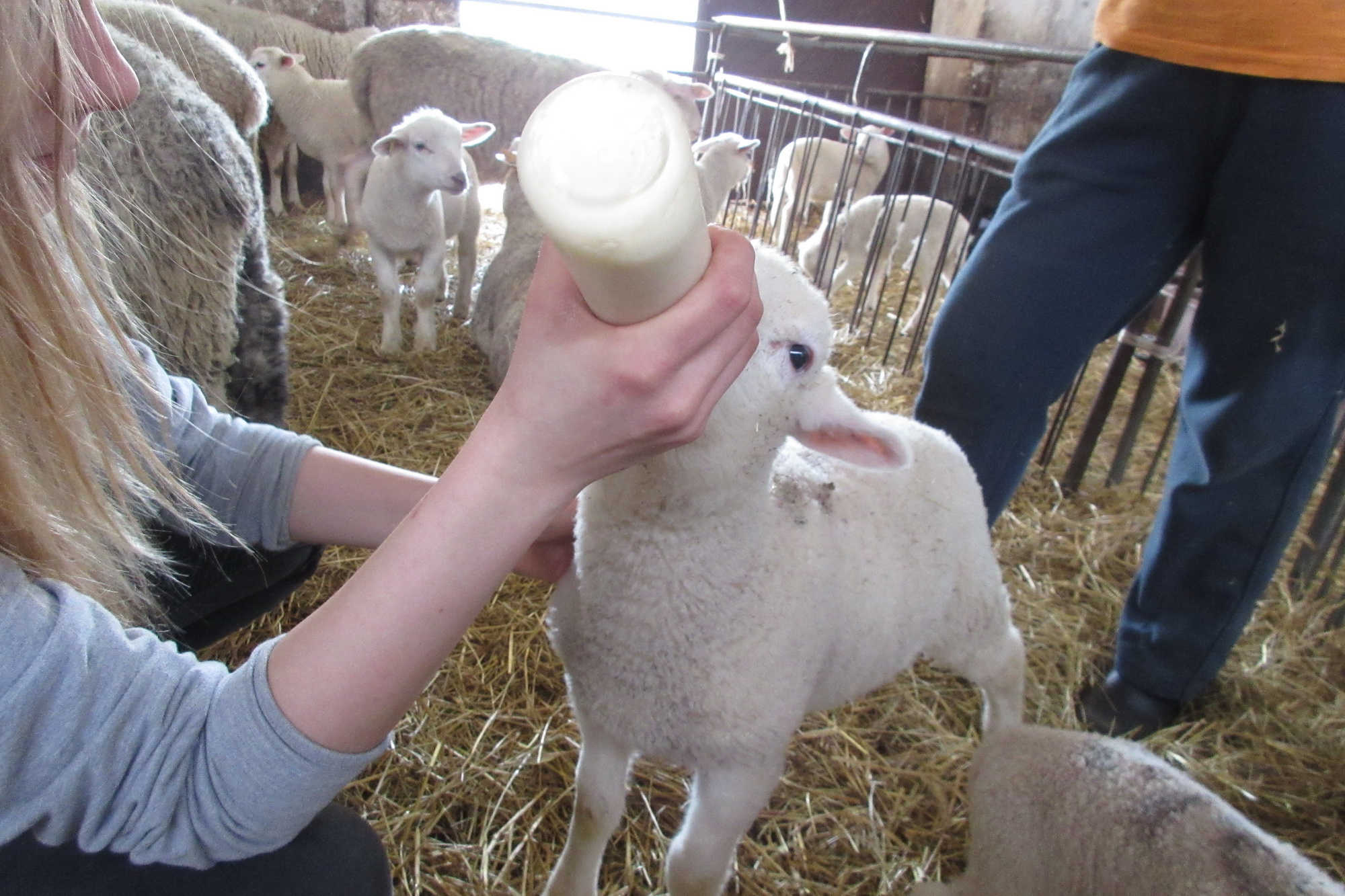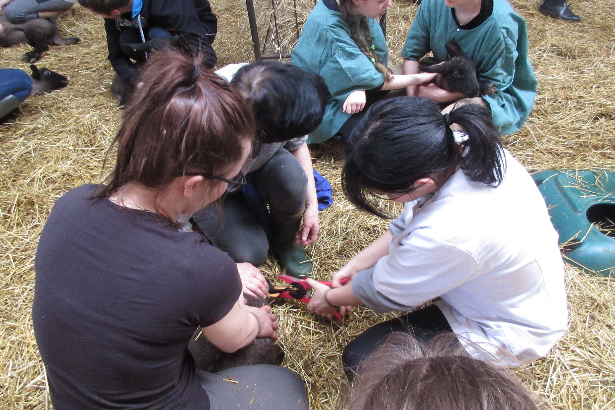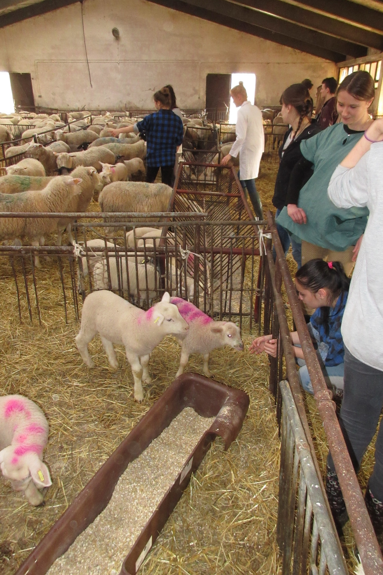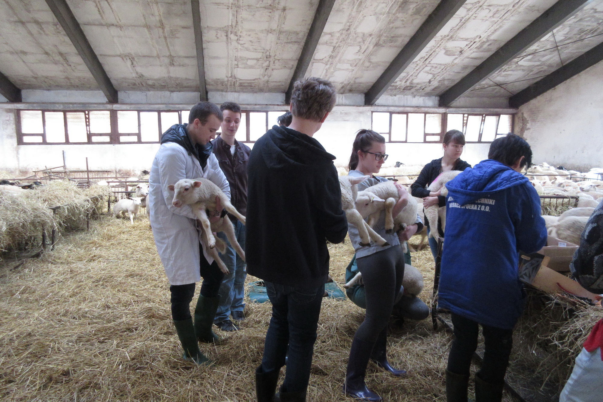 Otóż niekoniecznie, ponieważ drugim zadaniem do wykonania było kolczykowanie nowo narodzonych jagniąt, najpierw rasy pomorskiej, a potem suffolków. Może się wydawać, że złapać takie jagnię i założyć kolczyk to nic trudnego. Okazało się jednak, że jagnięta nie mają najmniejszego zamiaru dać się złapać, a jeśli już się udało, to nie mają też ochoty spokojnie spoczywać w objęciach przyszłych techników weterynarii i czekać na swoją kolej. Trudno dokładnie powiedzieć, ile jagniąt zakolczykowano. Z pewnością jednak było ich ponad 50. Nie można się zatem dziwić ani spoconym plecom, ani brudnym ubraniom. Każdy z uczniów nauczył się za to jak prawidłowo założyć kolczyk na ucho i na własnej skórze przekonał się, że trzeba mieć trochę krzepy, żeby kolczykownica zacisnęła obie połówki tej „zwierzęcej ozdoby”.