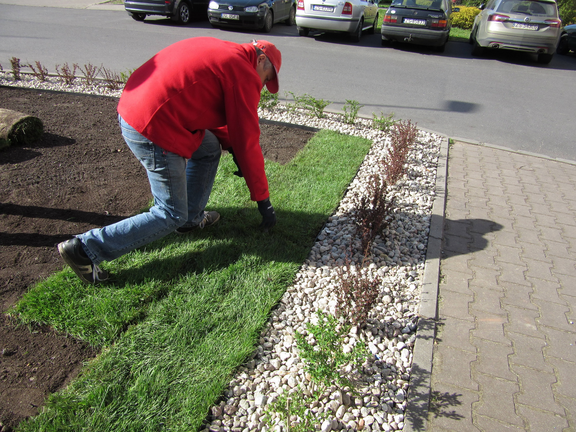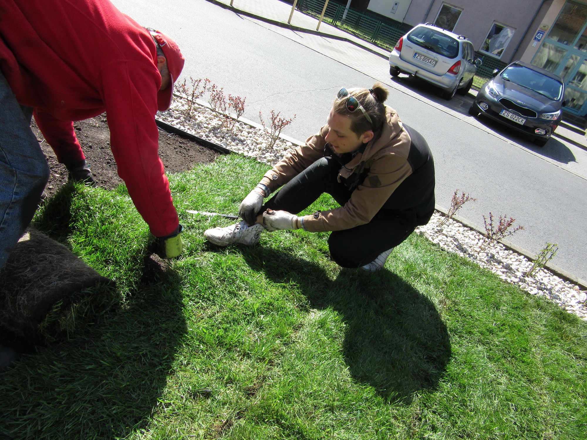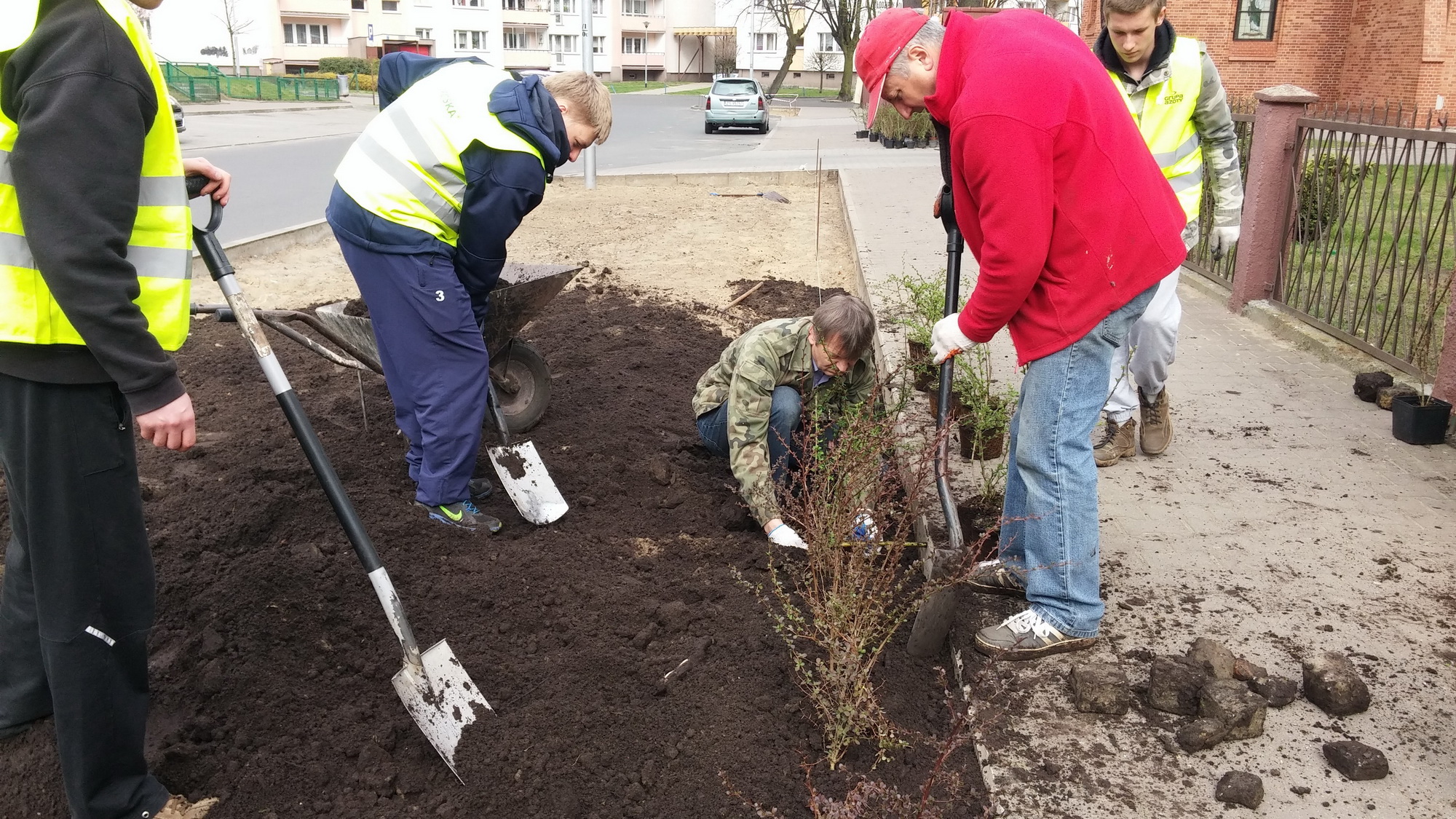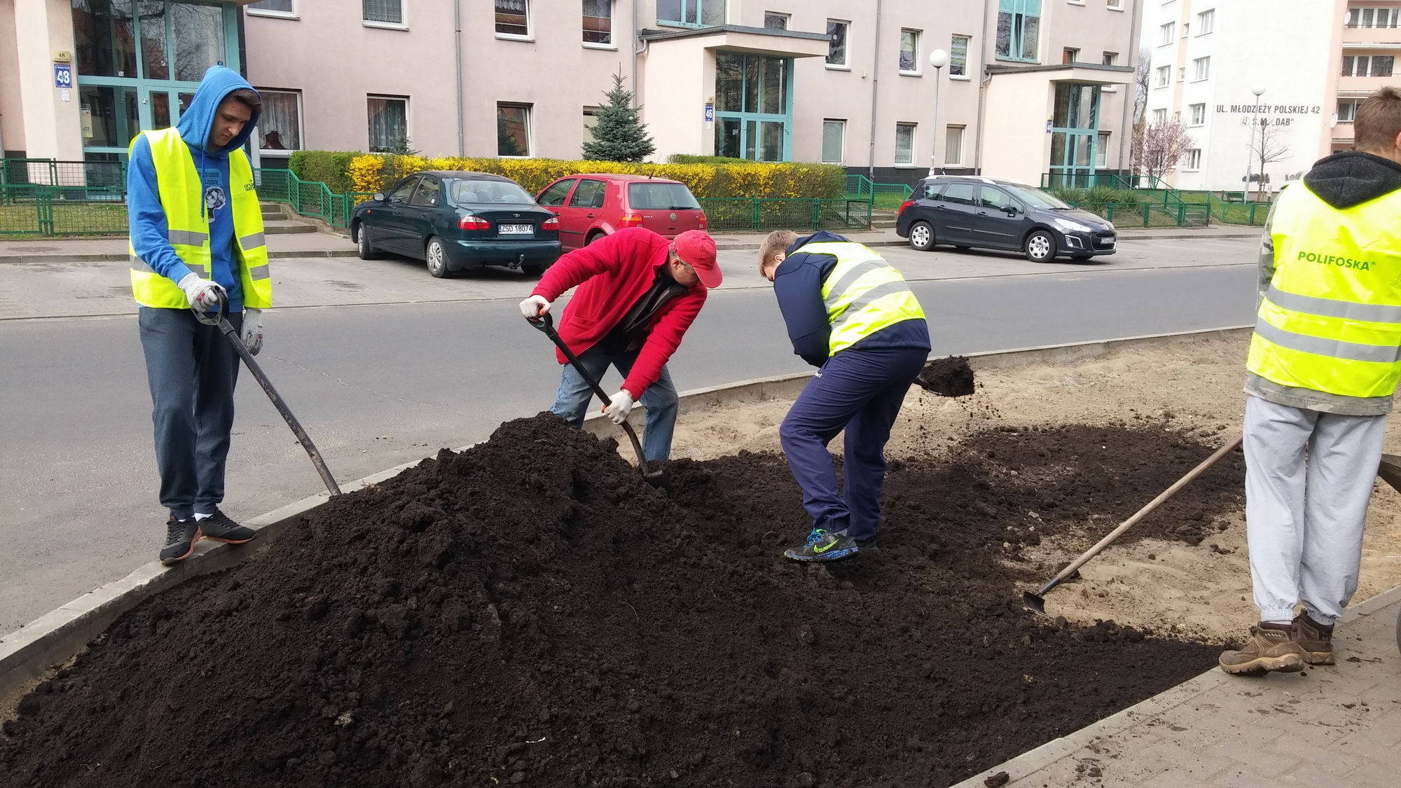 W trakcie praktycznej nauki zawodu – praktyk zawodowych i zajęć praktycznych – realizujemy różnorodne prace upiększania zieleni w naszym mieście. W czwartek 21 kwietnia 2016 roku zakończyliśmy ostatni etap prac związanych z zagospodarowaniu terenu przy Kościele pw. Świętego Ducha w Zdrojach. Prace trwały łącznie siedem dni i były realizowane – zgodnie z opracowanym przez naszych uczniów, kształcących się w zawodzie technik architektury krajobrazu – projektem technicznym zagospodarowania ww. terenu – wykonanego wczesną wiosną. W pierwszym etapie usunęliśmy z tego terenu warstwę ziemi grubości 15 cm wymieszanej z piaskiem po prowadzonych wcześniej pracach remontowo-budowlanych. W etapie drugim w nawiezionym czarnoziemie wykonaliśmy nasadzenia z berberysu Thunberga – w formie żywopłotu na obrzeżach terenu, wyłożyliśmy matę i po montażu obrzeży – ściółkowaliśmy żwirem budowlanym. W etapie trzecim realizacji prac wykonaliśmy centralnie trawnik dywanowy z darni.
