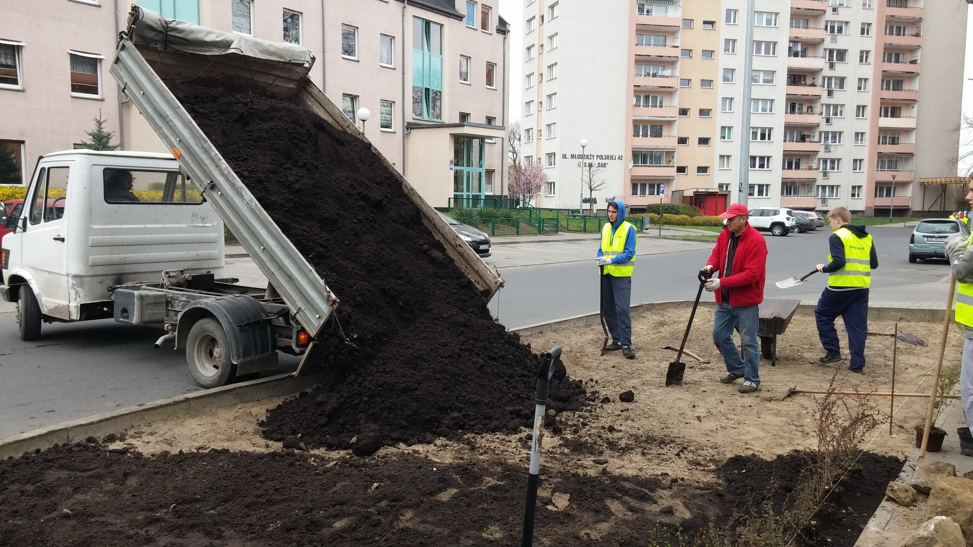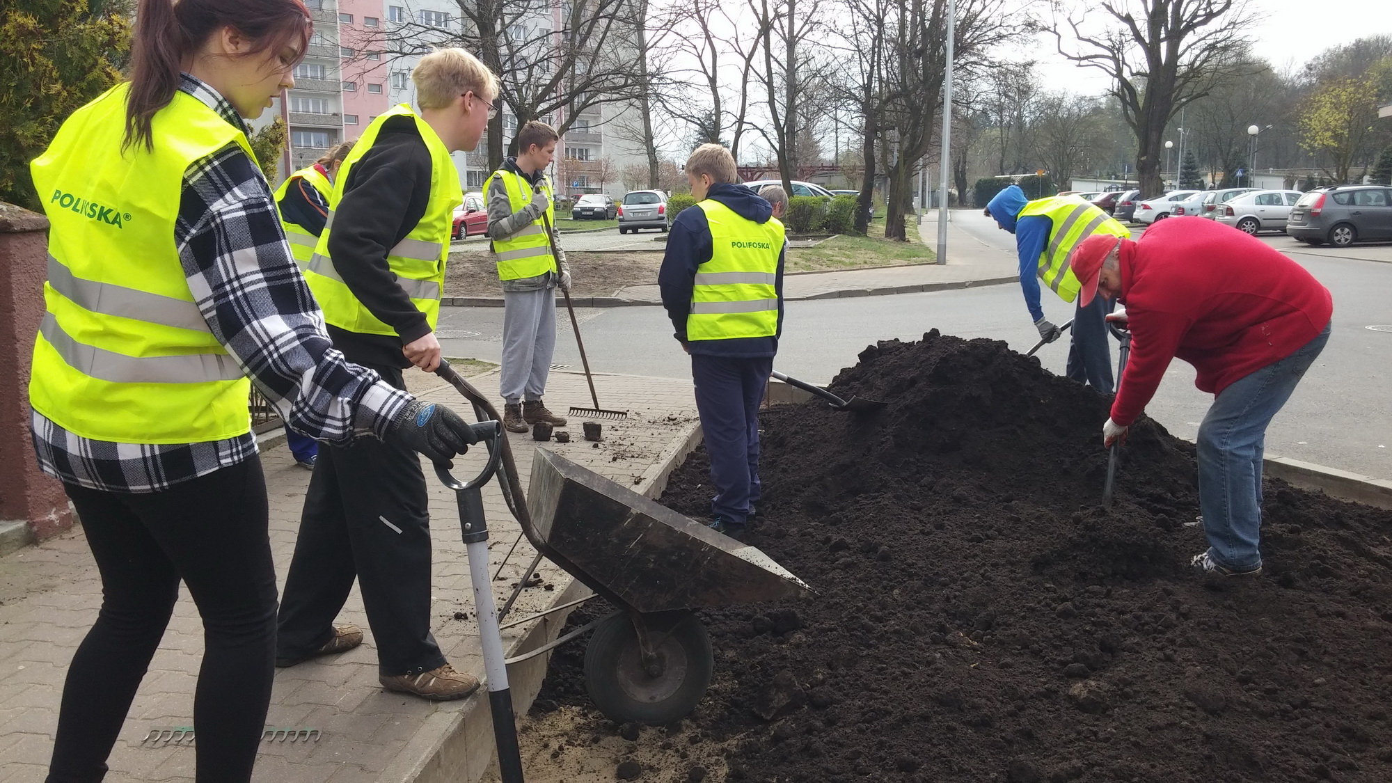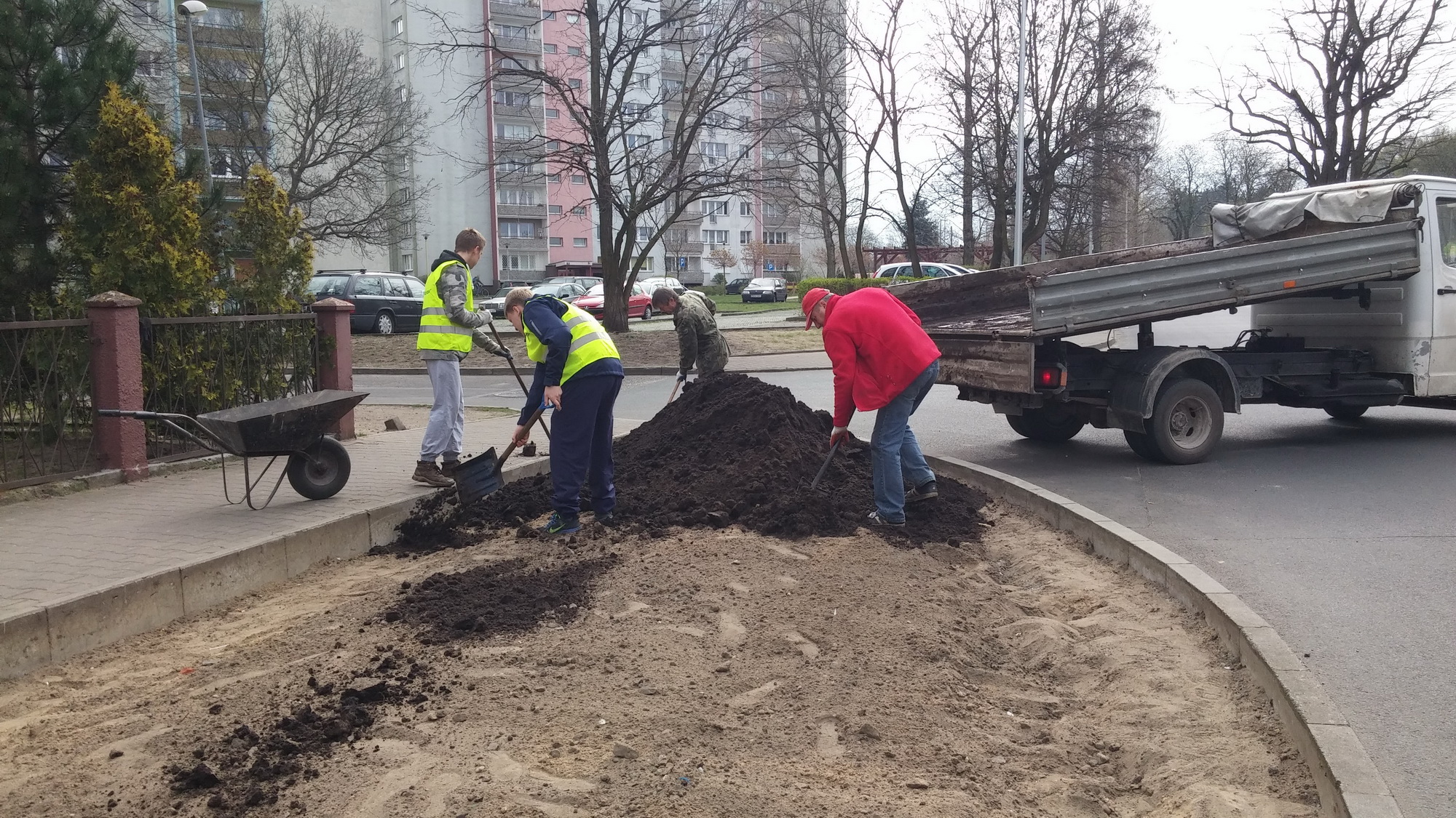 W trakcie praktycznej nauki zawodu – praktyk zawodowych i zajęć praktycznych – realizujemy różnorodne prace upiększania zieleni w naszym mieście. W czwartek 21 kwietnia 2016 roku zakończyliśmy ostatni etap prac związanych z zagospodarowaniu terenu przy Kościele pw. Świętego Ducha w Zdrojach. Prace trwały łącznie siedem dni i były realizowane – zgodnie z opracowanym przez naszych uczniów, kształcących się w zawodzie technik architektury krajobrazu – projektem technicznym zagospodarowania ww. terenu – wykonanego wczesną wiosną. W pierwszym etapie usunęliśmy z tego terenu warstwę ziemi grubości 15 cm wymieszanej z piaskiem po prowadzonych wcześniej pracach remontowo-budowlanych. W etapie drugim w nawiezionym czarnoziemie wykonaliśmy nasadzenia z berberysu Thunberga – w formie żywopłotu na obrzeżach terenu, wyłożyliśmy matę i po montażu obrzeży – ściółkowaliśmy żwirem budowlanym. W etapie trzecim realizacji prac wykonaliśmy centralnie trawnik dywanowy z darni.