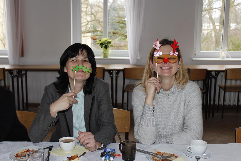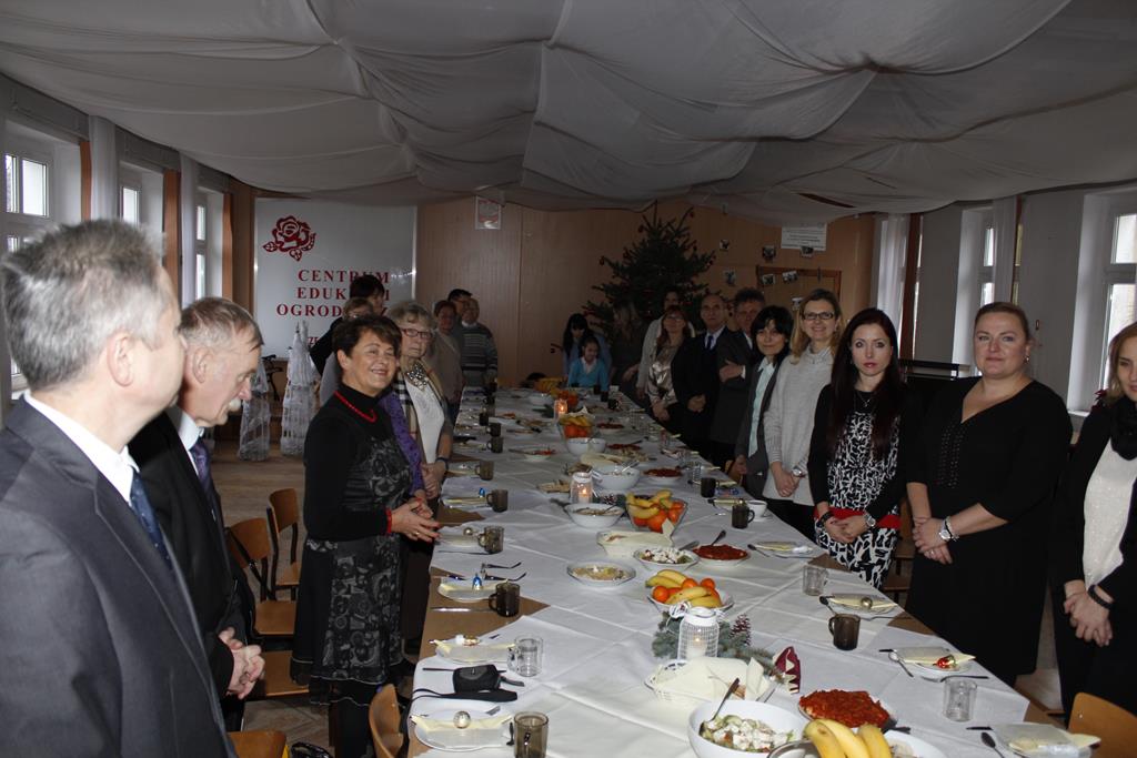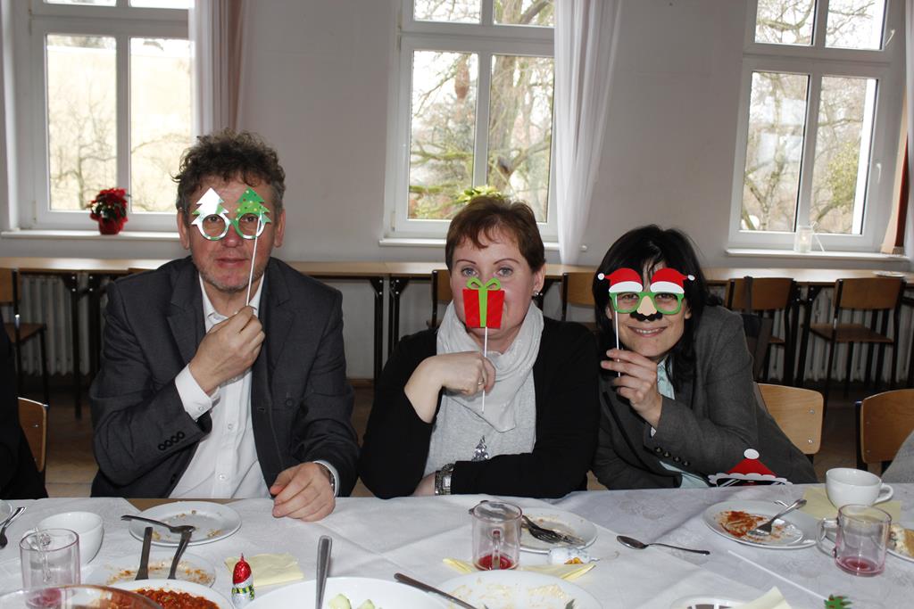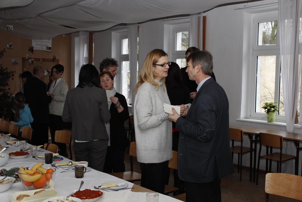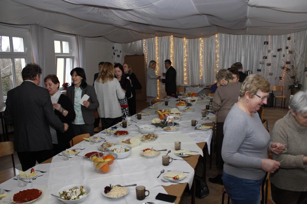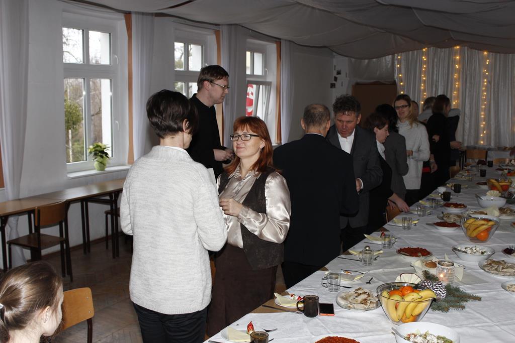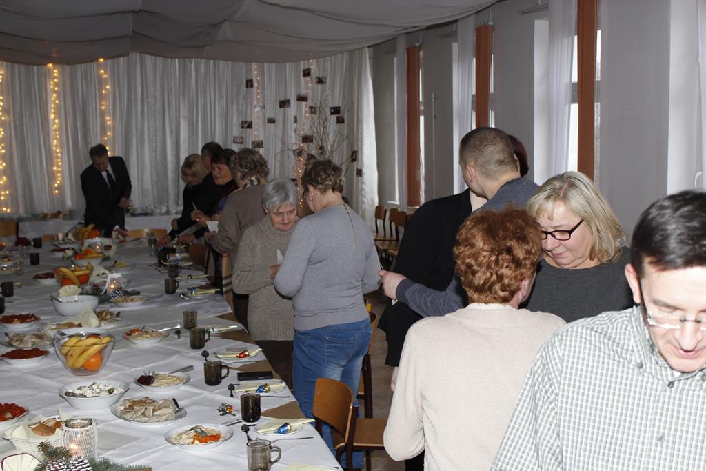 Z okazji nadchodzących Świąt Bożego Narodzenia odbyło się spotkanie wigilijne, w którym uczestniczyli pracownicy i emeryci naszej szkoły. Po przemówieniu księdza Macieja, który wprowadził wszystkich w atmosferę świąteczną, nastąpiło tradycyjne dzielenie się opłatkiem. Była to też okazja do składania sobie życzeń nie tylko bożonarodzeniowych, ale także na Nowy Rok. A potem były tradycyjne potrawy, wśród których „królowały” pierogi z barszczem. Wszystkim dopisywał dobry humor, co – w trakcie szkolnej wigilii 22 grudnia 2016 roku – uwiecznił nasz fotograf :).